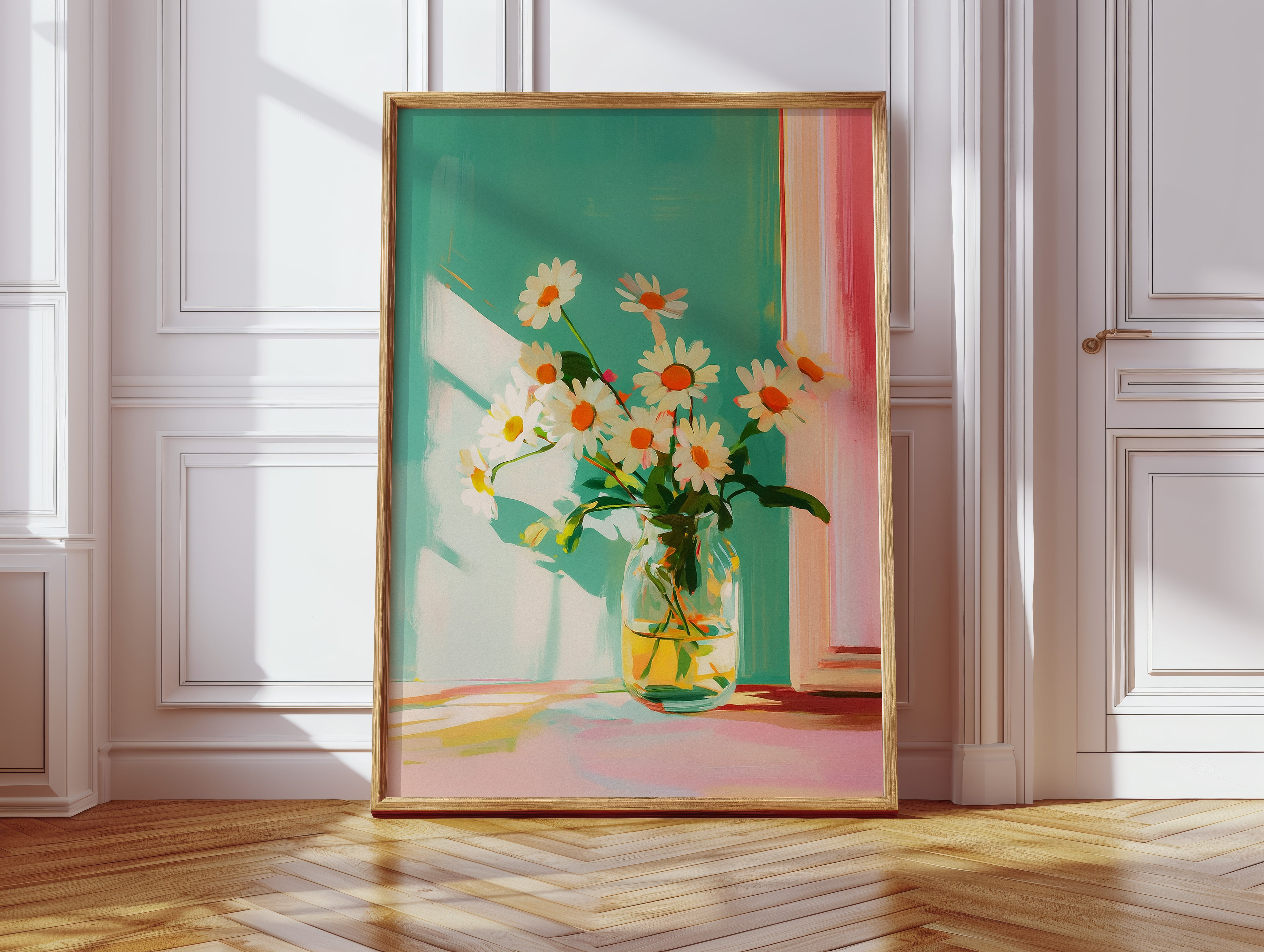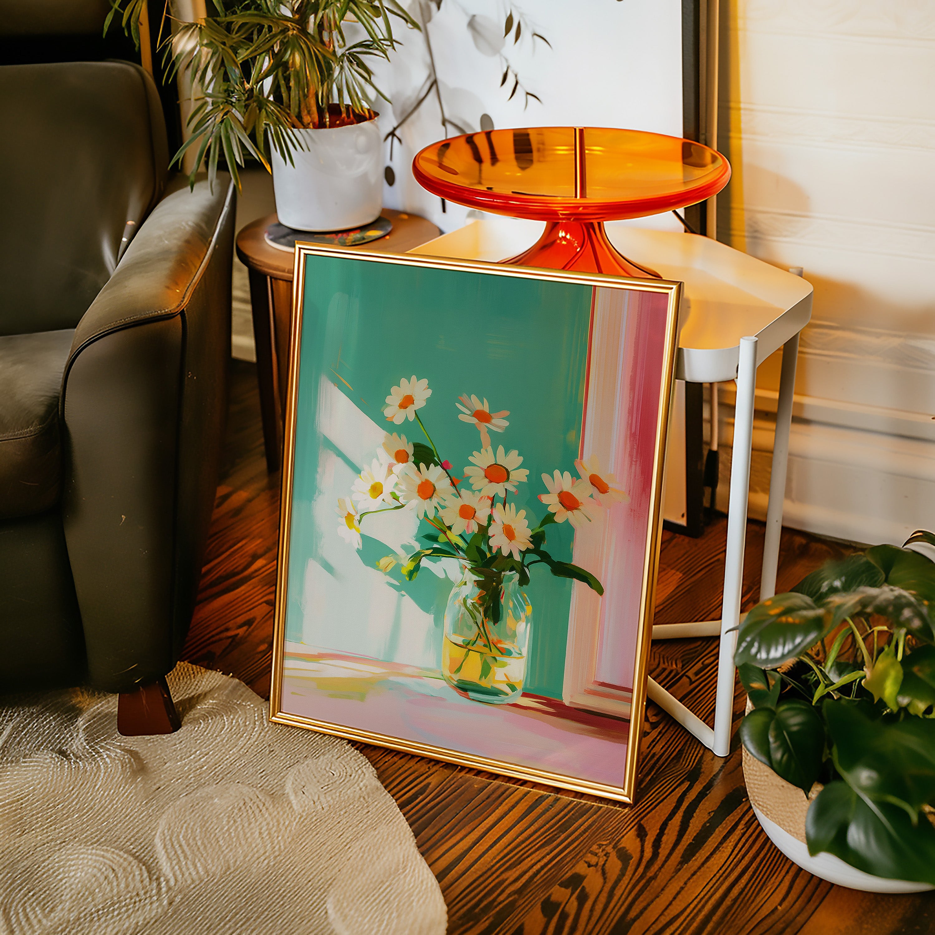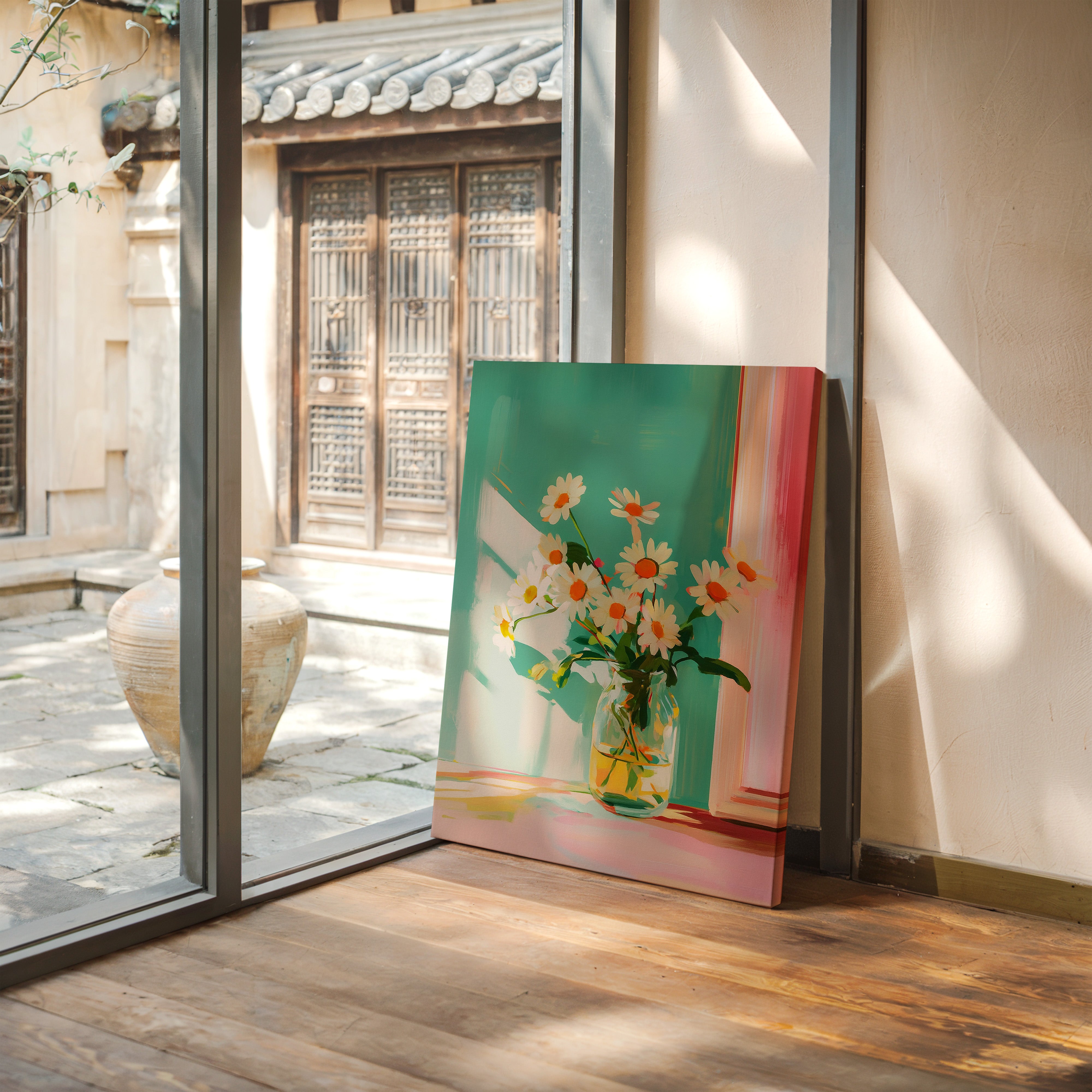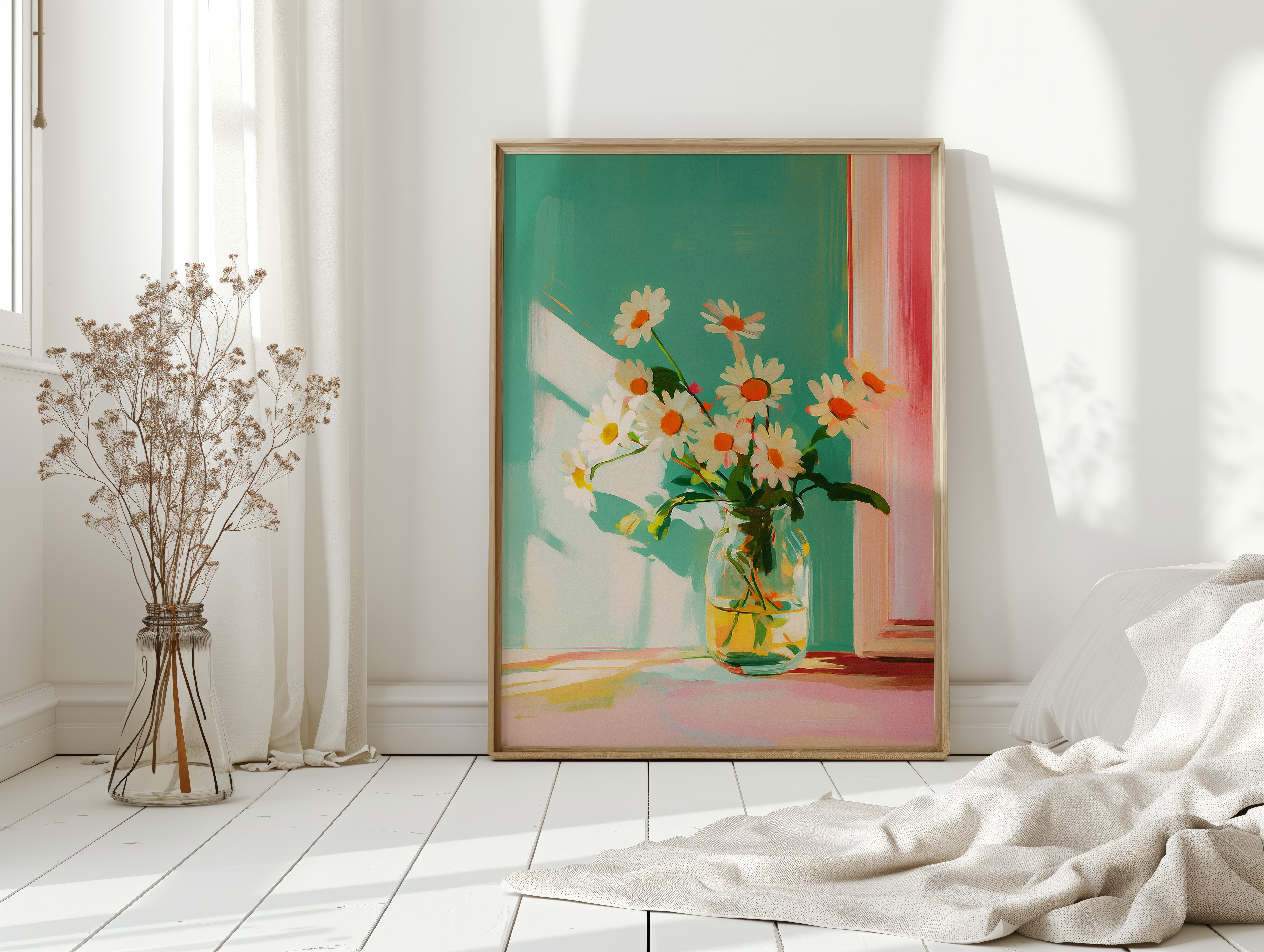A burst of joy blooms in the morning light, where carefree daisies dance in a jar of golden water. Painted in bold, cheerful strokes.