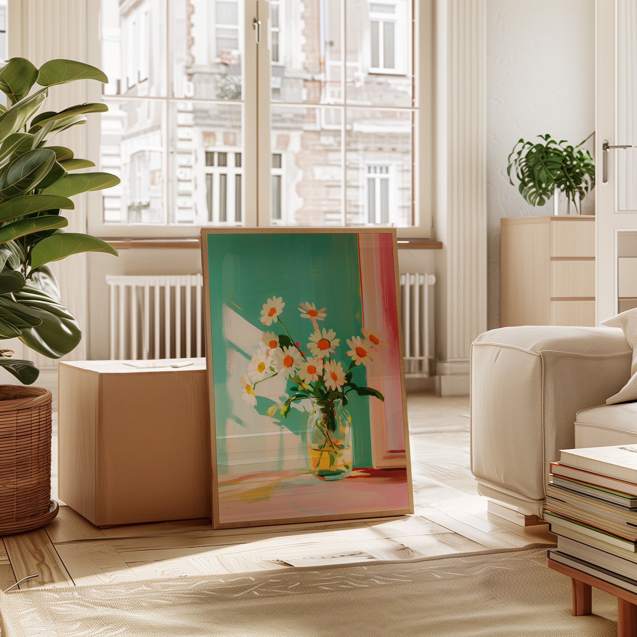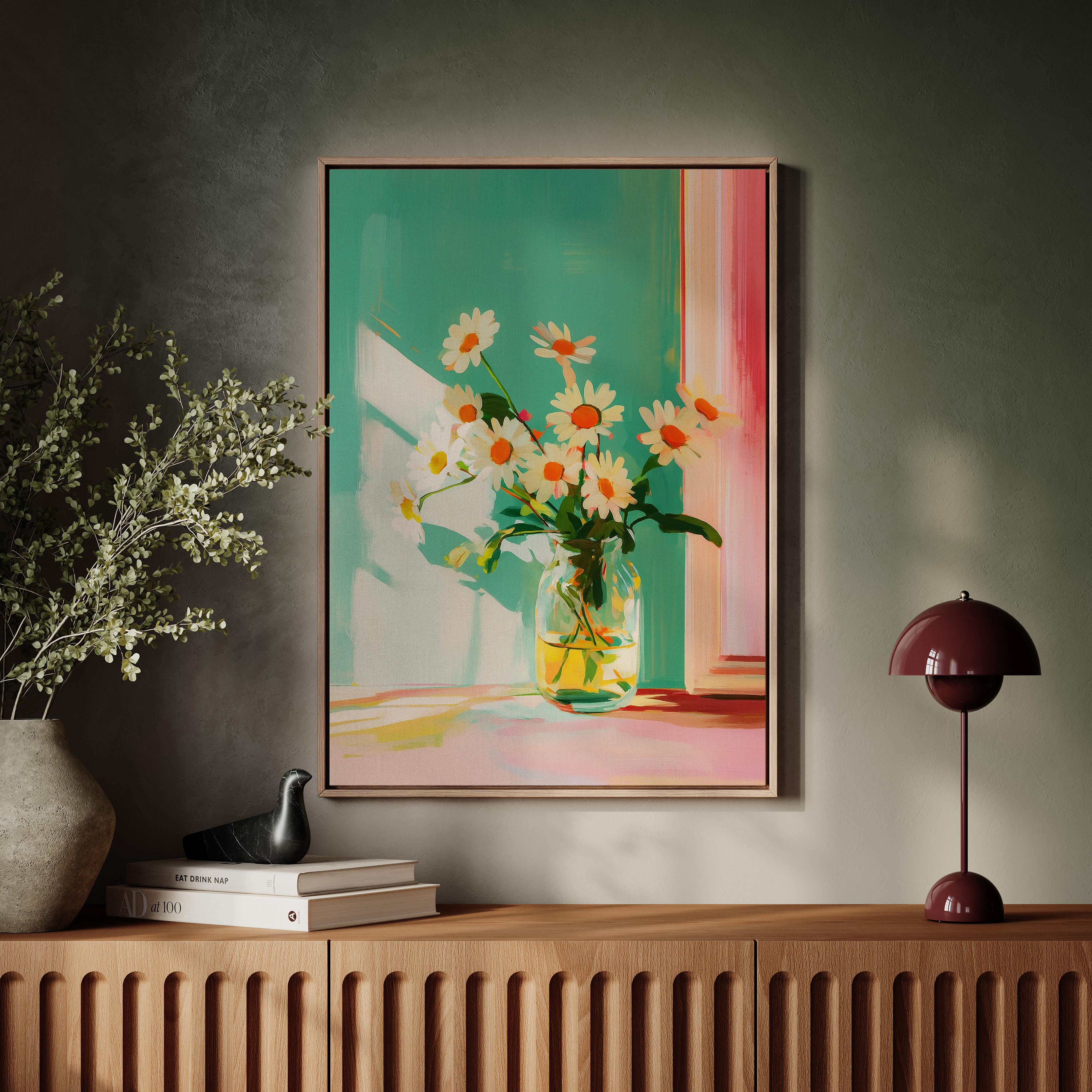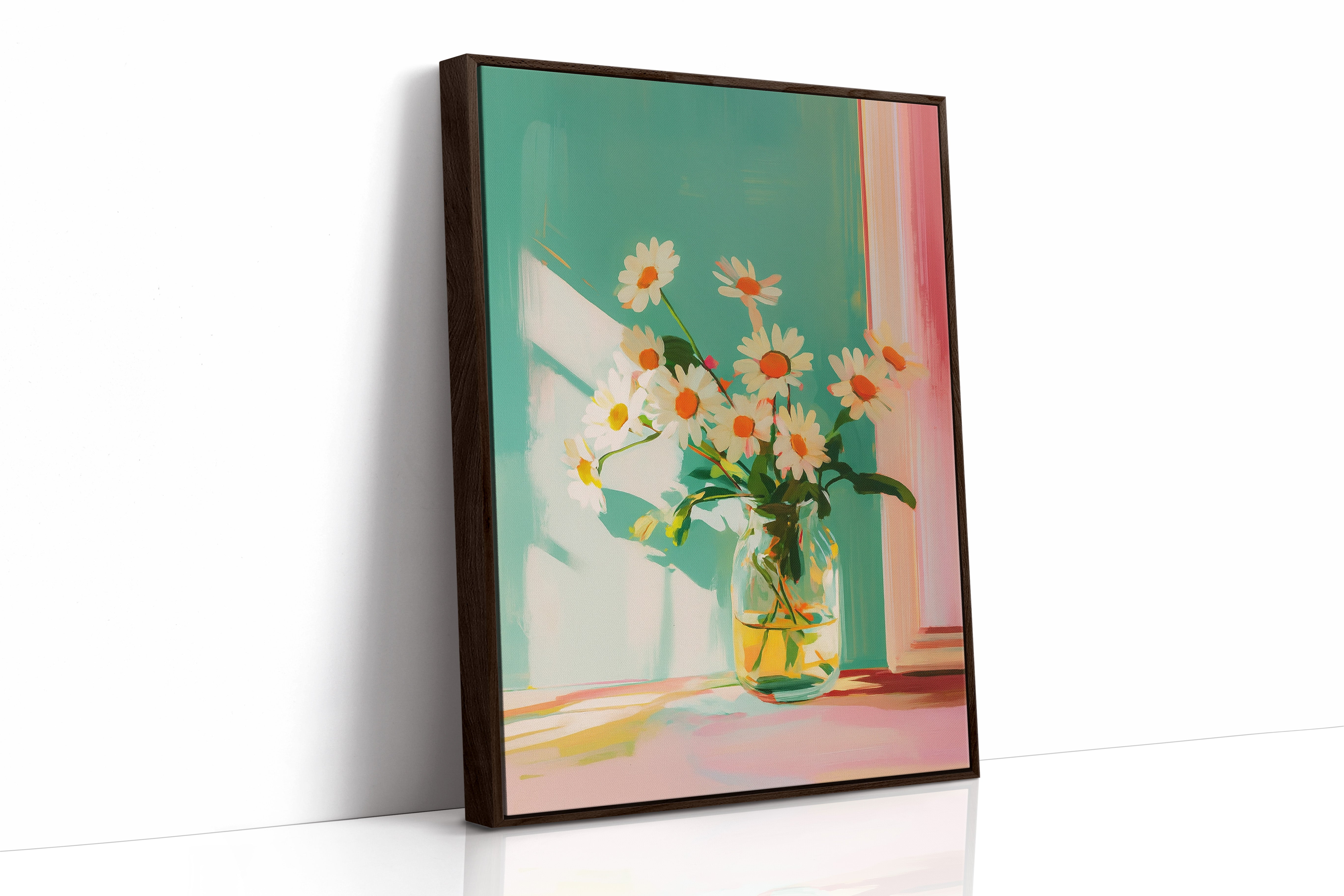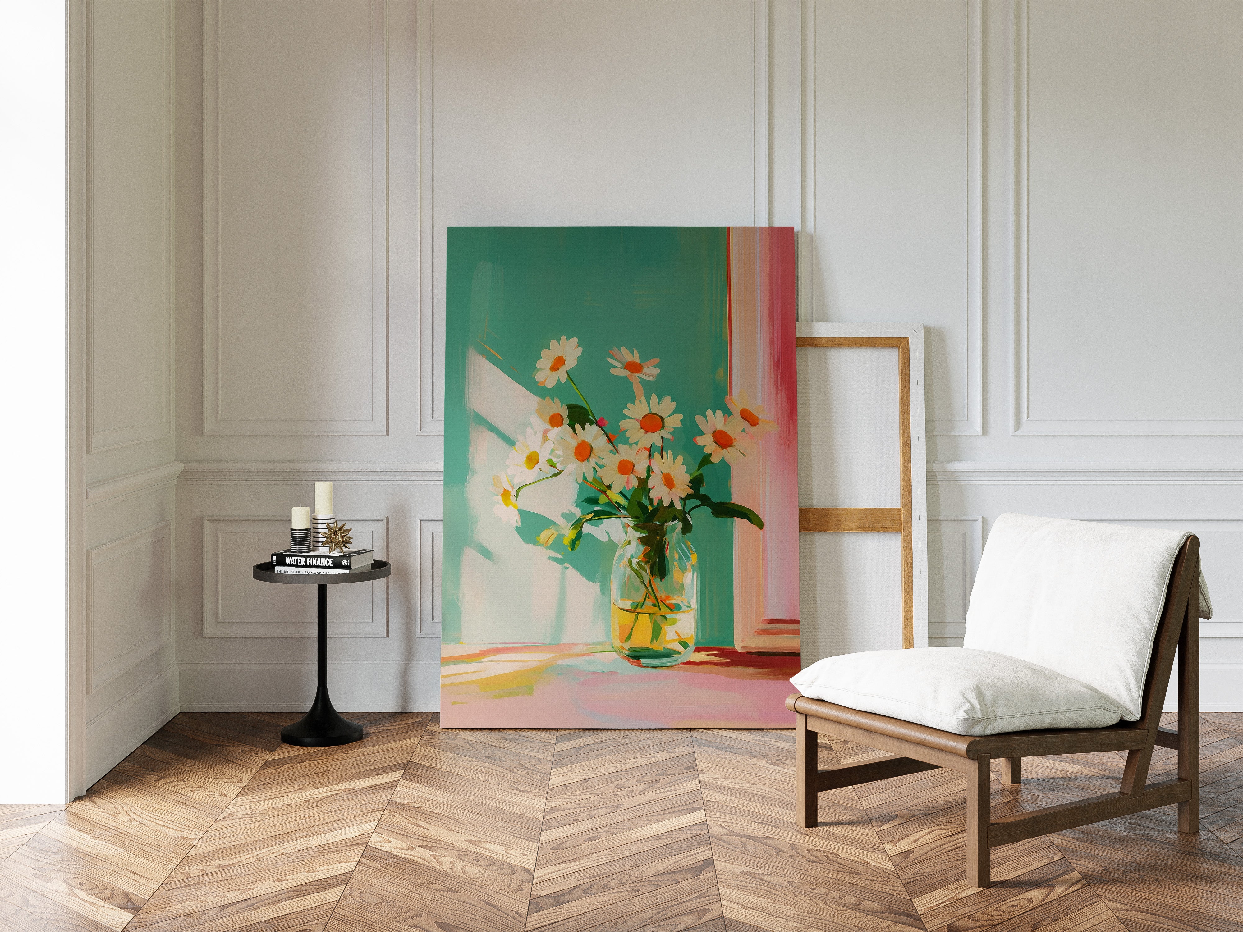 A burst of joy blooms in the morning light, where carefree daisies dance in a jar of golden water. Painted in bold, cheerful strokes.