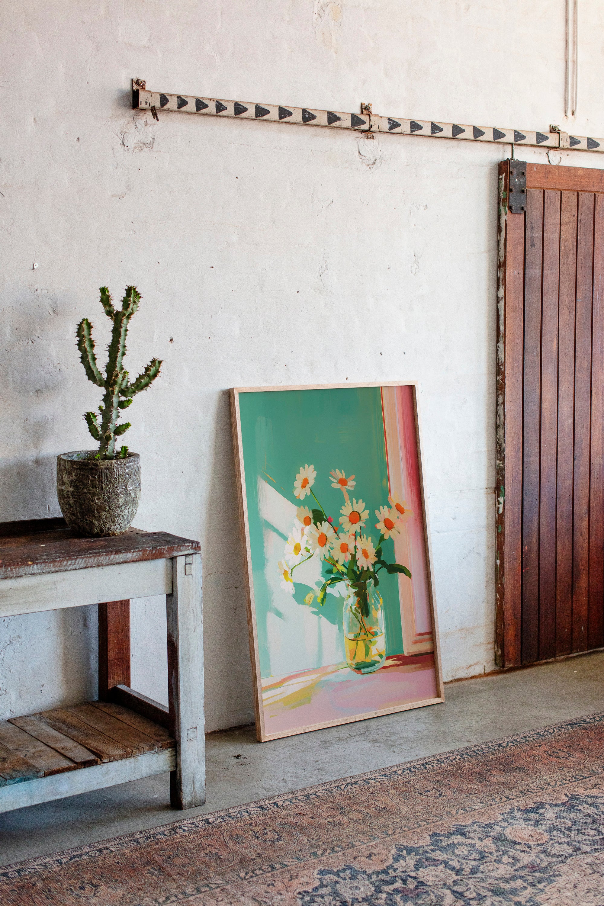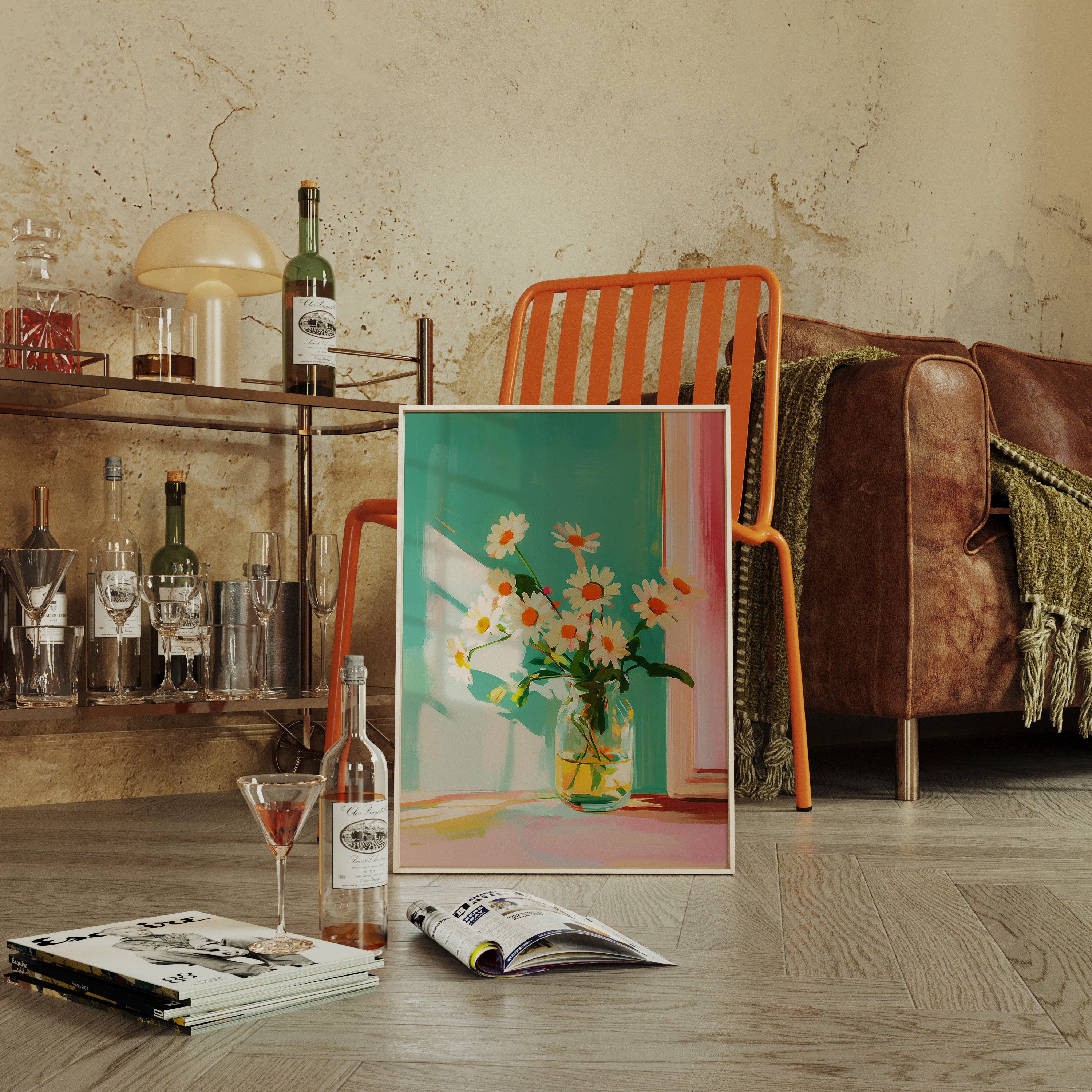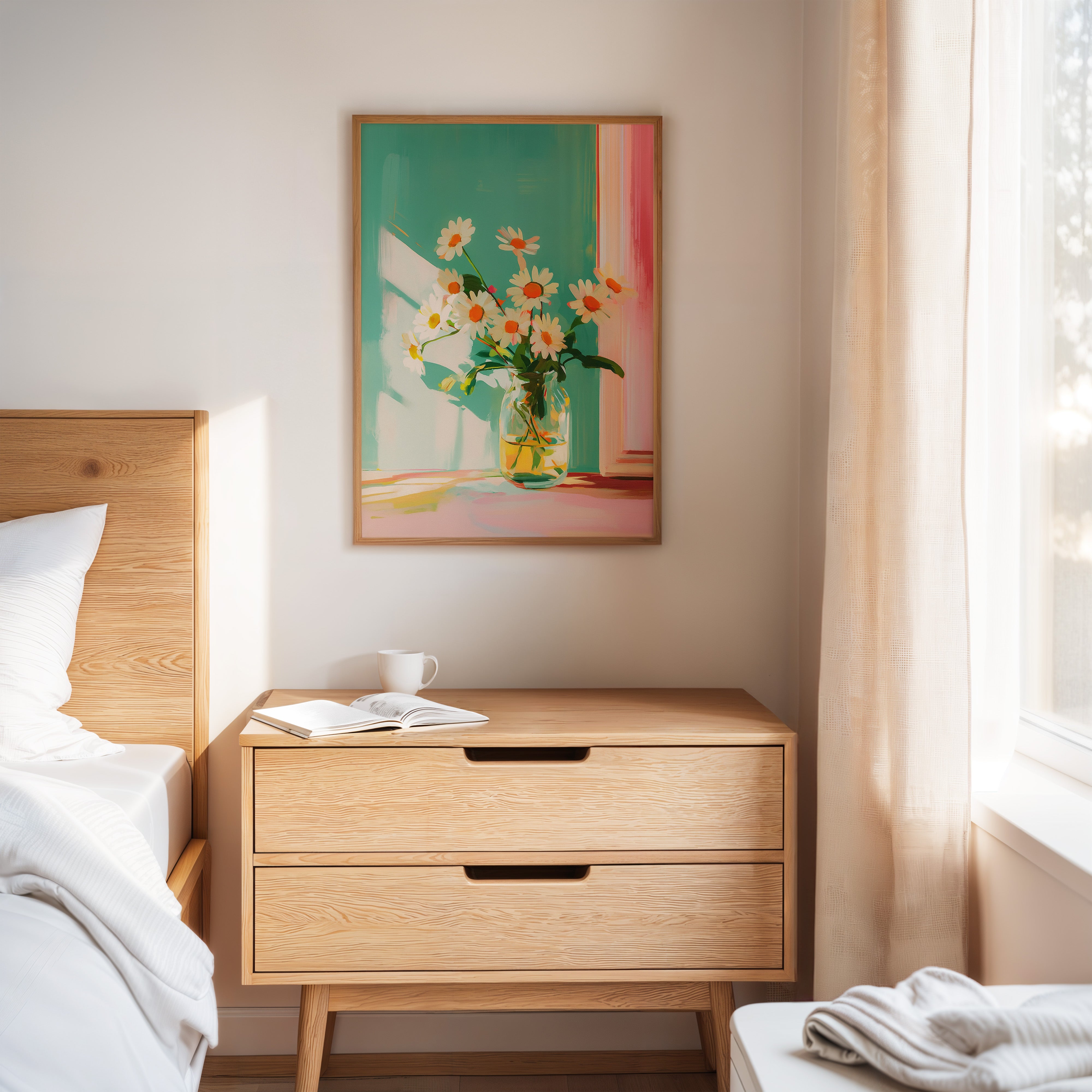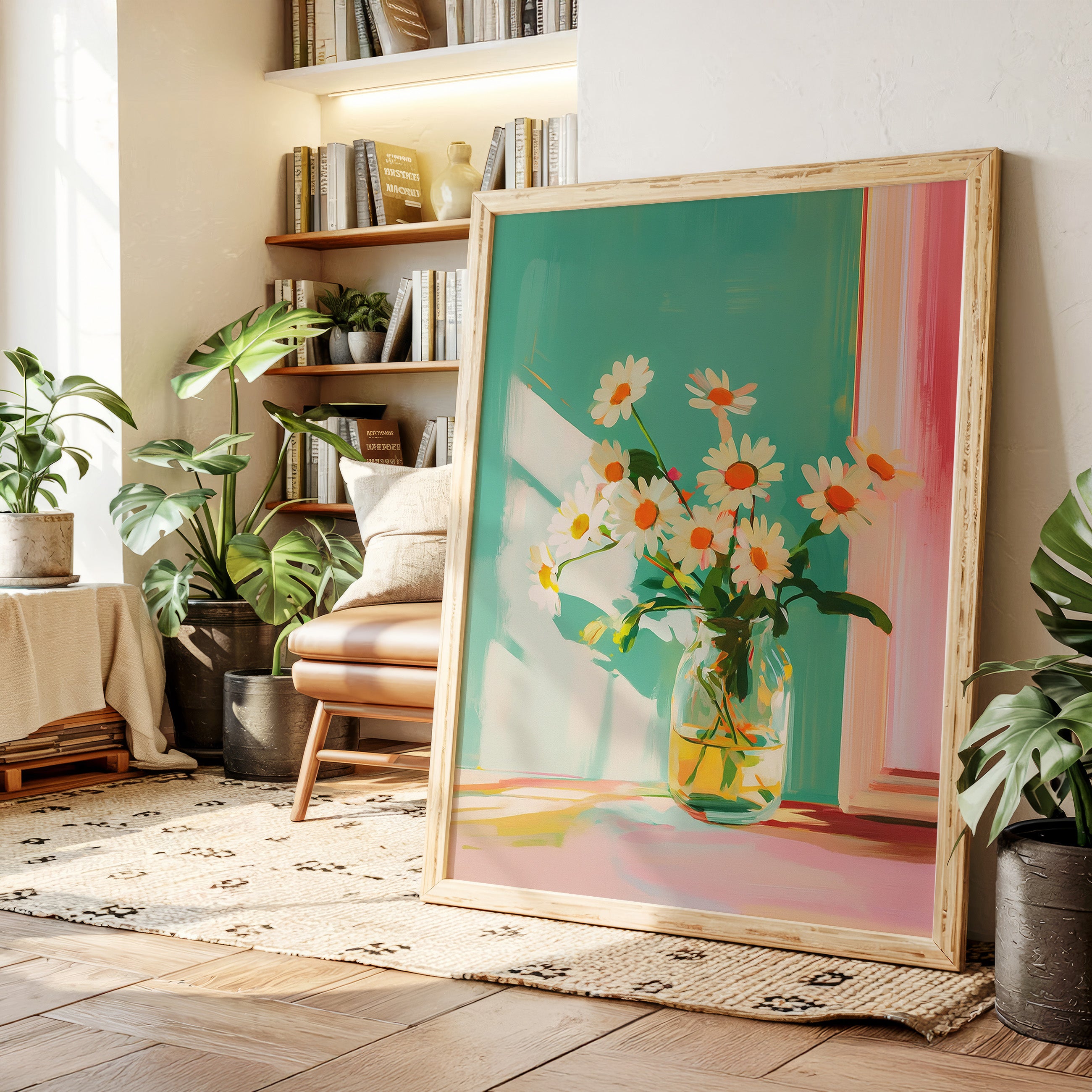 A burst of joy blooms in the morning light, where carefree daisies dance in a jar of golden water. Painted in bold, cheerful strokes.