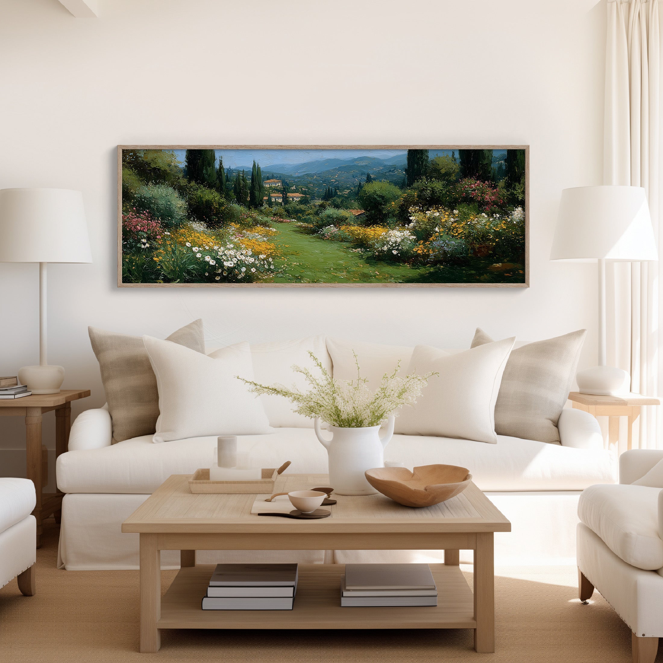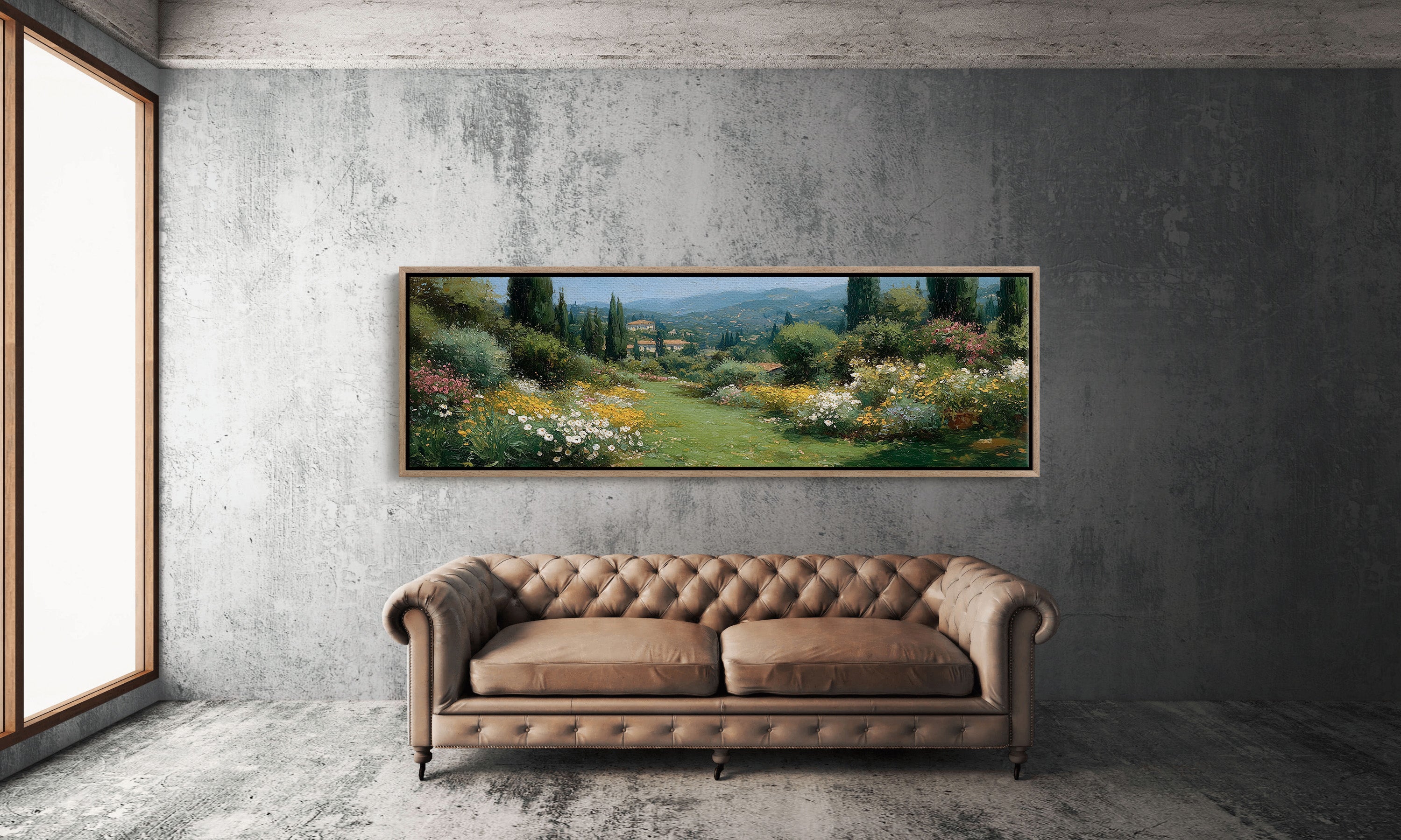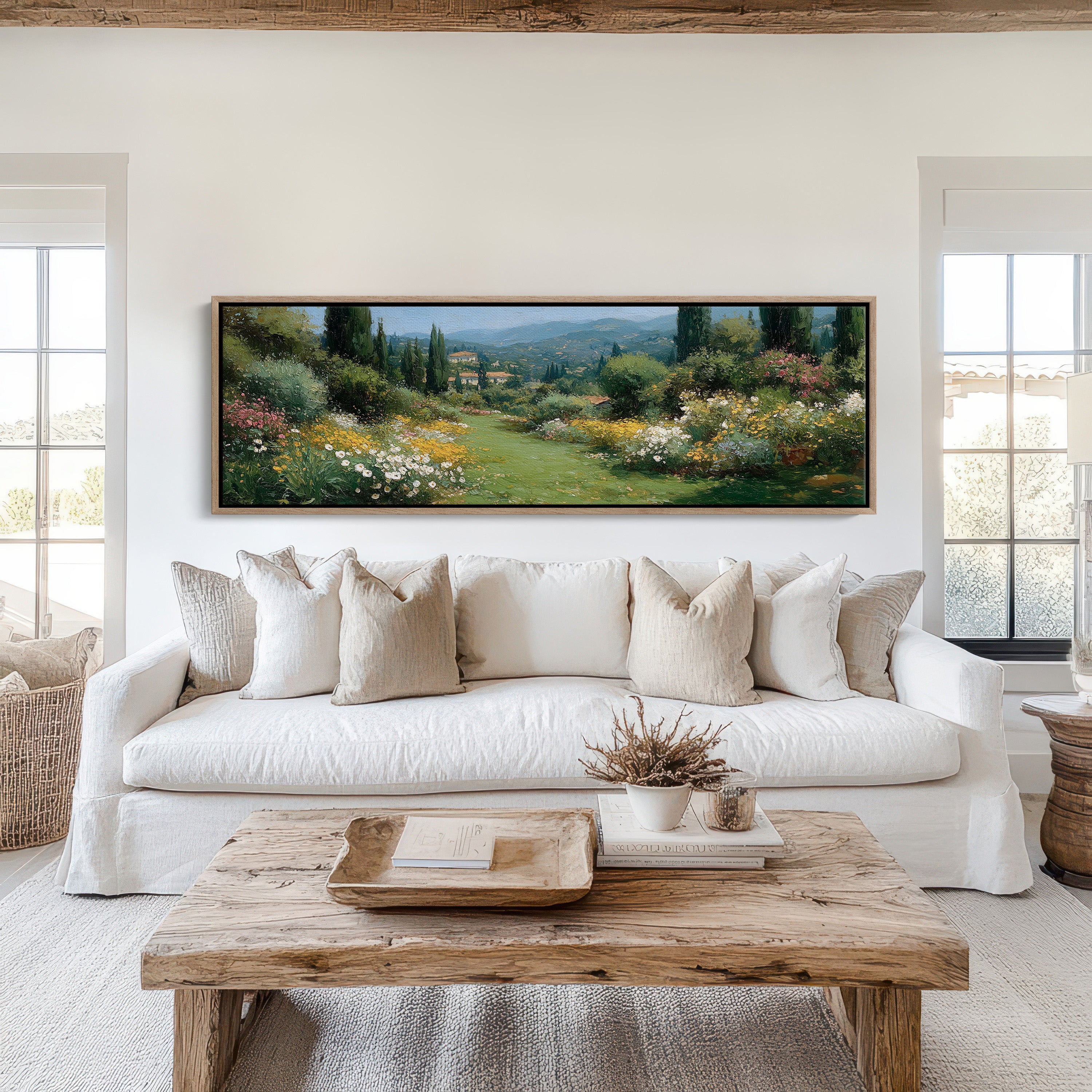 A lush garden path lined with blooming white and golden flowers leads the eye toward rolling hills and distant villas beneath a soft blue sky. Rich with Mediterranean warmth and painterly texture, this romantic landscape brings timeless elegance and fresh countryside charm to living rooms, dining spaces, or classic interiors.