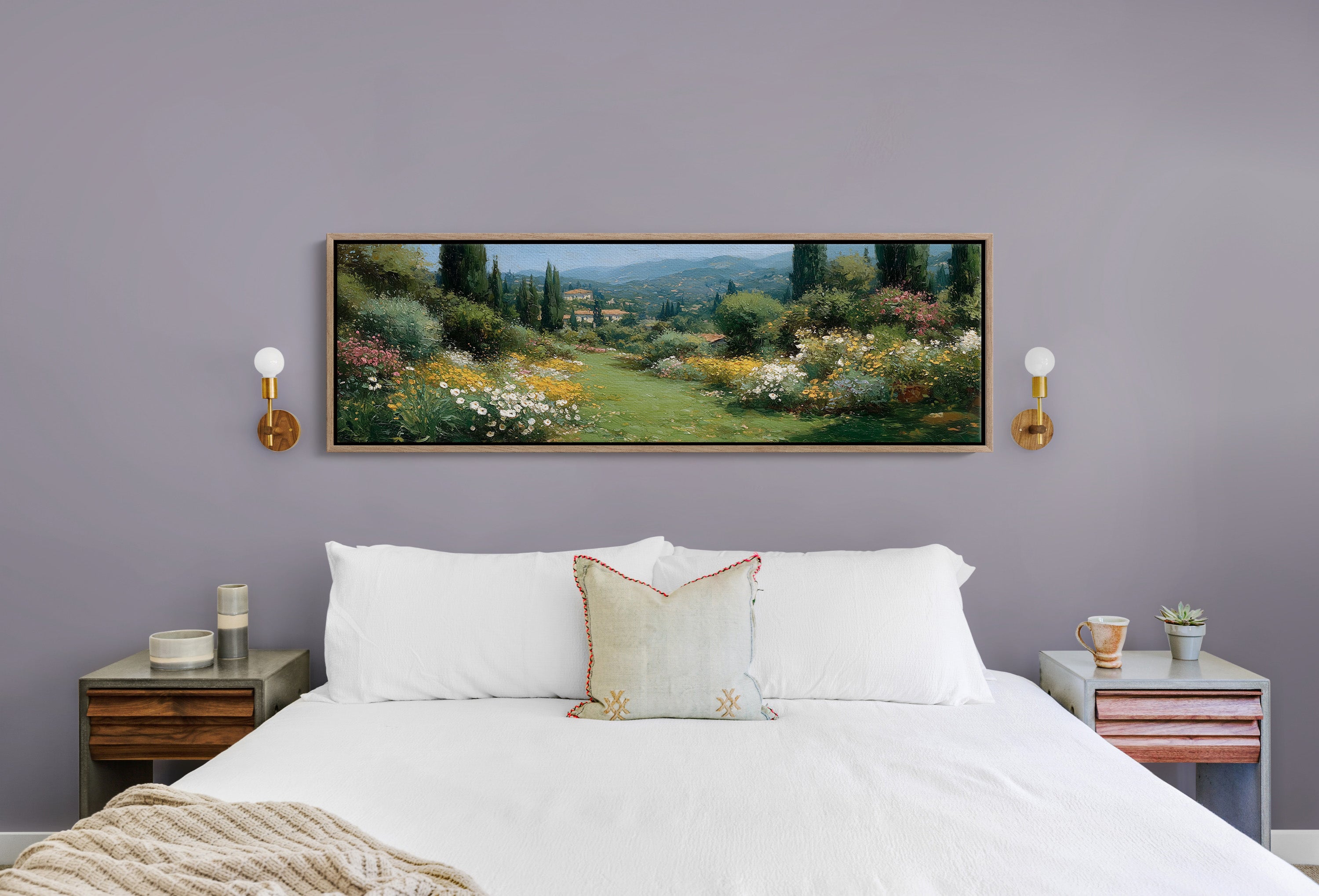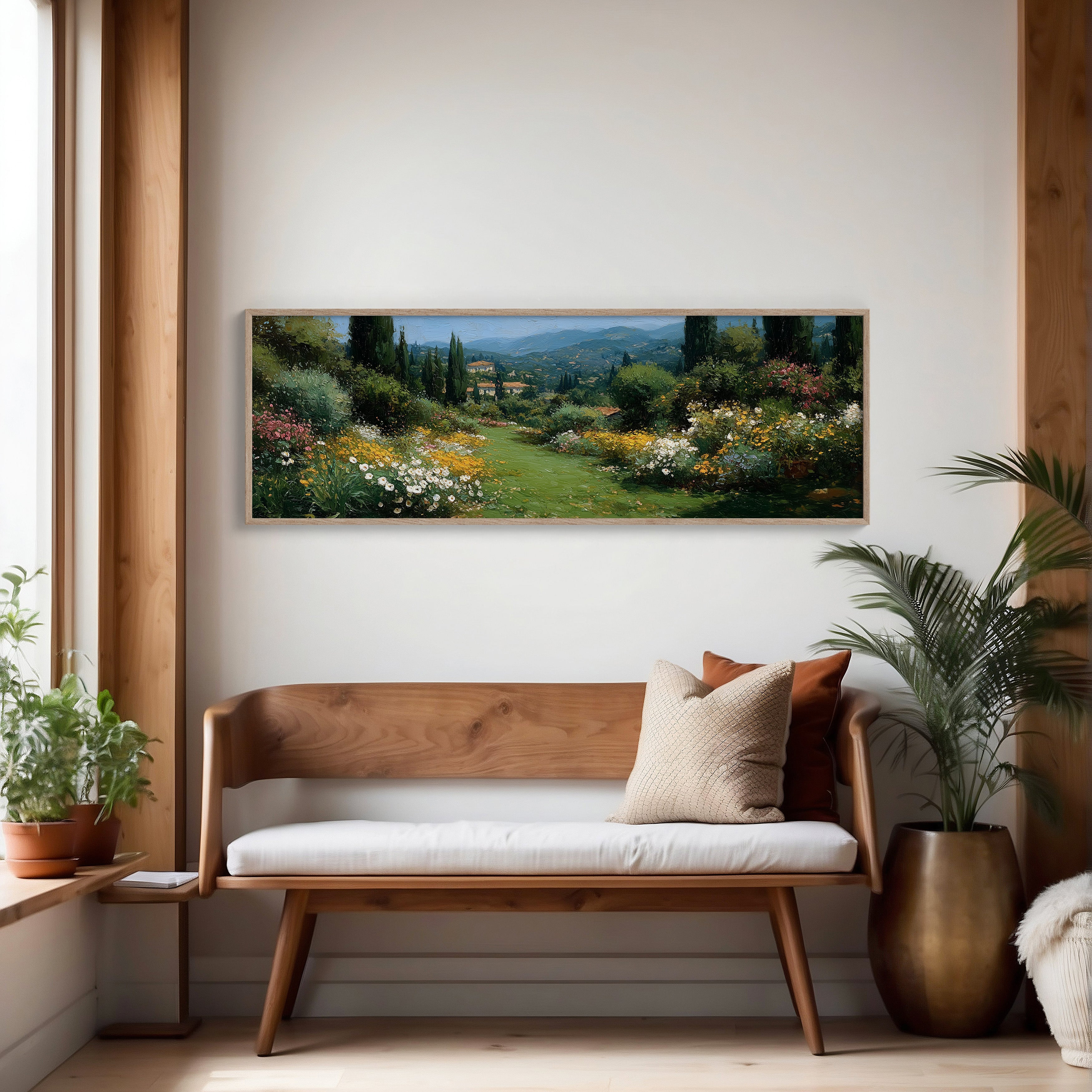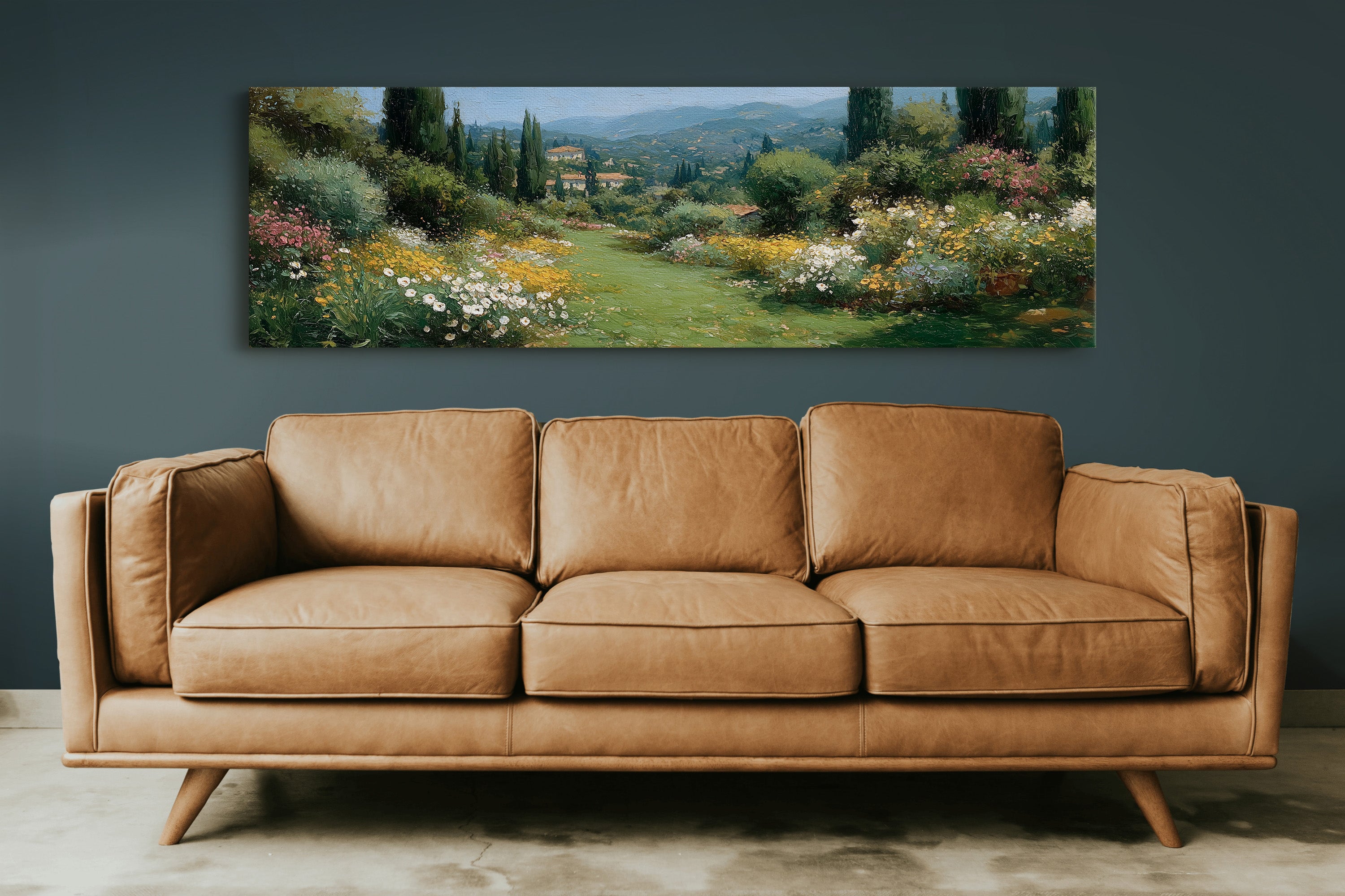 A lush garden path lined with blooming white and golden flowers leads the eye toward rolling hills and distant villas beneath a soft blue sky. Rich with Mediterranean warmth and painterly texture, this romantic landscape brings timeless elegance and fresh countryside charm to living rooms, dining spaces, or classic interiors.