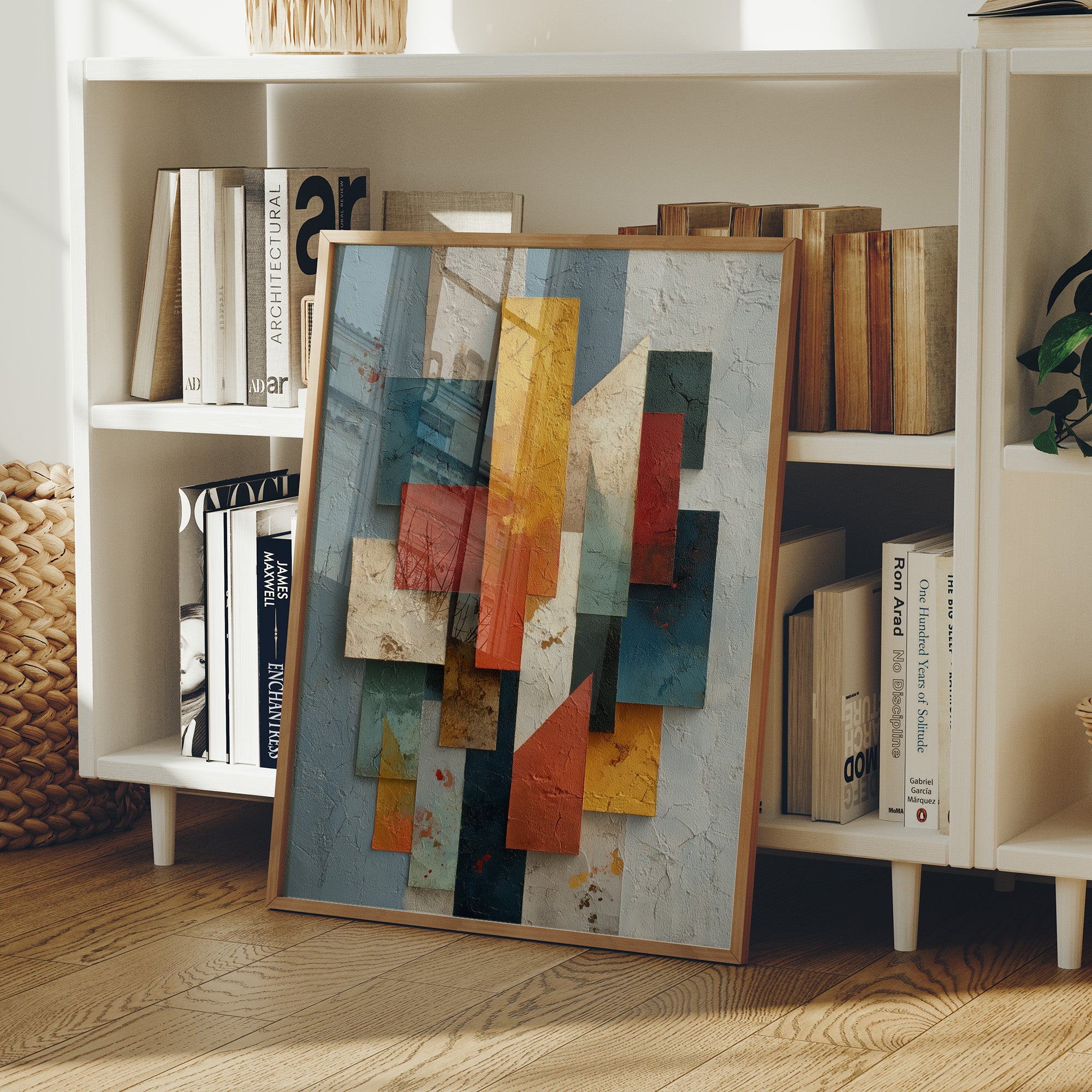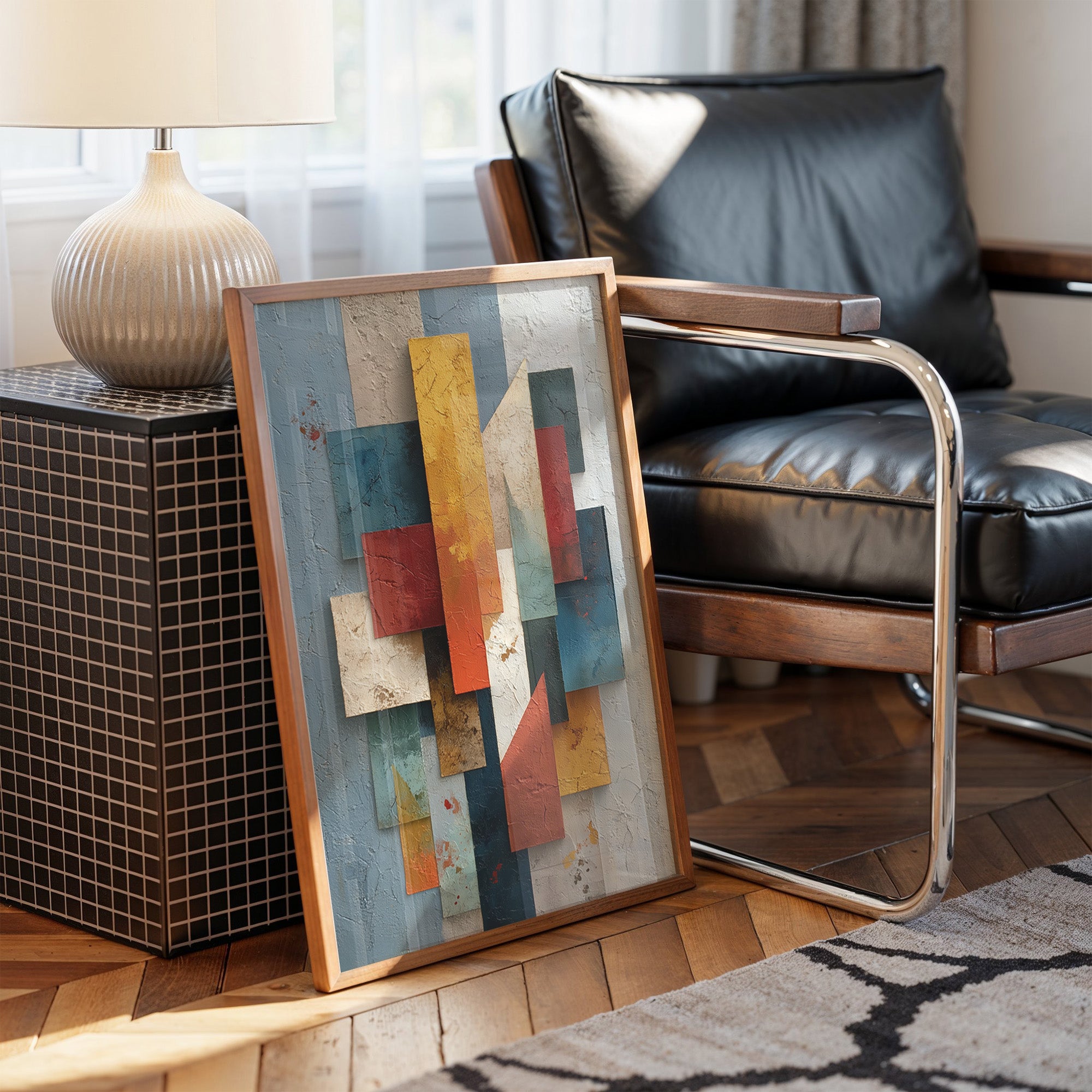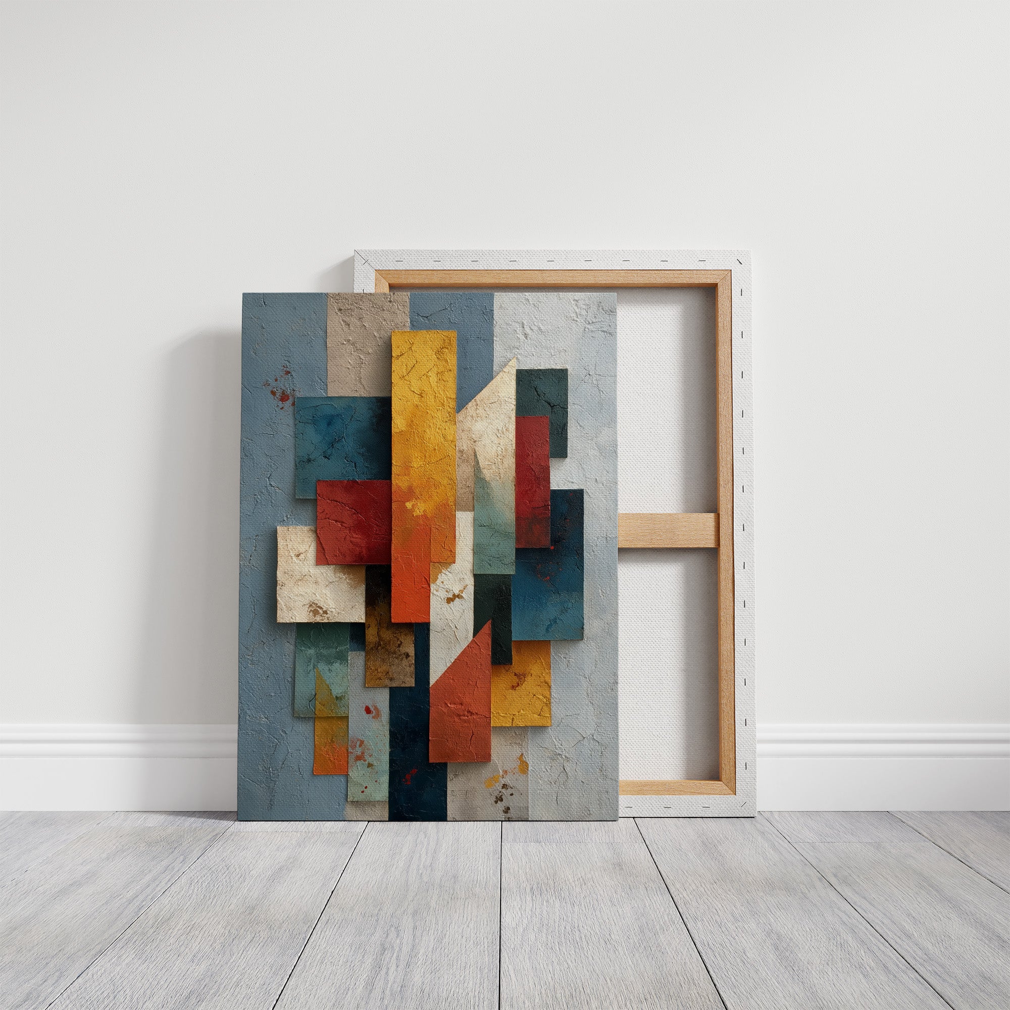 Layers of color and texture interweave like memories stacked through decades, each rectangle telling its own story in bold yellows, deep teals, and rustic reds. The textured abstract composition creates a sophisticated urban rhythm, while maintaining an organic, weathered quality that speaks of both modern design and ancient walls. This piece transforms a contemporary space into a gallery of contemplation, where light plays across its dimensional surface throughout the day. Perfect for anchoring an open-concept living space or adding architectural interest to a minimal dining room, where its bold geometry can converse with clean lines and natural elements.