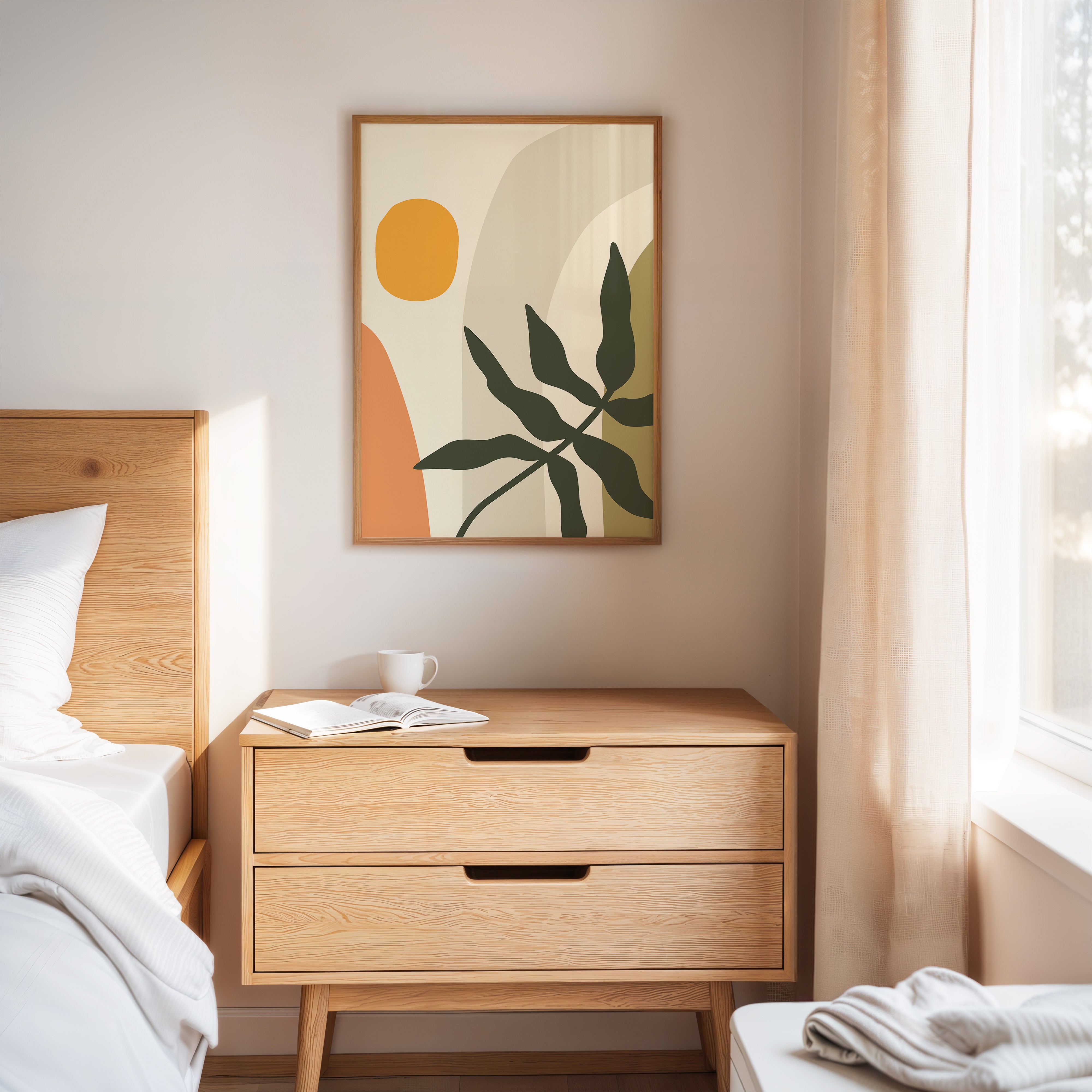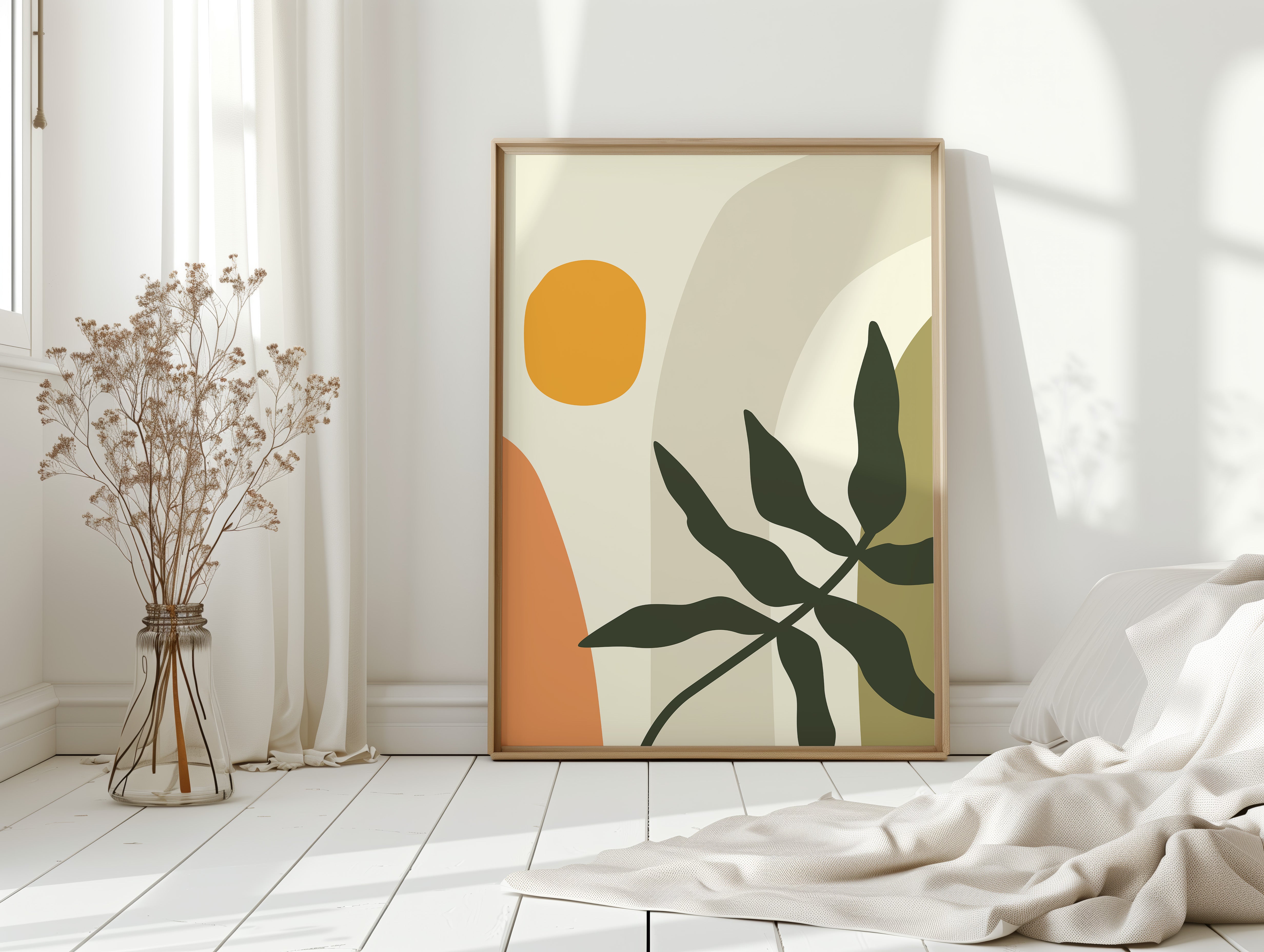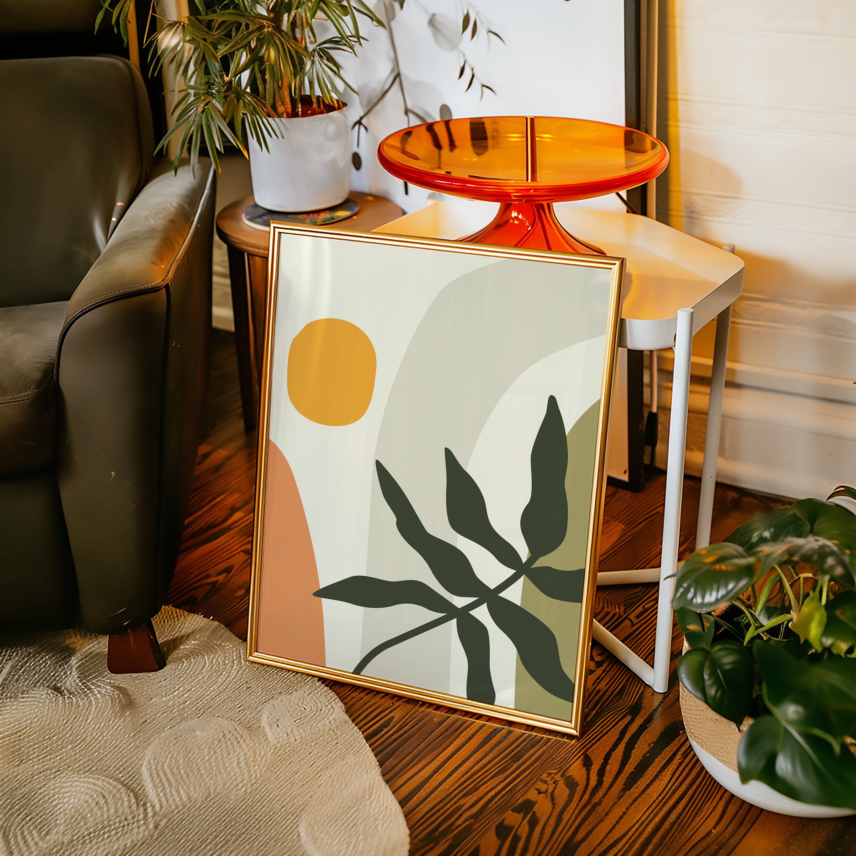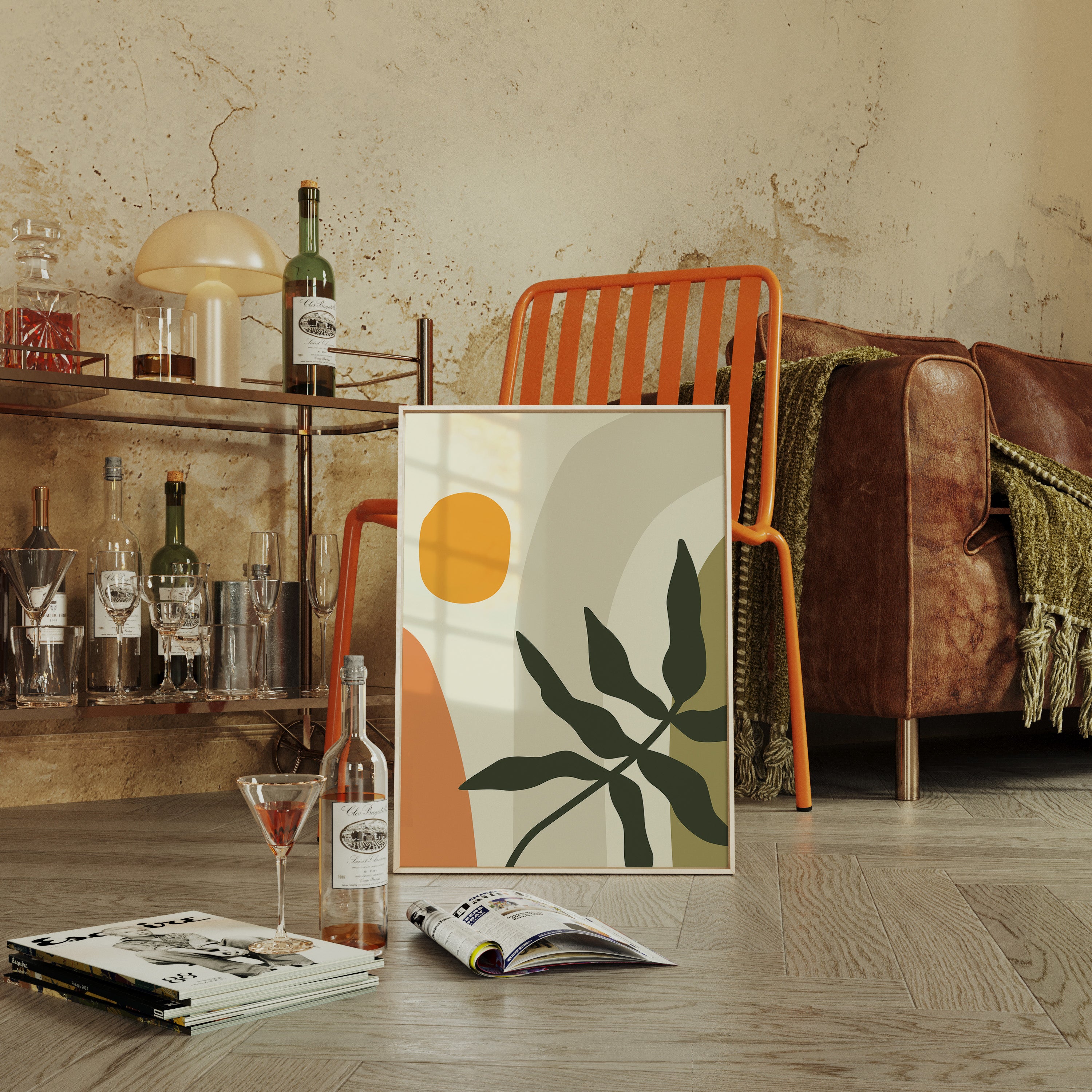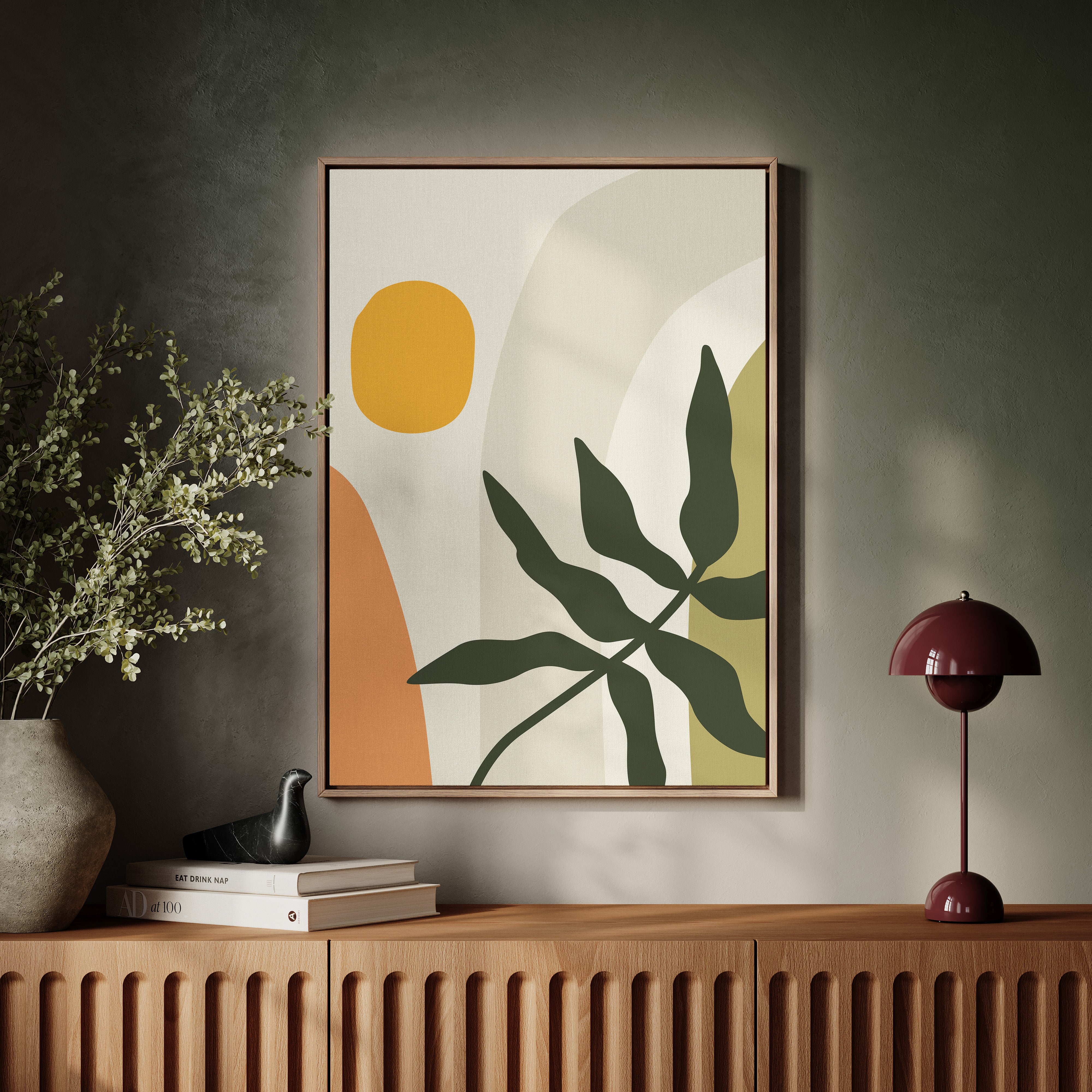 In a dance of colors, a deep green leaf reaches towards the golden sun, framing a moment of tranquil connection. This piece radiates contemporary elegance, inviting a fresh perspective into any space. The gentle interplay of shapes and hues evokes a sense of balance, where nature meets modern design, creating an inviting atmosphere. Ideal for a serene living room or a bright workspace, it inspires creativity and calm. Let the simplicity of this composition remind you of nature's quiet beauty.