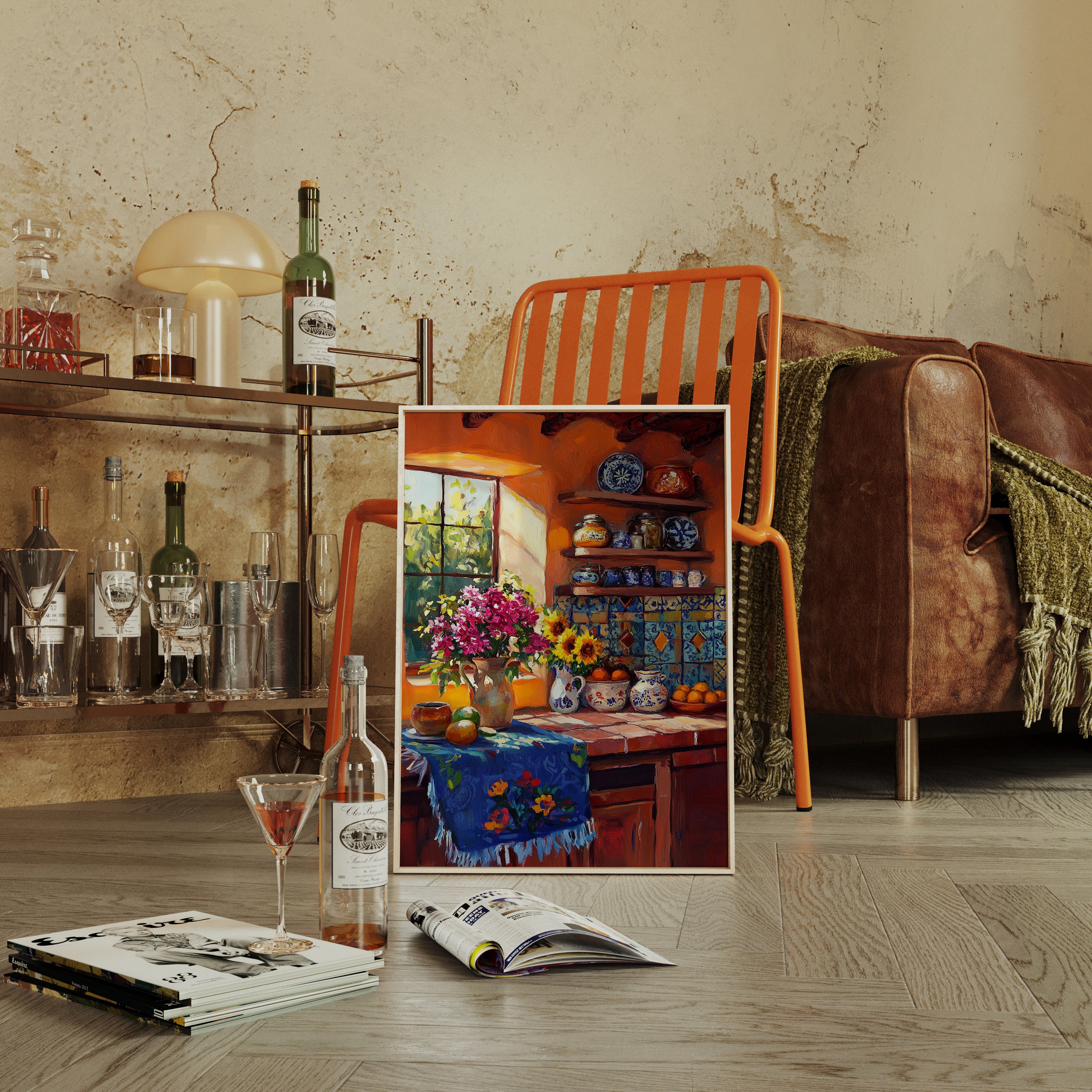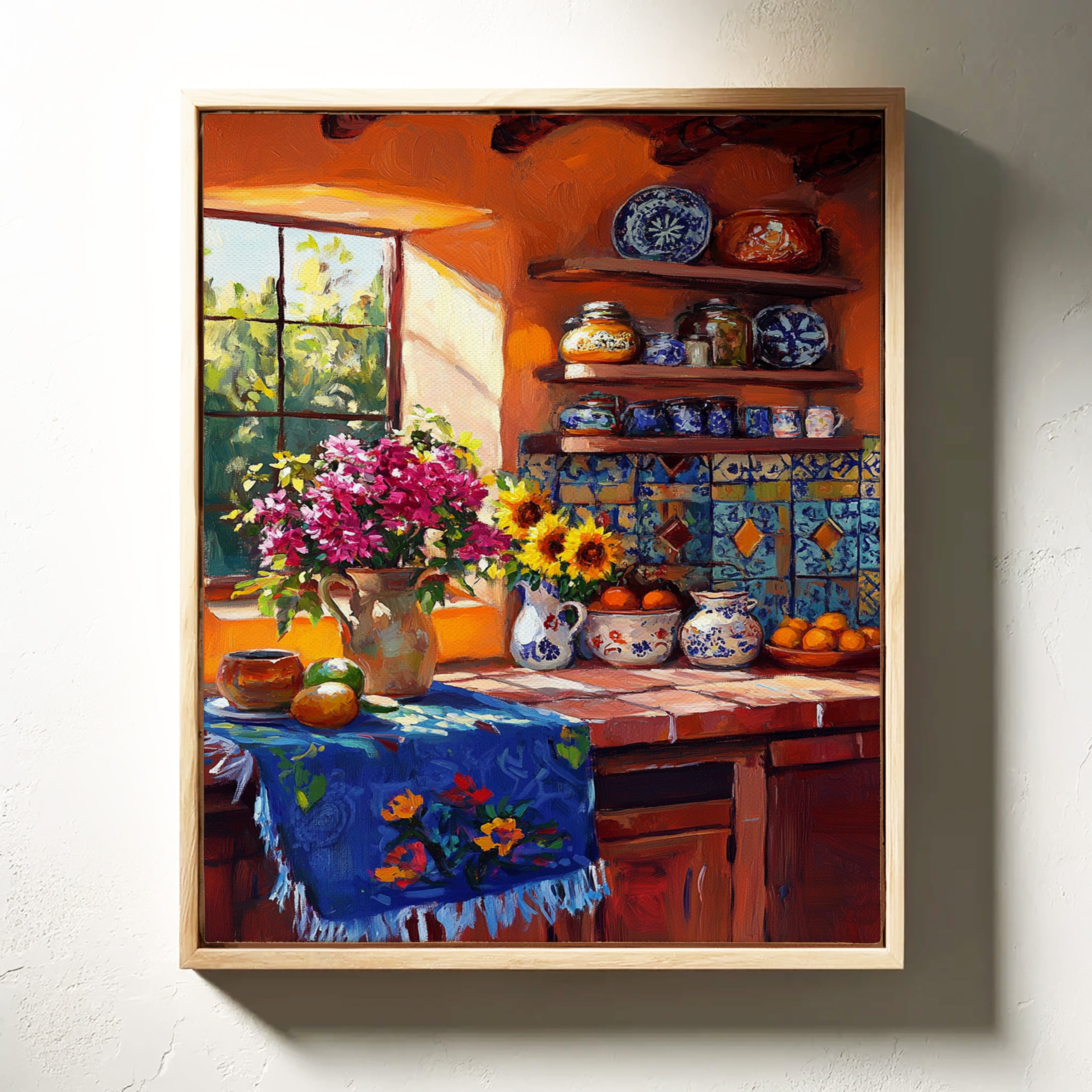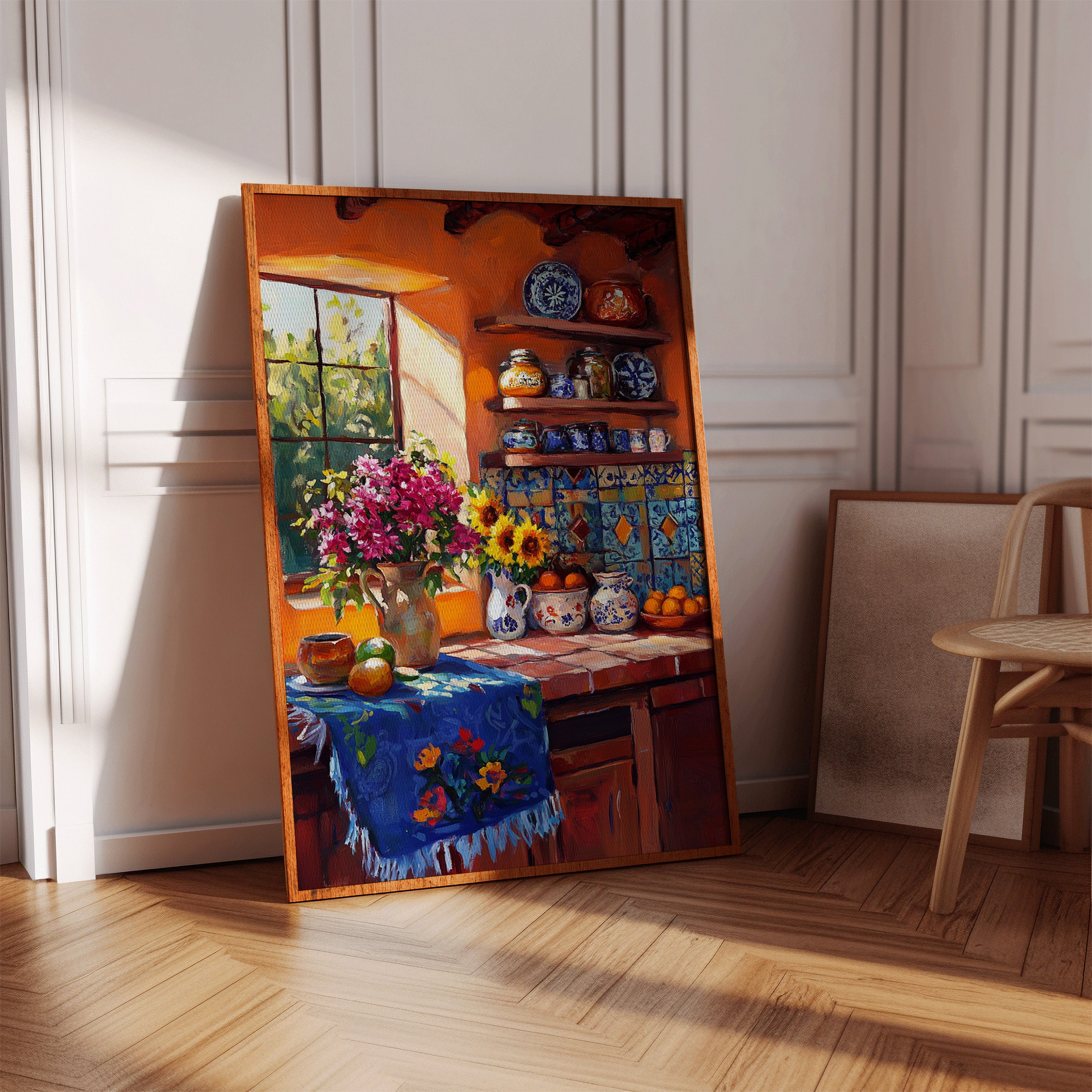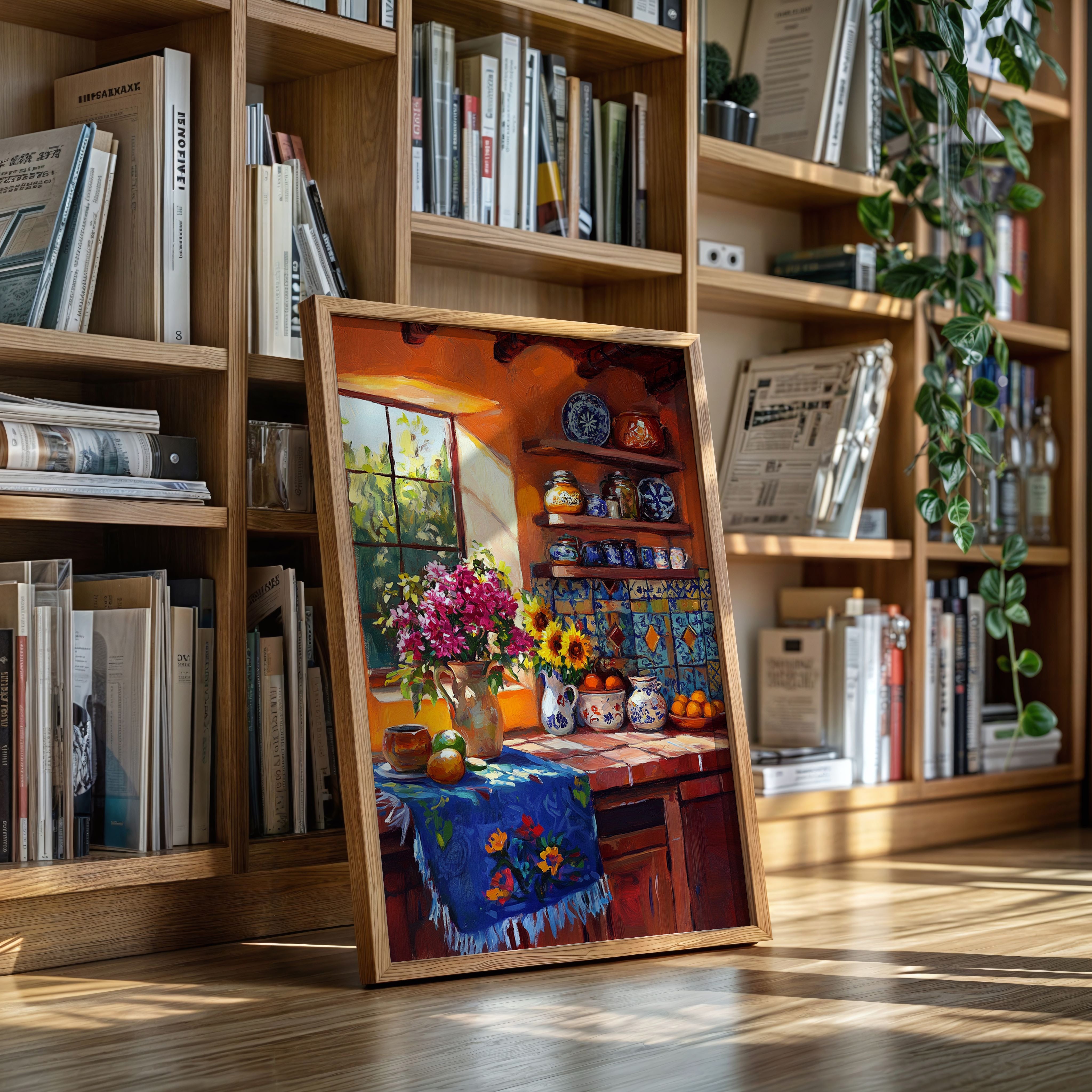 Step into a world where the morning sun bathes rustic kitchen shelves in golden light, illuminating a bouquet of vibrant flowers and artisanal pottery. 'Sunlit Morning Reverie' captures the cozy essence of a tranquil kitchen, blending warm hues with a touch of nostalgic charm. This artwork invites you to savor the simple joys of life, offering a visual escape into a sanctuary of color and warmth.