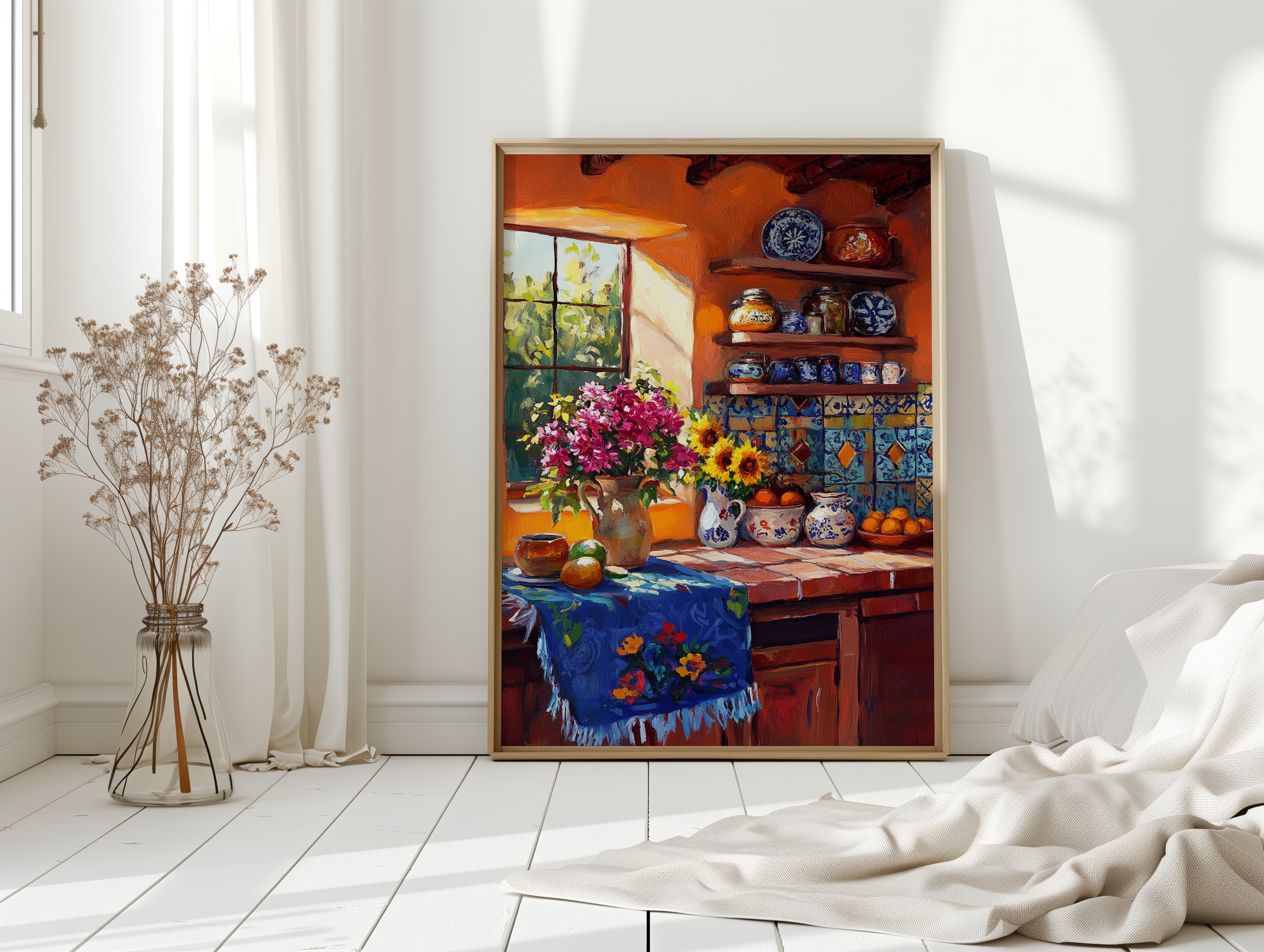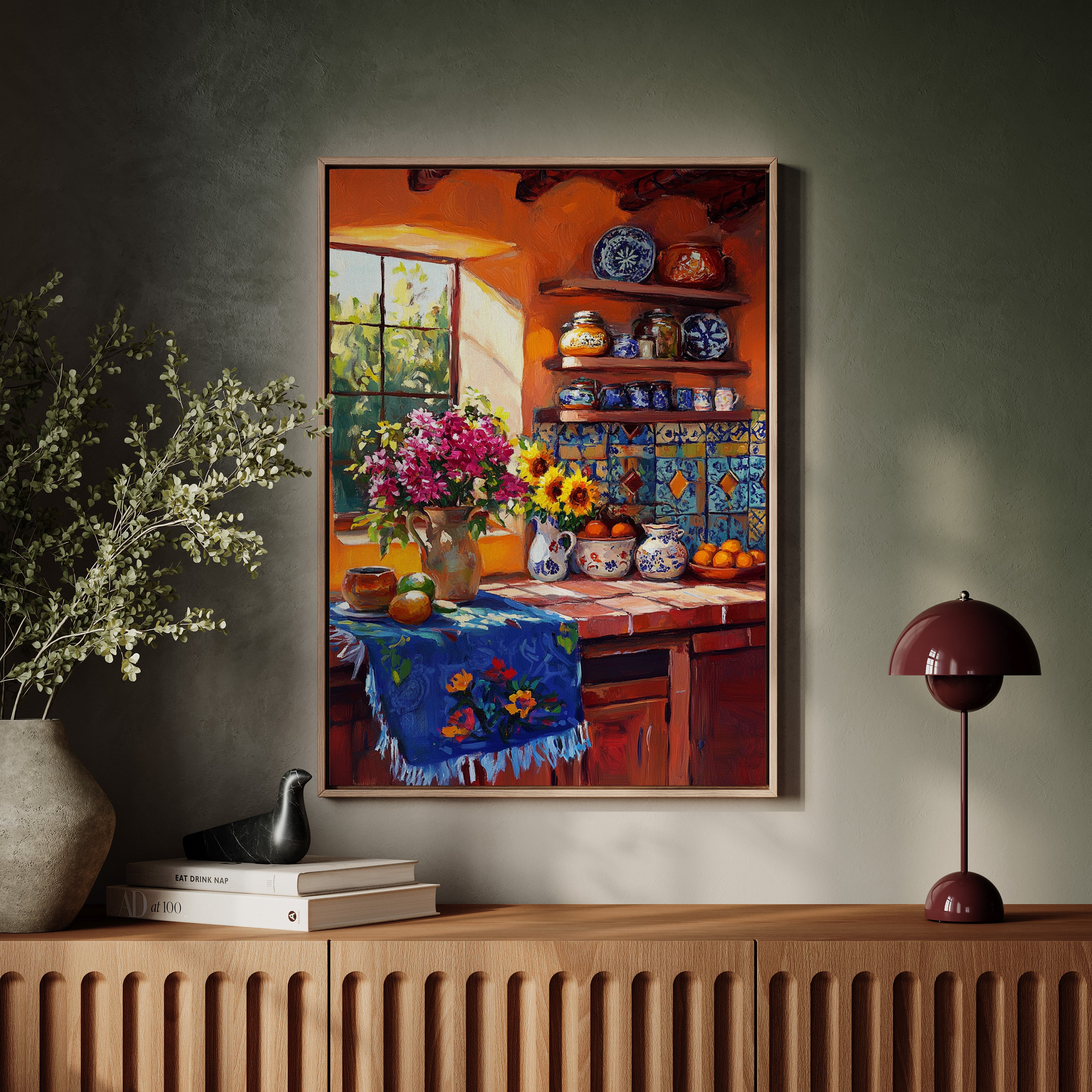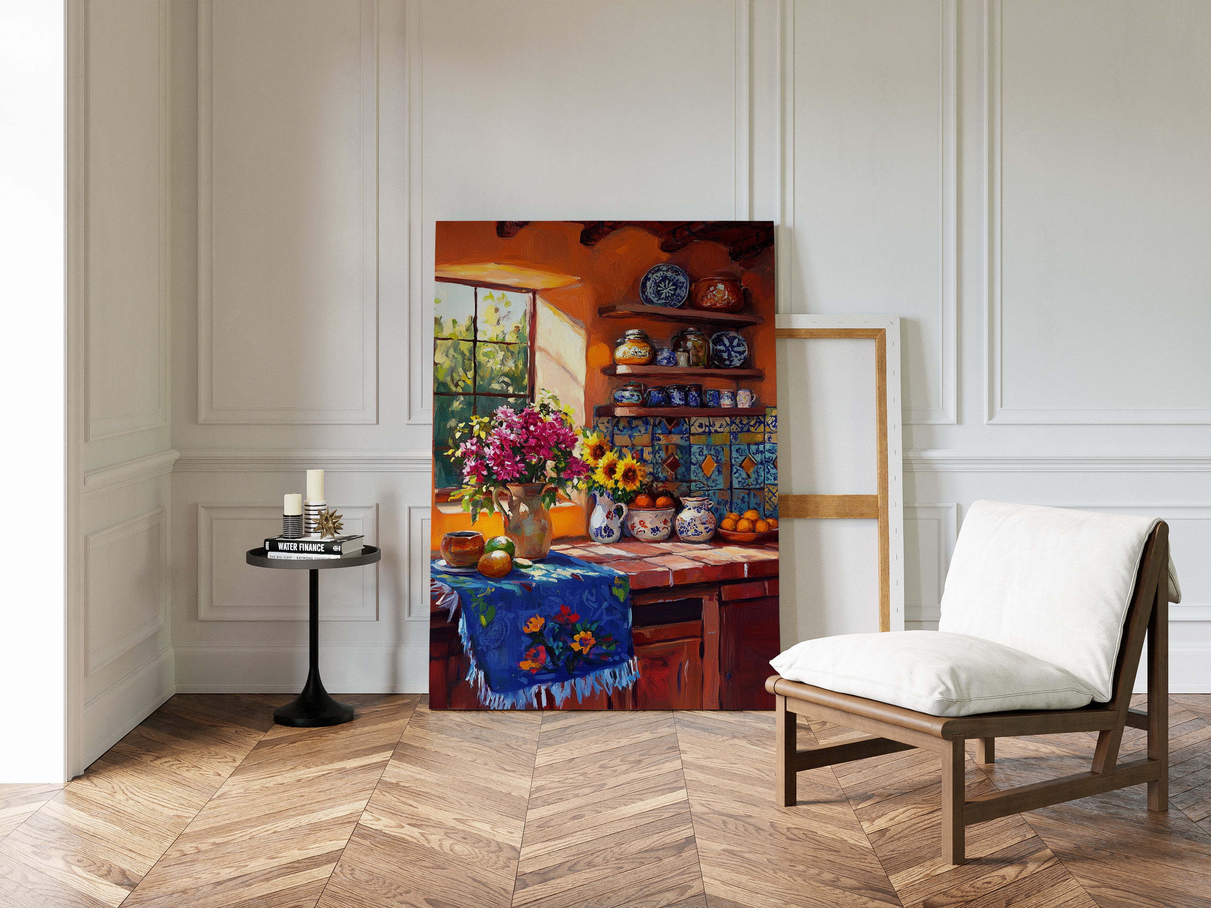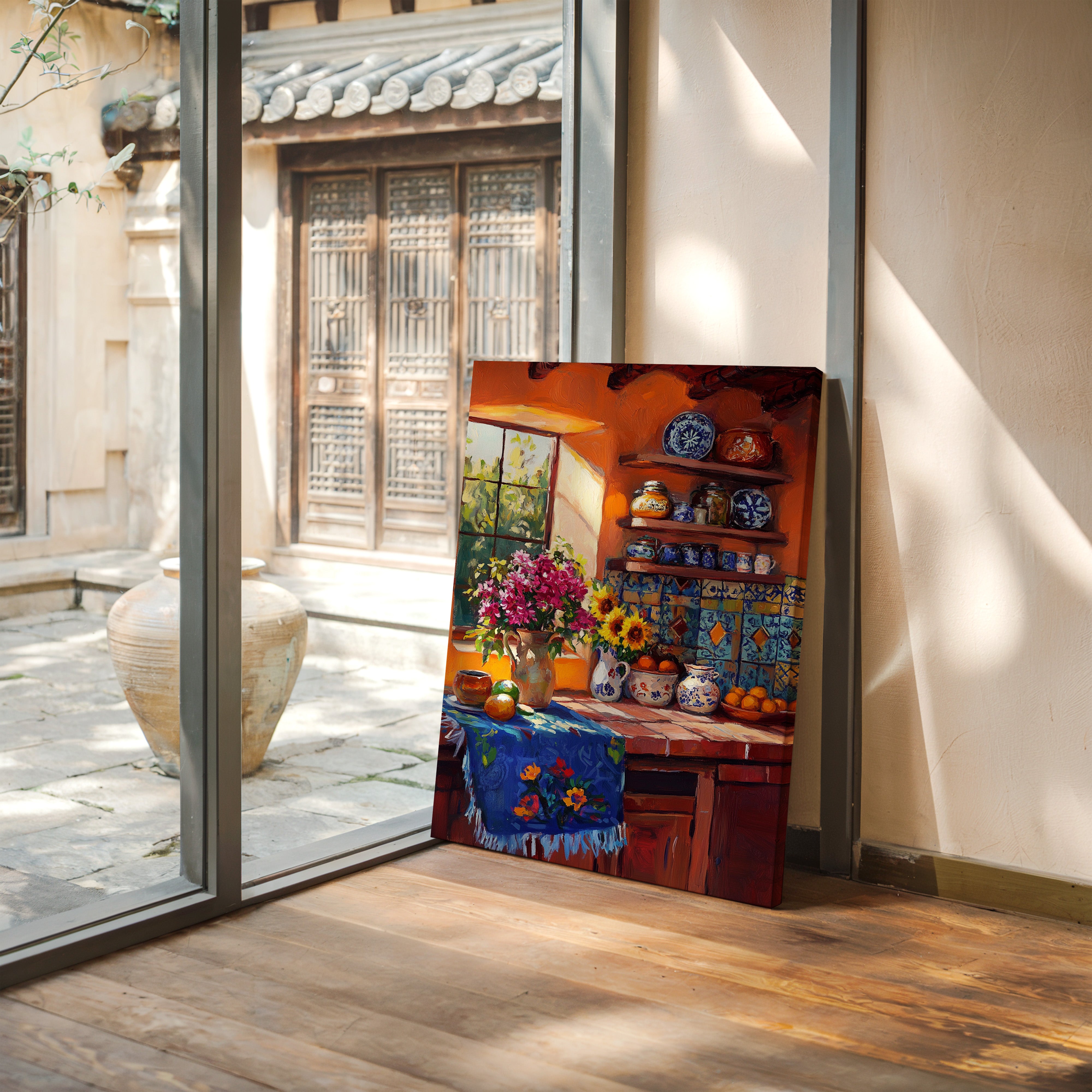Step into a world where the morning sun bathes rustic kitchen shelves in golden light, illuminating a bouquet of vibrant flowers and artisanal pottery. 'Sunlit Morning Reverie' captures the cozy essence of a tranquil kitchen, blending warm hues with a touch of nostalgic charm. This artwork invites you to savor the simple joys of life, offering a visual escape into a sanctuary of color and warmth.