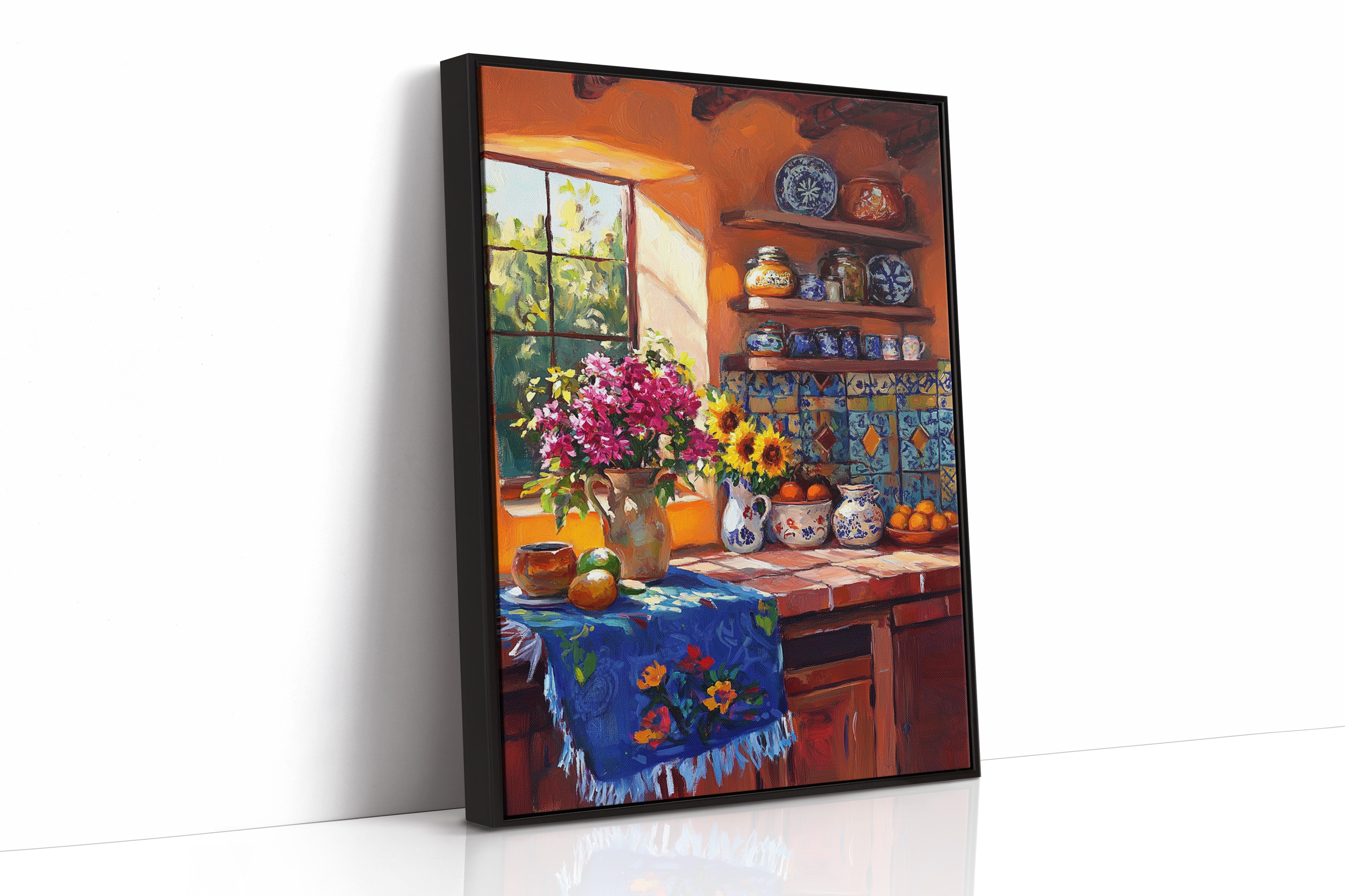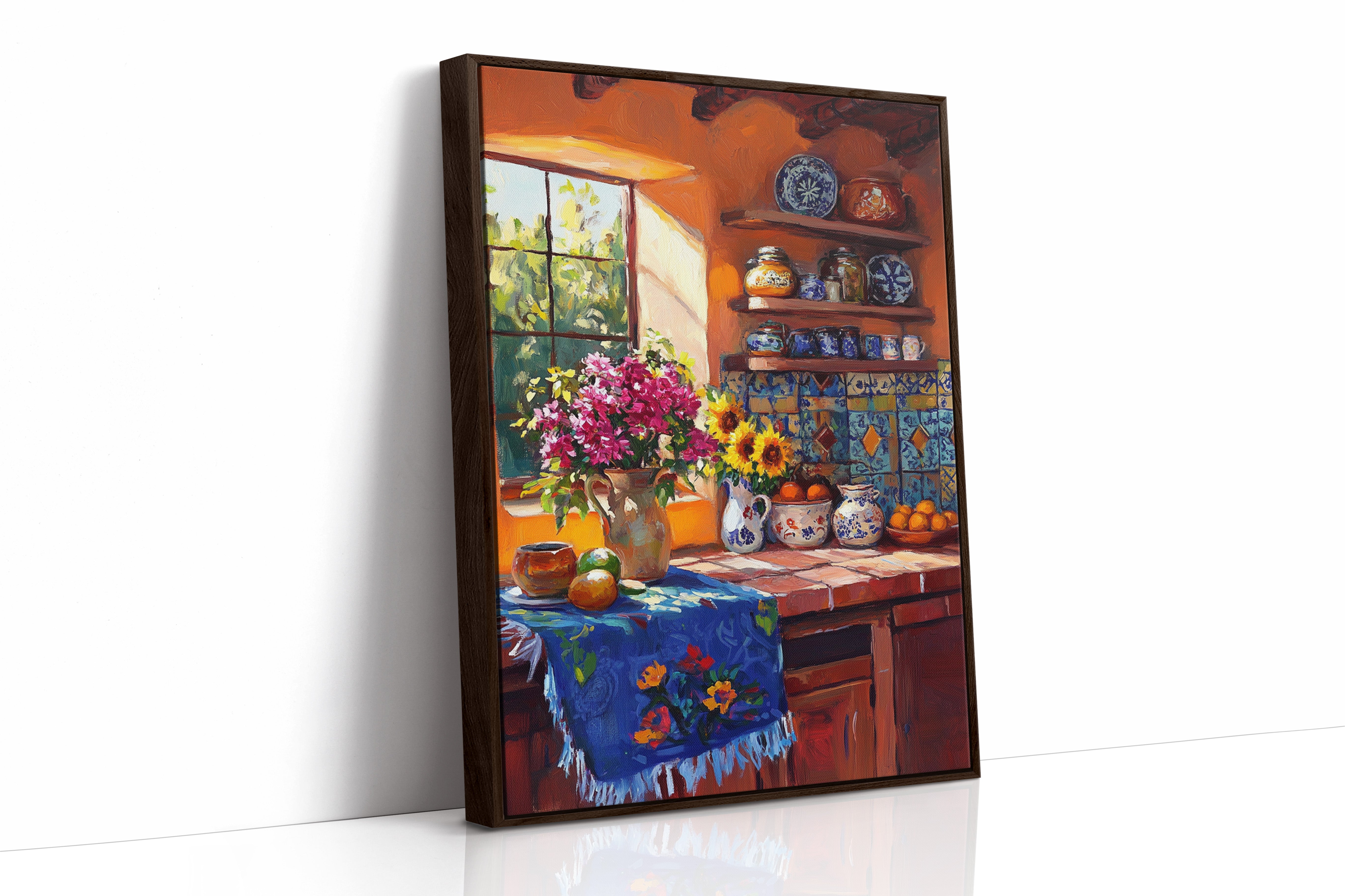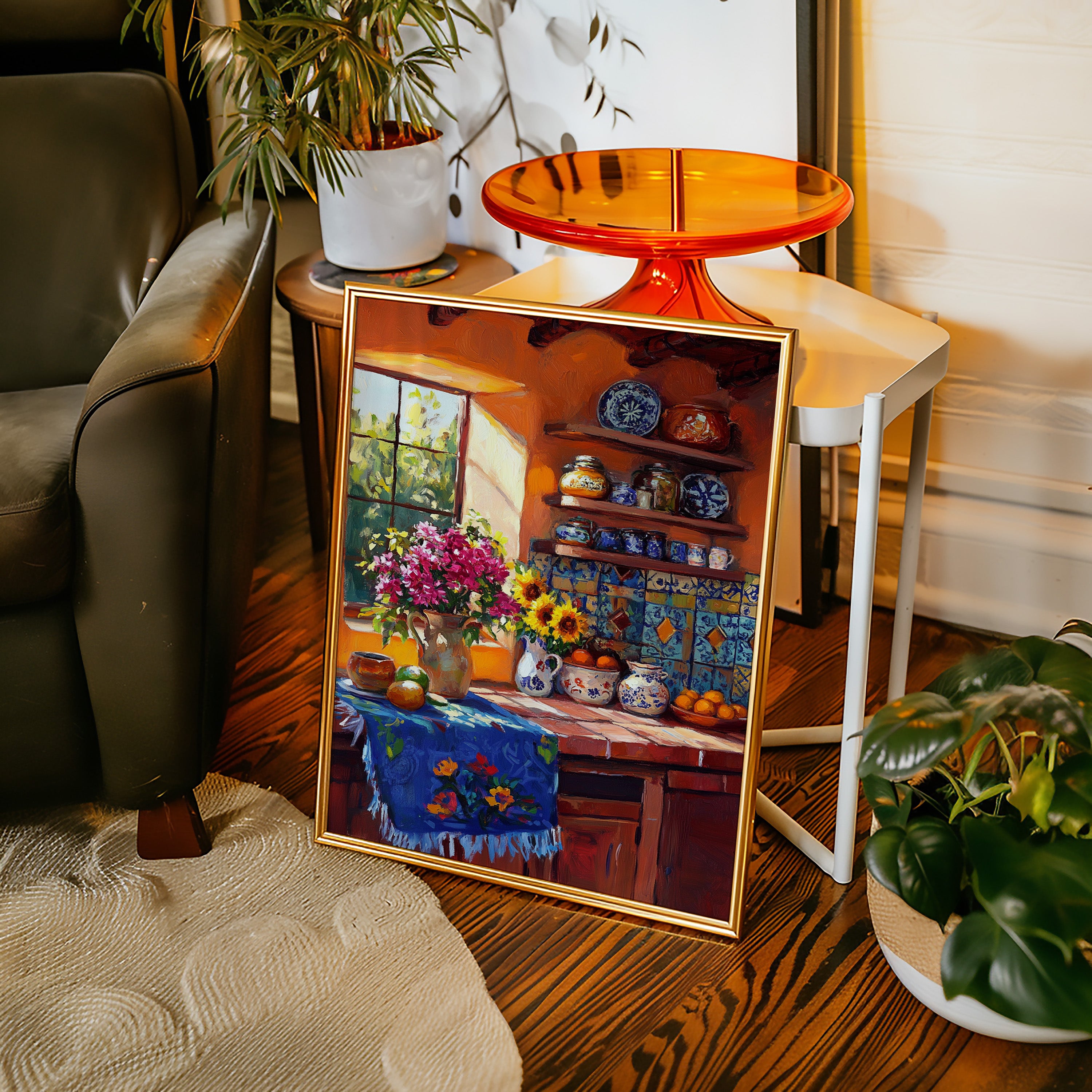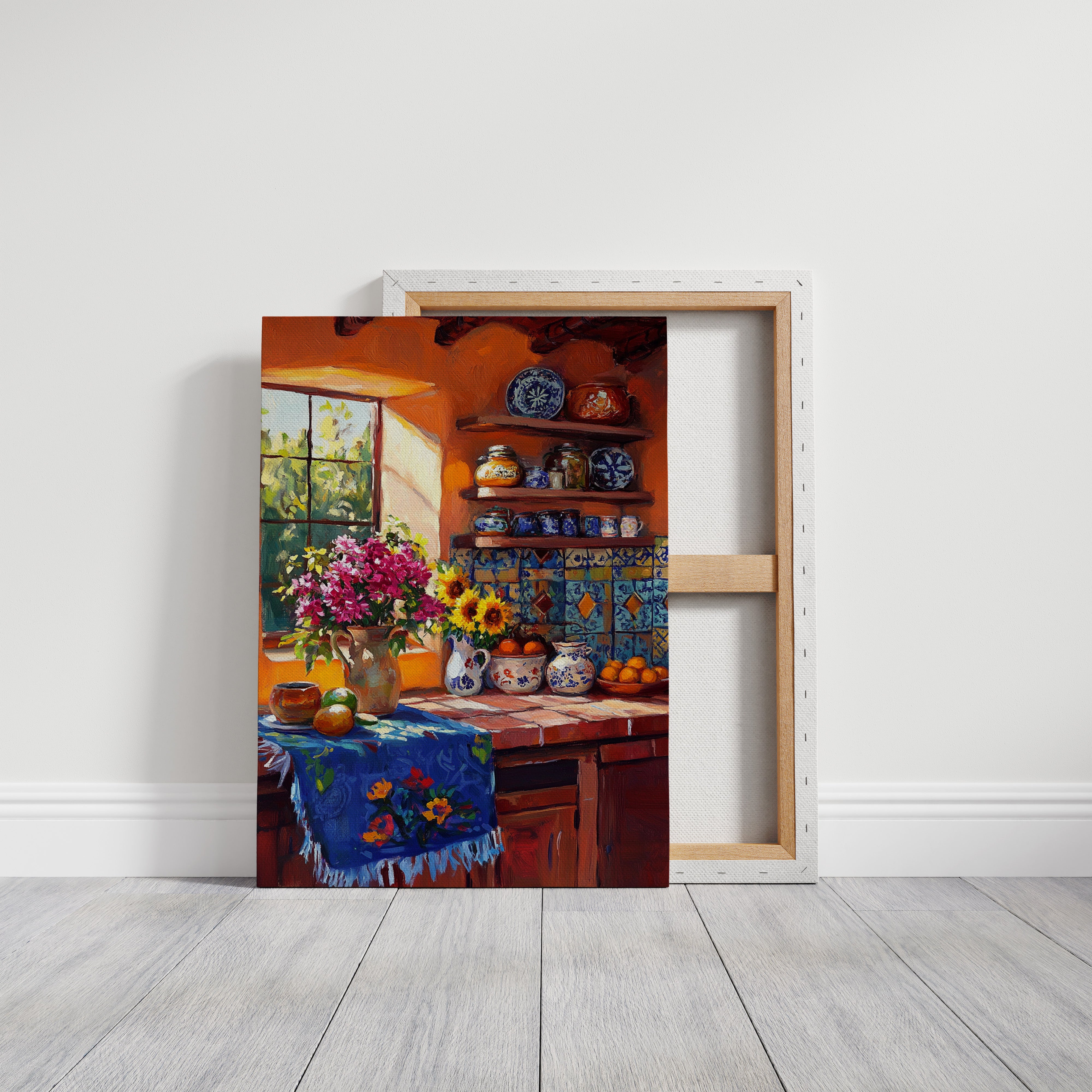 Step into a world where the morning sun bathes rustic kitchen shelves in golden light, illuminating a bouquet of vibrant flowers and artisanal pottery. 'Sunlit Morning Reverie' captures the cozy essence of a tranquil kitchen, blending warm hues with a touch of nostalgic charm. This artwork invites you to savor the simple joys of life, offering a visual escape into a sanctuary of color and warmth.
