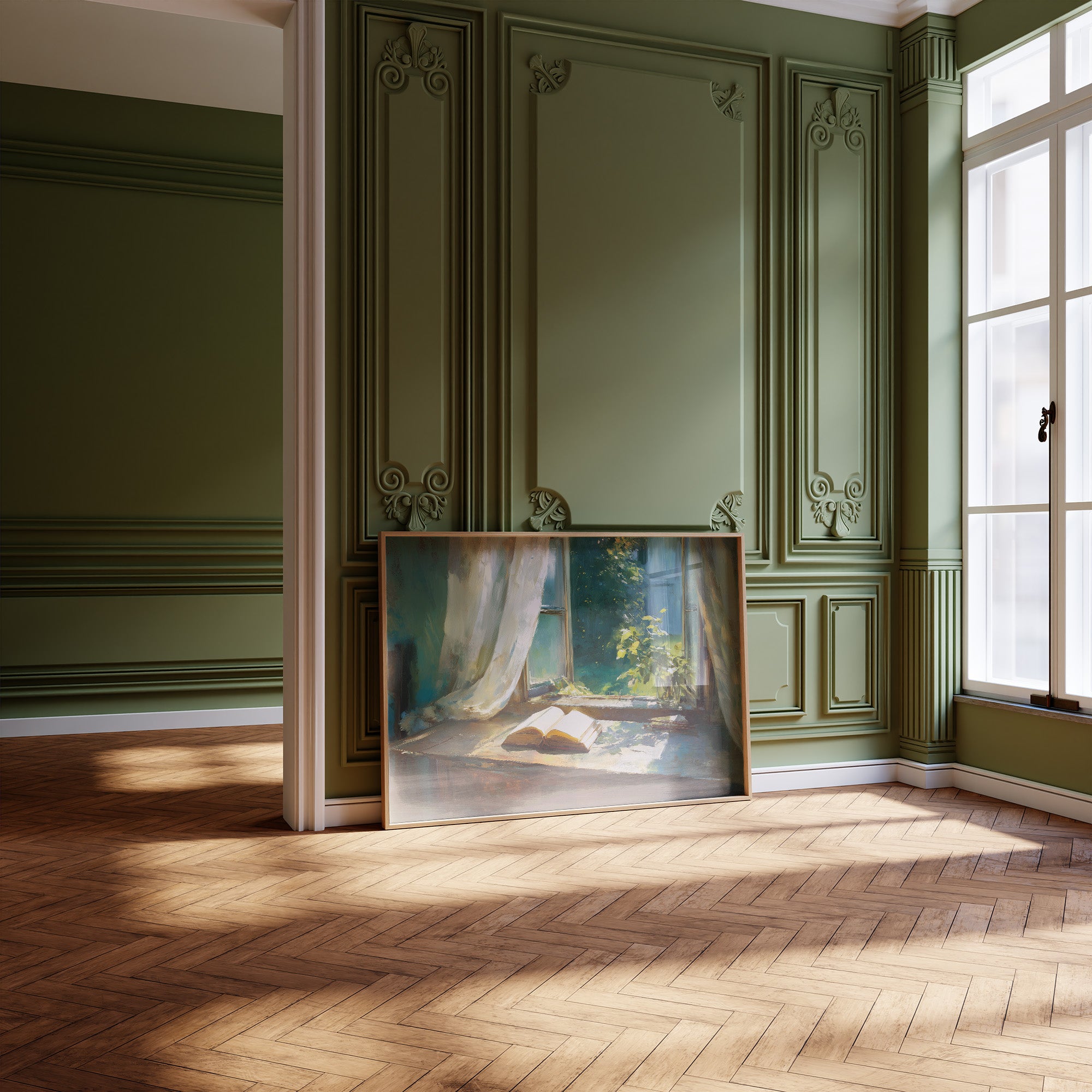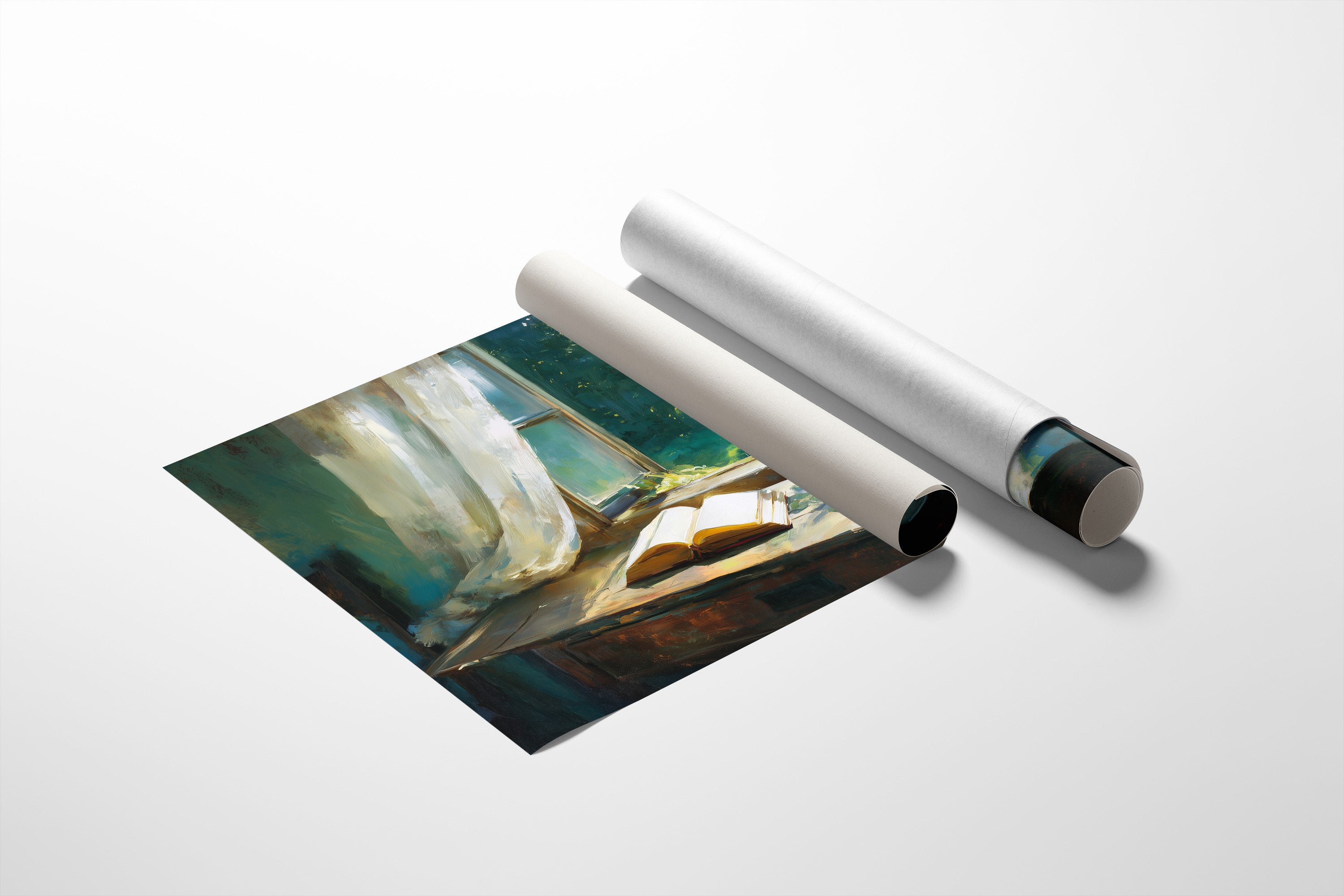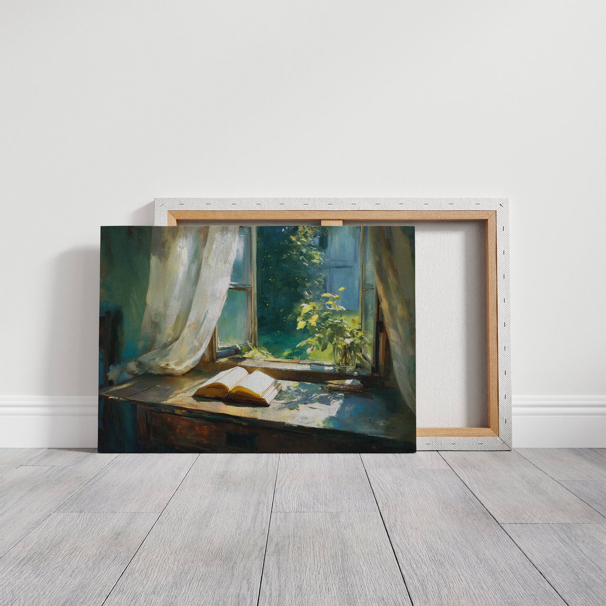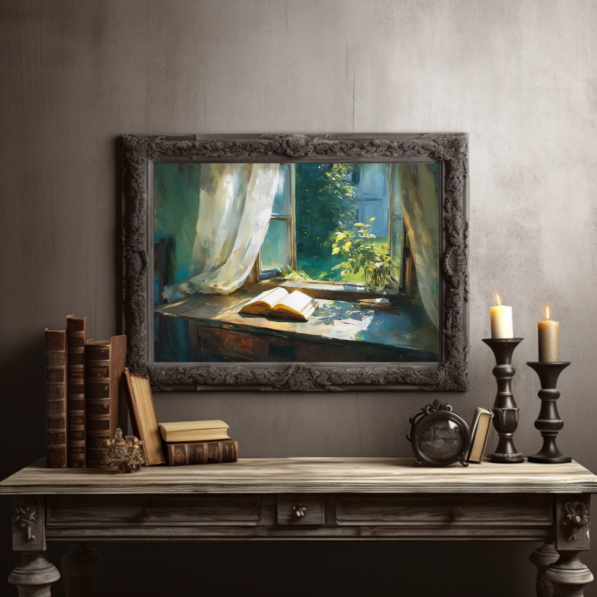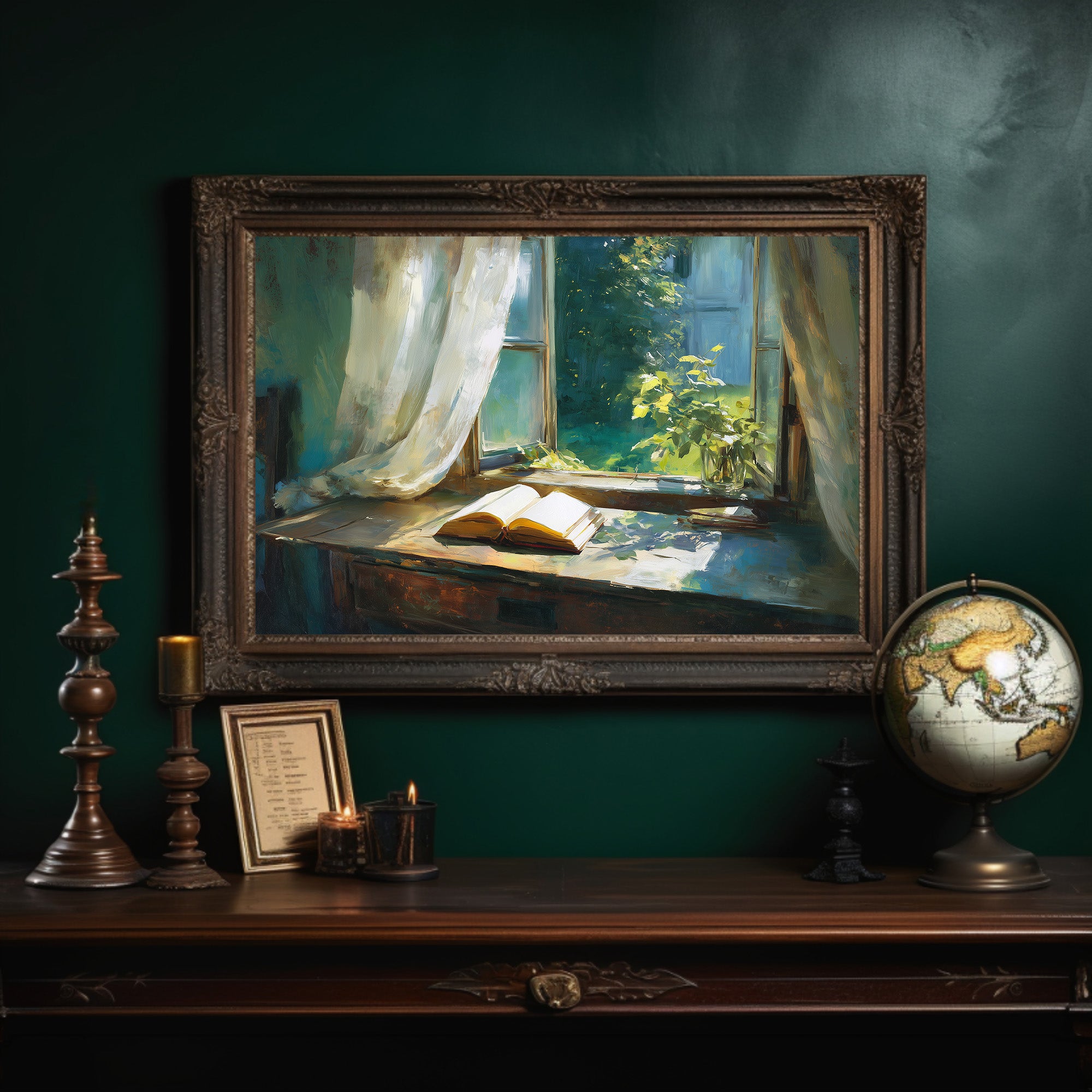 Light spills across the open book, casting golden patterns where words meet window light. The painting captures that perfect afternoon moment when time slowscurtains gently stirring, garden greenery peeking through the window frame, and pages waiting to be turned. Rich teal and emerald tones create depth against the warm wood and creamy curtains, inviting you into this tranquil reading nook where stories and sunshine converge. This piece brings literary charm to a home office, reading corner, or any space where you seek contemplative beauty.