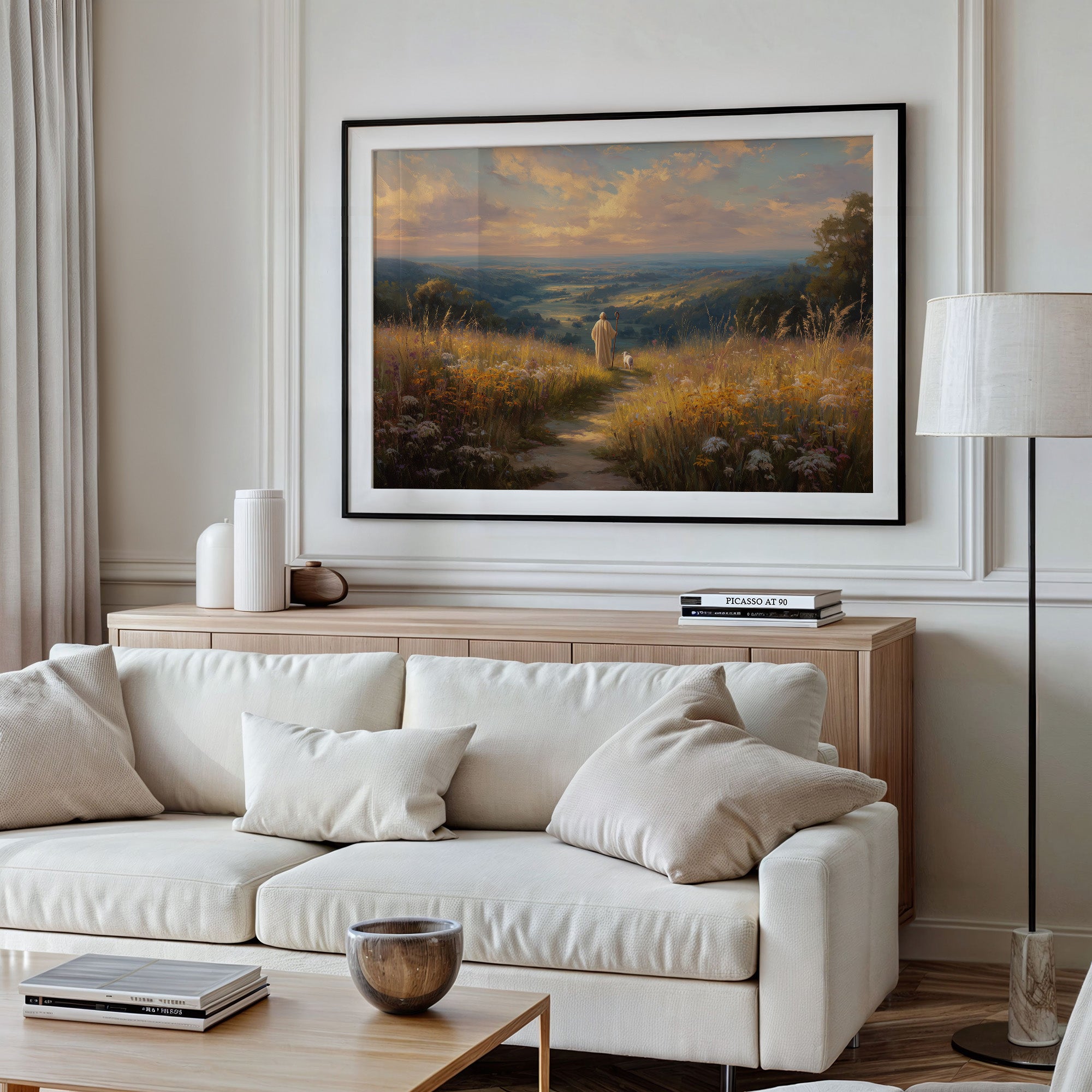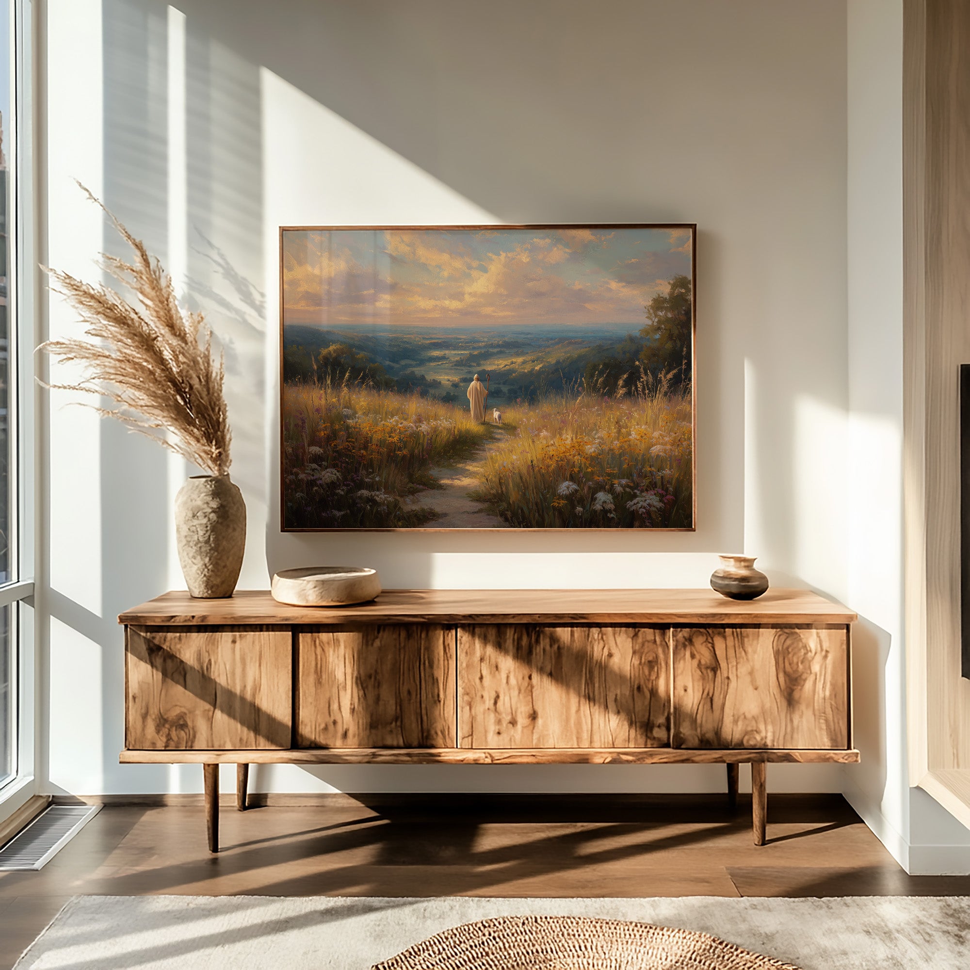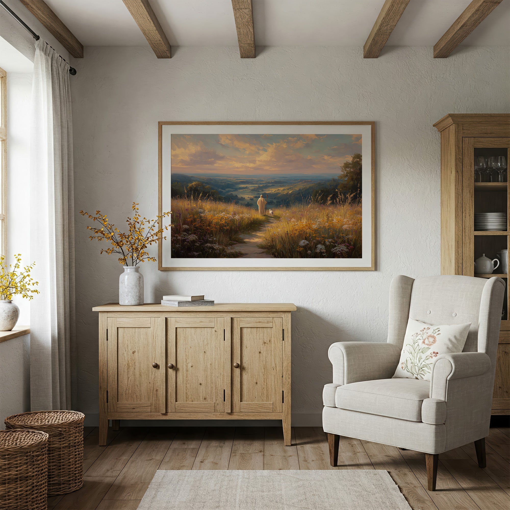 A moment of tranquil guidance captured in warm amber light, where rolling hills stretch endlessly toward the horizon. The painting bathes in the glow of sunset clouds, illuminating a figure and companion walking a winding trail through wildflower-dotted meadows. Rich golden grasses frame the journey, while distant valleys fade into misty blues, creating a sense of both vastness and intimate connection with the landscape.
