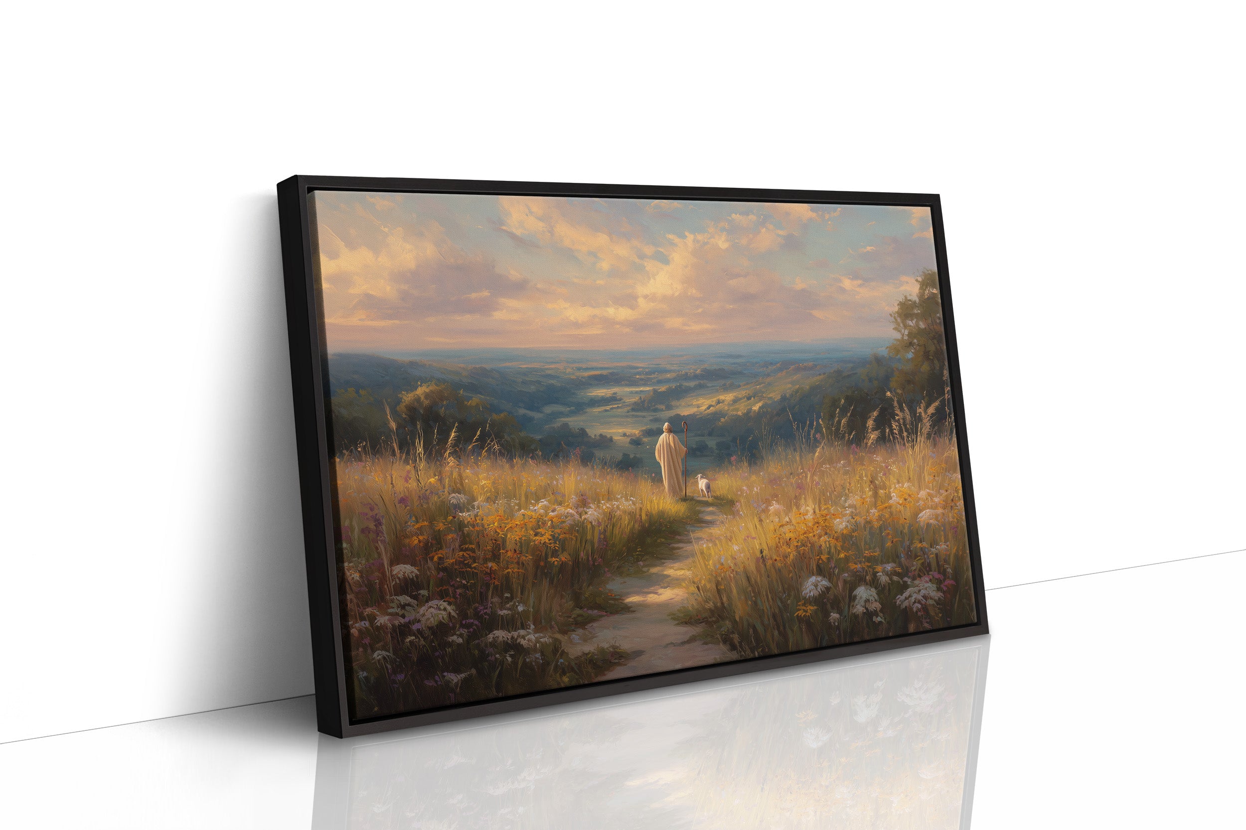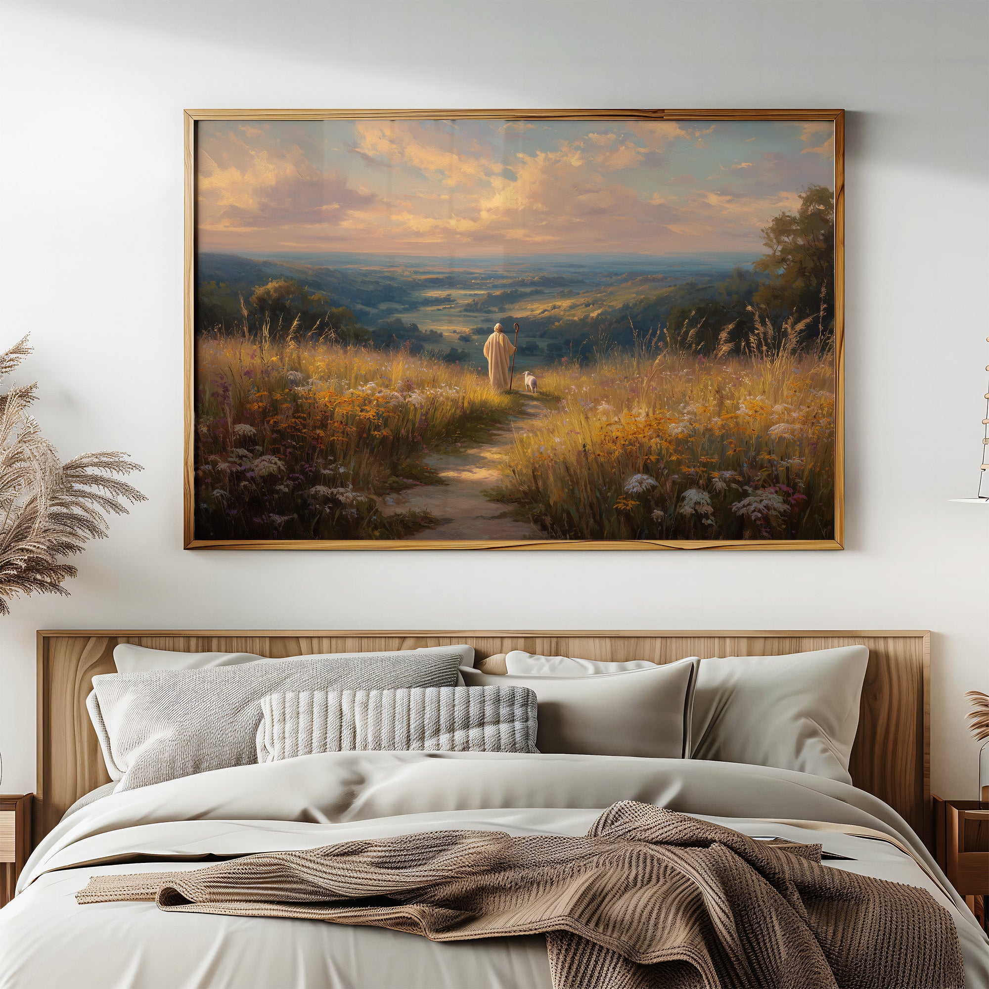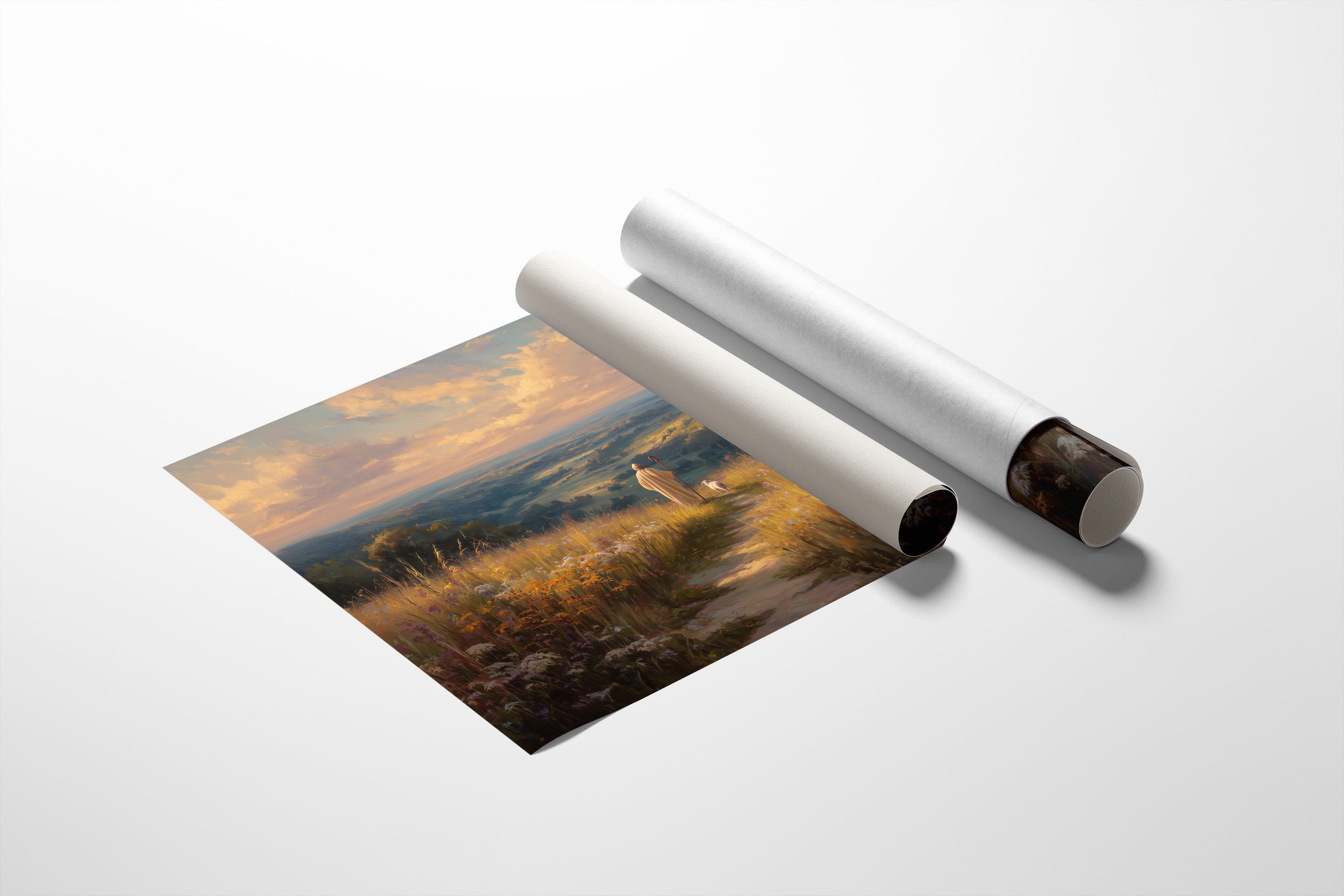 A moment of tranquil guidance captured in warm amber light, where rolling hills stretch endlessly toward the horizon. The painting bathes in the glow of sunset clouds, illuminating a figure and companion walking a winding trail through wildflower-dotted meadows. Rich golden grasses frame the journey, while distant valleys fade into misty blues, creating a sense of both vastness and intimate connection with the landscape.