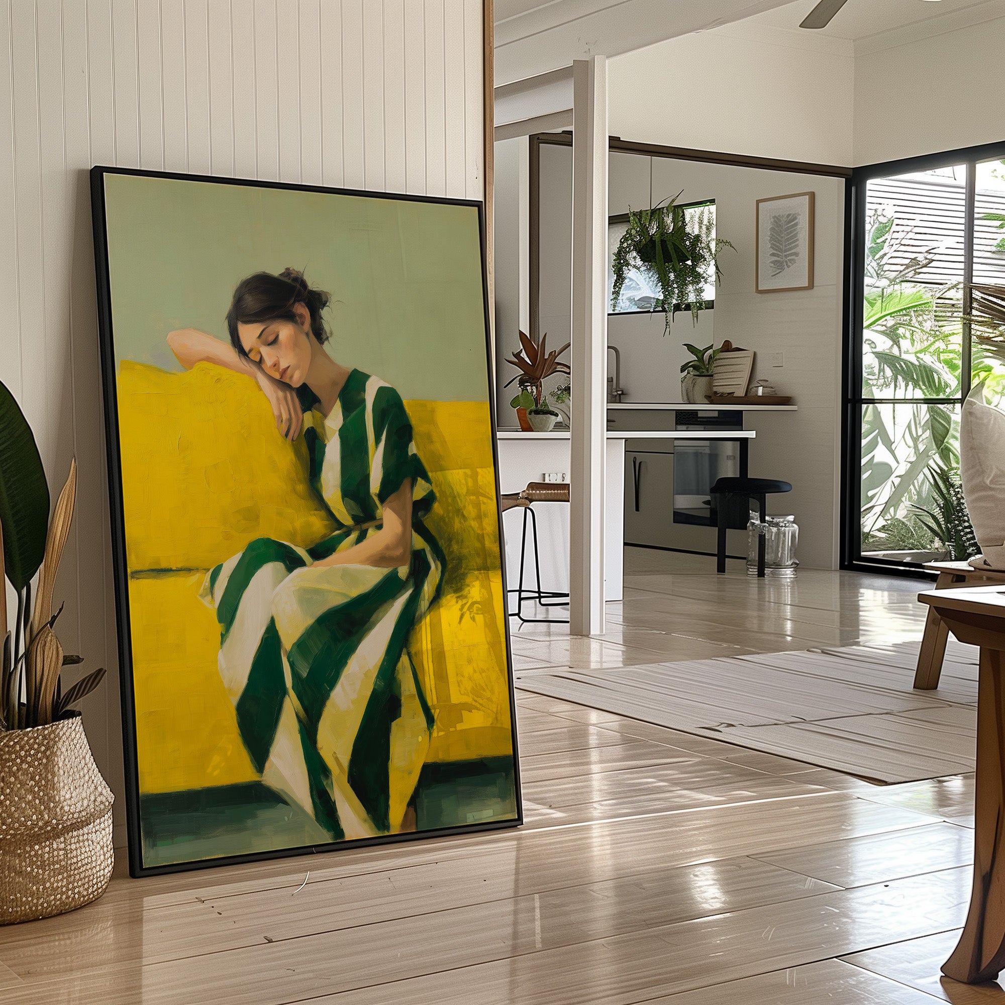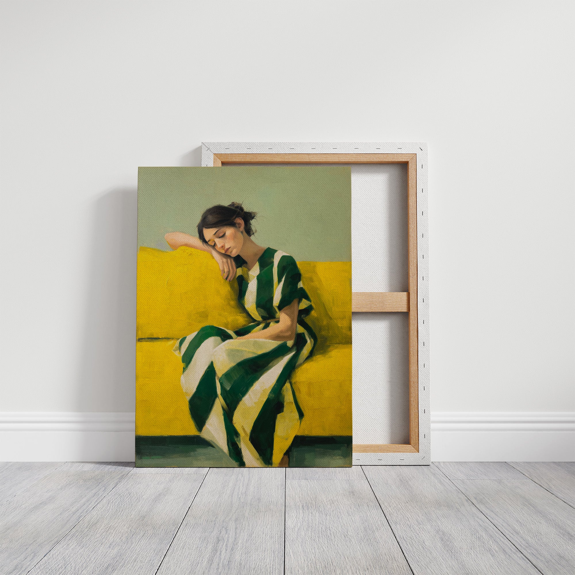 Afternoon light spills across a moment of peaceful repose, where deep greens dance with brilliant yellow in gentle harmony. The brushstrokes capture a quiet meditation, with flowing fabric creating a visual poetry of shadow and light against a radiant backdrop. This contemporary piece brings together the sophistication of minimalist portraiture with bold color blocking that commands attention while maintaining serenity. This statement piece would elevate a reading nook, bring artistic depth to a modern living room, or create an engaging focal point in a sophisticated home office.