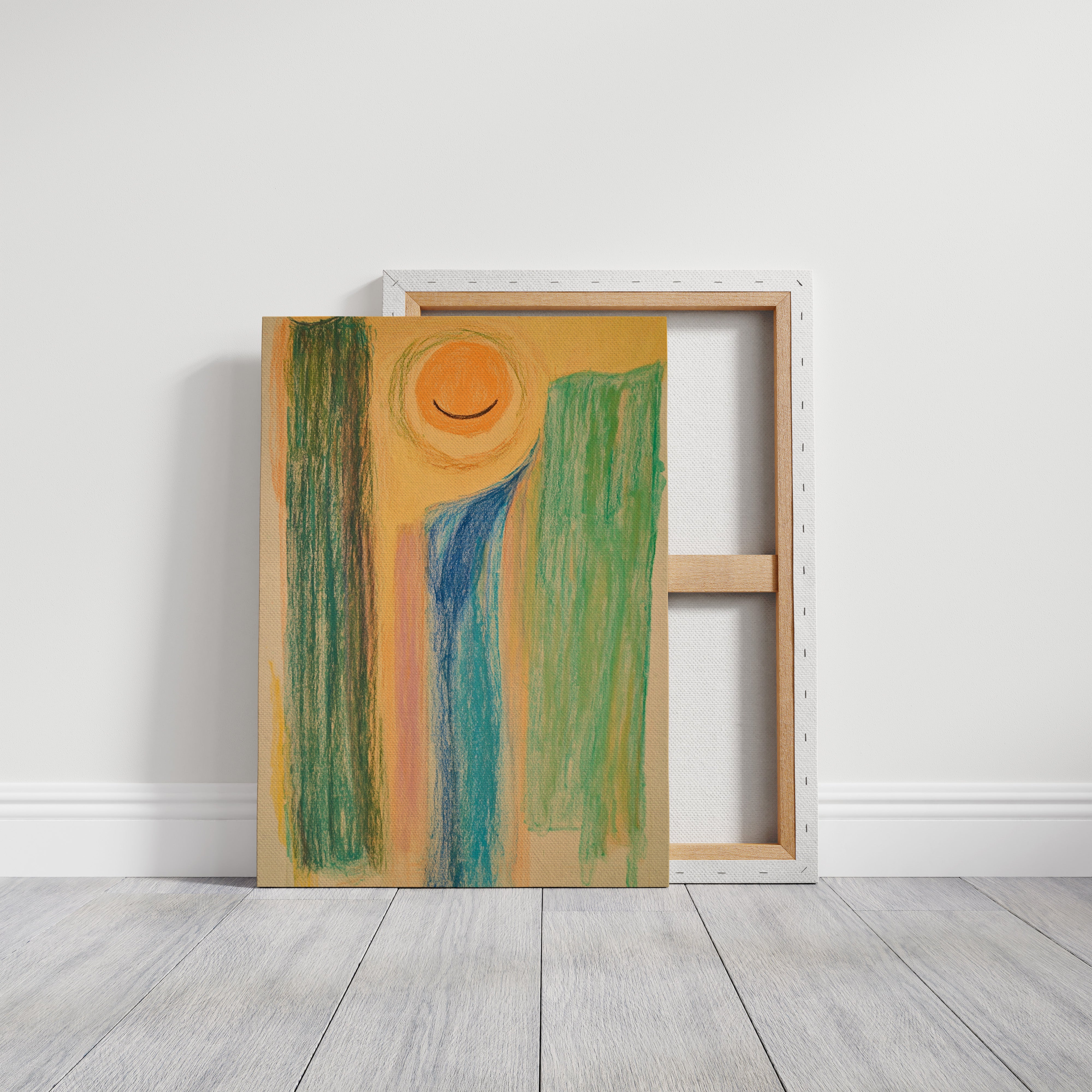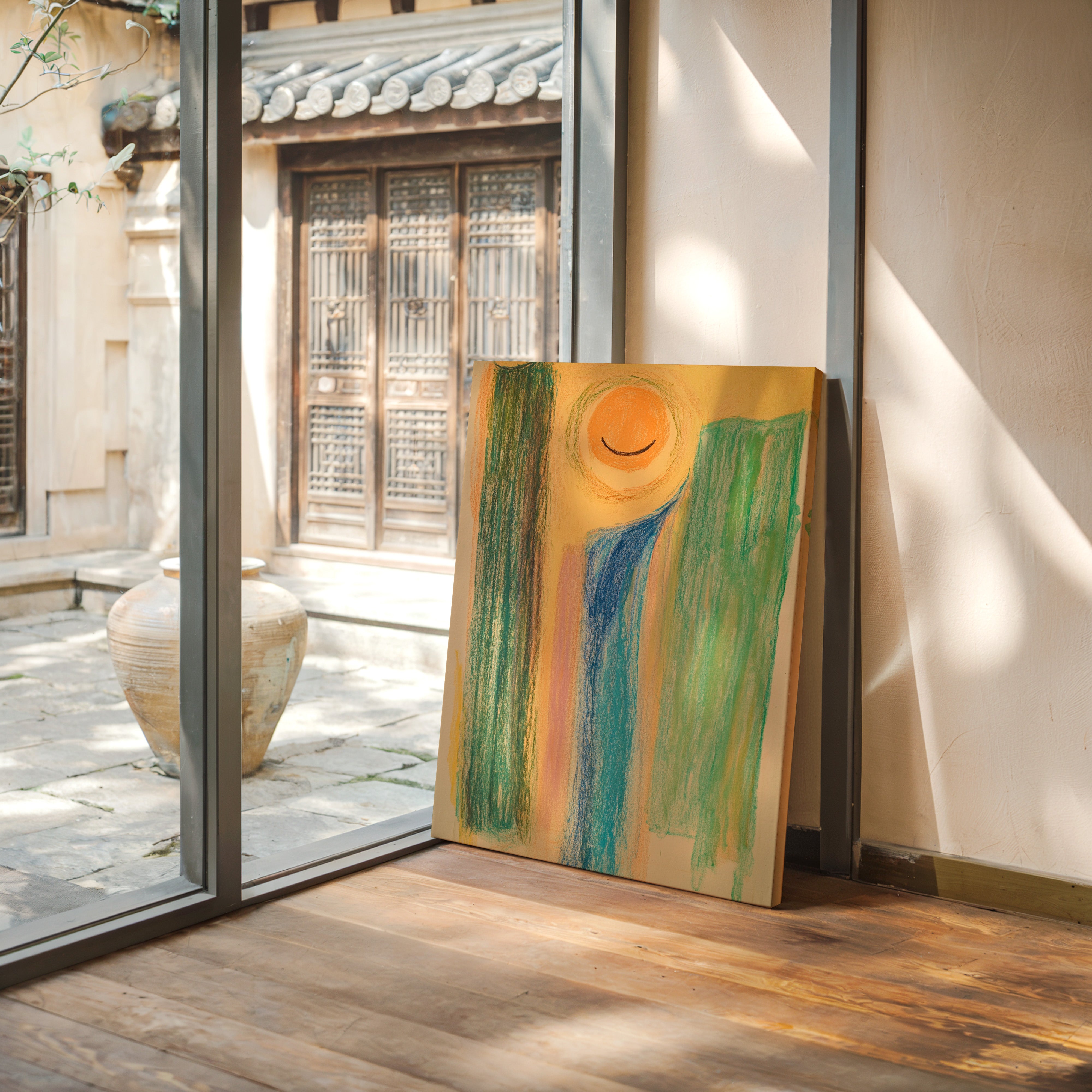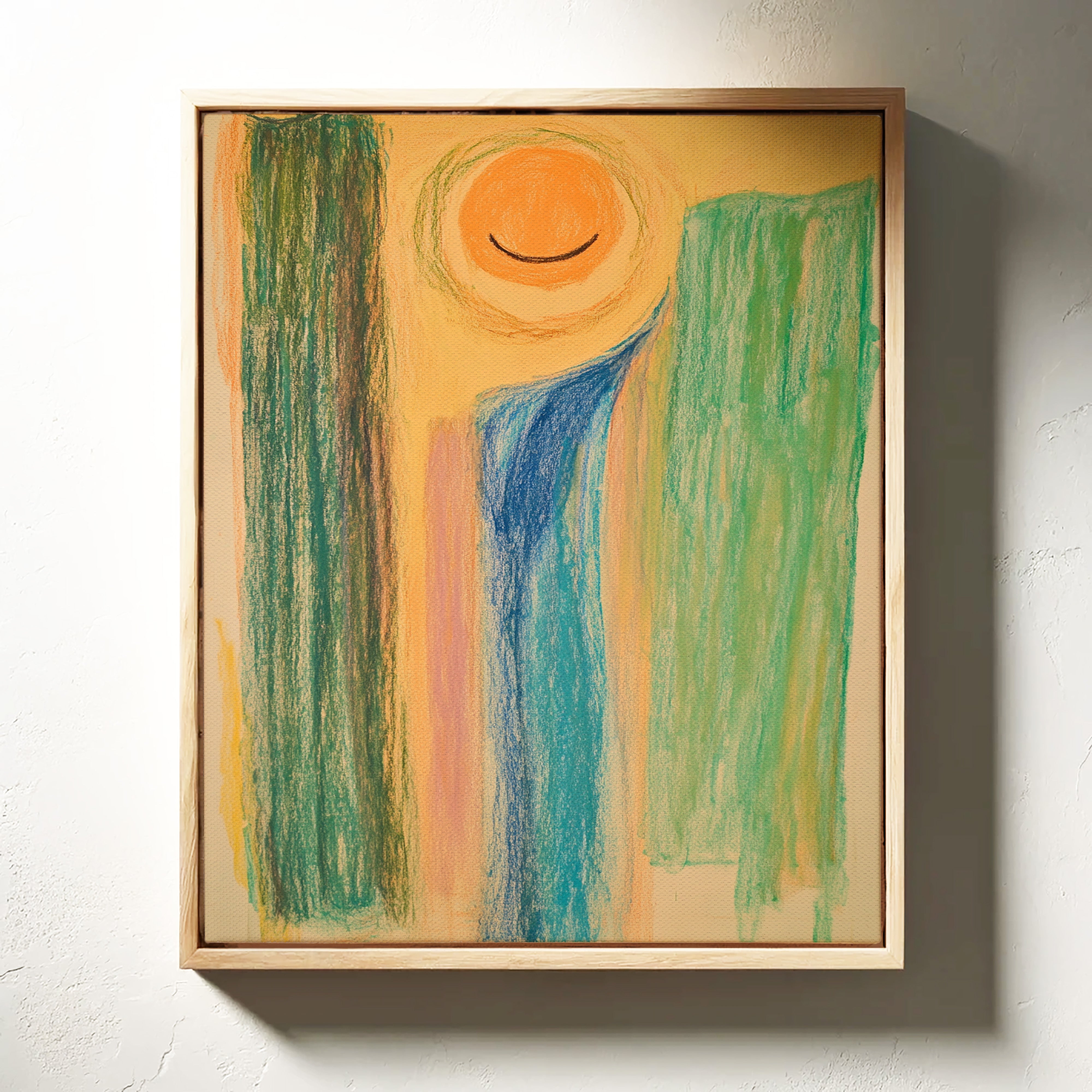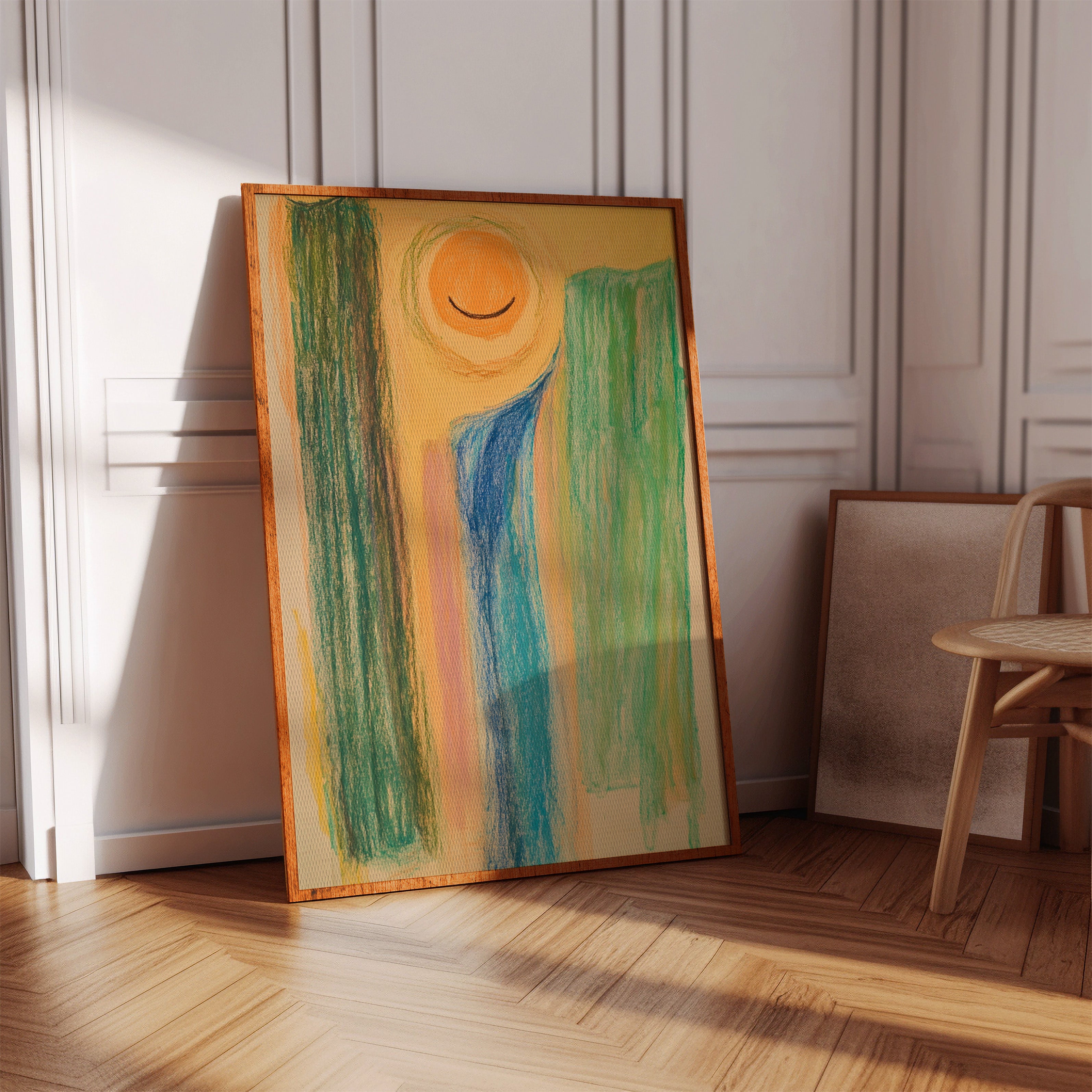 A gentle warmth radiates from a smiling sun, casting golden light across a serene landscape. Vertical strokes of deep forest green and cerulean blue create a peaceful valley, where a river of light meanders between towering cliffs. The composition speaks to the simple beauty of natural forms, with soft pastels and bold strokes creating a harmonious dance of color and movement. Perfect for meditation spaces or reading nooks where its calming energy can foster moments of quiet reflection.