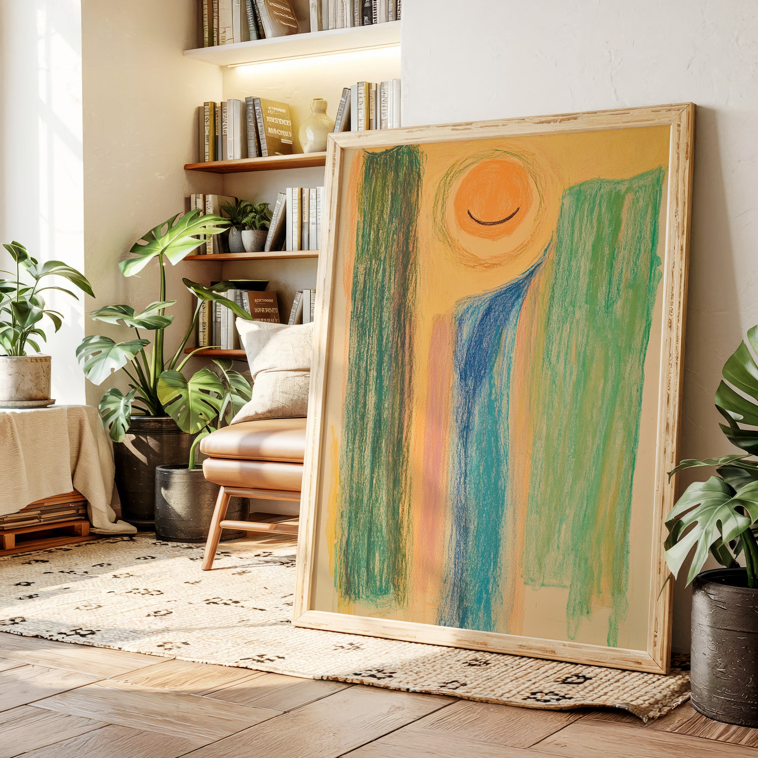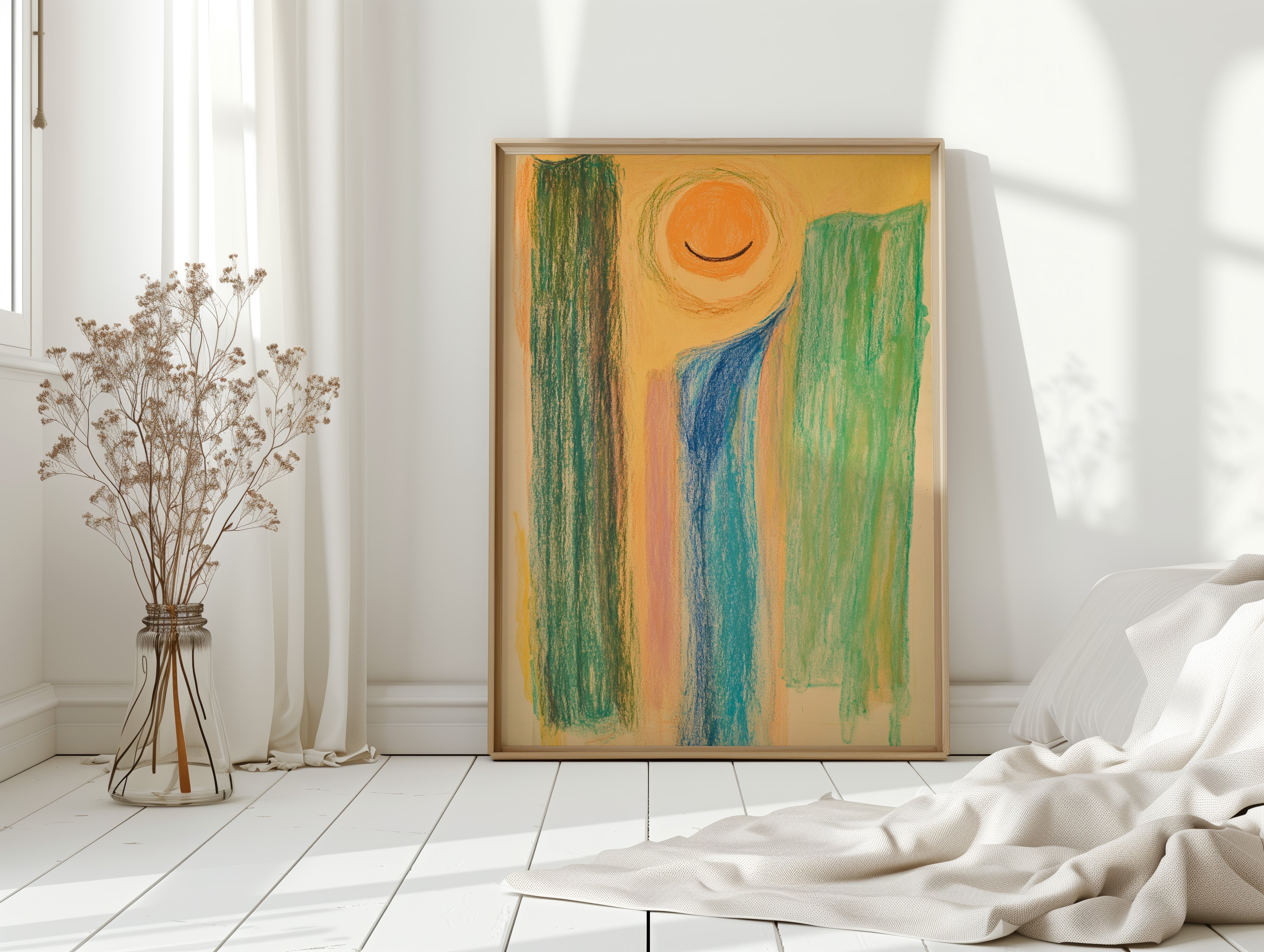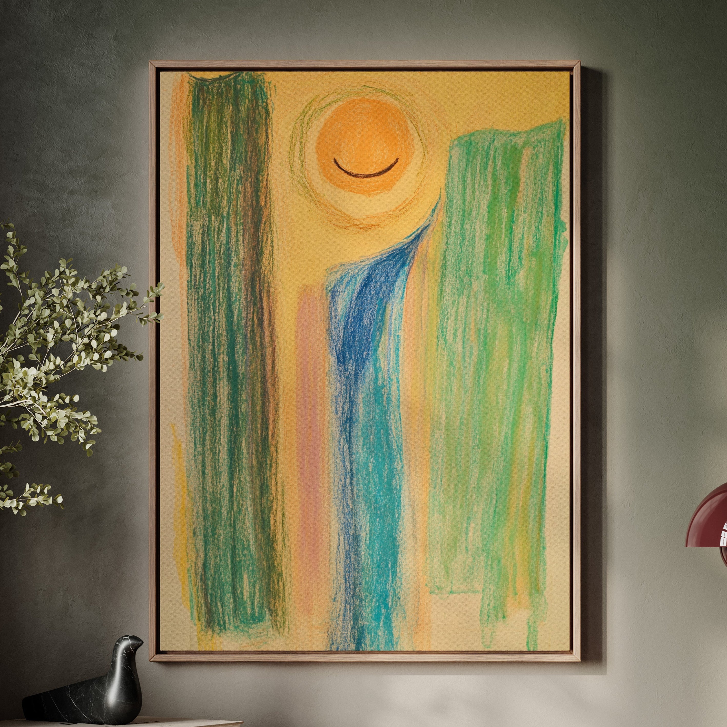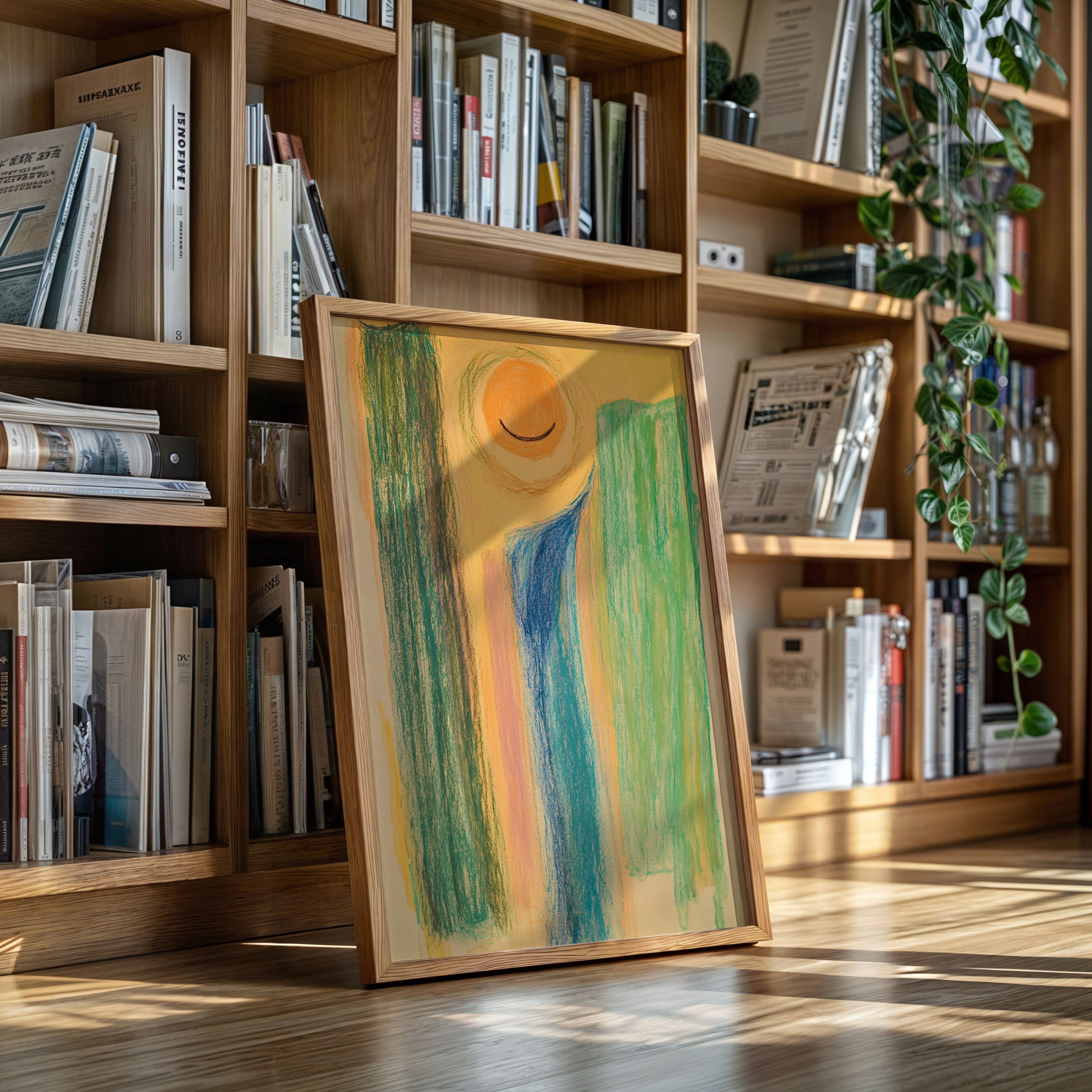 A gentle warmth radiates from a smiling sun, casting golden light across a serene landscape. Vertical strokes of deep forest green and cerulean blue create a peaceful valley, where a river of light meanders between towering cliffs. The composition speaks to the simple beauty of natural forms, with soft pastels and bold strokes creating a harmonious dance of color and movement. Perfect for meditation spaces or reading nooks where its calming energy can foster moments of quiet reflection.