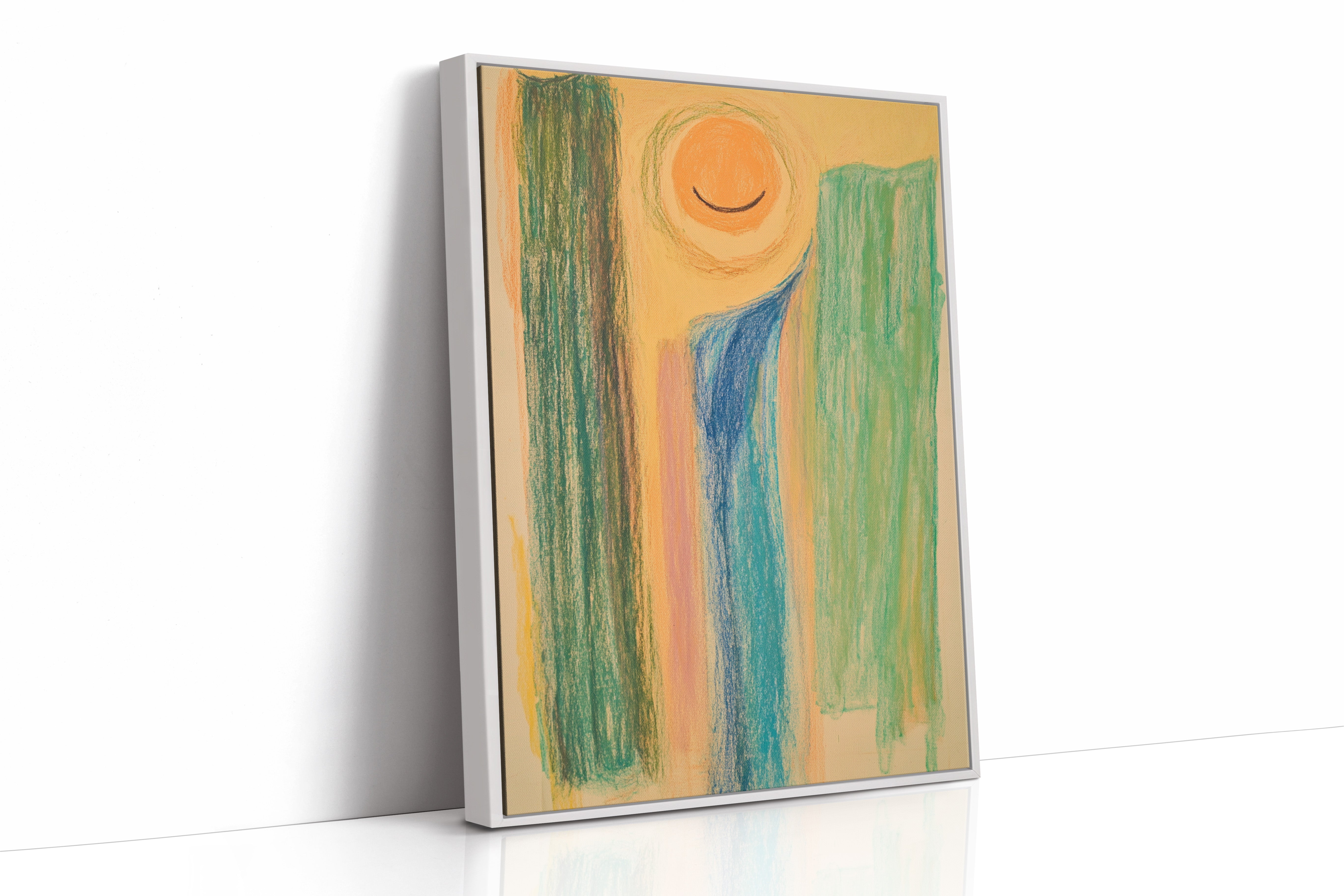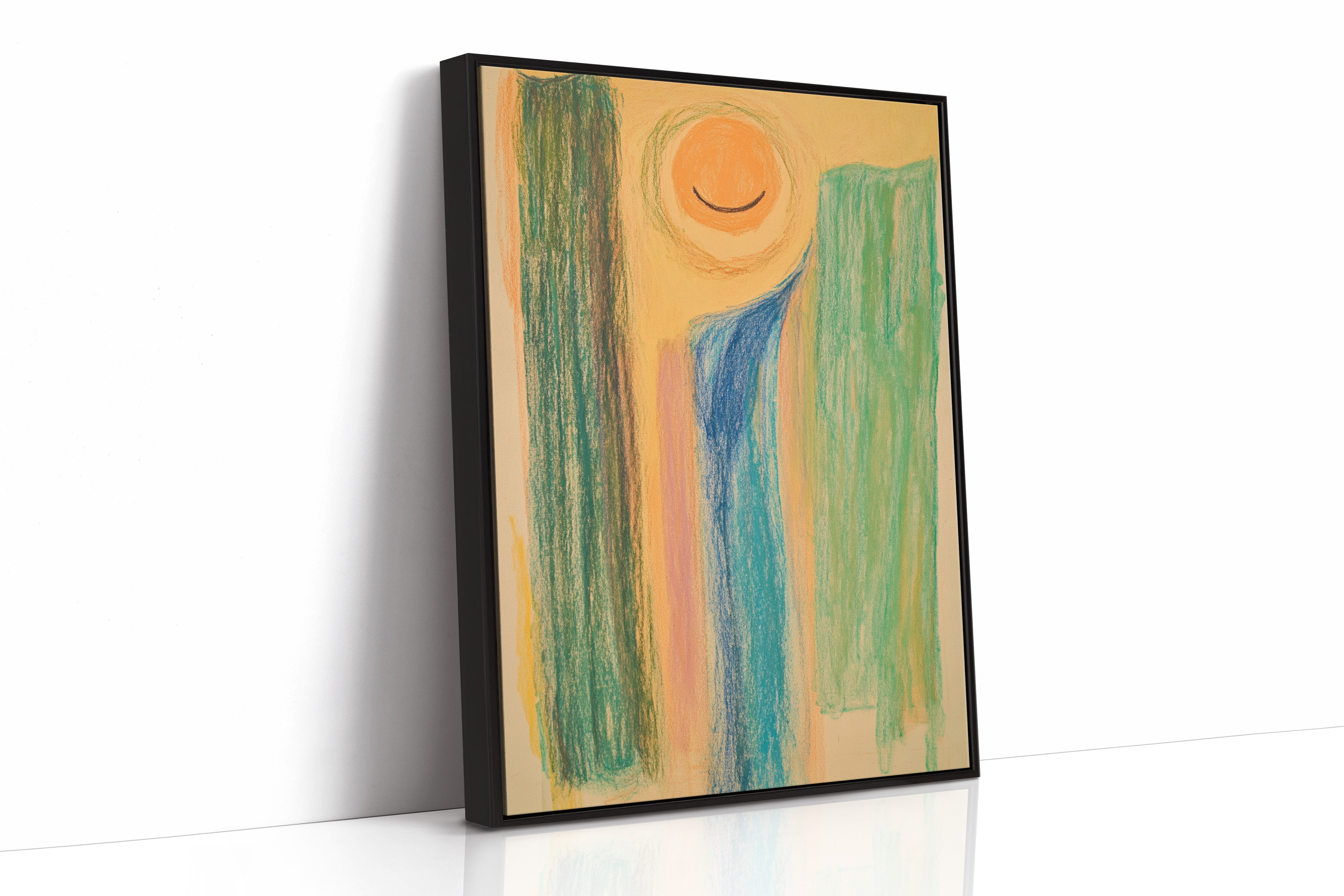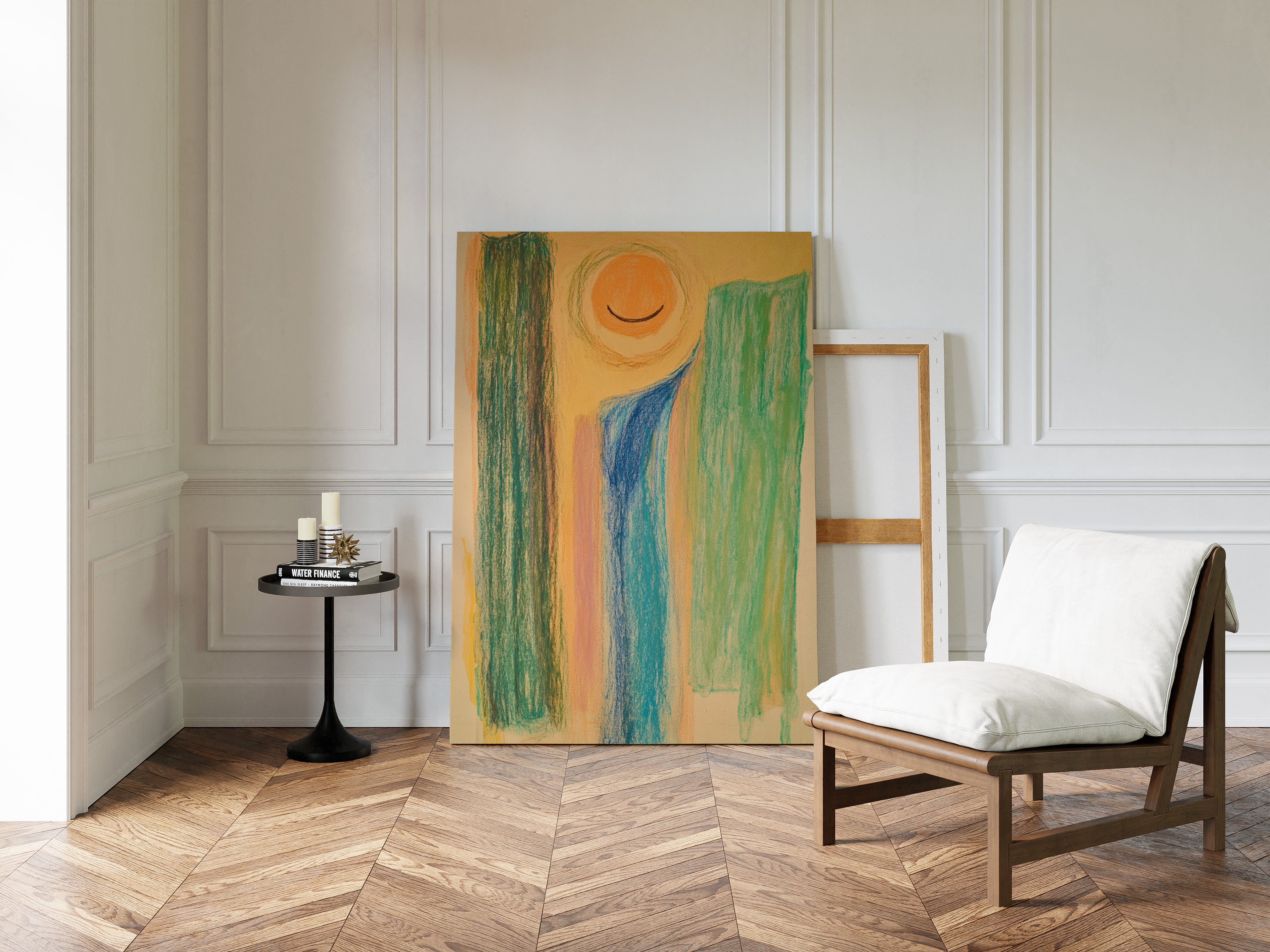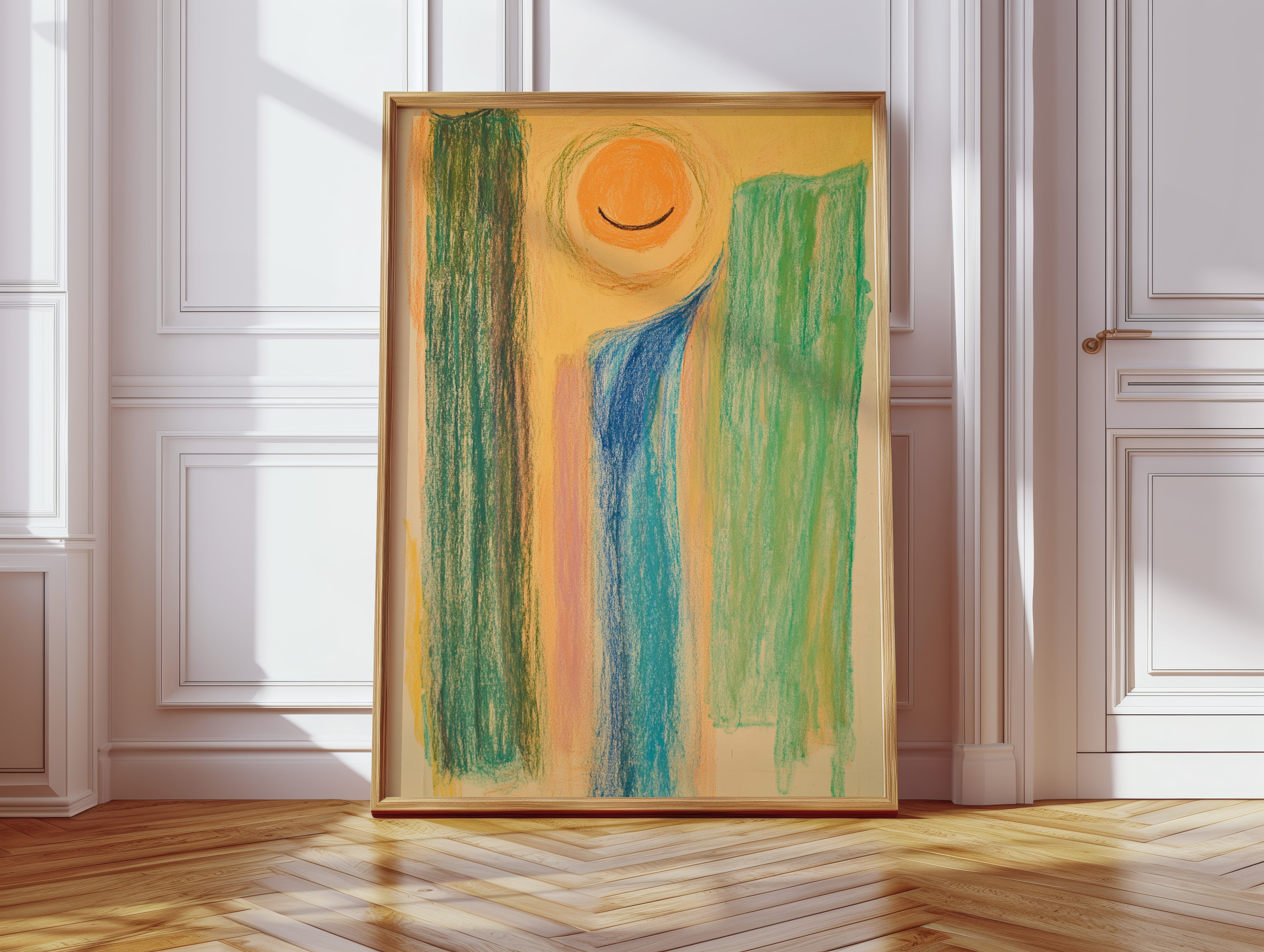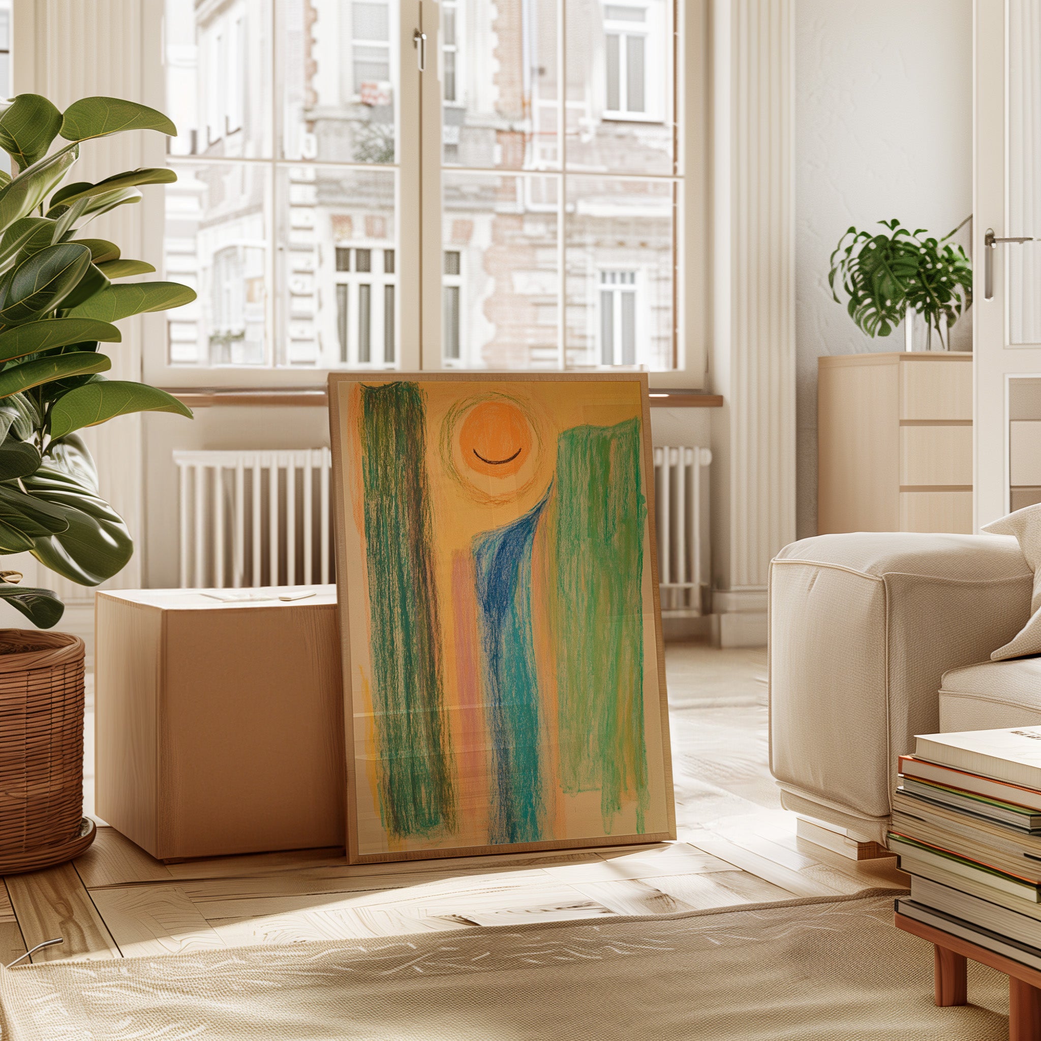 A gentle warmth radiates from a smiling sun, casting golden light across a serene landscape. Vertical strokes of deep forest green and cerulean blue create a peaceful valley, where a river of light meanders between towering cliffs. The composition speaks to the simple beauty of natural forms, with soft pastels and bold strokes creating a harmonious dance of color and movement. Perfect for meditation spaces or reading nooks where its calming energy can foster moments of quiet reflection.