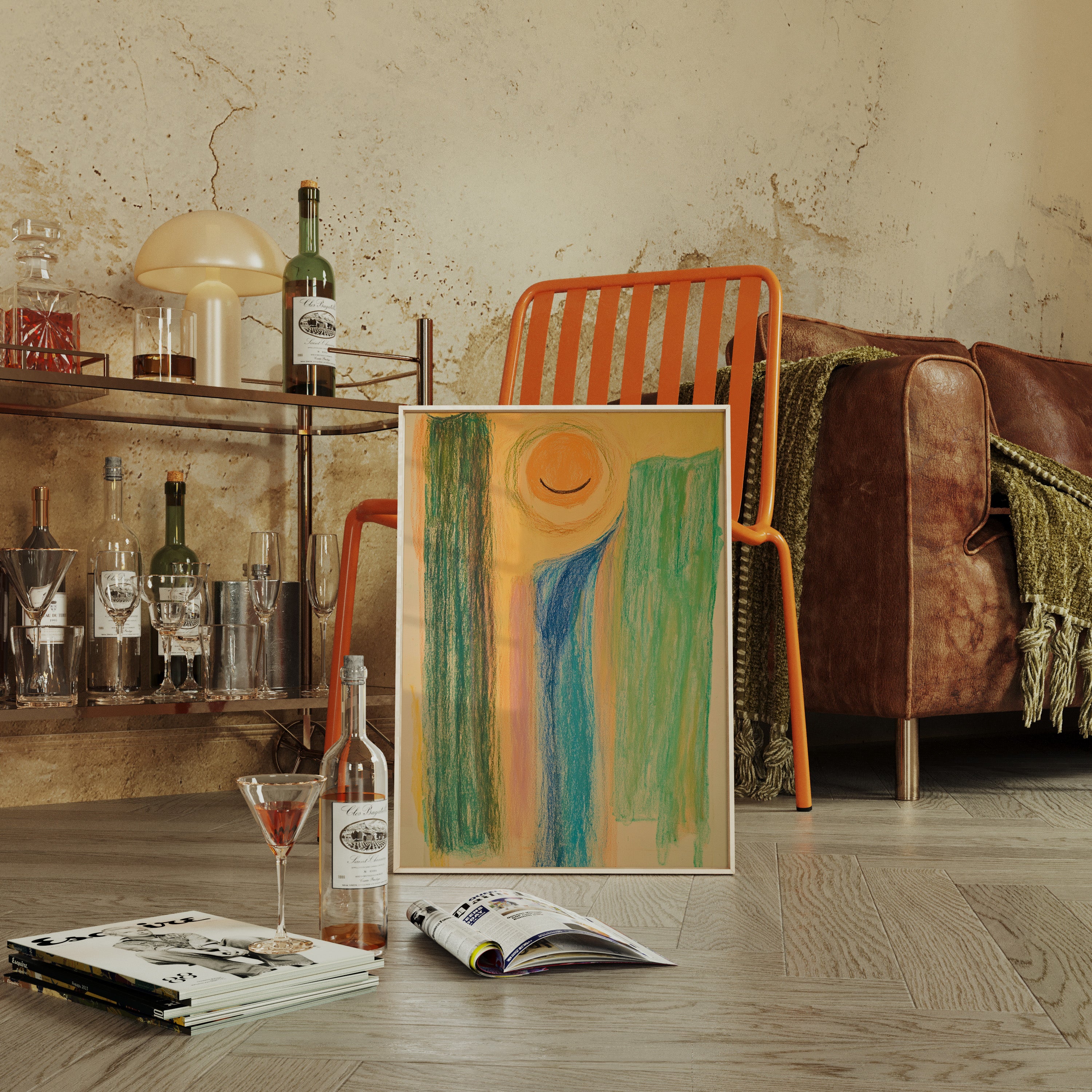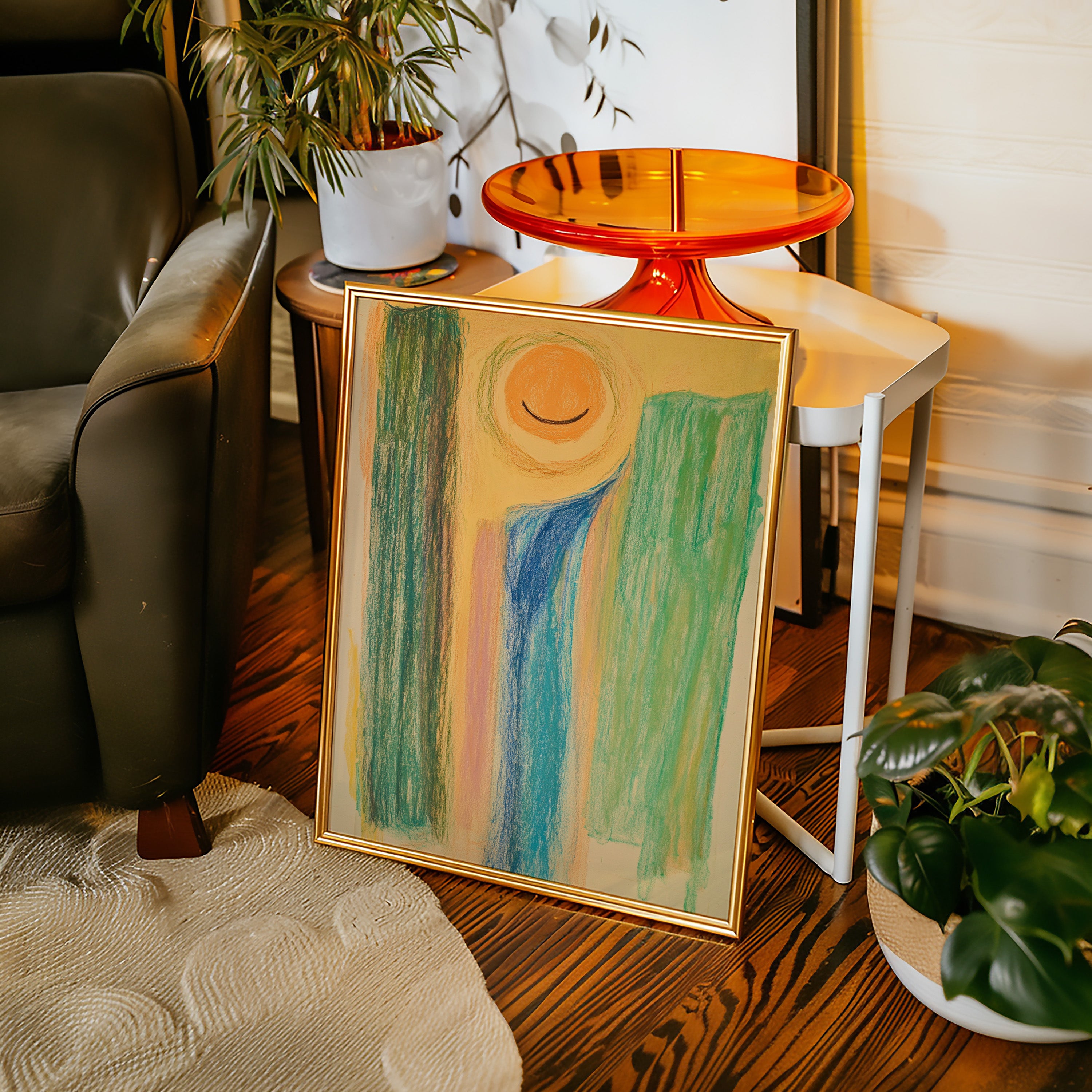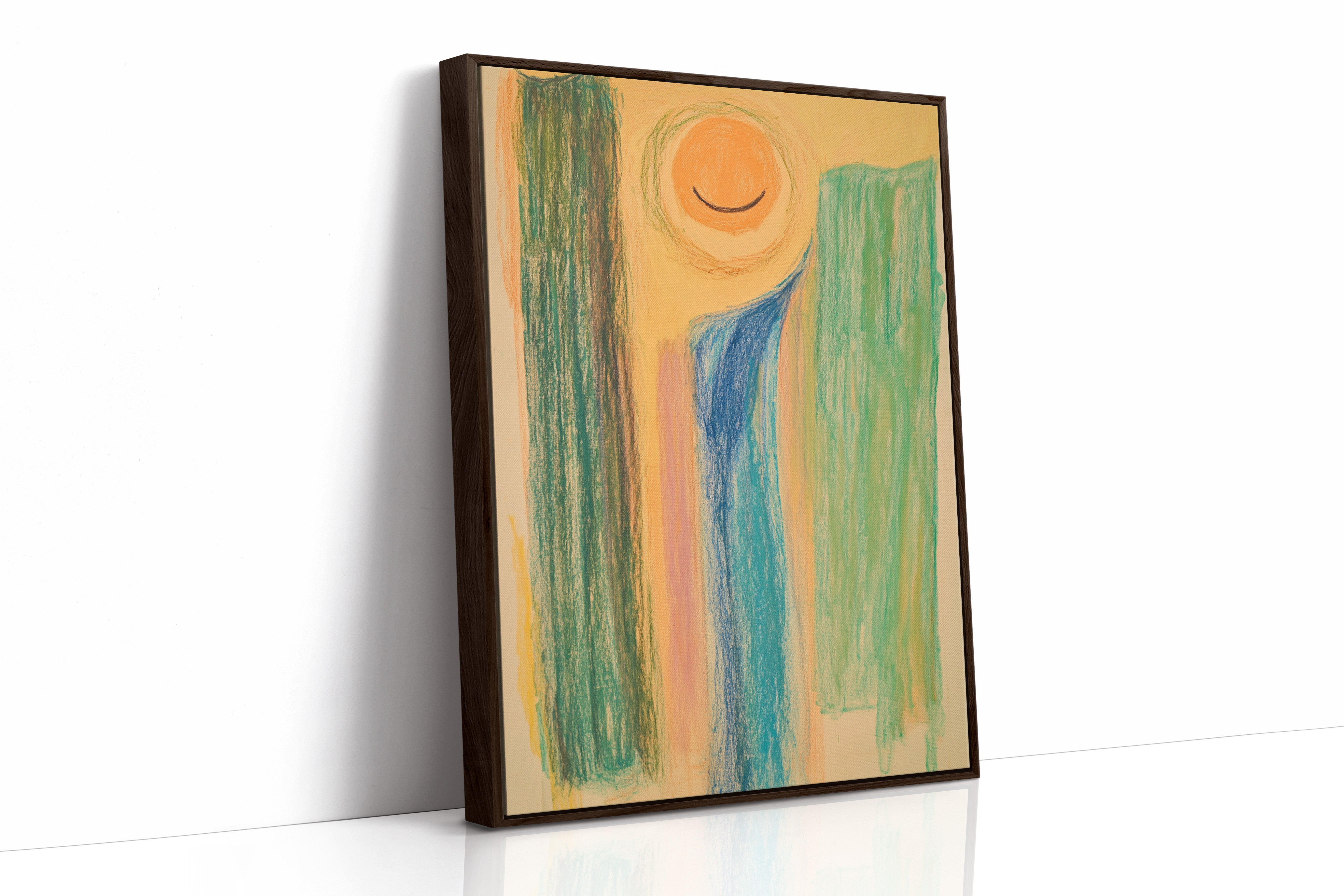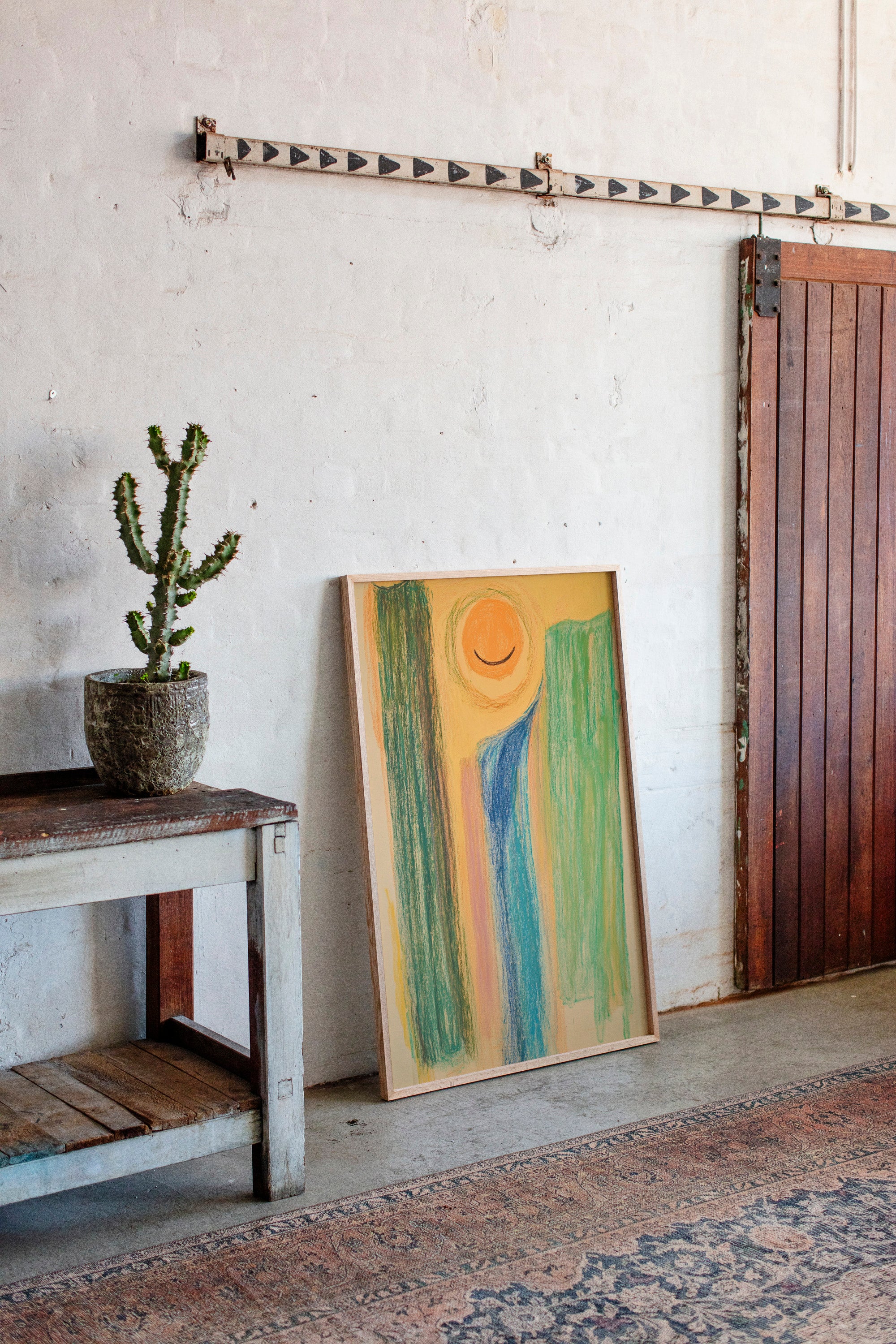 A gentle warmth radiates from a smiling sun, casting golden light across a serene landscape. Vertical strokes of deep forest green and cerulean blue create a peaceful valley, where a river of light meanders between towering cliffs. The composition speaks to the simple beauty of natural forms, with soft pastels and bold strokes creating a harmonious dance of color and movement. Perfect for meditation spaces or reading nooks where its calming energy can foster moments of quiet reflection.