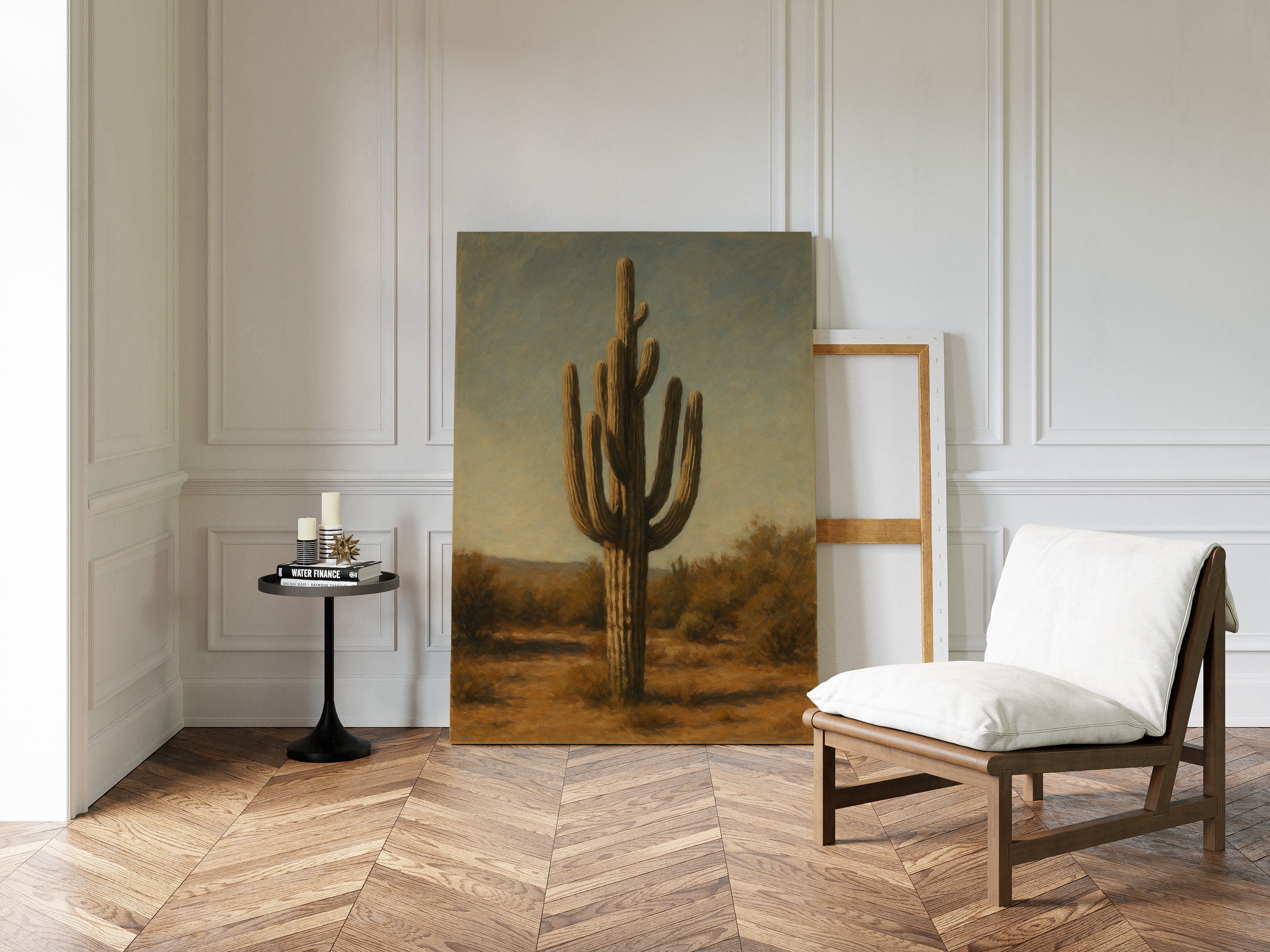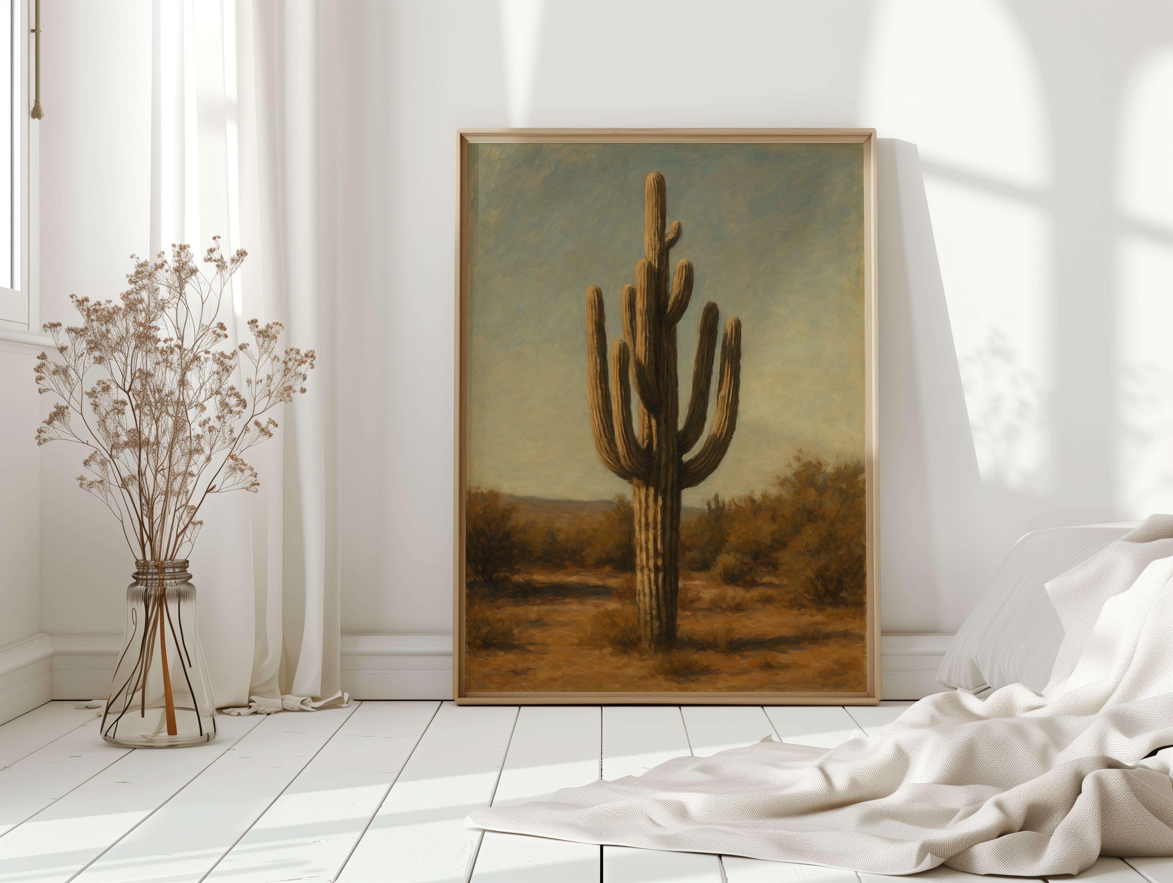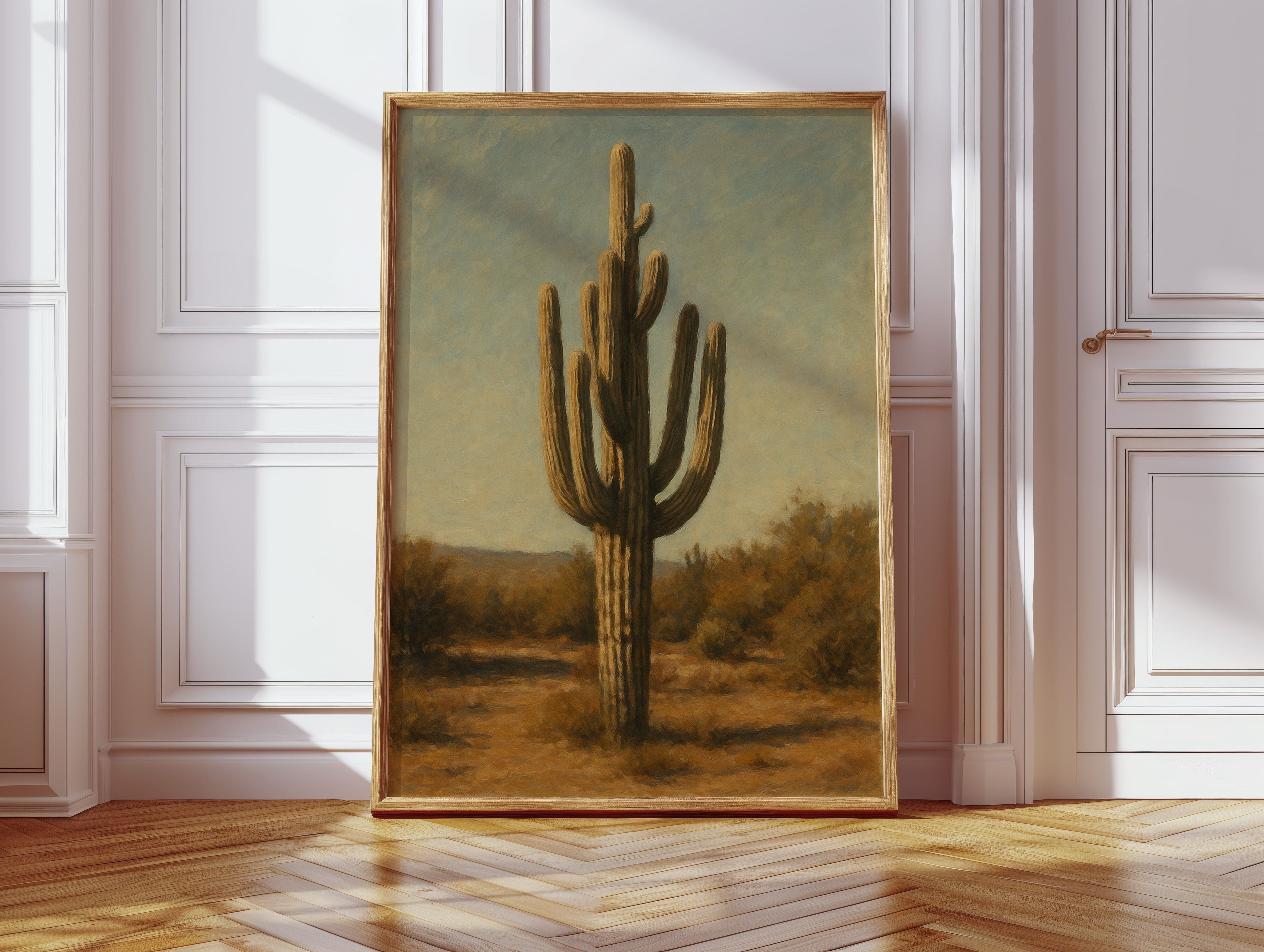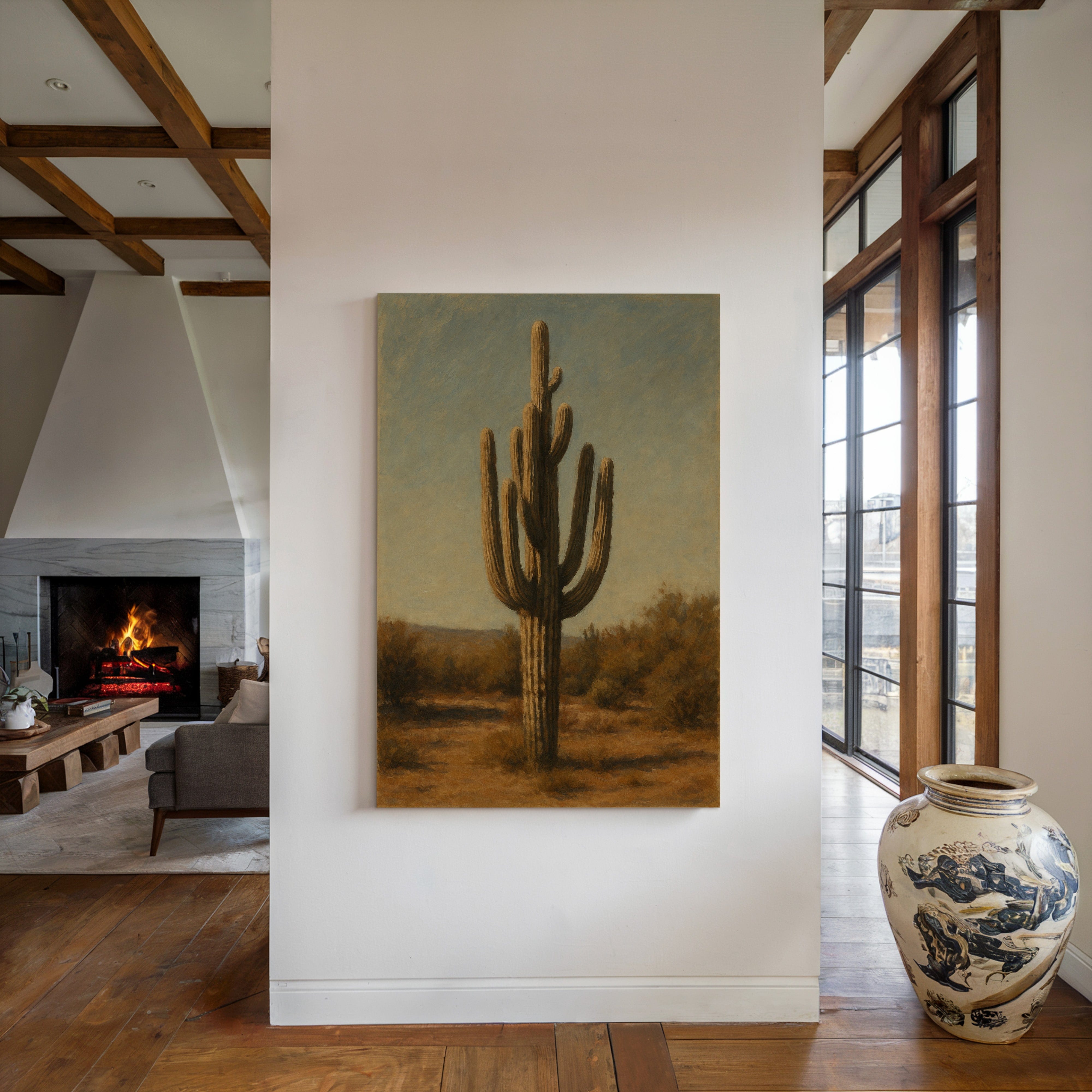 Bathed in golden desert light, this stunning painting captures the majesty of a solitary saguaro cactus standing tall against a soft southwestern sky. The realism and warmth of the brushwork highlight every groove and arm of the cactus, evoking the timeless beauty of the Sonoran landscape. Ideal for rustic, Western, or nature-inspired spaces, this piece brings peace and presence into your home.