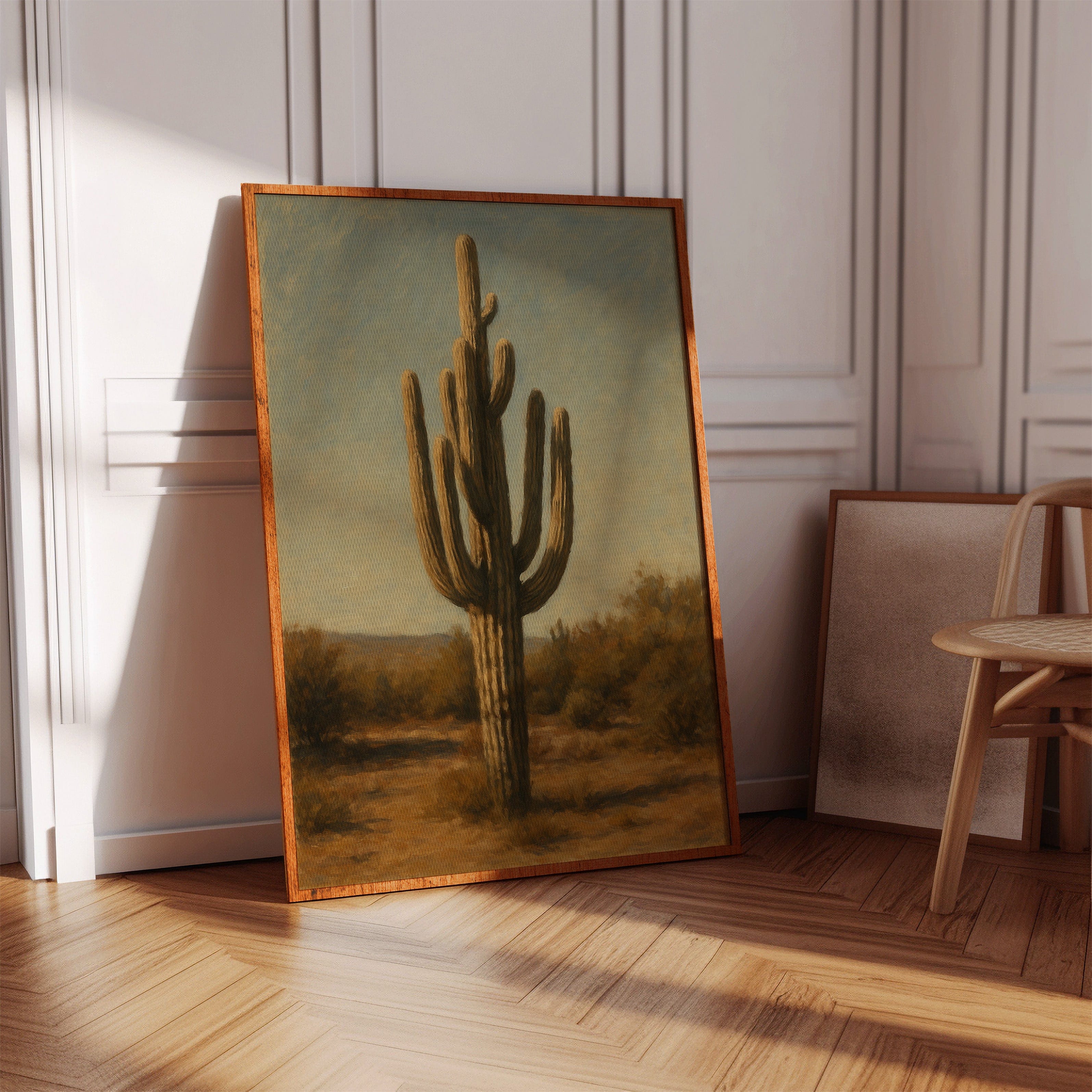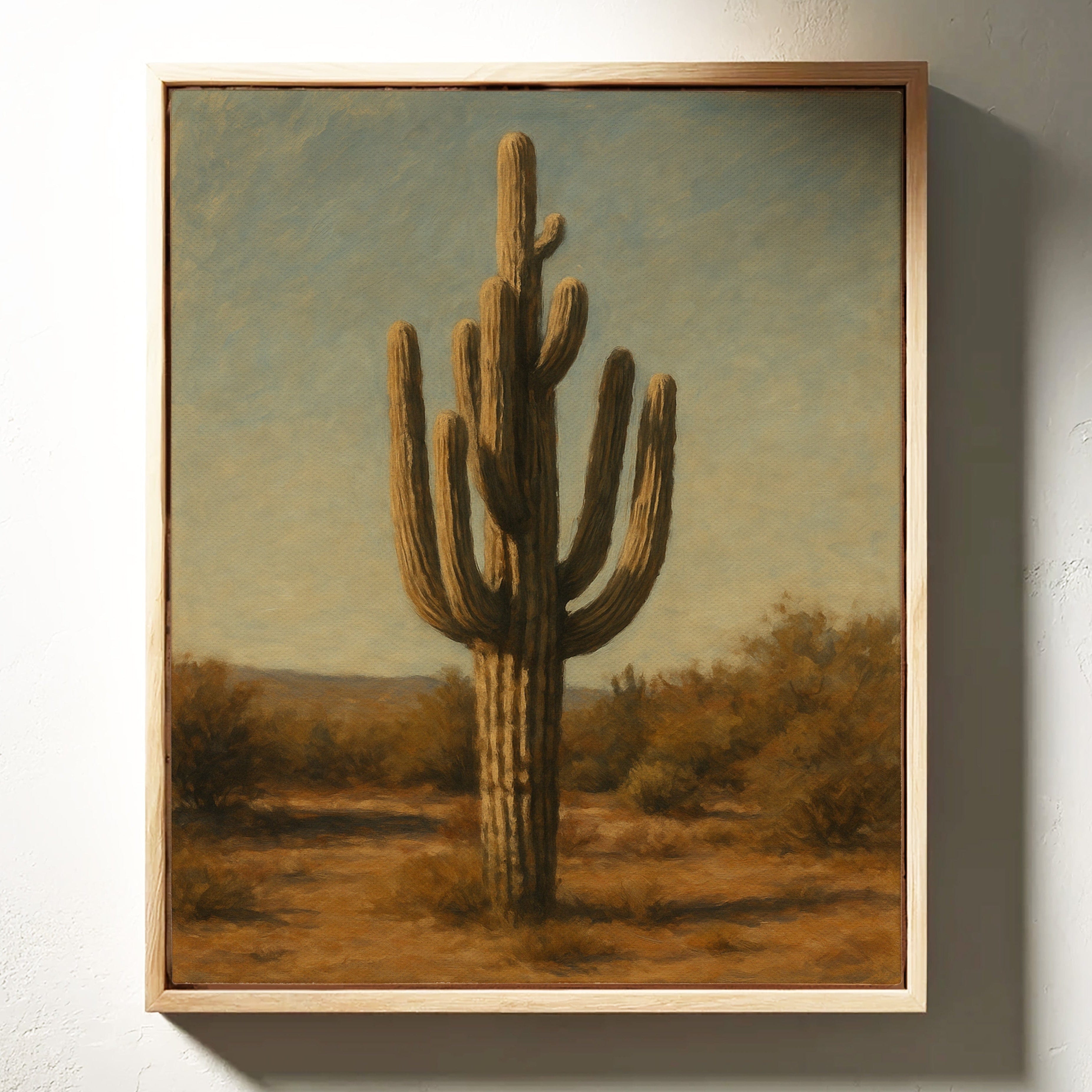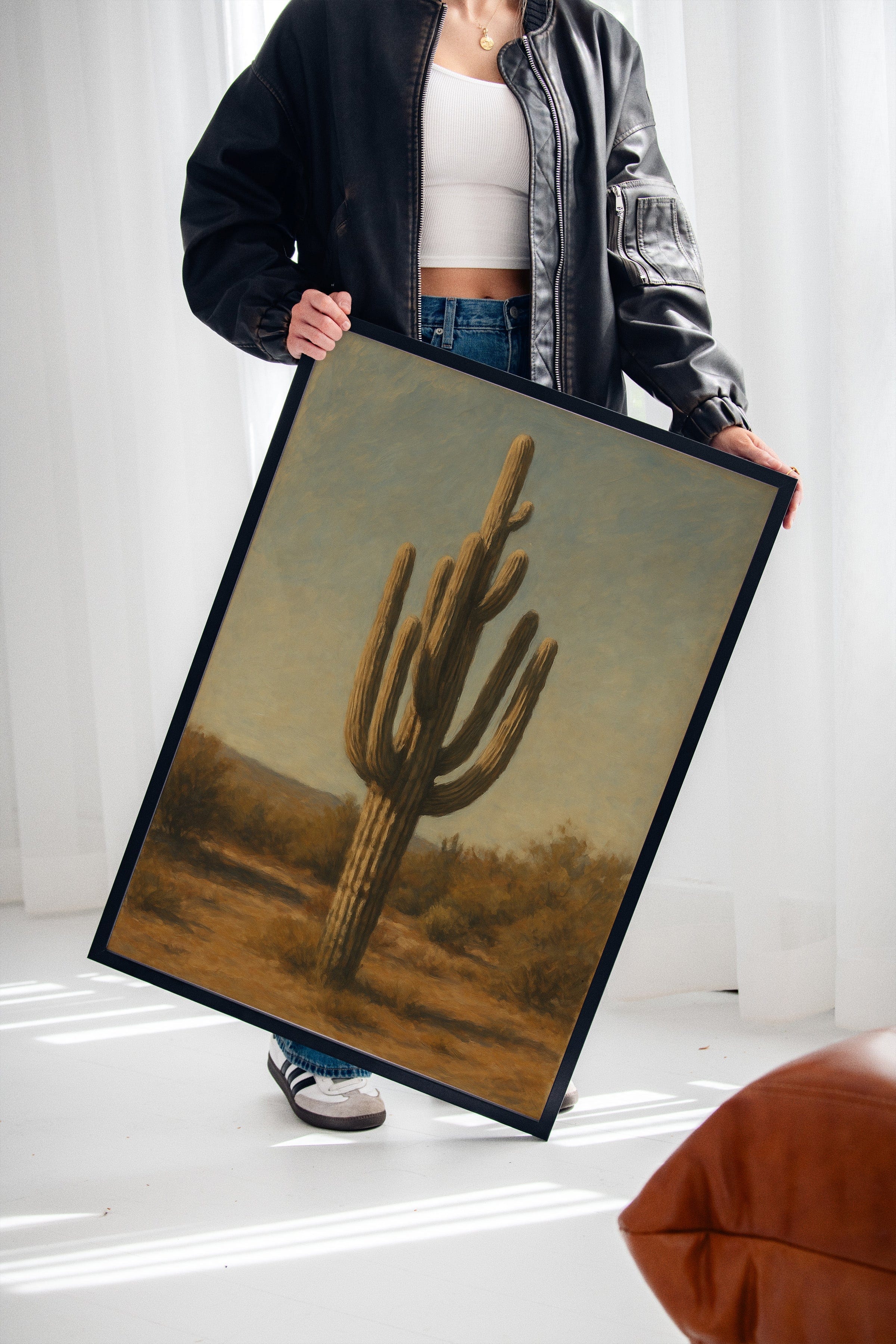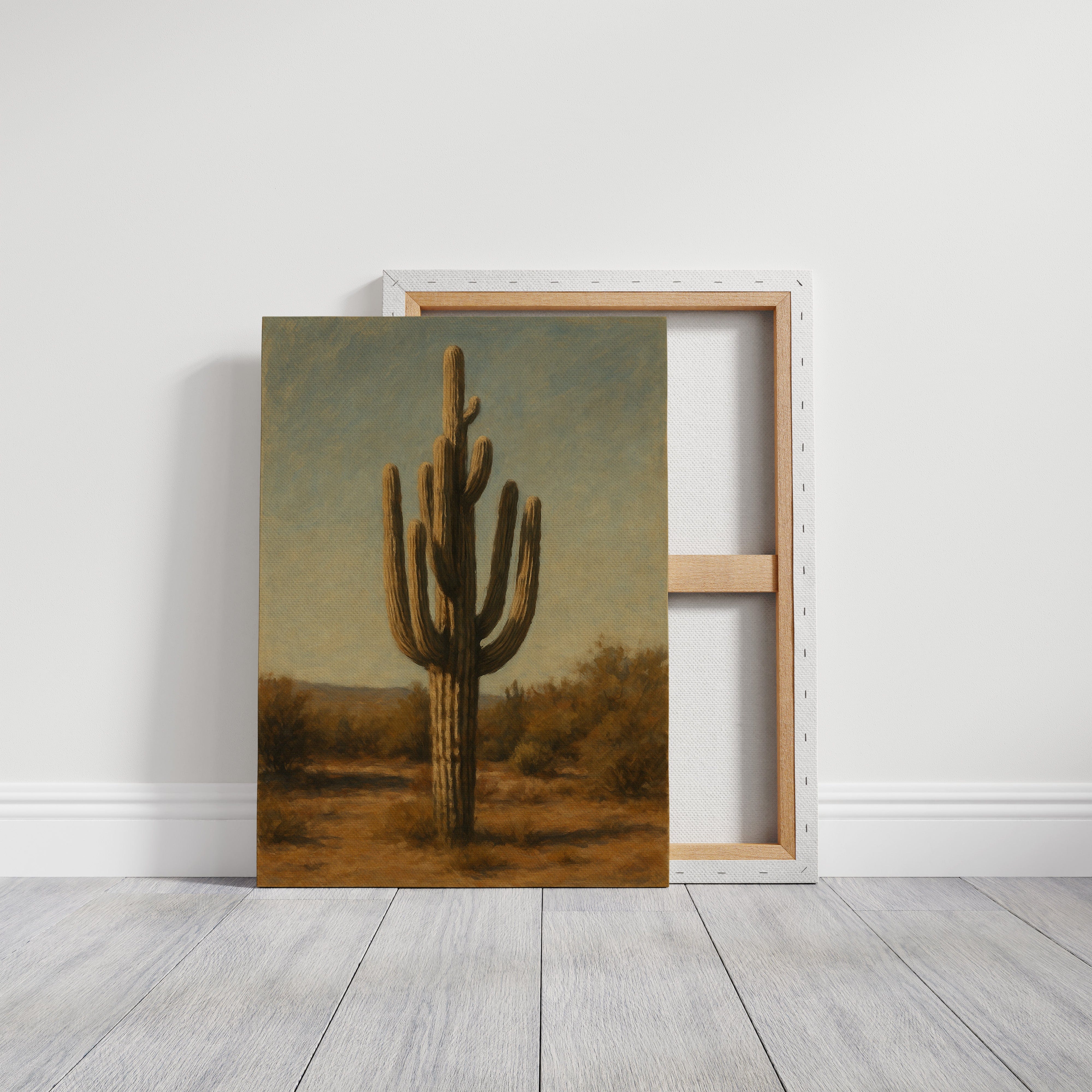 Bathed in golden desert light, this stunning painting captures the majesty of a solitary saguaro cactus standing tall against a soft southwestern sky. The realism and warmth of the brushwork highlight every groove and arm of the cactus, evoking the timeless beauty of the Sonoran landscape. Ideal for rustic, Western, or nature-inspired spaces, this piece brings peace and presence into your home.