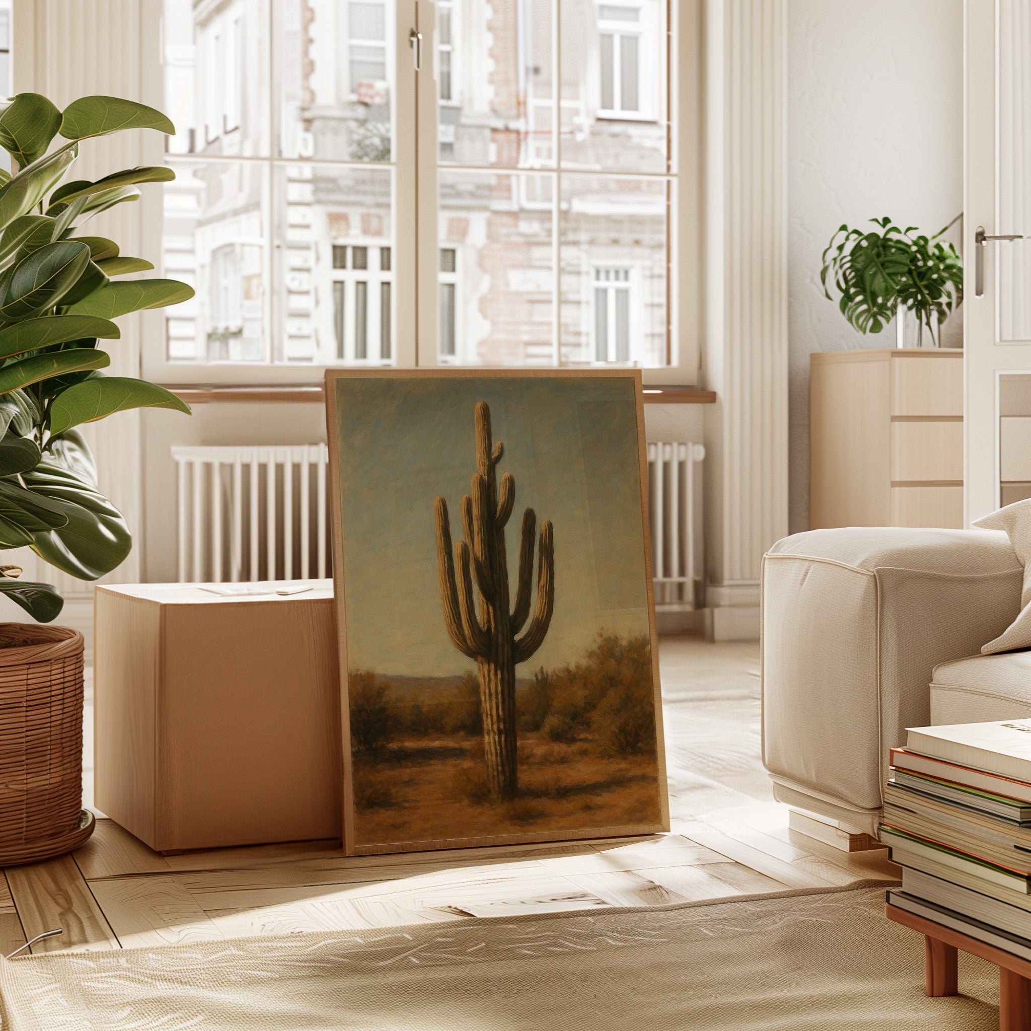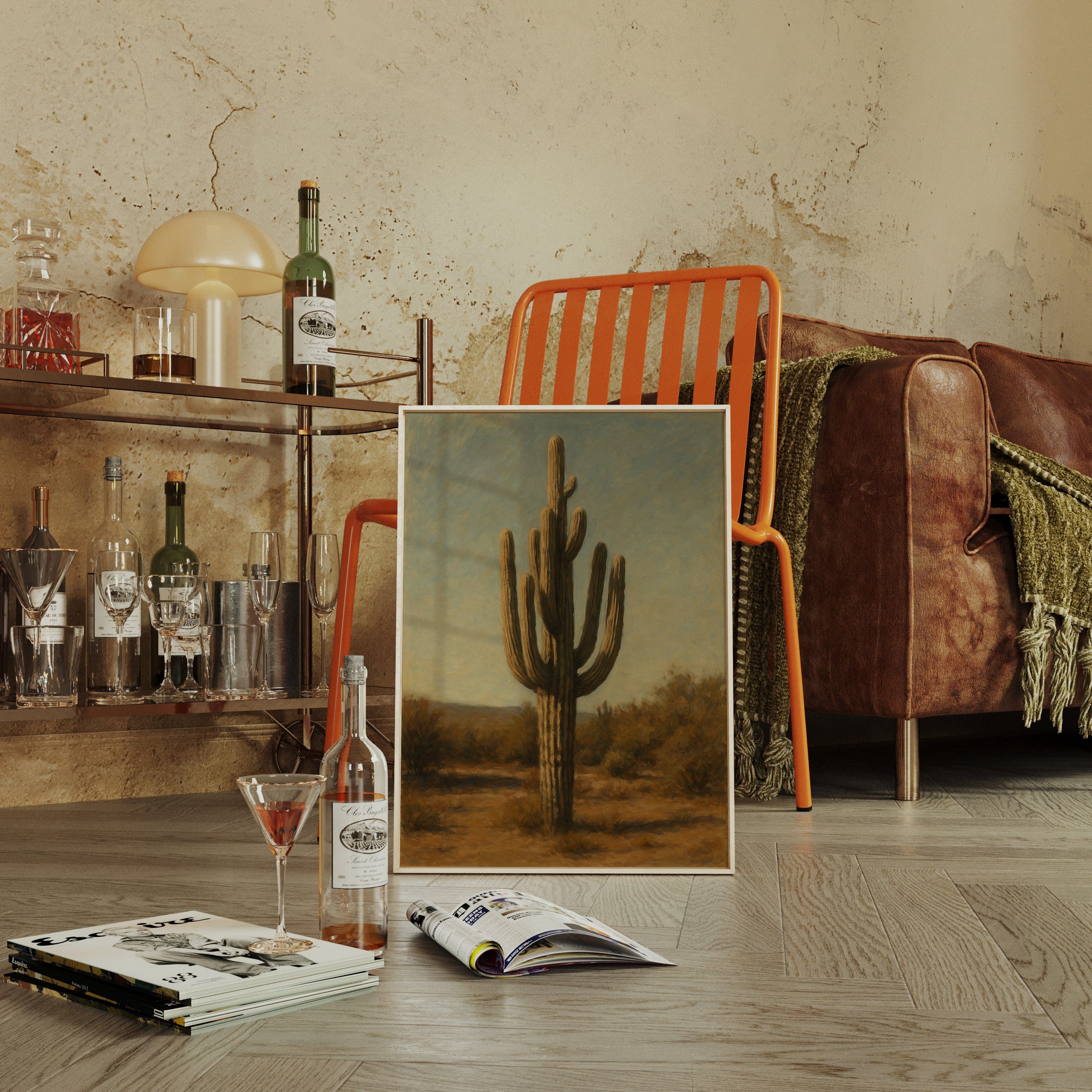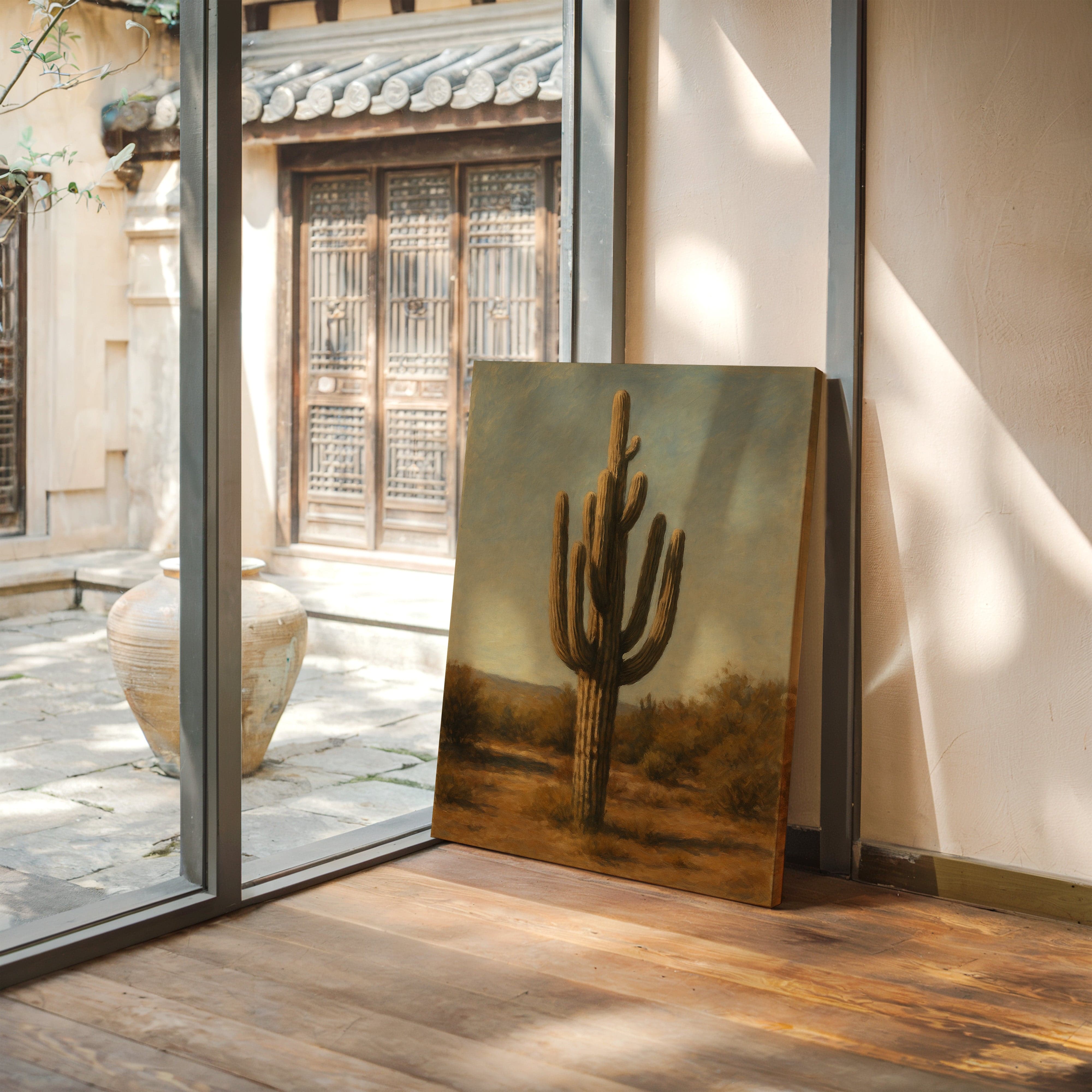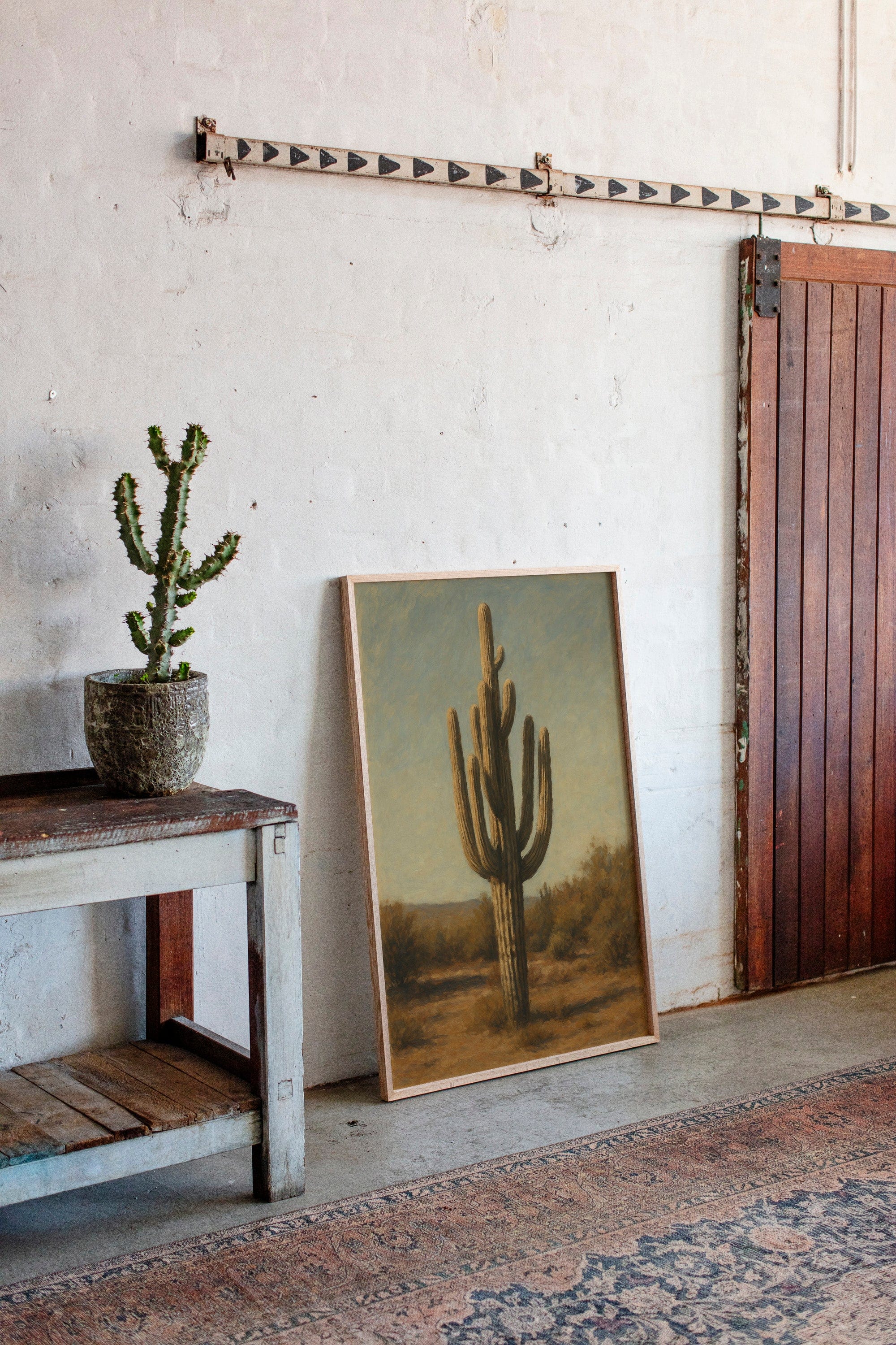Bathed in golden desert light, this stunning painting captures the majesty of a solitary saguaro cactus standing tall against a soft southwestern sky. The realism and warmth of the brushwork highlight every groove and arm of the cactus, evoking the timeless beauty of the Sonoran landscape. Ideal for rustic, Western, or nature-inspired spaces, this piece brings peace and presence into your home.