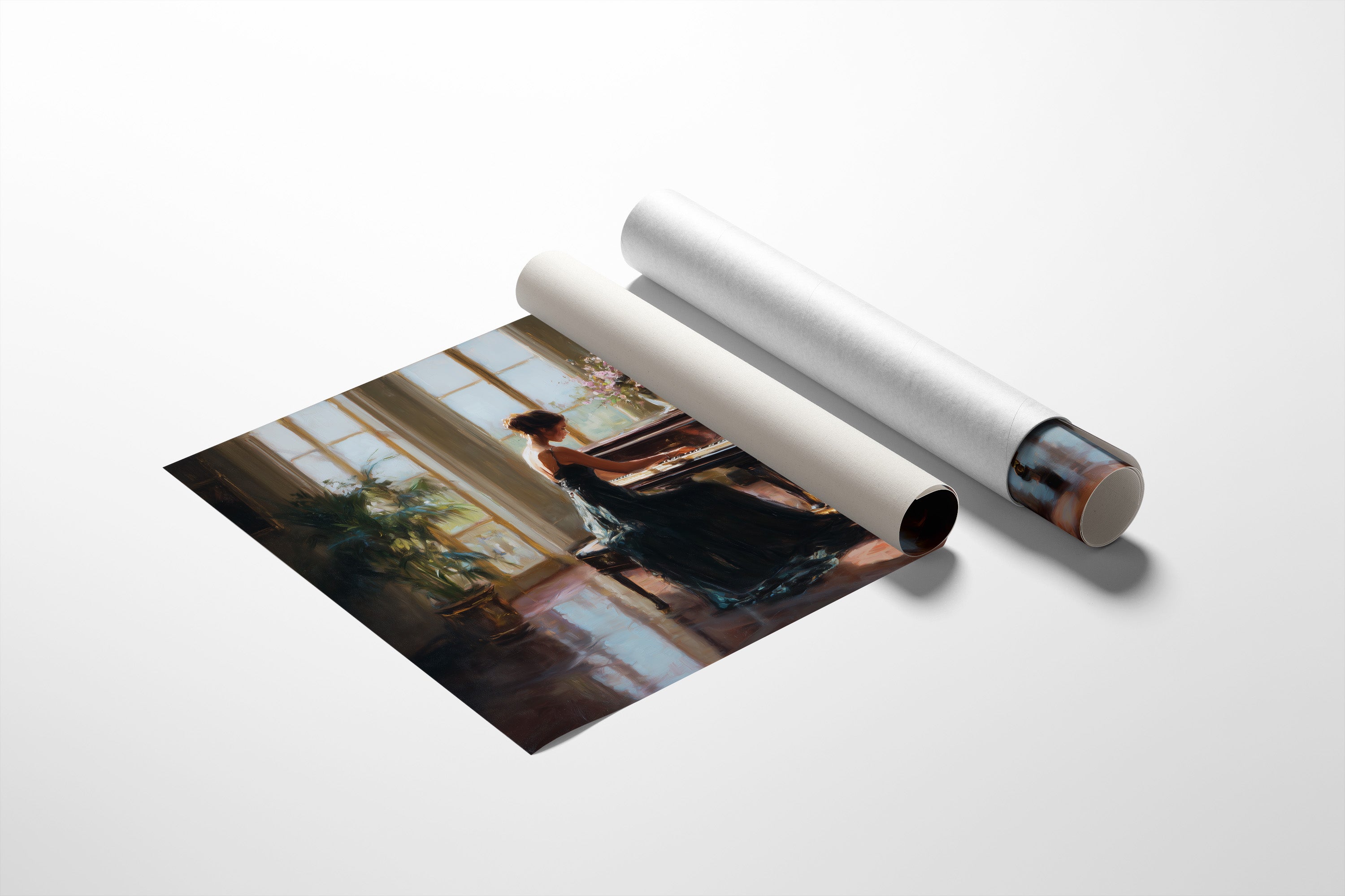 The elegant painting rests against a backdrop of literary treasures, capturing a moment where music and sunlight intertwine. A pianist in a flowing gown sits before a grand piano, bathed in golden light streaming through tall windows while potted plants and lilac blooms frame her silhouette. The rich wood tones of the bookshelves contrast with the luminous scene within the ornate frame, creating a sanctuary where art forms converse across mediums.
