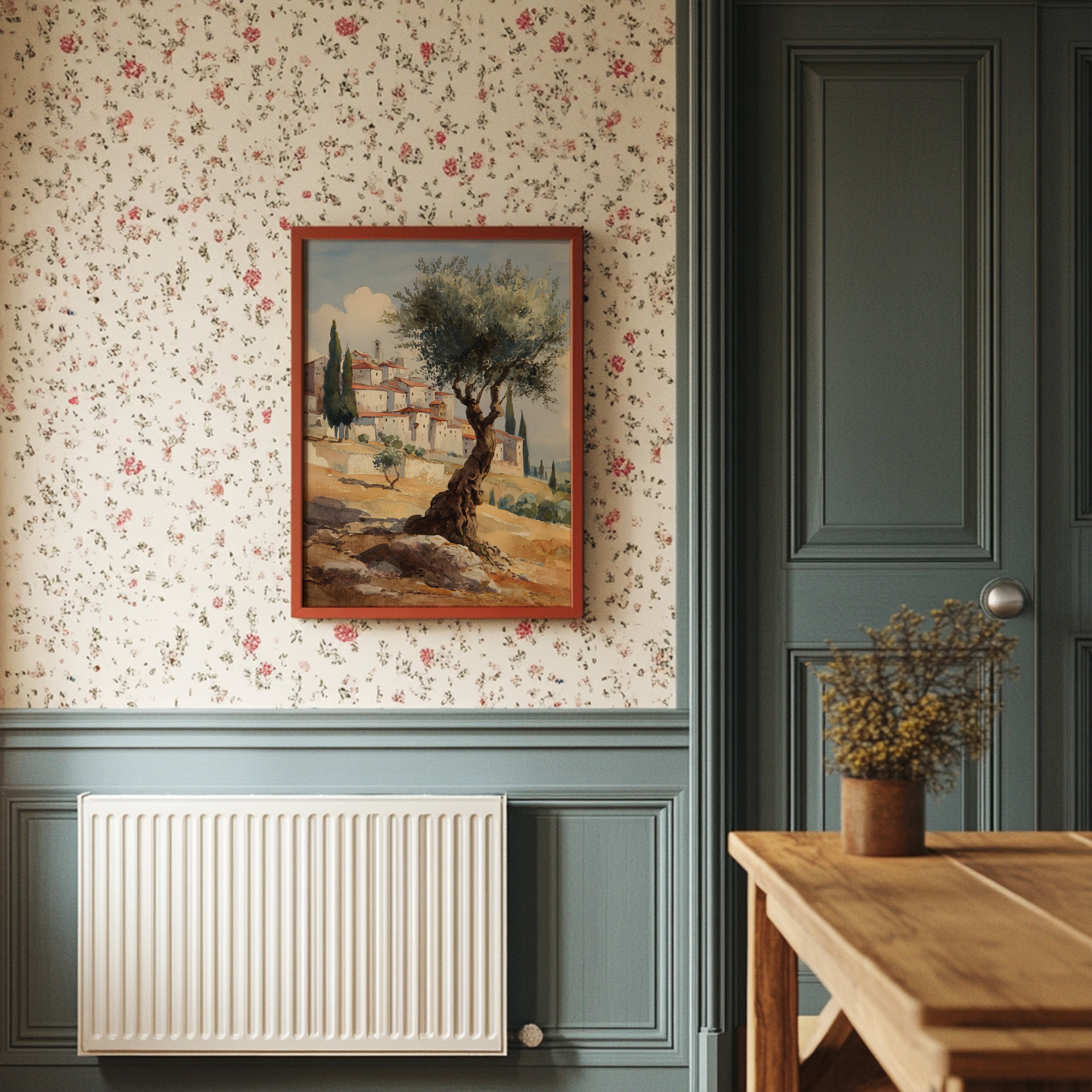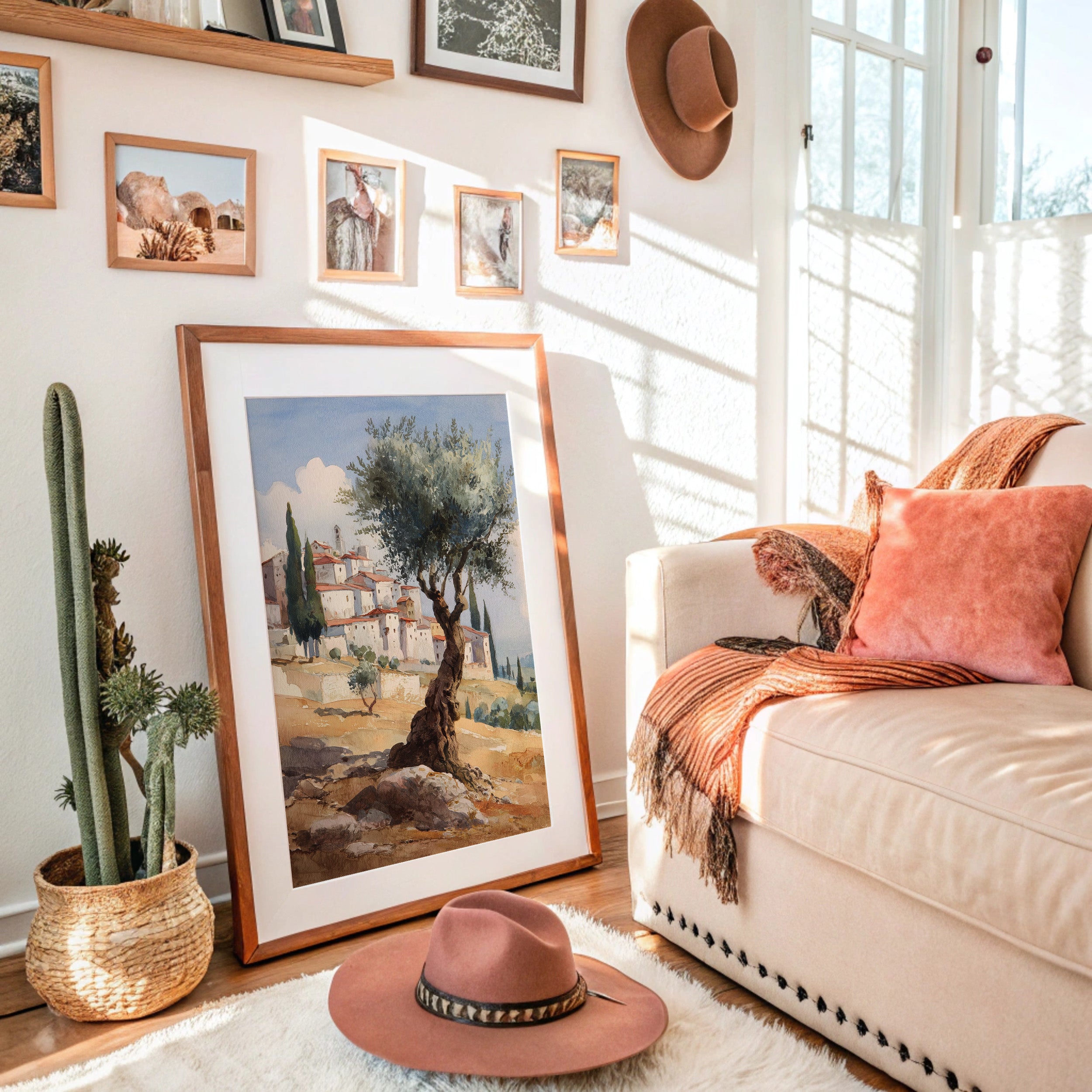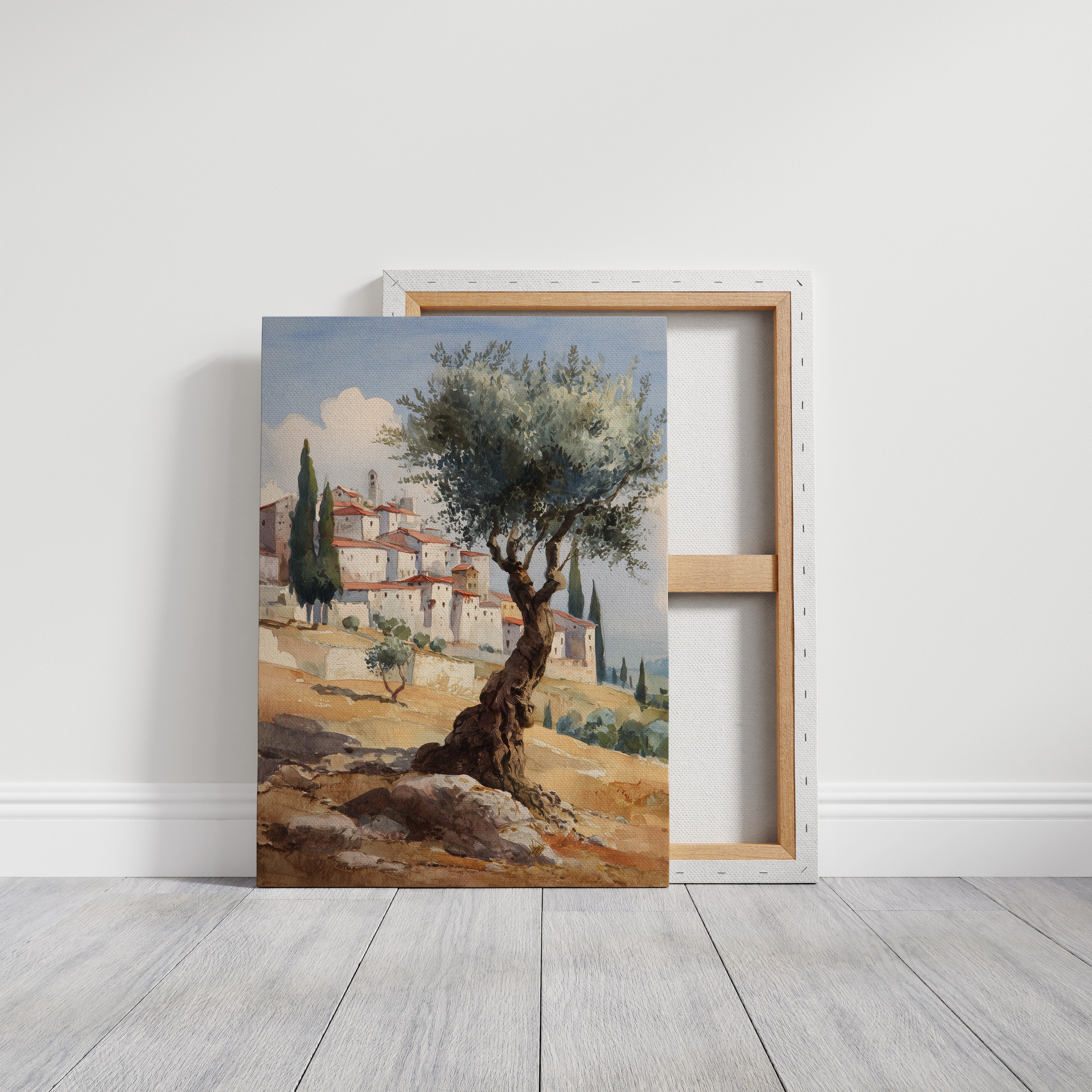 A rustic Mediterranean scene captures an ancient olive tree twisting skyward against whitewashed village walls. Warm terracotta roofs cascade down the hillside, while slender cypress trees stand sentinel against a gentle blue sky. The watercolor's delicate strokes blend earthen browns with sun-bleached whites, creating a timeless portrait of pastoral Italian life. Perfect for bringing old-world charm and wanderlust to a dining room or study, where its peaceful Mediterranean energy can transport viewers to distant shores.
