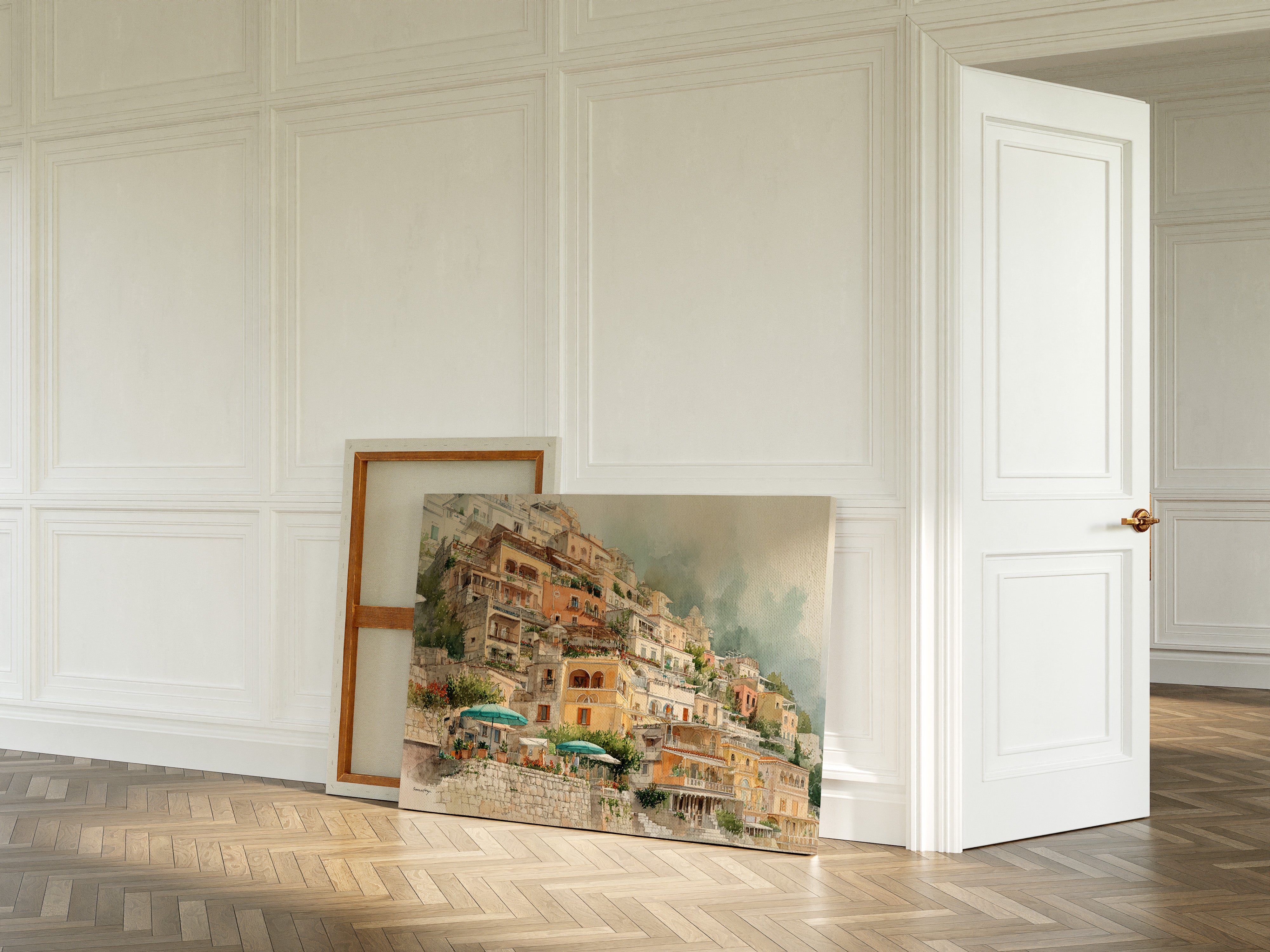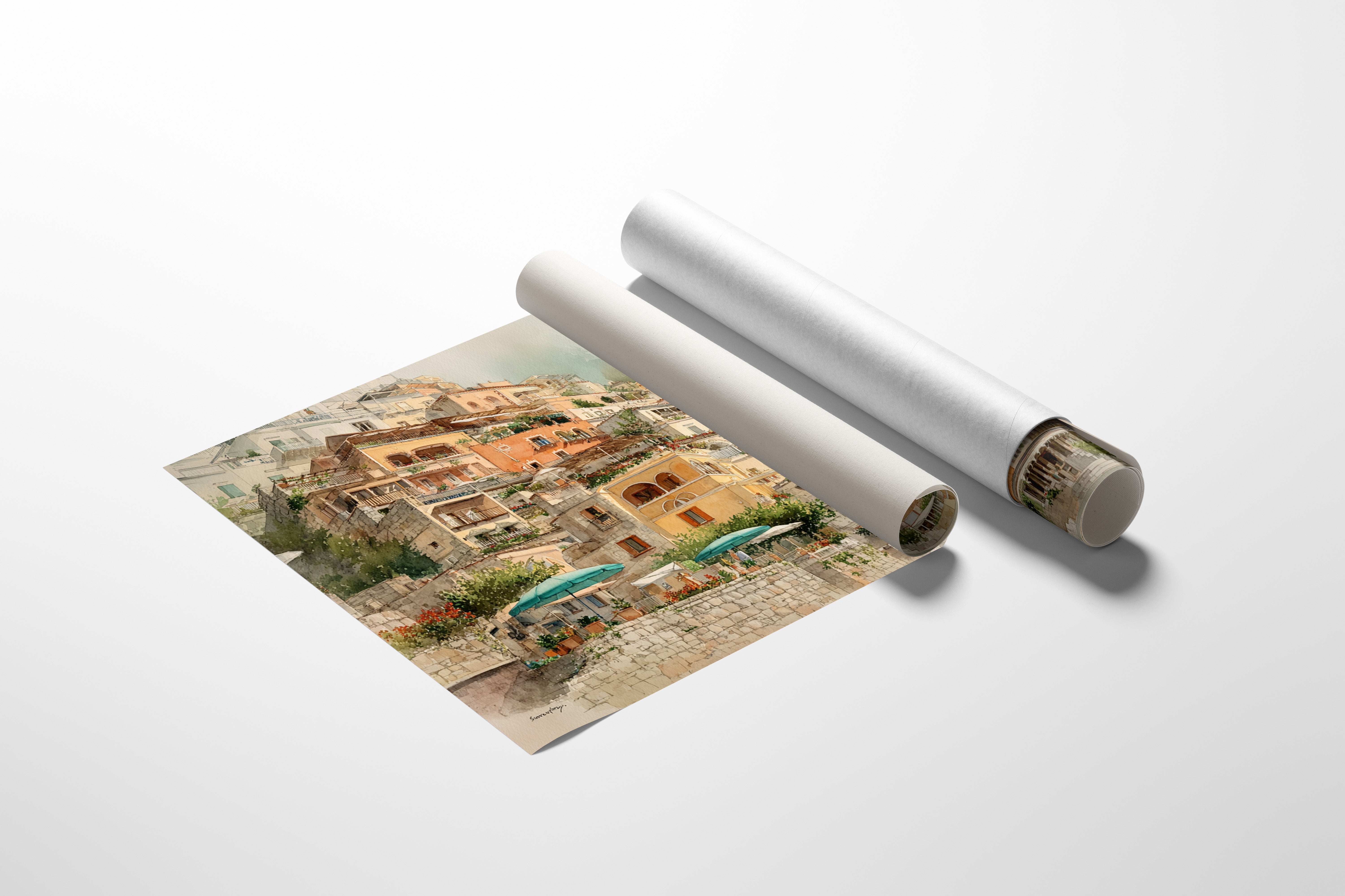 Warm Mediterranean light bathes cascading villas in shades of coral and cream, while turquoise umbrellas dot intimate terraces like jewels against stone. The architectural poetry of Positano unfolds in layers, each balcony and archway telling stories of sun-drenched afternoons and lazy aperitivo hours. Delicate watercolor strokes capture the interplay of light and shadow across weathered walls, where climbing vines and splashes of red geraniums add nature's own artistic touch. This piece brings the timeless charm of coastal Italian living into your space, perfect for a dining room or sitting area where it can inspire dreams of Mediterranean escapes.