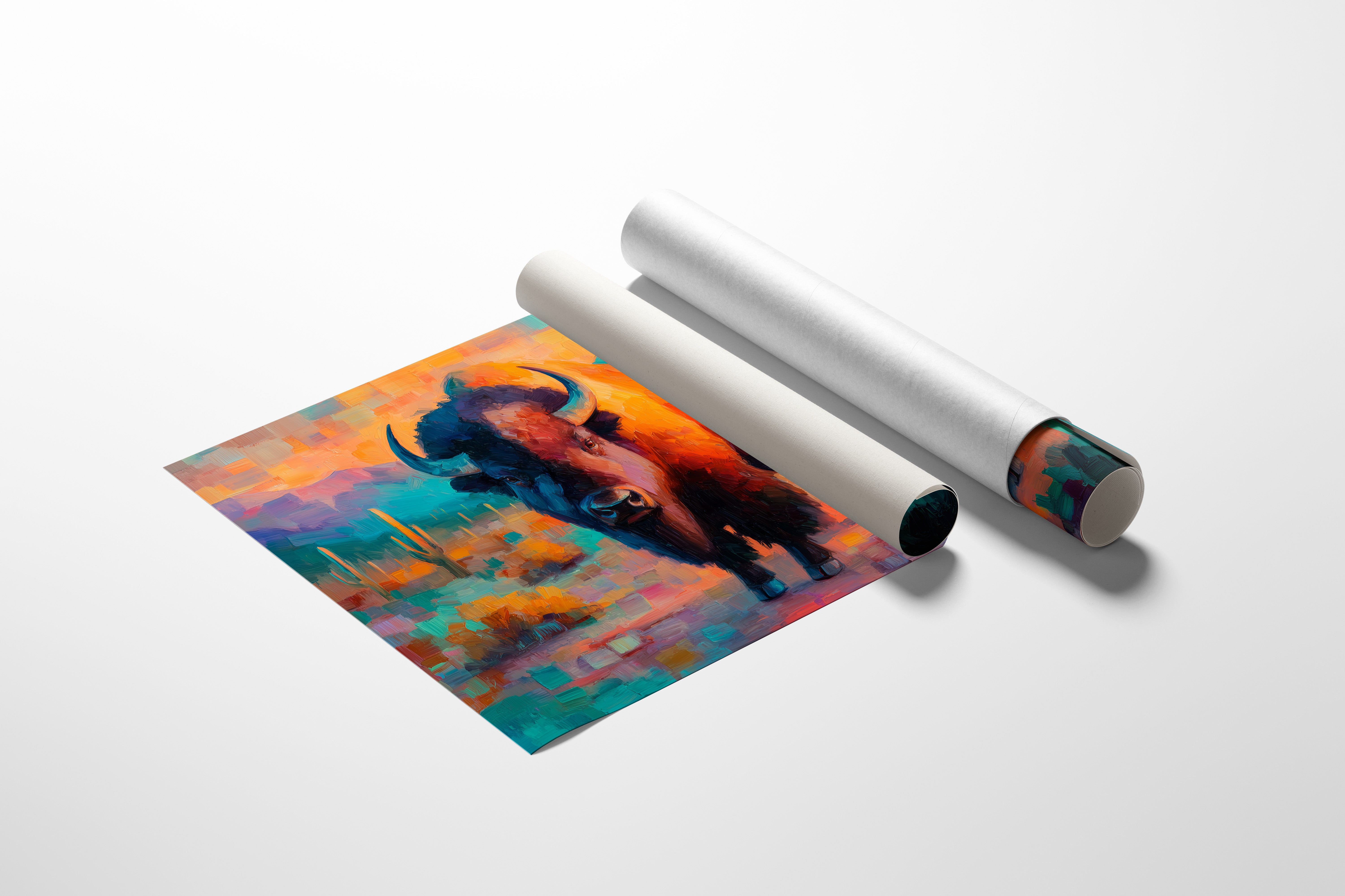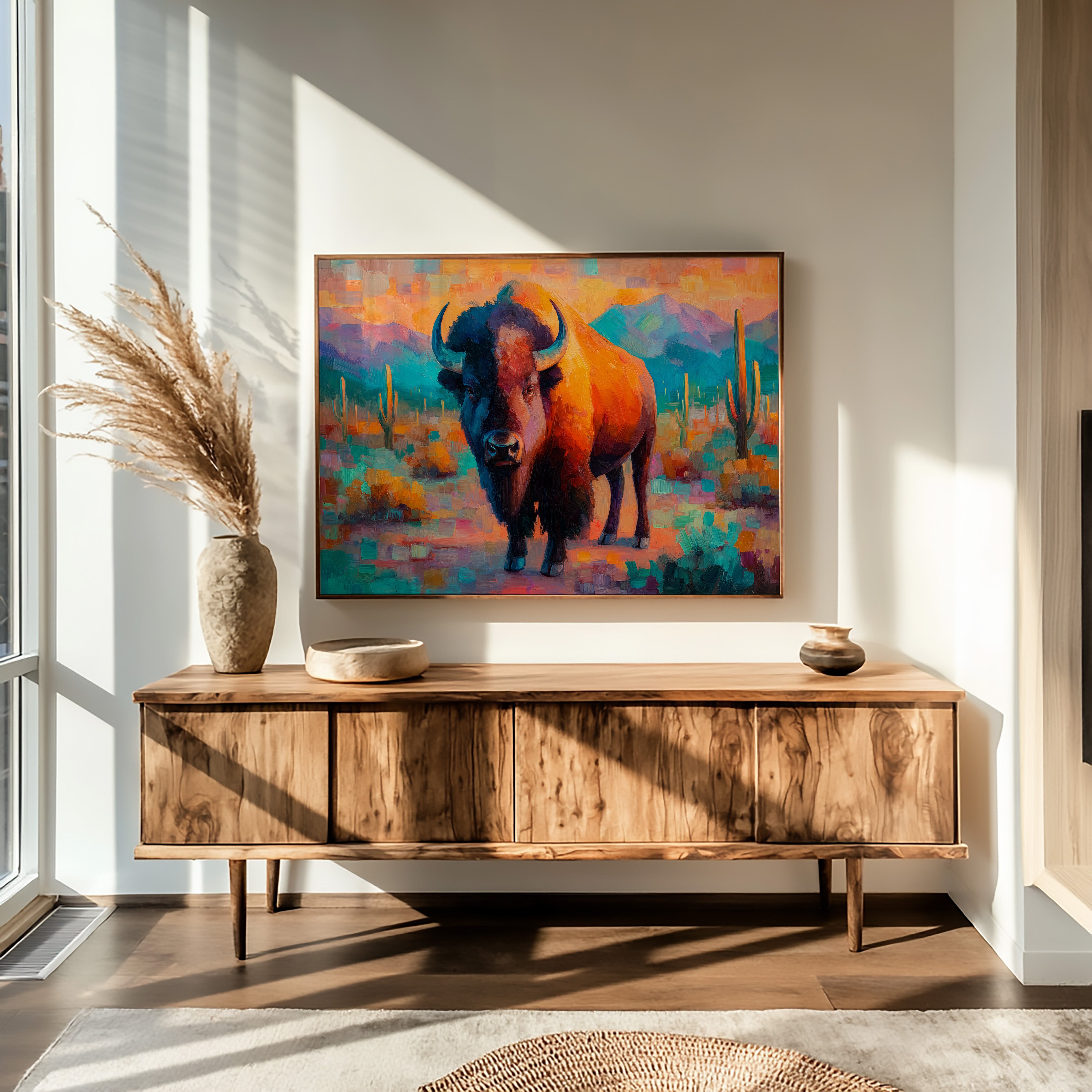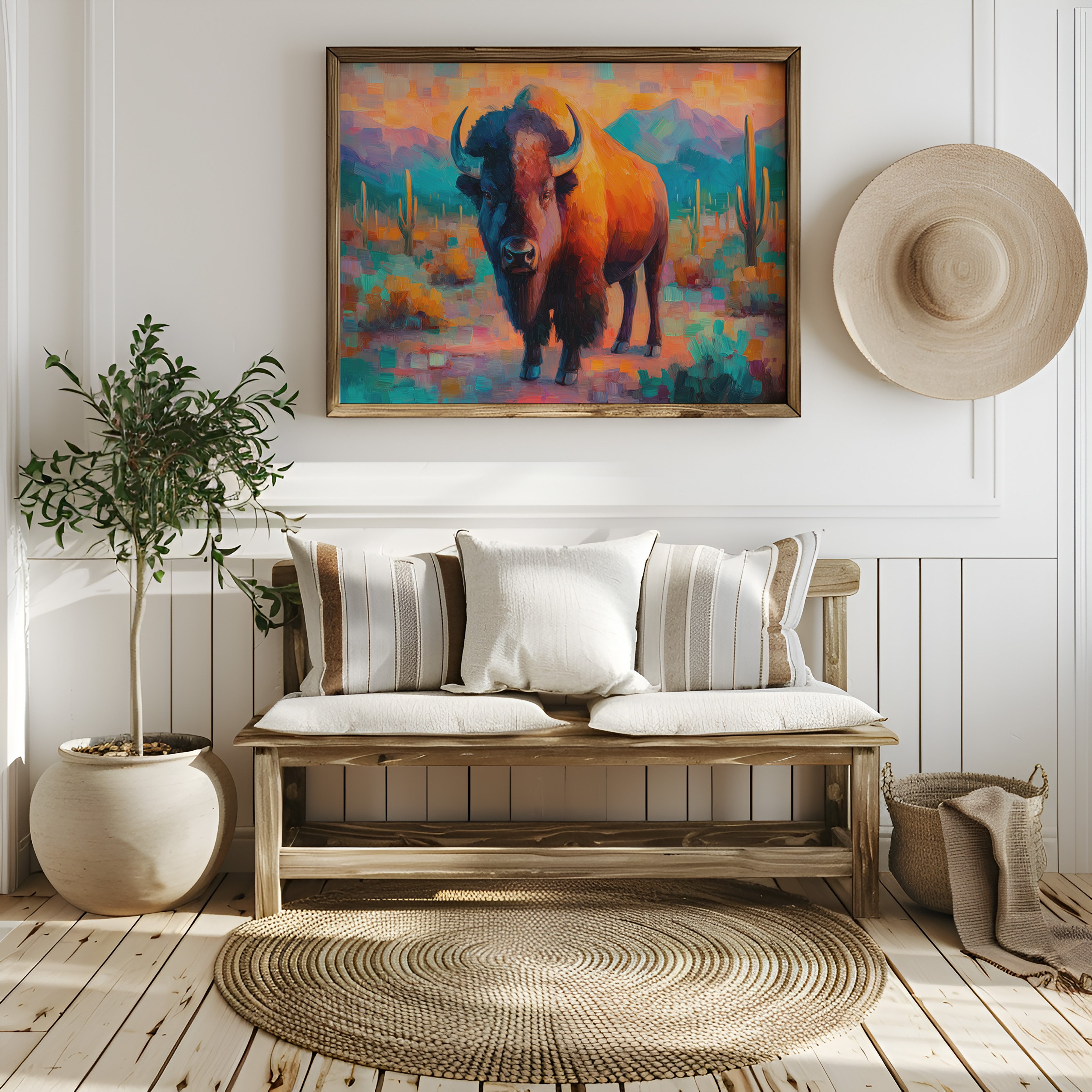 A majestic bison stands proudly against a vibrant southwestern landscape, commanding attention with its powerful presence. Rich oranges and teals dance across the canvas, creating a mesmerizing interplay of warm desert tones and cool mountain shadows. Saguaro cacti rise like ancient sentinels in the background, while impressionistic brushstrokes capture the raw energy and untamed spirit of the American West. This striking piece serves as a perfect focal point for a modern ranch house, contemporary living room, or any space seeking to capture the bold spirit of the Southwest.