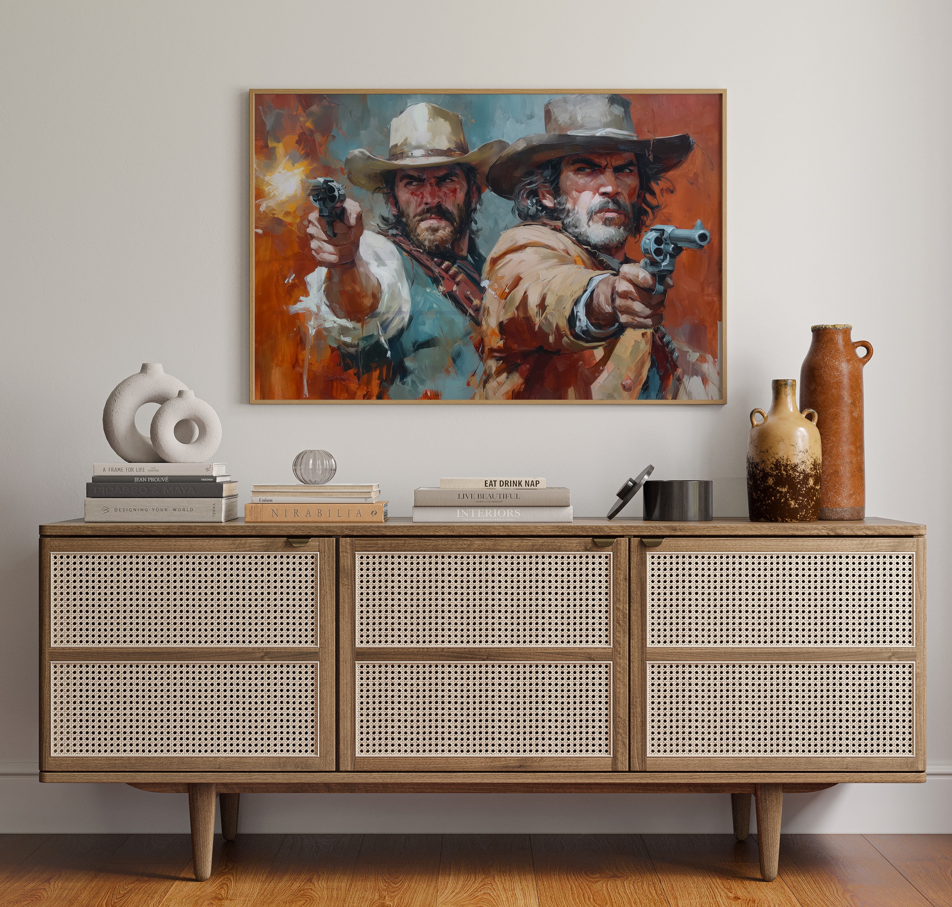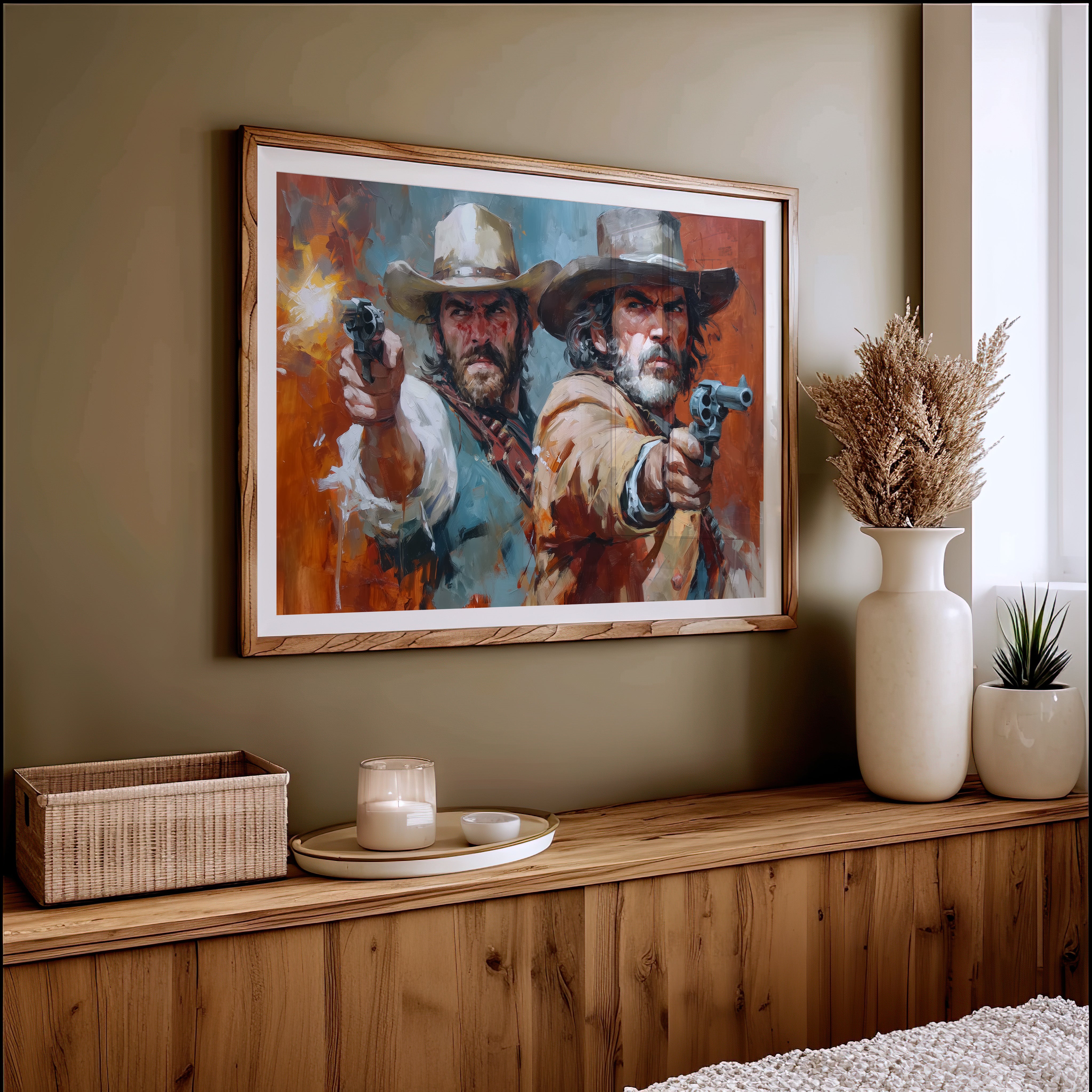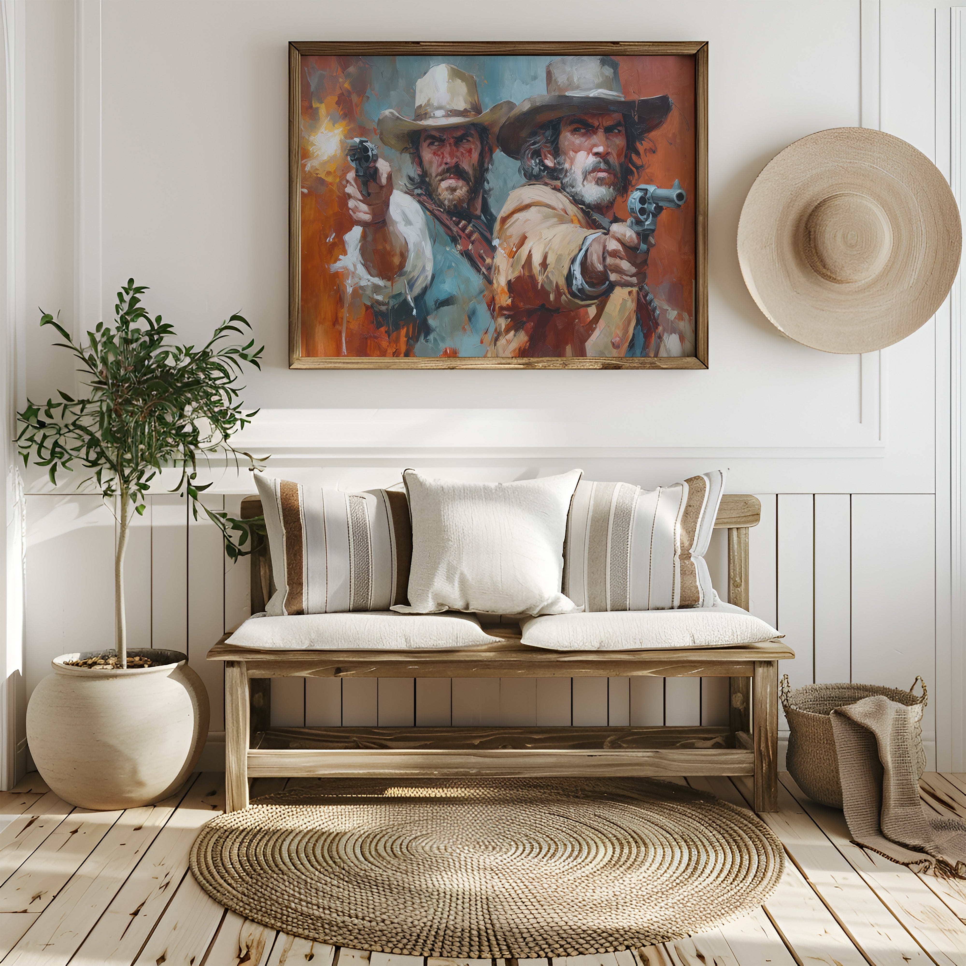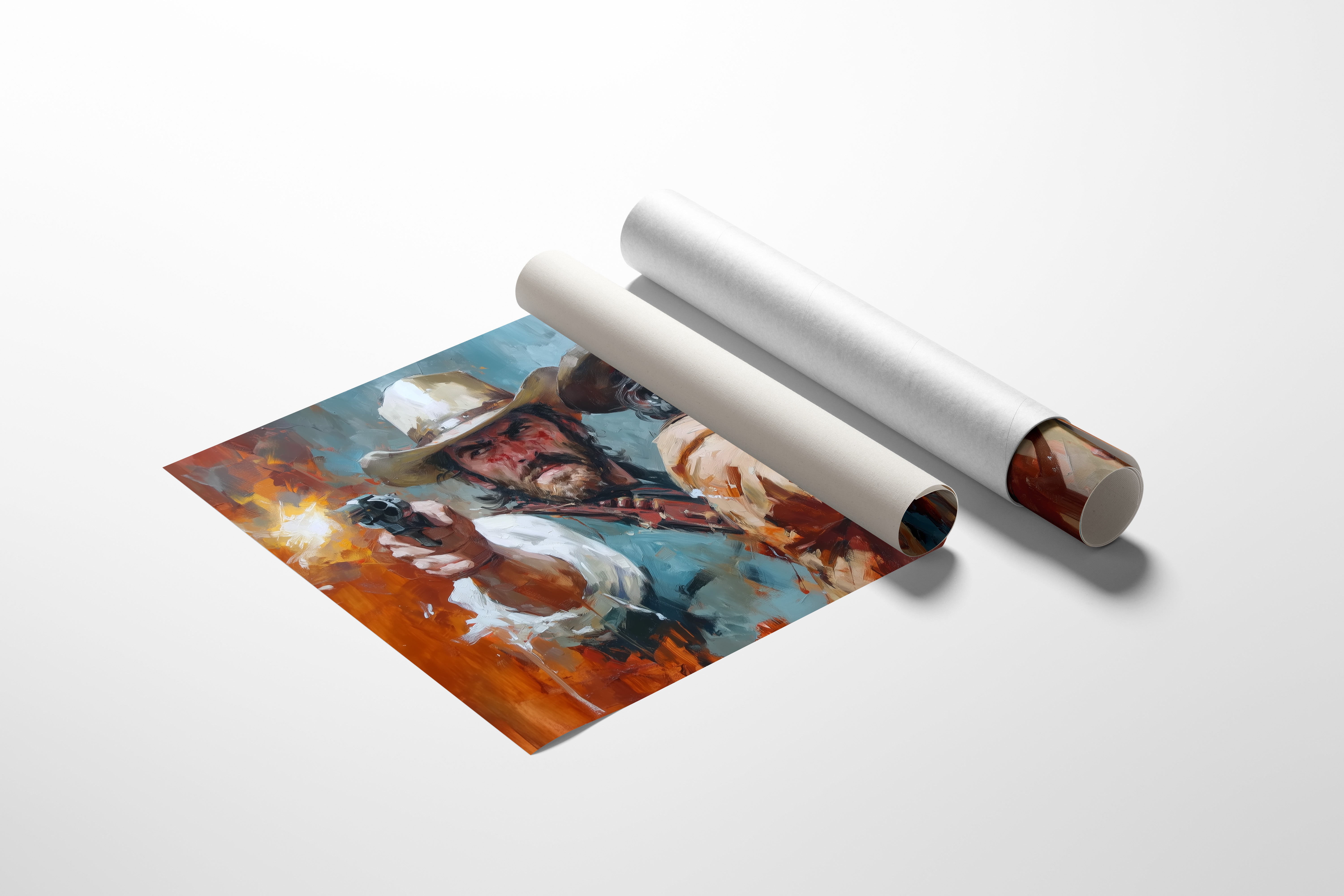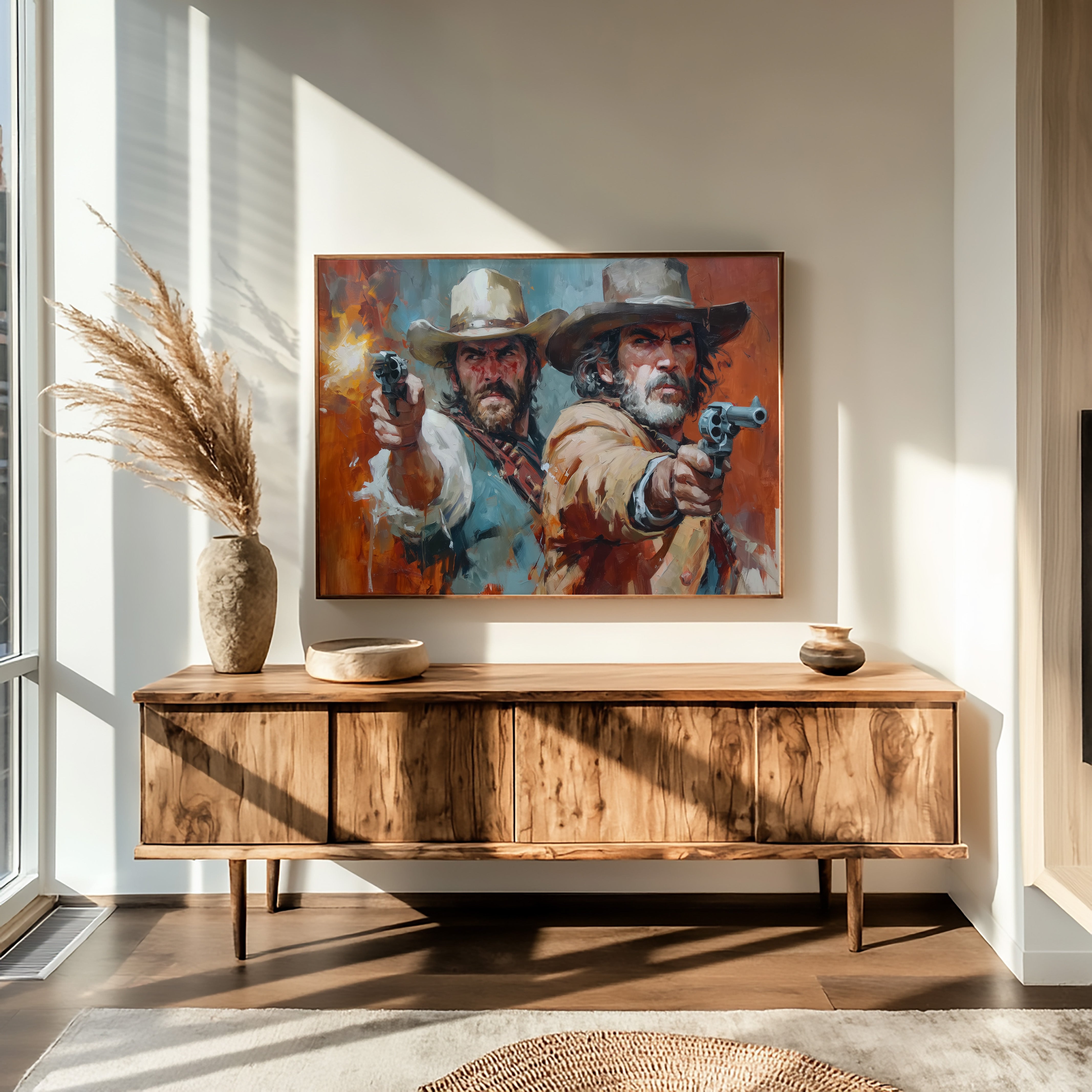 Blazing orange light cuts through turquoise skies, casting long shadows across a moment of intense confrontation. This dramatic contemporary Western piece captures the raw energy of the American frontier spirit. Bold brushstrokes dance between warm earth tones and cool azure, creating a dynamic tension that mirrors the scene's emotional intensity. The composition masterfully balances light and shadow, while expressive painterly techniques bring an almost cinematic quality to the narrative. This statement piece commands attention in a den, office, or any space seeking to evoke the bold spirit of the American West.