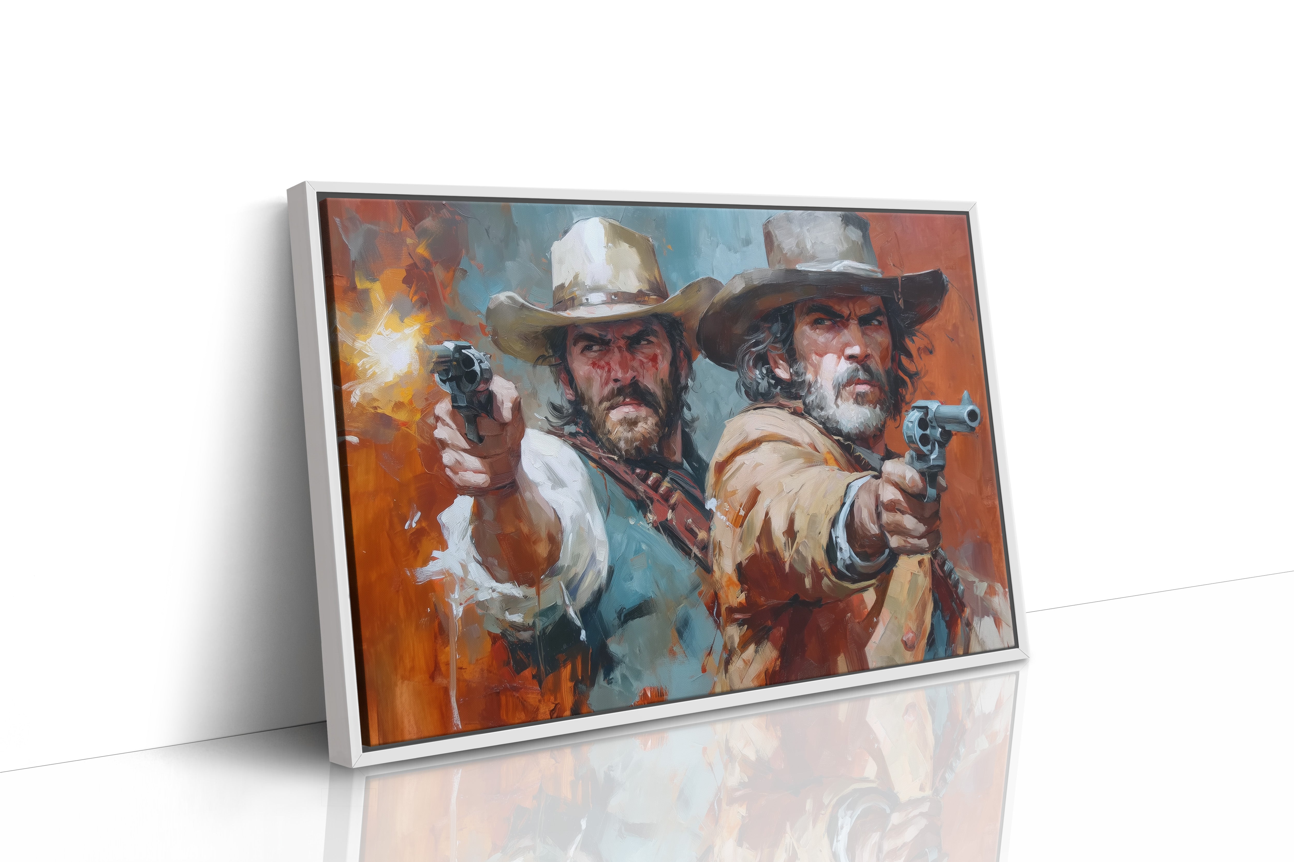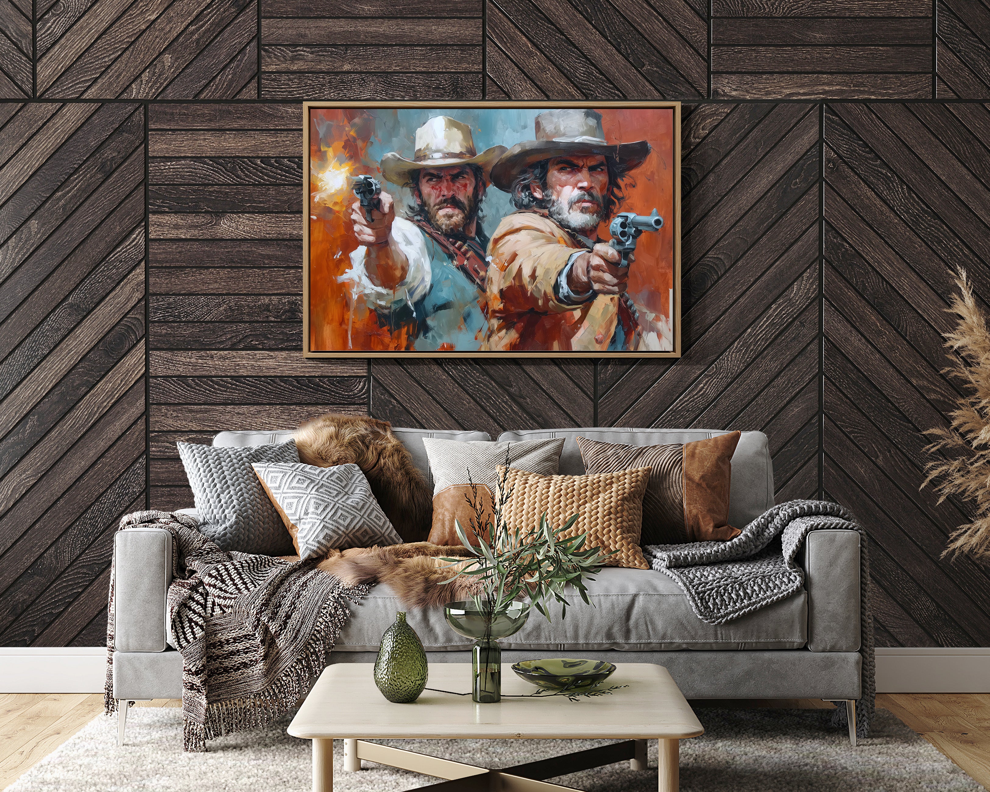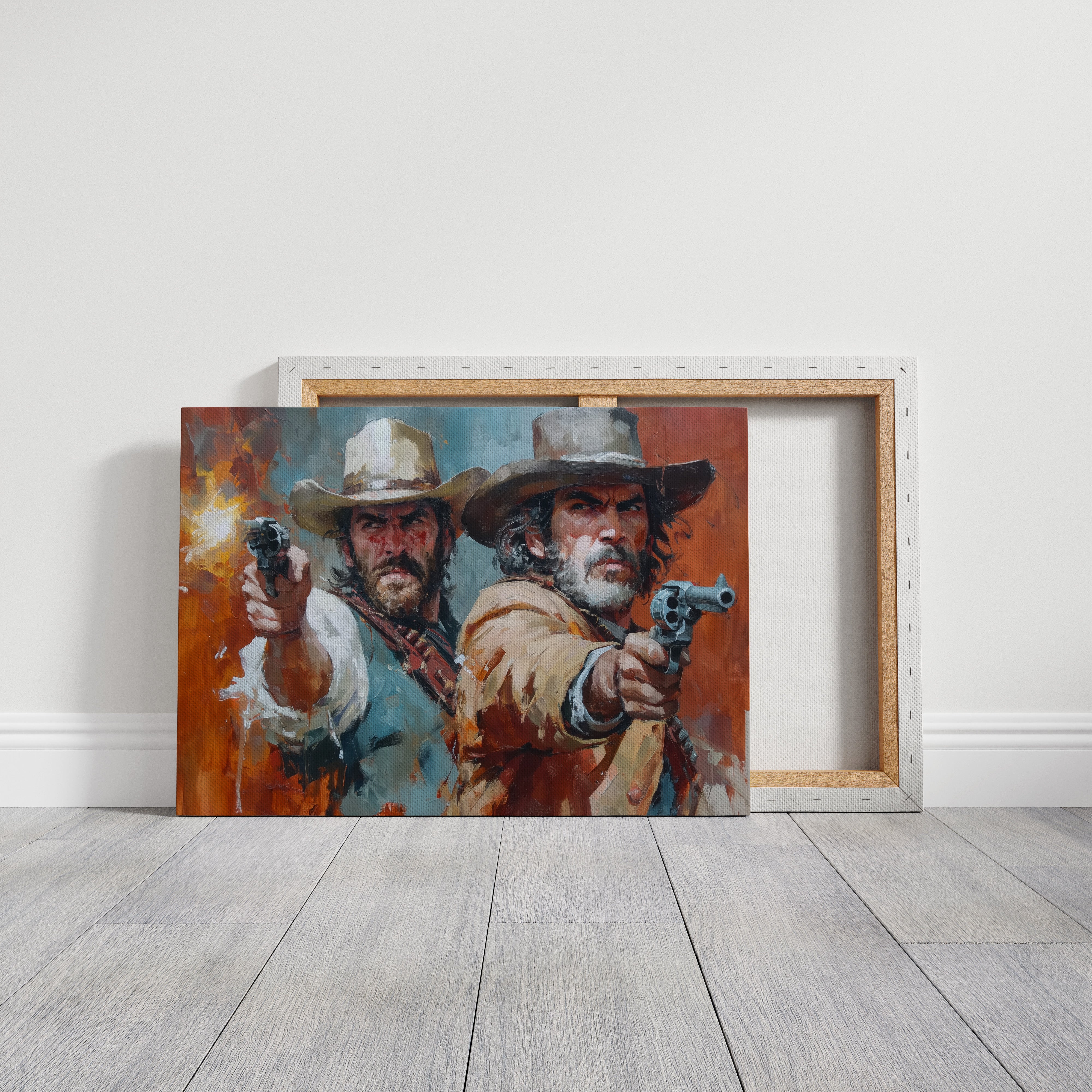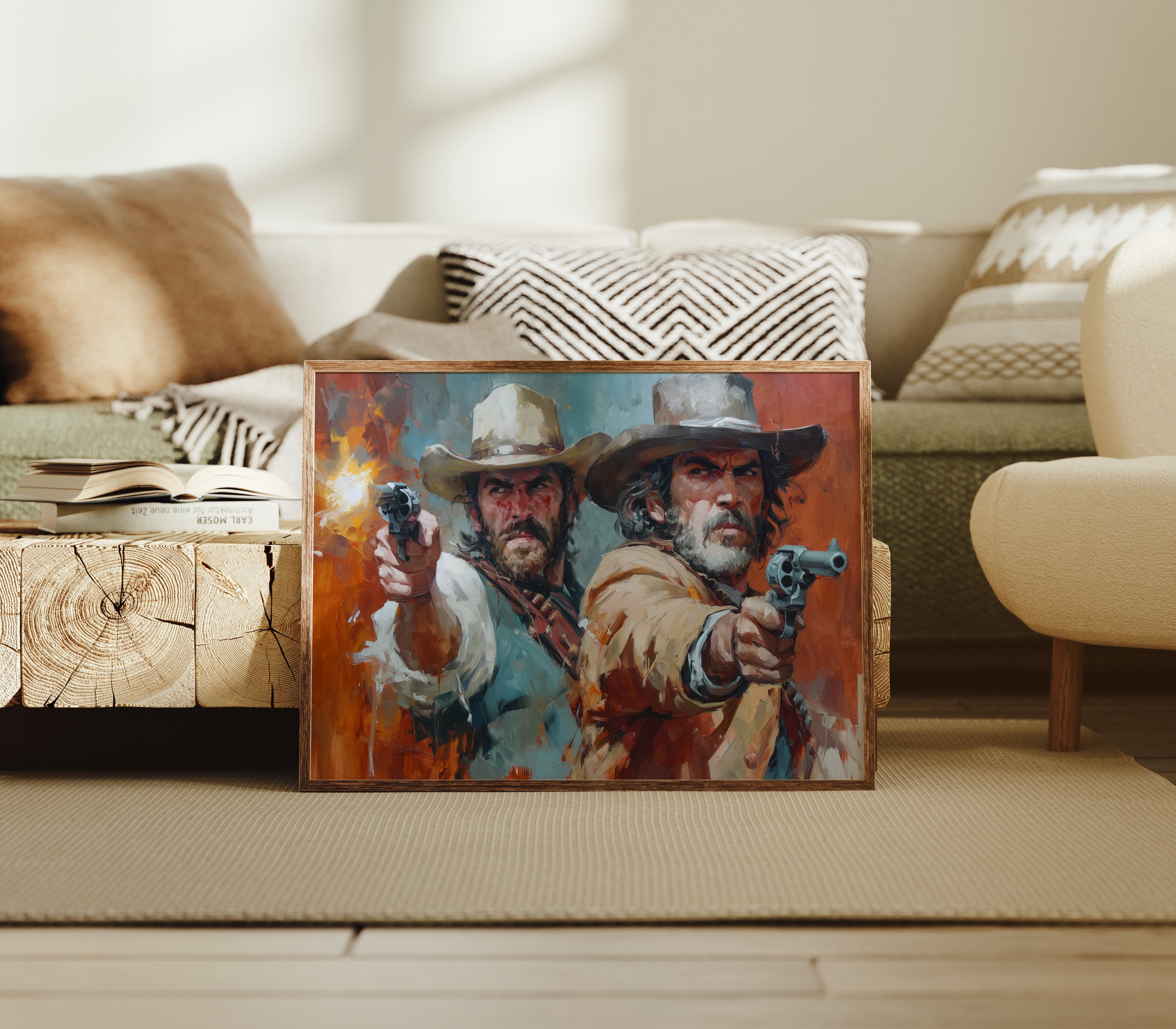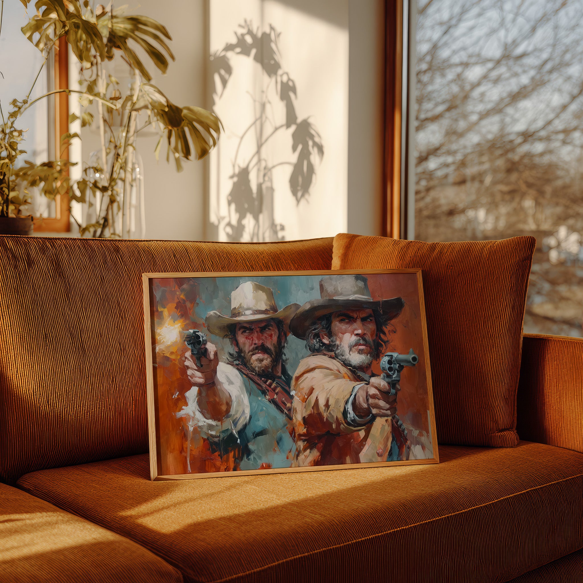 Blazing orange light cuts through turquoise skies, casting long shadows across a moment of intense confrontation. This dramatic contemporary Western piece captures the raw energy of the American frontier spirit. Bold brushstrokes dance between warm earth tones and cool azure, creating a dynamic tension that mirrors the scene's emotional intensity. The composition masterfully balances light and shadow, while expressive painterly techniques bring an almost cinematic quality to the narrative. This statement piece commands attention in a den, office, or any space seeking to evoke the bold spirit of the American West.