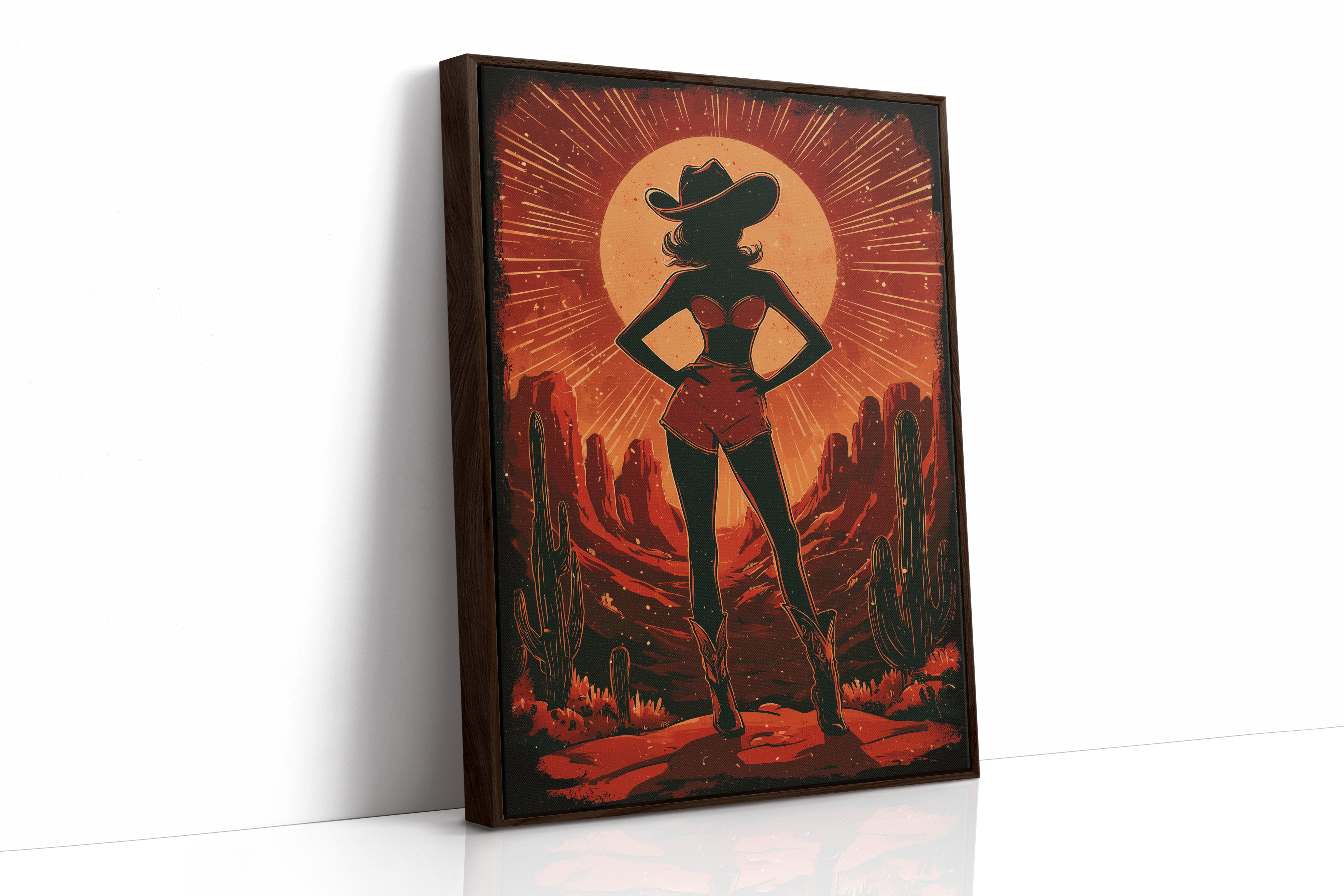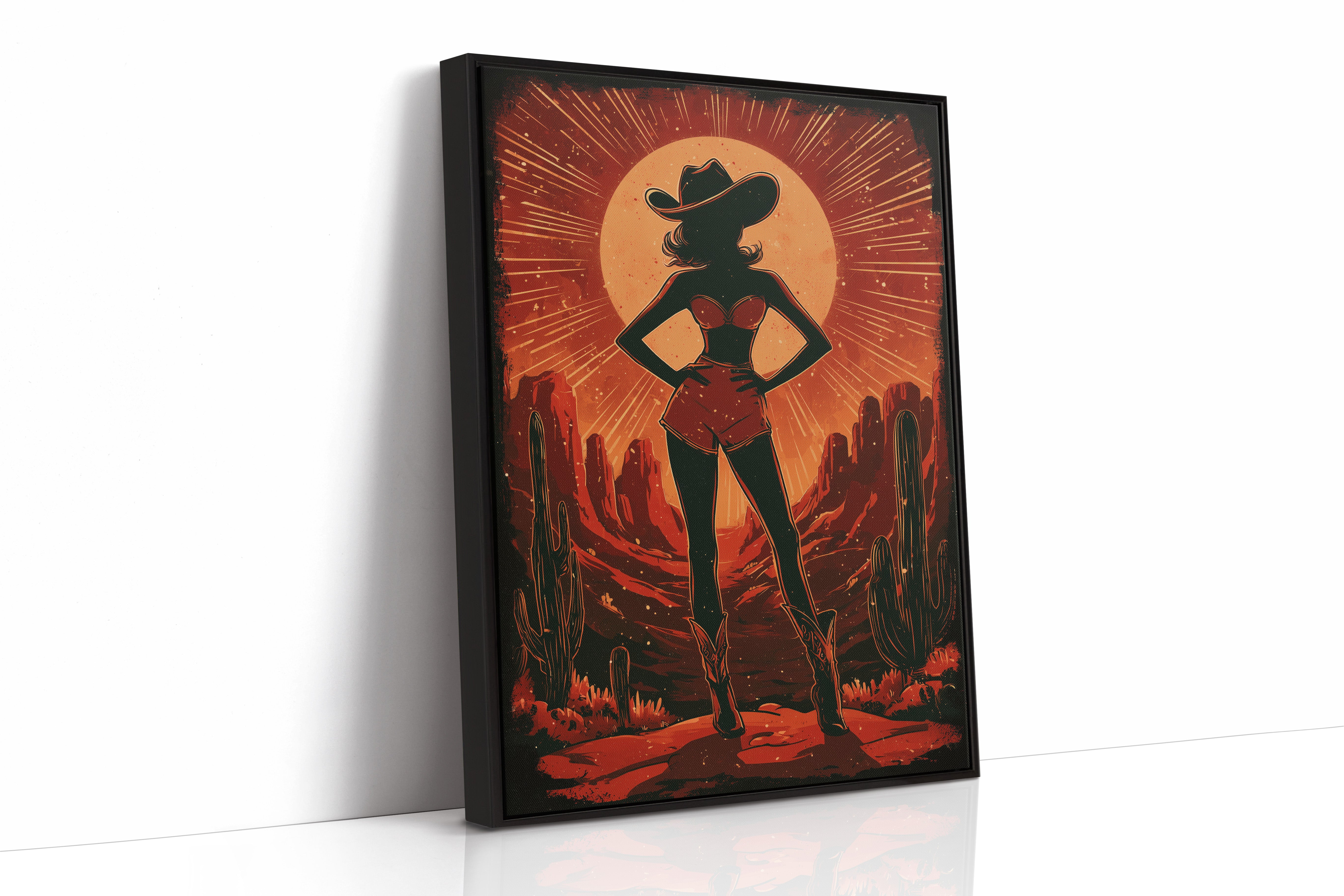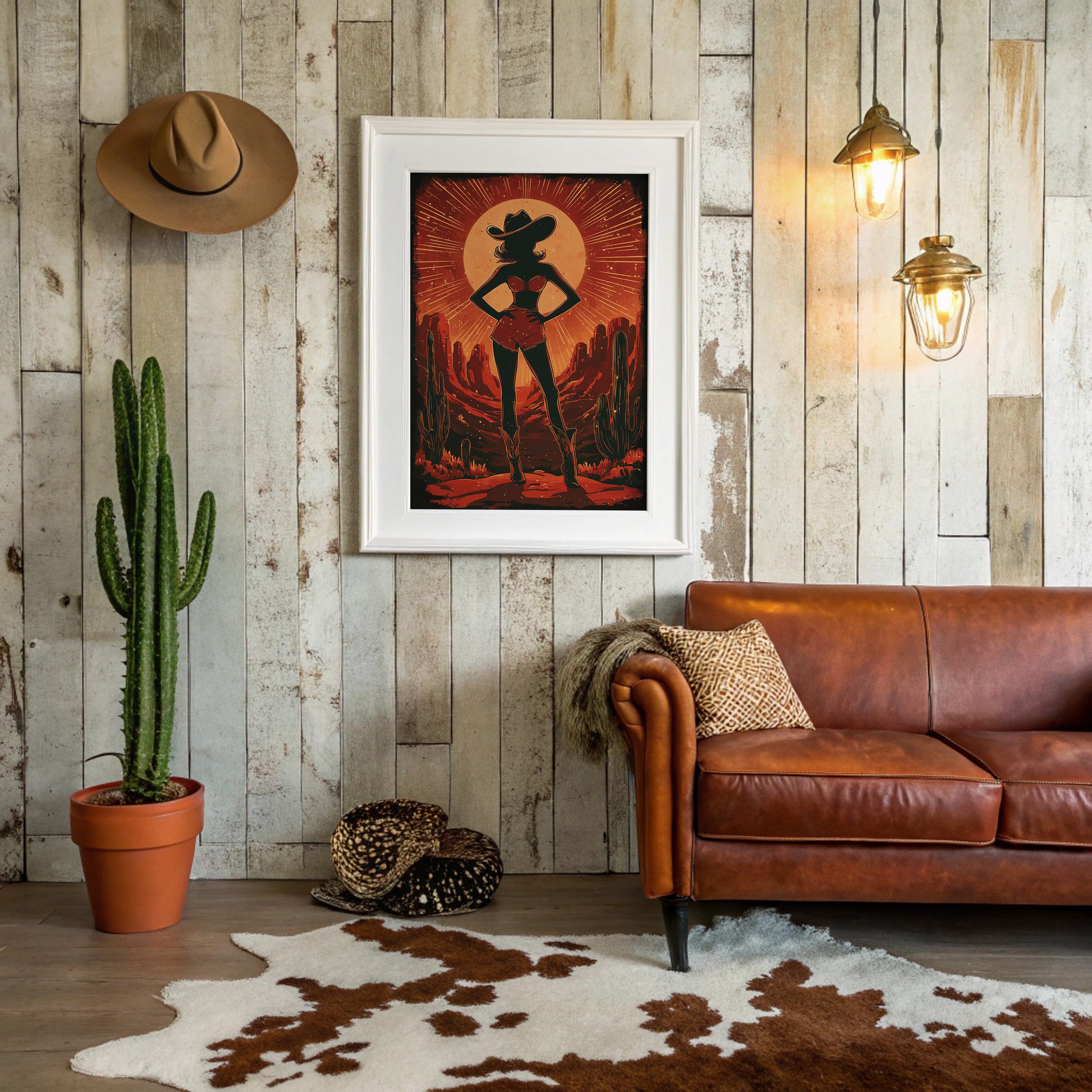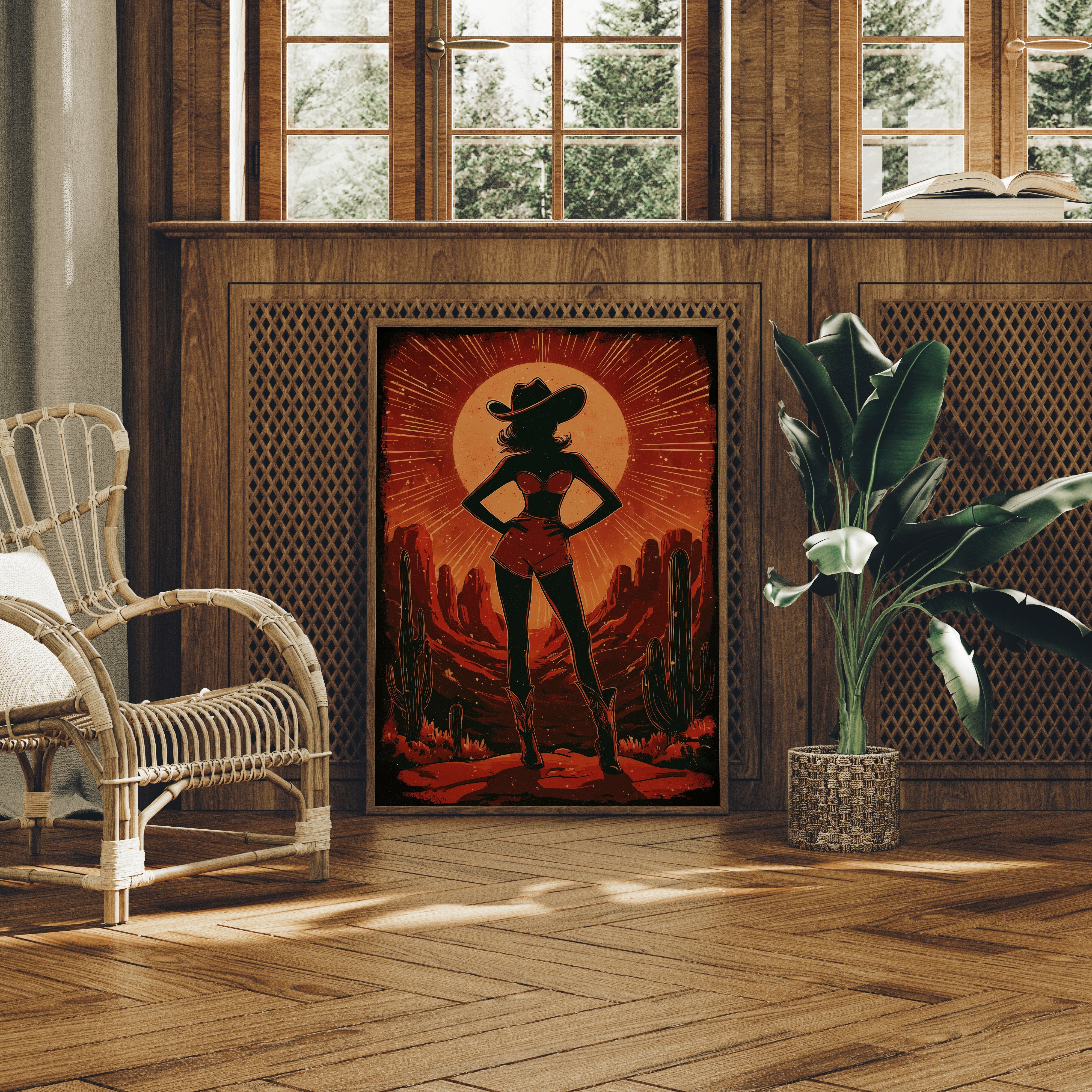 Against a blazing desert sun, a silhouette stands defiant and bold, commanding the landscape with untamed grace. This piece captures the rebellious spirit of contemporary western art with its dramatic contrast and powerful positioning. The rich amber glow bathes the scene in warmth, while saguaro sentinels stand watch against rugged canyon walls, creating a composition that speaks of freedom and fierce independence. Stark shadows and radiating light beams craft a theatrical stage for this modern interpretation of western mythology. Perfect for adding a bold statement to a home office or creating an eye-catching focal point in a modern living space where contemporary meets classic western aesthetics.