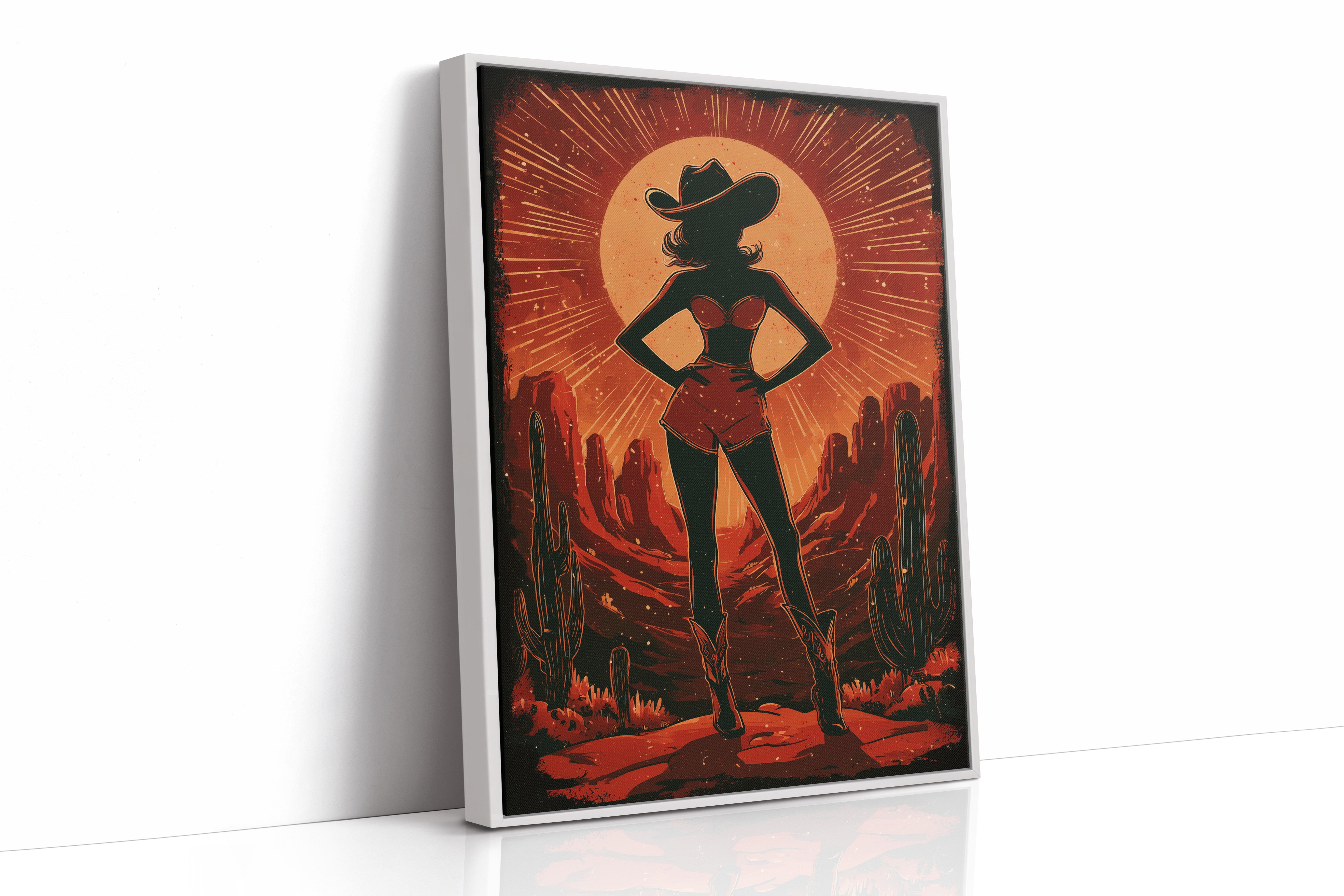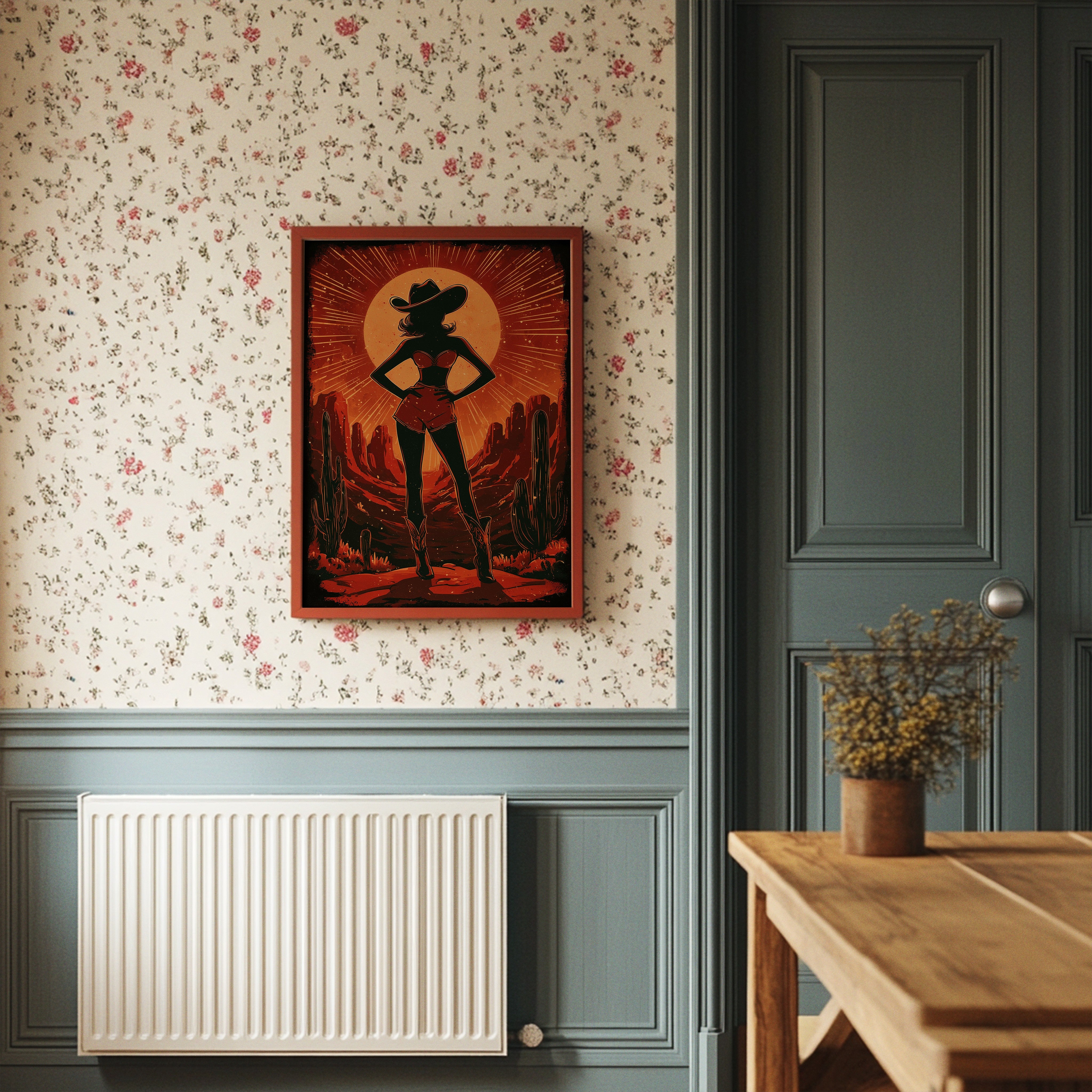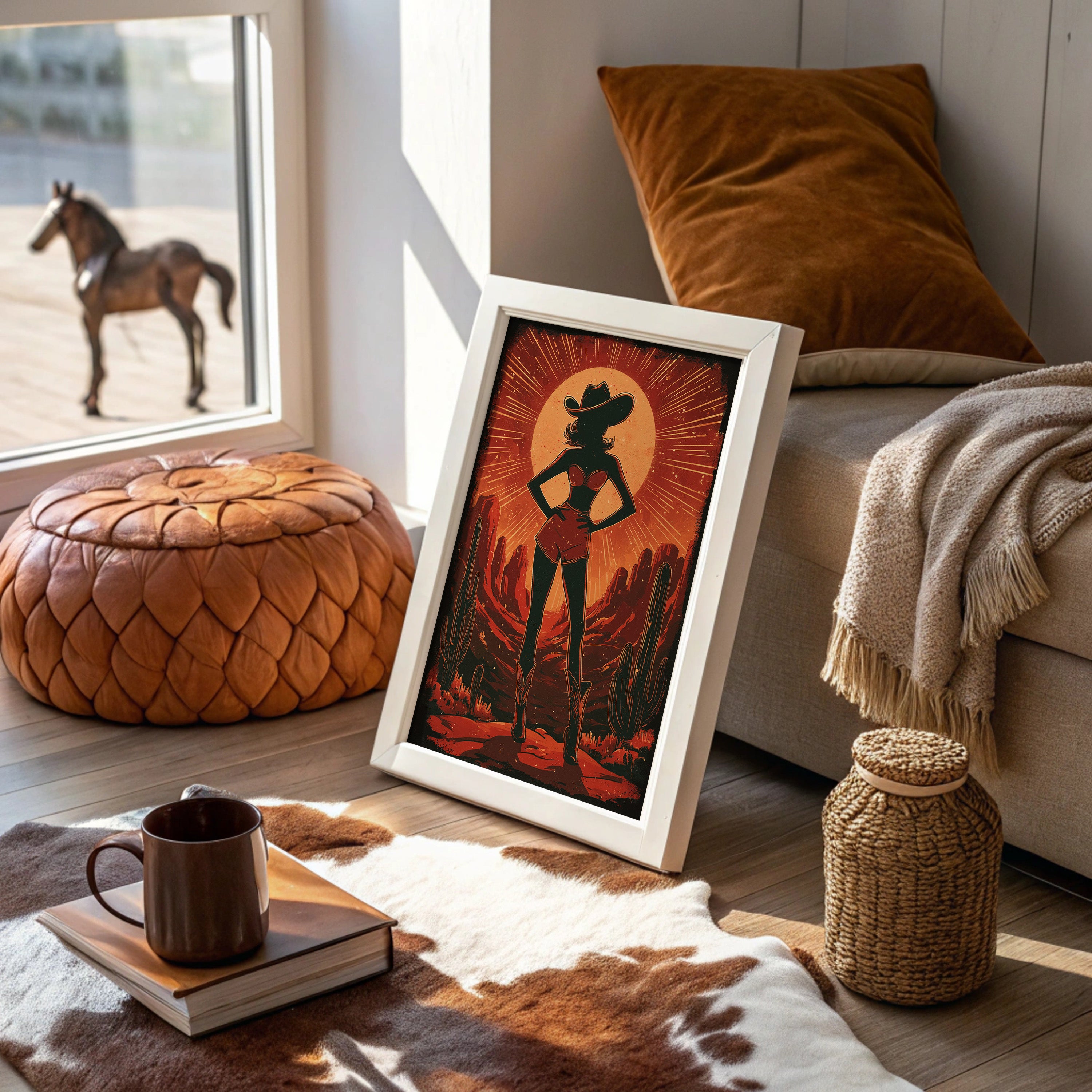 Against a blazing desert sun, a silhouette stands defiant and bold, commanding the landscape with untamed grace. This piece captures the rebellious spirit of contemporary western art with its dramatic contrast and powerful positioning. The rich amber glow bathes the scene in warmth, while saguaro sentinels stand watch against rugged canyon walls, creating a composition that speaks of freedom and fierce independence. Stark shadows and radiating light beams craft a theatrical stage for this modern interpretation of western mythology. Perfect for adding a bold statement to a home office or creating an eye-catching focal point in a modern living space where contemporary meets classic western aesthetics.