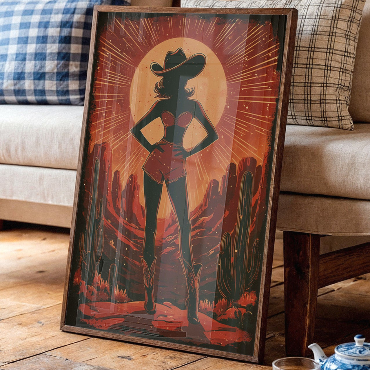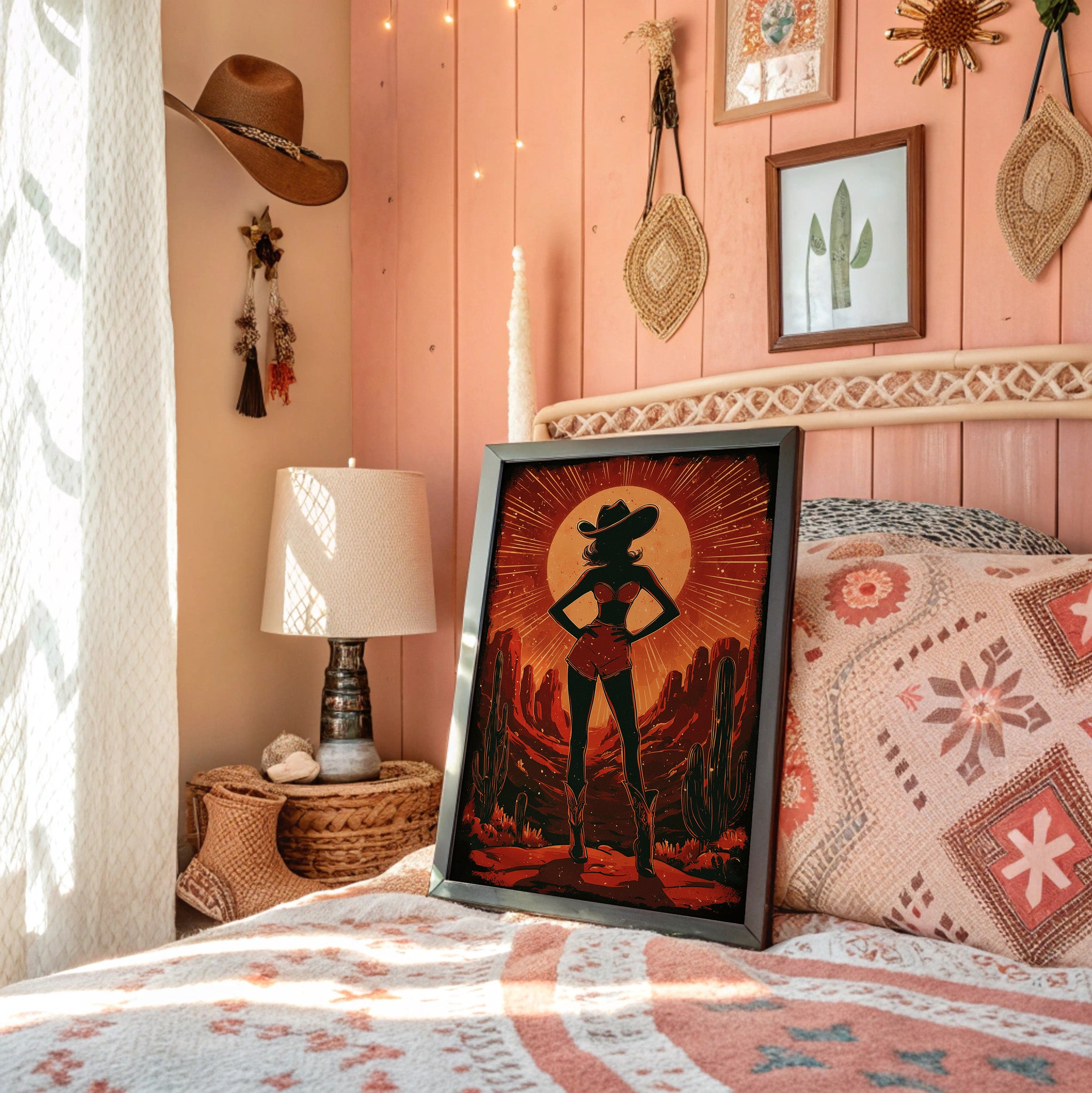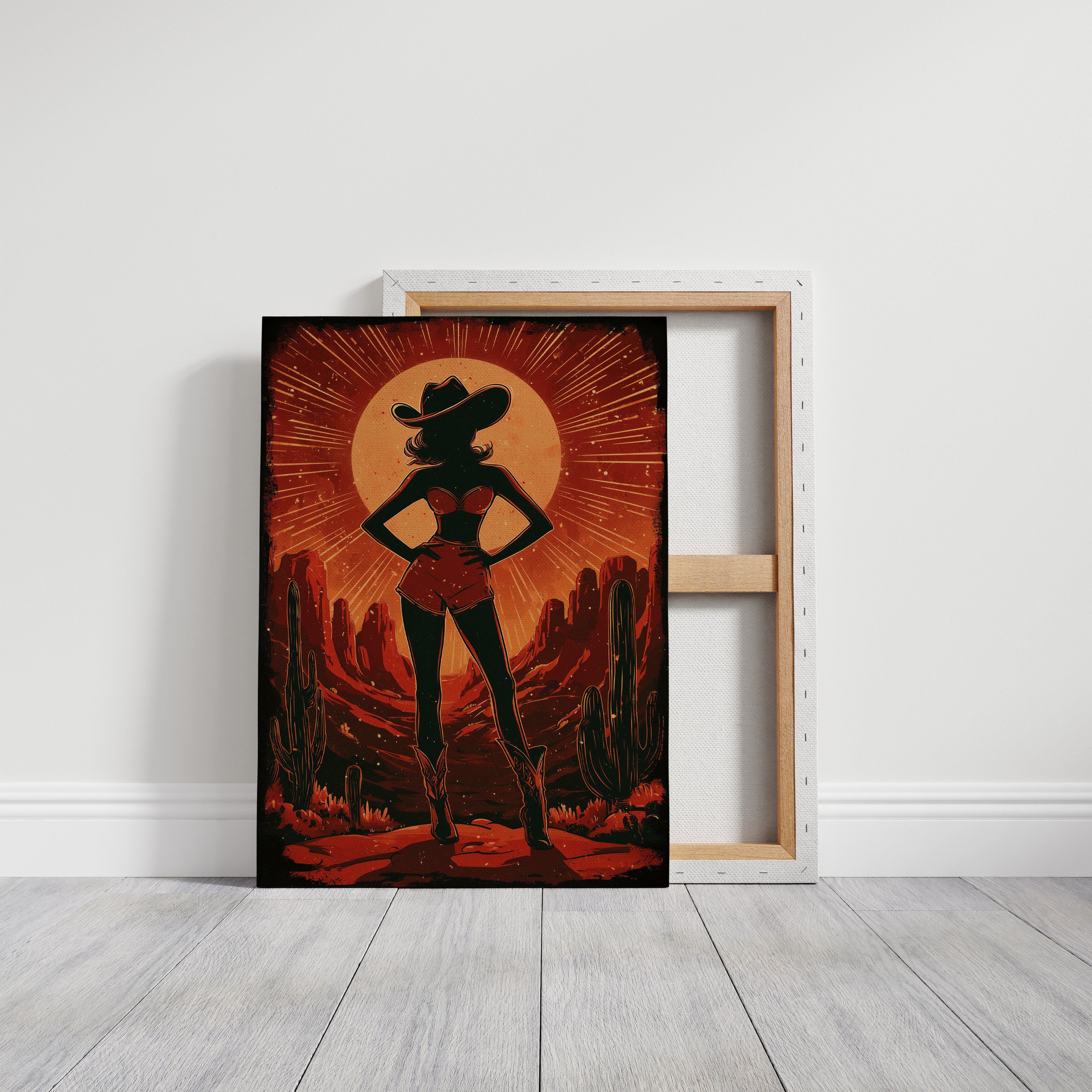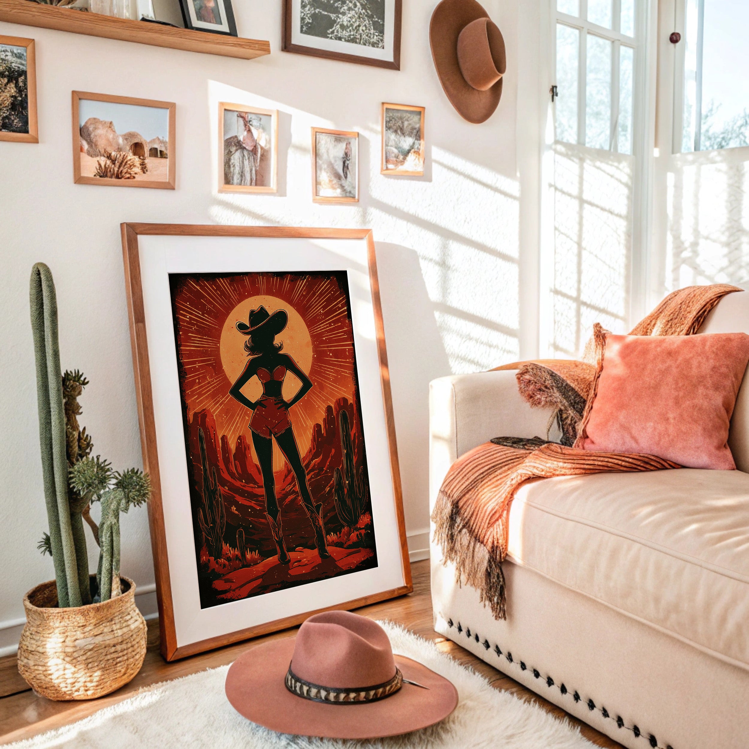 Against a blazing desert sun, a silhouette stands defiant and bold, commanding the landscape with untamed grace. This piece captures the rebellious spirit of contemporary western art with its dramatic contrast and powerful positioning. The rich amber glow bathes the scene in warmth, while saguaro sentinels stand watch against rugged canyon walls, creating a composition that speaks of freedom and fierce independence. Stark shadows and radiating light beams craft a theatrical stage for this modern interpretation of western mythology. Perfect for adding a bold statement to a home office or creating an eye-catching focal point in a modern living space where contemporary meets classic western aesthetics.