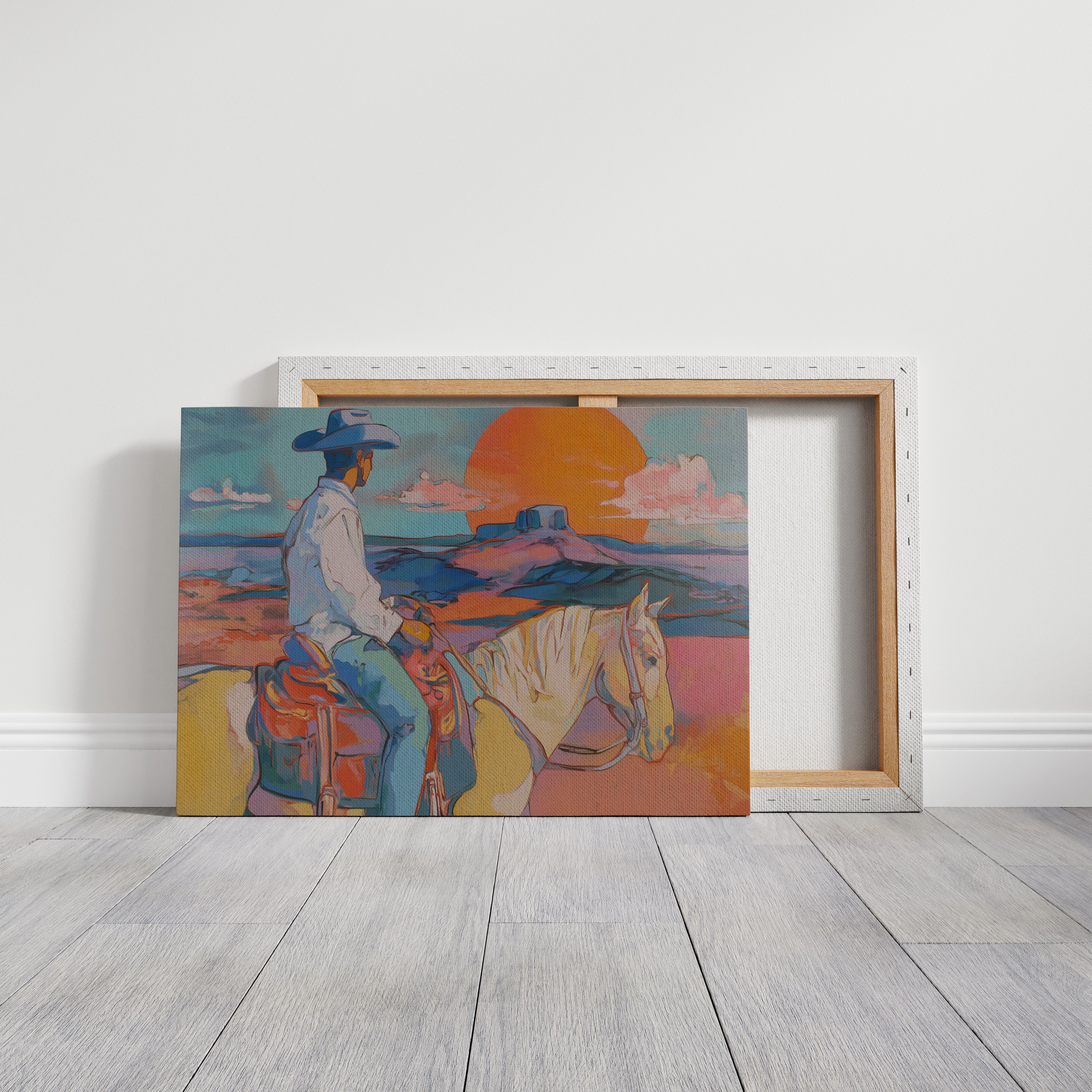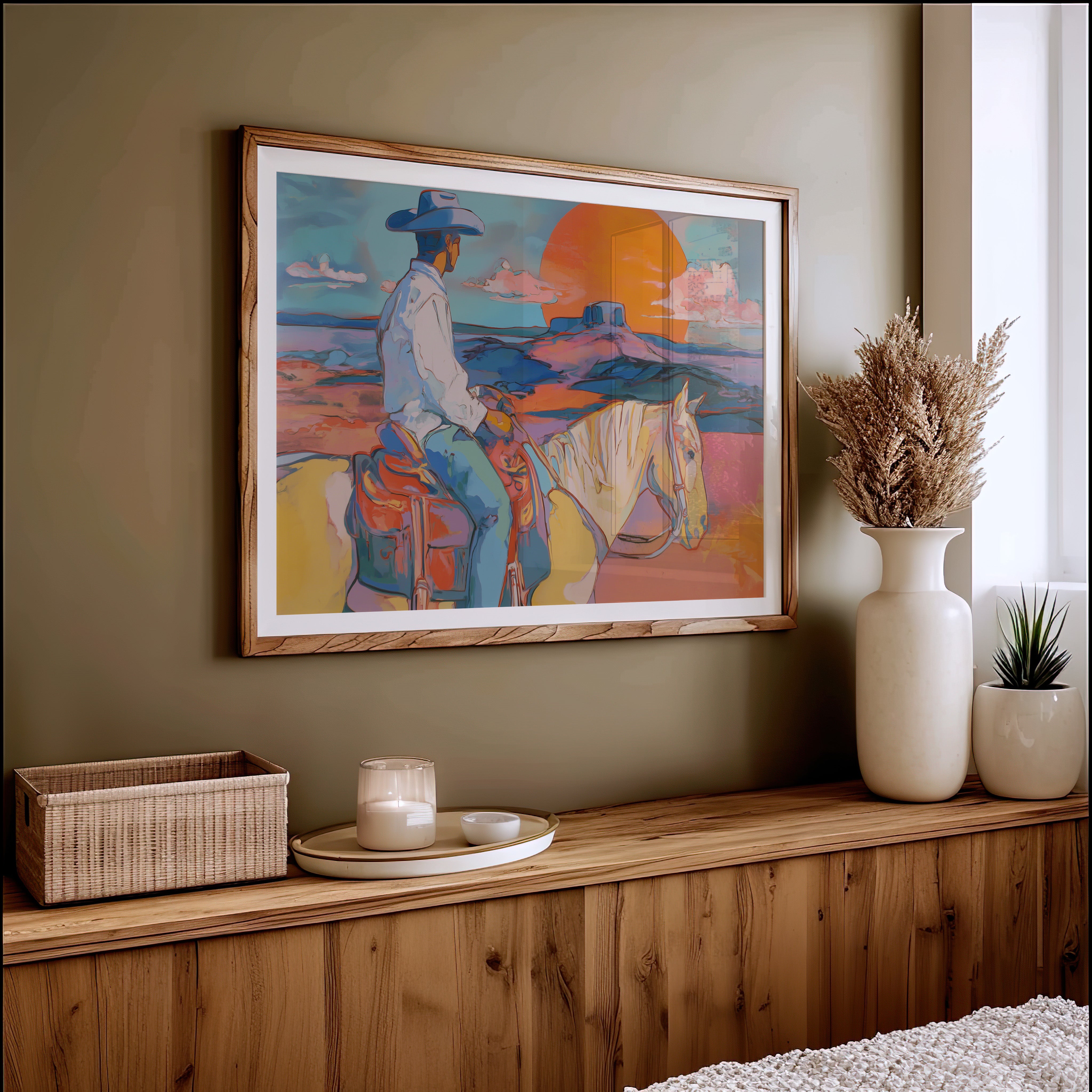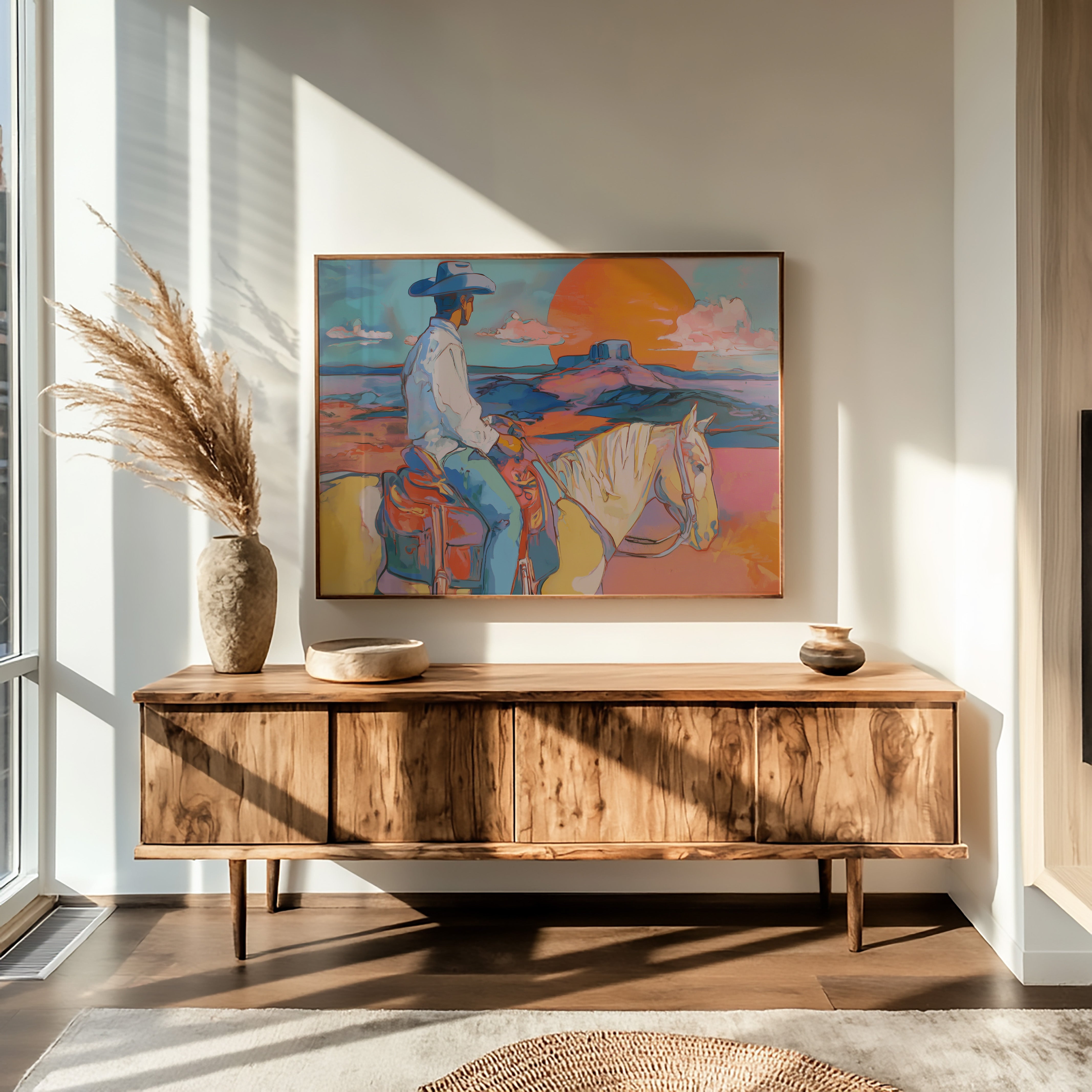 A lone rider pauses against a spectacular southwestern sunset, where coral clouds dance with turquoise skies. The scene unfolds in vibrant watercolor strokes - the rider's white horse standing proud against pink desert sands, while a massive orange sun bathes the landscape in warm, dreamy hues. Mountain silhouettes rise in the distance, their blue-purple peaks echoing the rider's contemplative stillness. This contemporary western piece brings a bold splash of color and adventure to modern living spaces, perfect for creating a striking focal point in a minimalist dining room or adding artistic flair to a sophisticated home office.