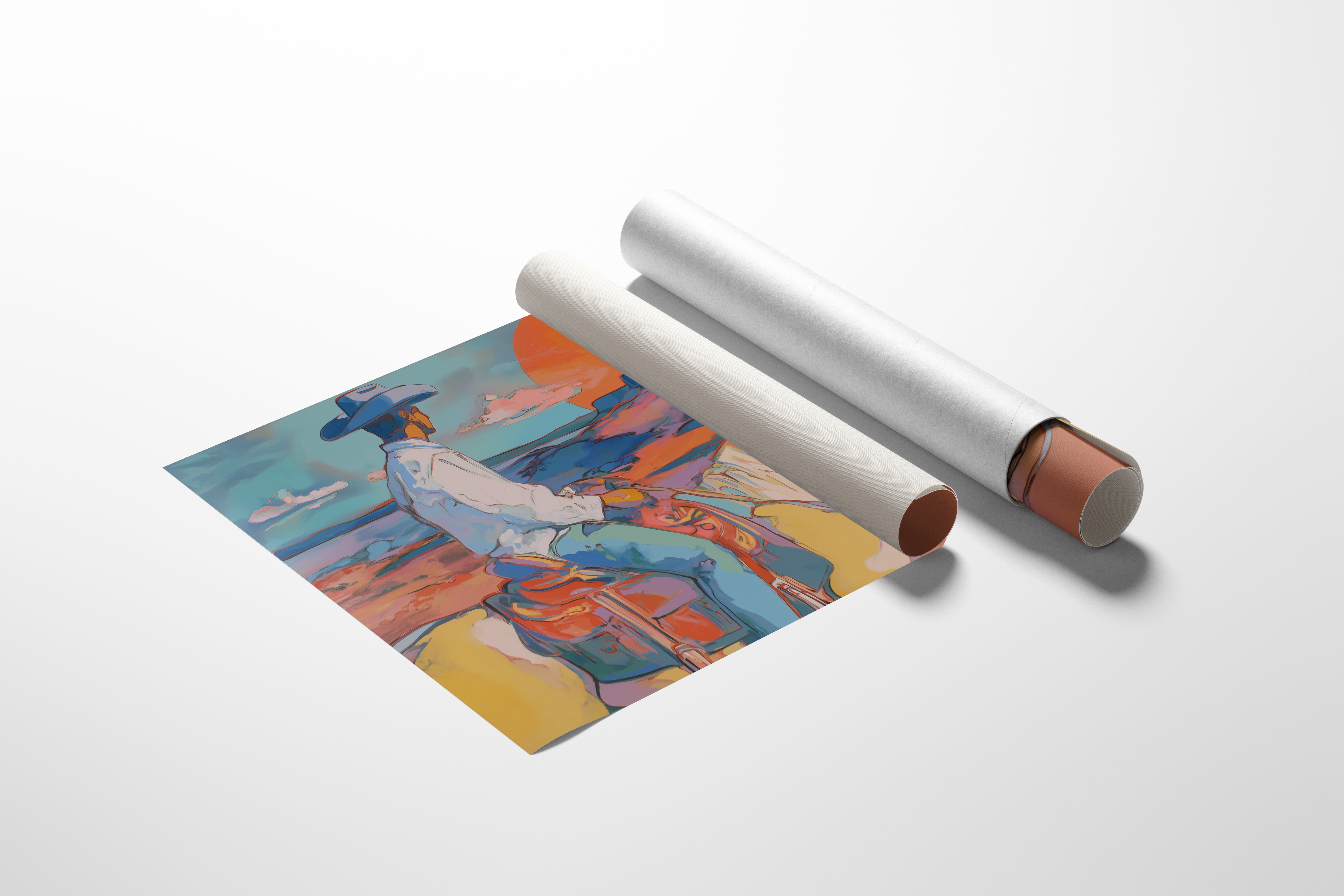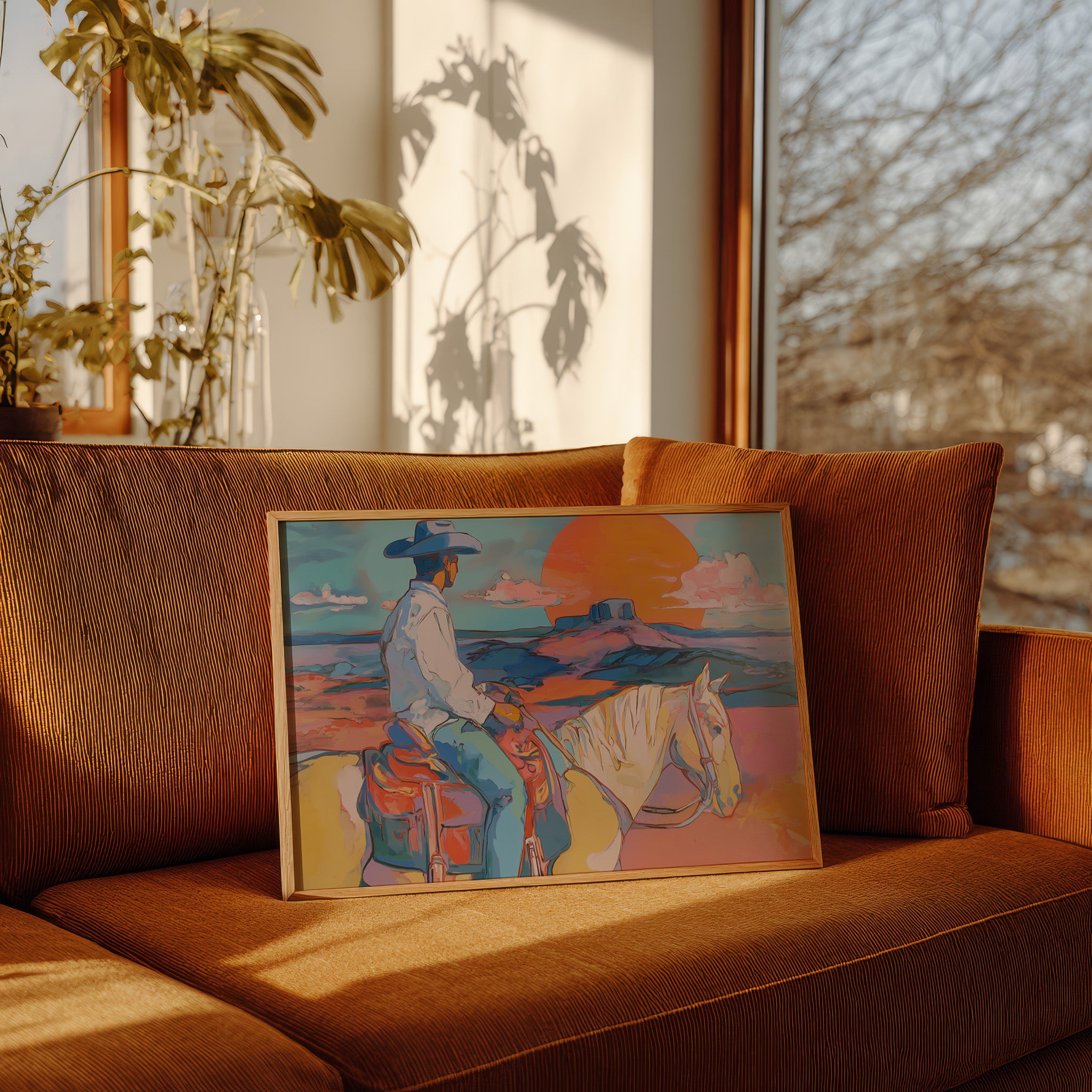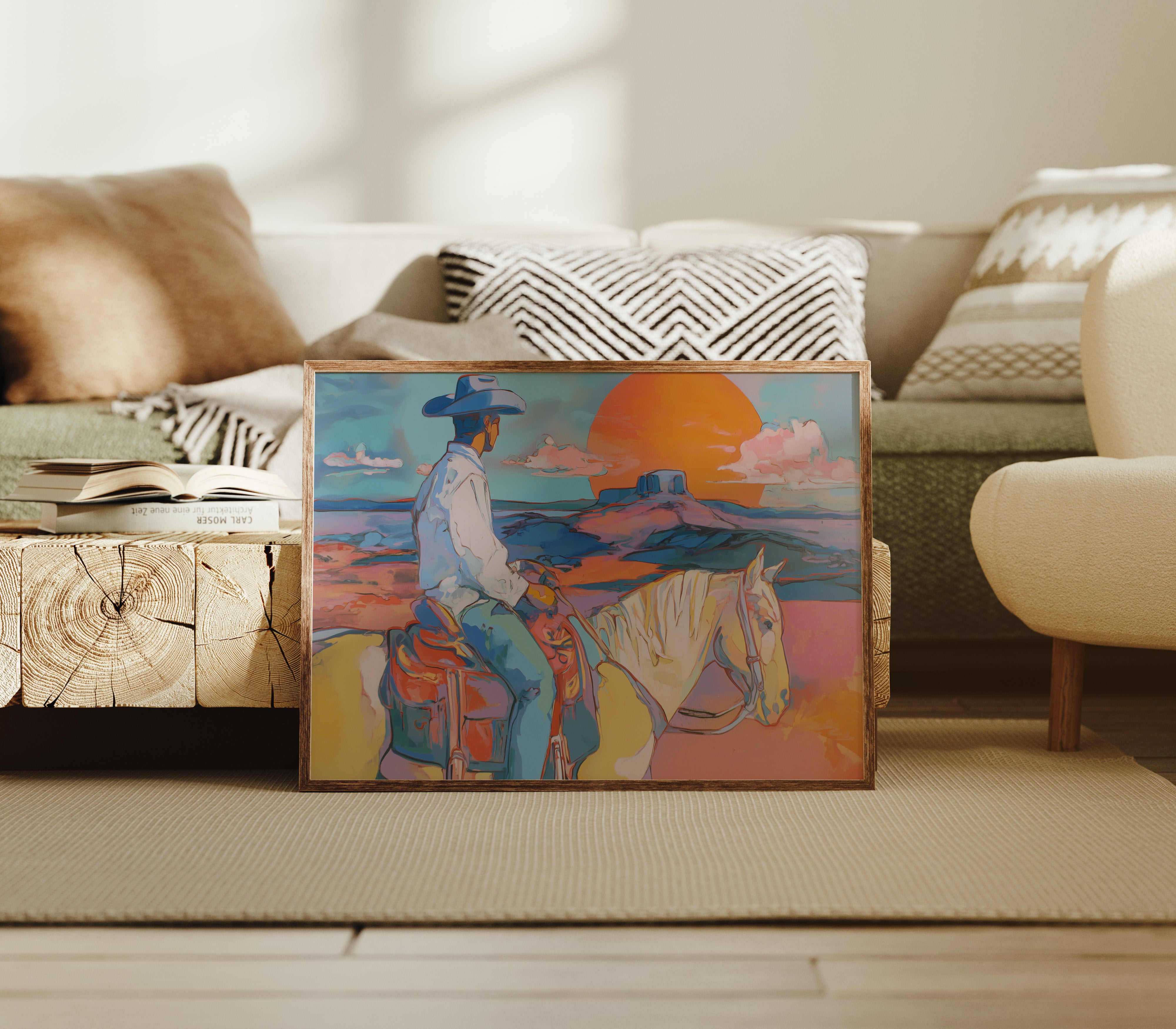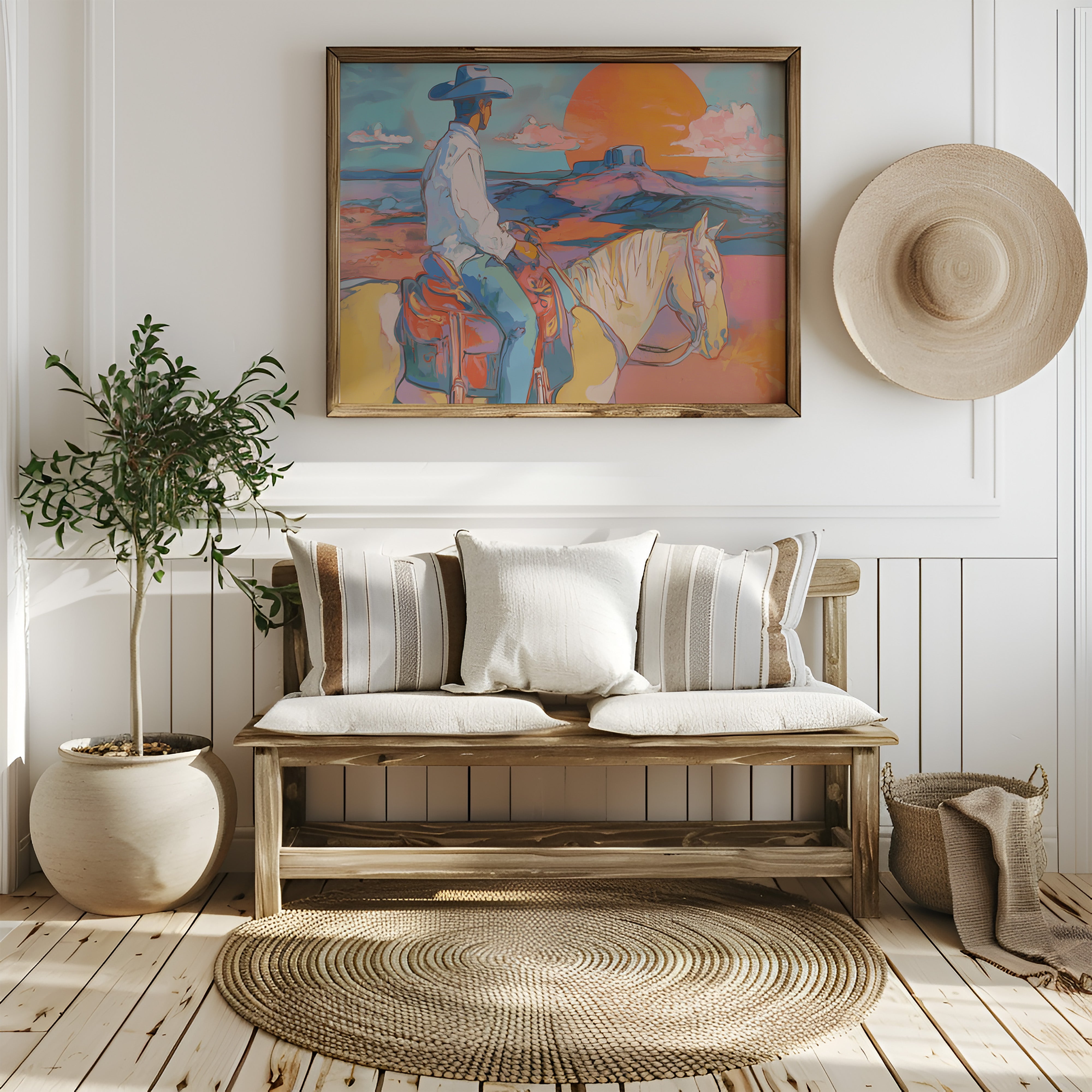 A lone rider pauses against a spectacular southwestern sunset, where coral clouds dance with turquoise skies. The scene unfolds in vibrant watercolor strokes - the rider's white horse standing proud against pink desert sands, while a massive orange sun bathes the landscape in warm, dreamy hues. Mountain silhouettes rise in the distance, their blue-purple peaks echoing the rider's contemplative stillness. This contemporary western piece brings a bold splash of color and adventure to modern living spaces, perfect for creating a striking focal point in a minimalist dining room or adding artistic flair to a sophisticated home office.