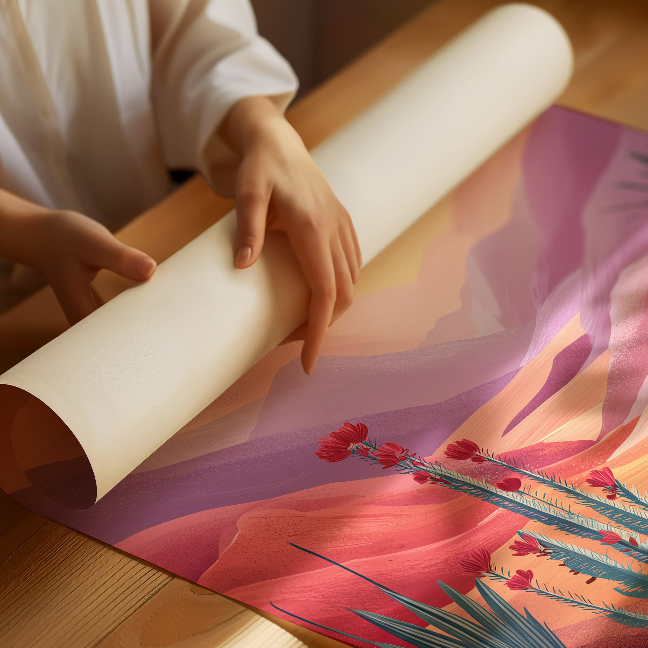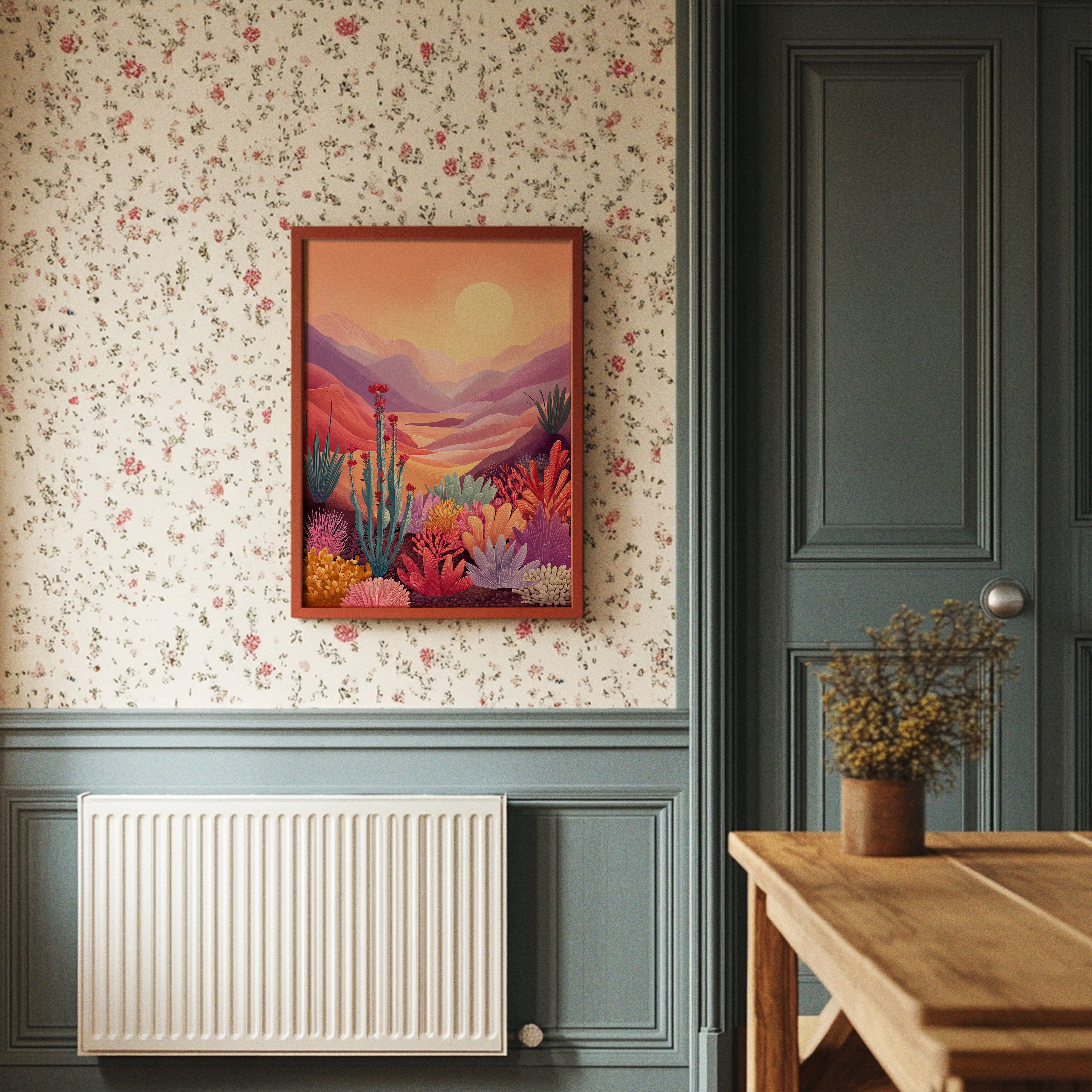 A vibrant sunset bathes the desert landscape in ethereal hues of coral, purple, and gold, as flowering cacti reach toward the glowing horizon. This piece from our Contemporary collection reimagines the Southwest's rugged beauty through a bold, modern lens. Layered mountains fade into warm skies while succulents and desert blooms create a magical garden in impossible colors - coral pinks dance with deep purples and rich teals, celebrating nature's hidden vibrancy. The piece brings life and energy to living rooms, studies, or any space seeking to capture the enchanting spirit of desert twilight. Its dreamy palette invites viewers to pause and witness the desert's transformation at golden hour.