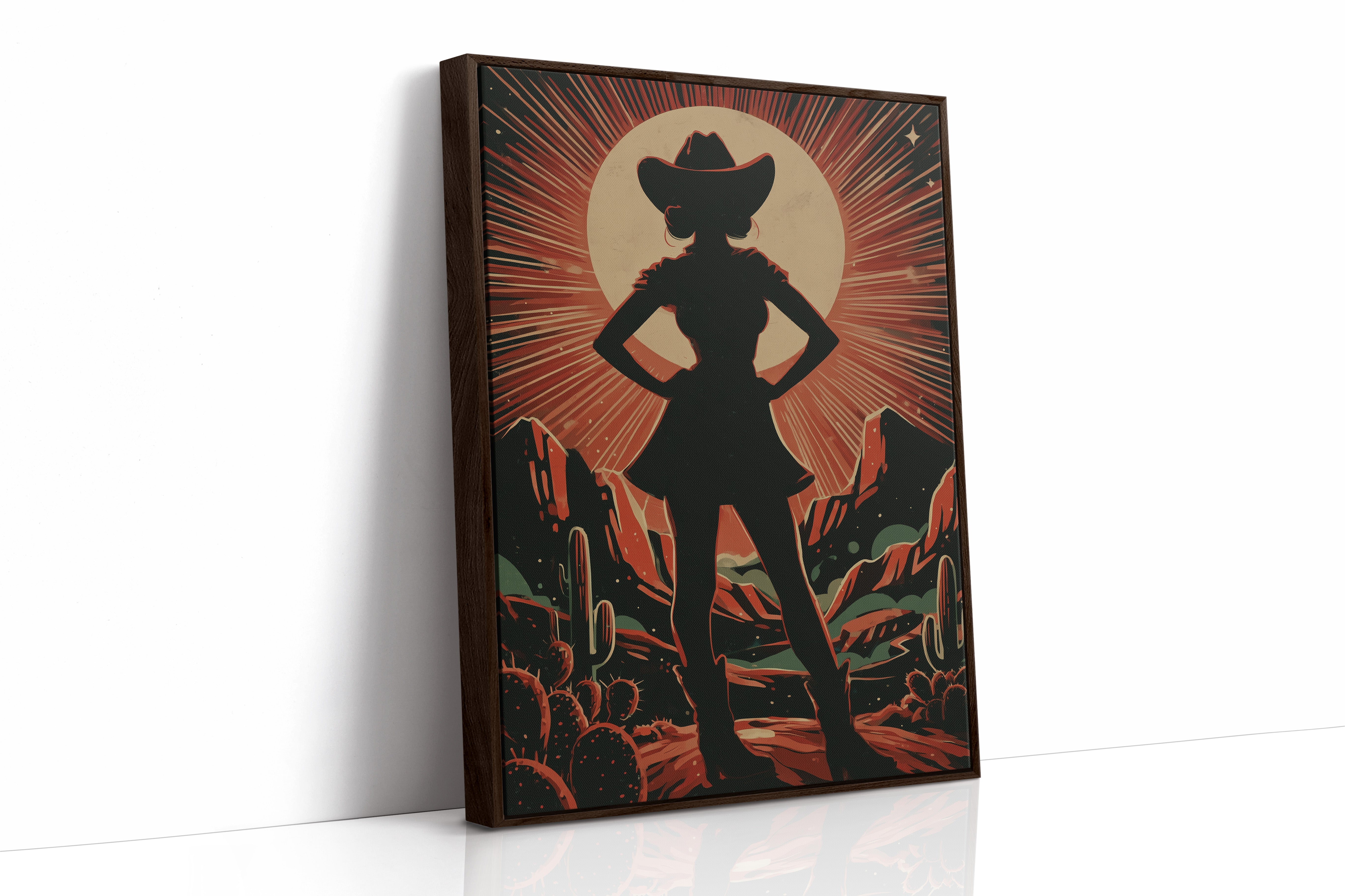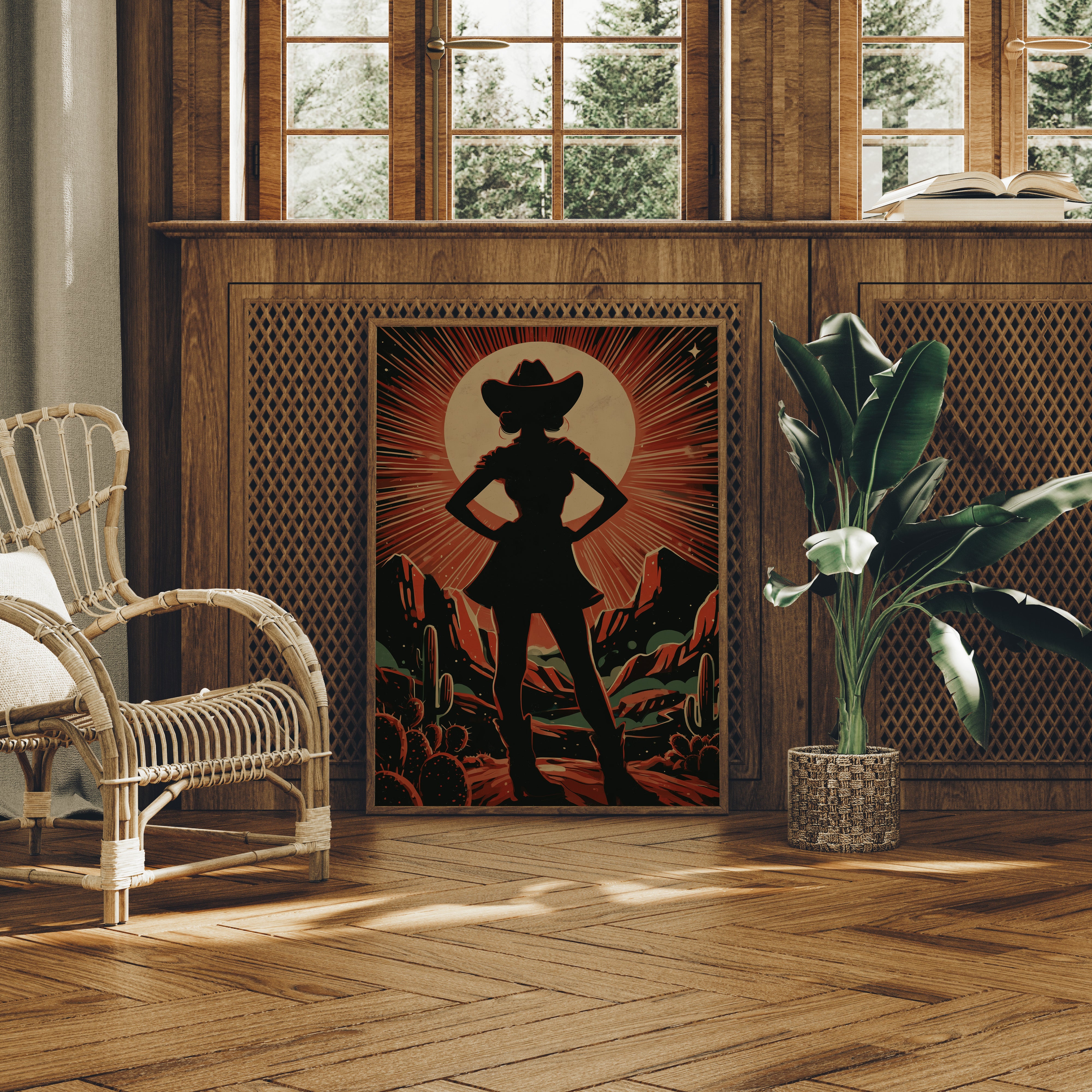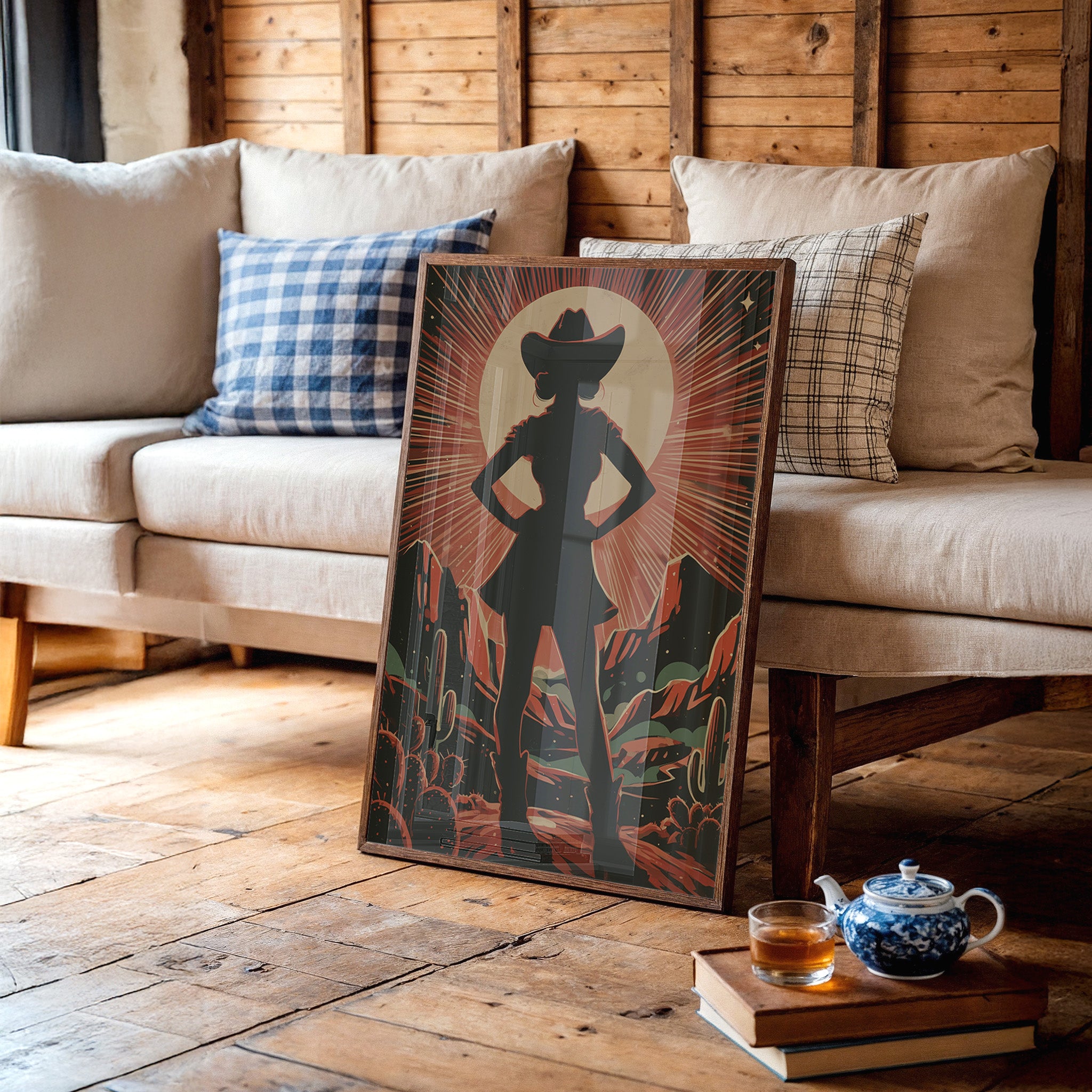 A silhouetted figure stands defiant against a blazing desert sun, her presence commanding the wild landscape before her. Radiating lines burst from the glowing orb behind her, casting dramatic shadows across towering cacti and rugged rock formations. The bold contrast between the dark figure and the fiery orange backdrop creates a powerful statement of feminine strength in the untamed West. This striking contemporary western piece brings dramatic flair and southwestern charm to any space. Perfect for a modern ranch house, desert-inspired home office, or as a bold statement piece in a leather-accented living room.