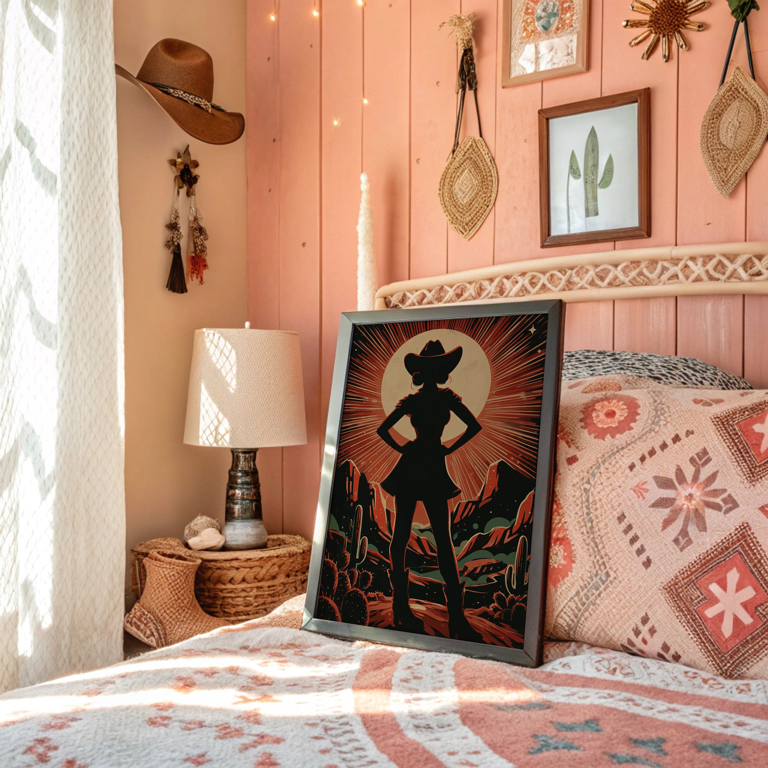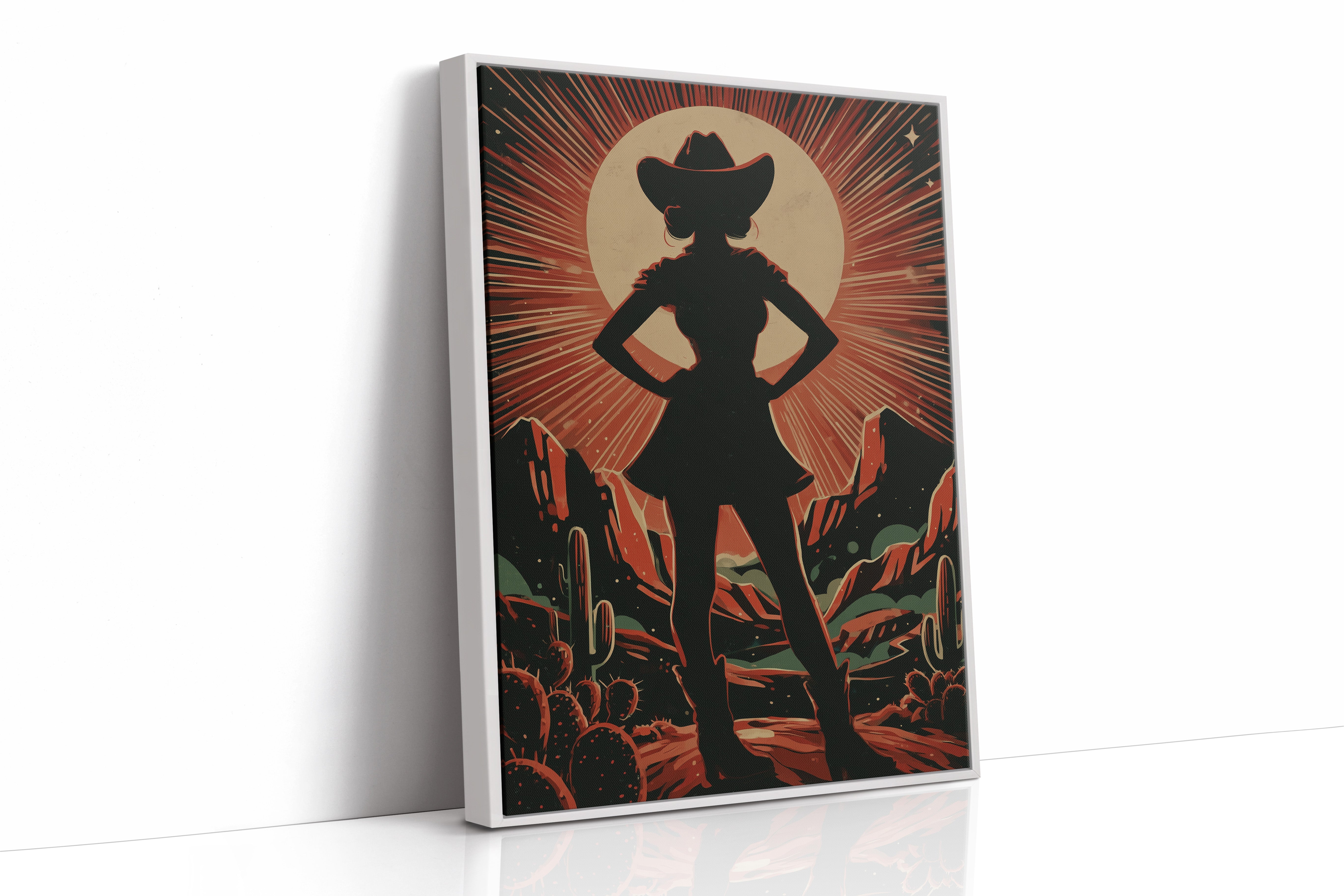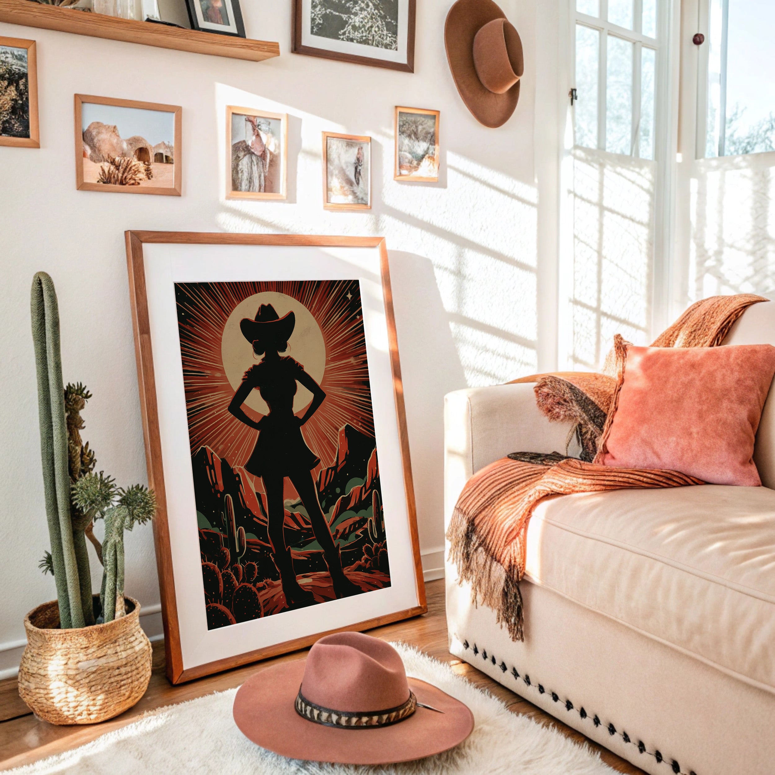 A silhouetted figure stands defiant against a blazing desert sun, her presence commanding the wild landscape before her. Radiating lines burst from the glowing orb behind her, casting dramatic shadows across towering cacti and rugged rock formations. The bold contrast between the dark figure and the fiery orange backdrop creates a powerful statement of feminine strength in the untamed West. This striking contemporary western piece brings dramatic flair and southwestern charm to any space. Perfect for a modern ranch house, desert-inspired home office, or as a bold statement piece in a leather-accented living room.