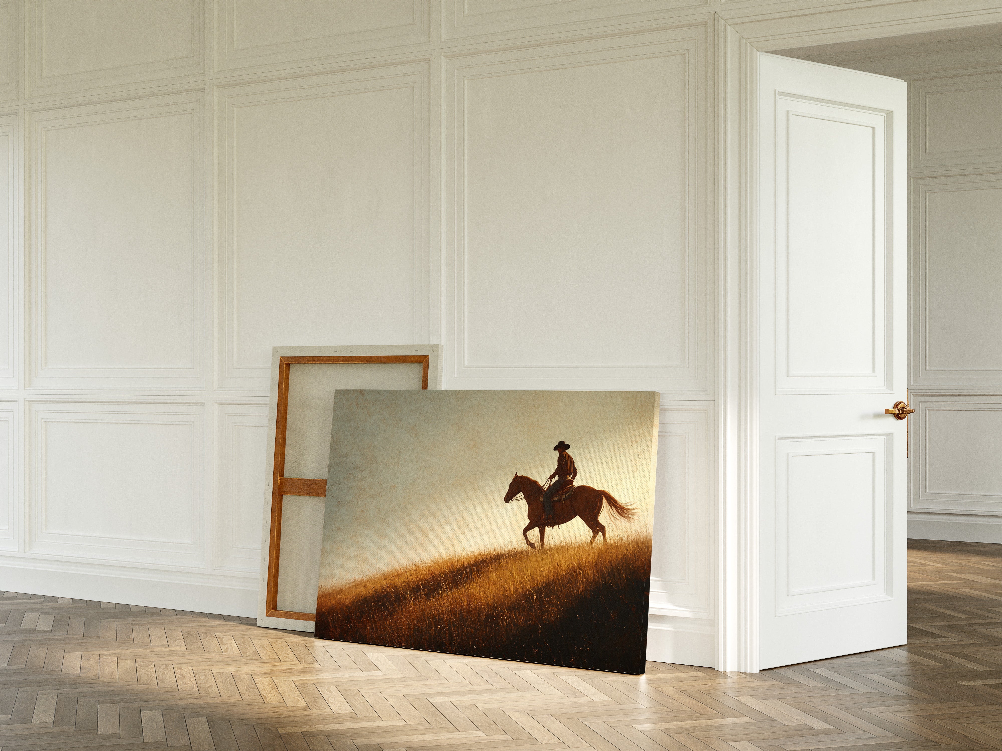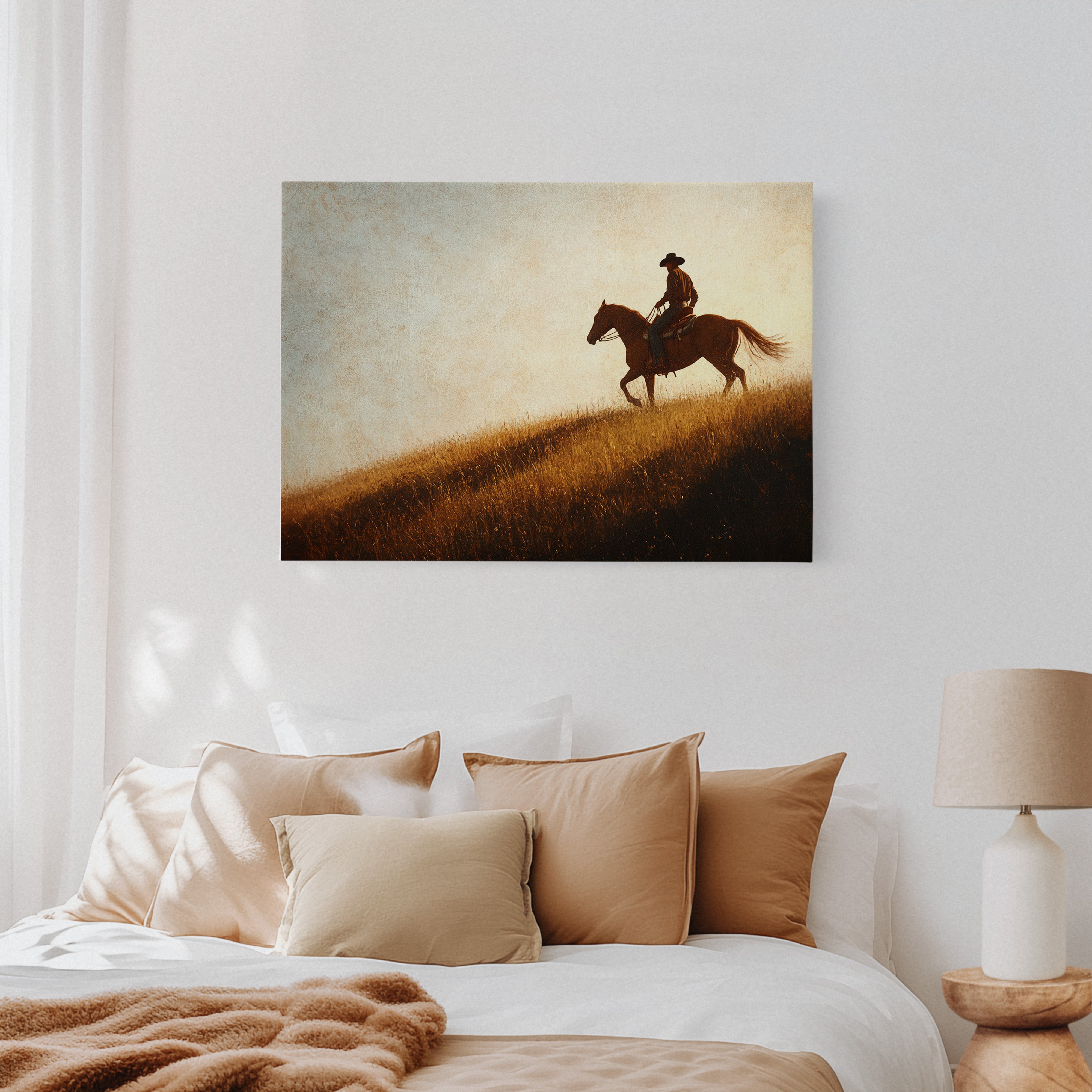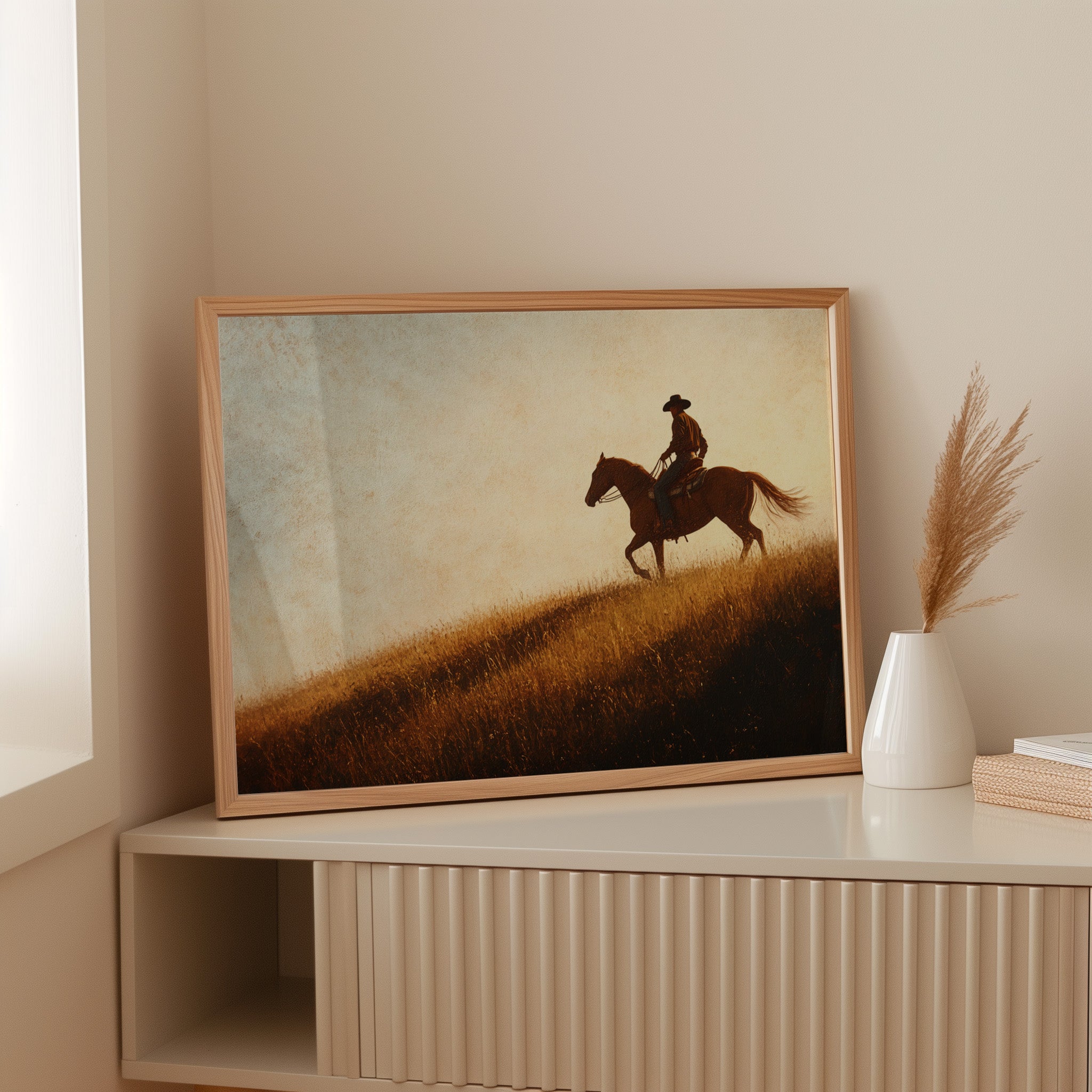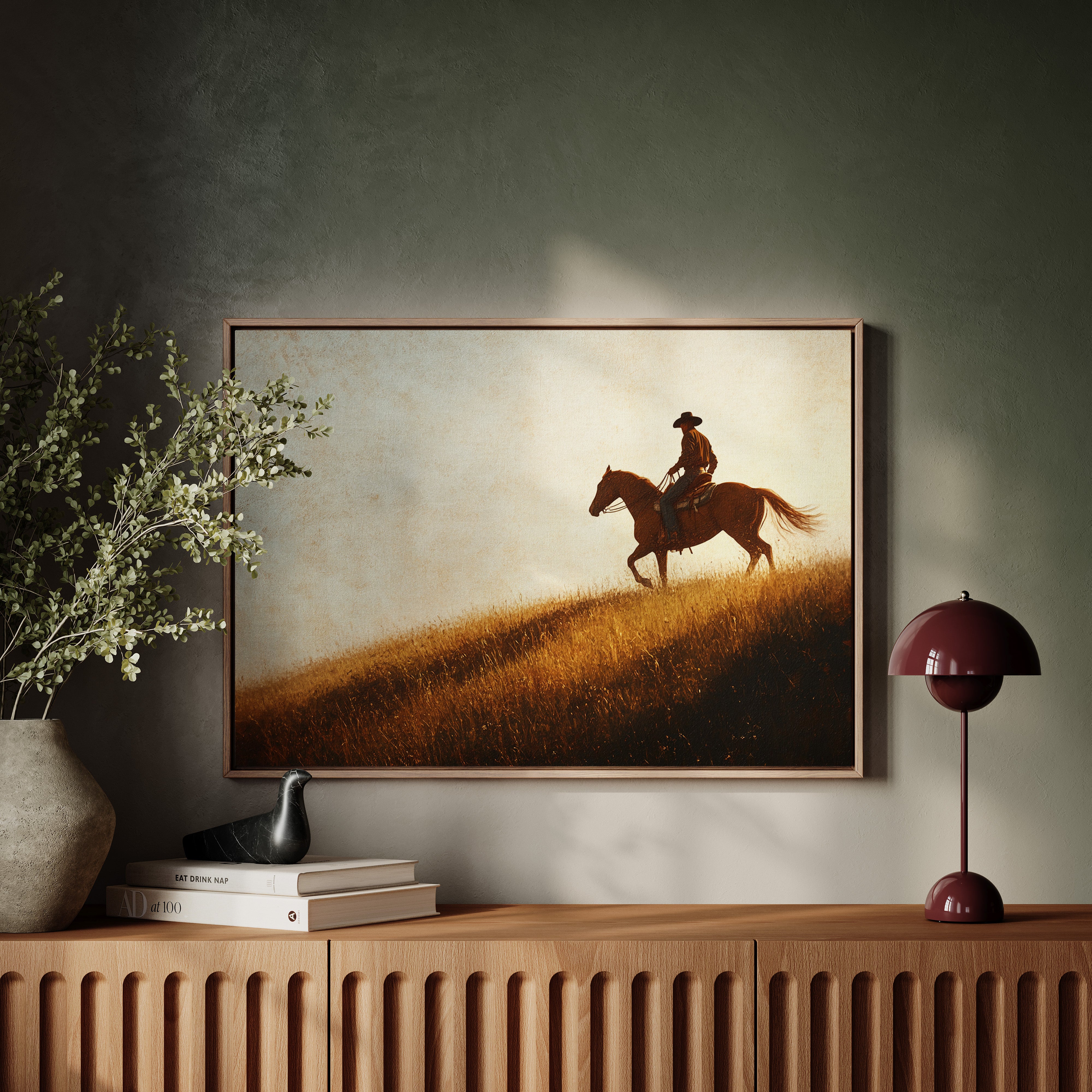 A cowboy rides the ridge in the golden hush of evening, his silhouette glowing against a sky brushed with amber. This painterly piece evokes solitude, freedom, and wide open country.