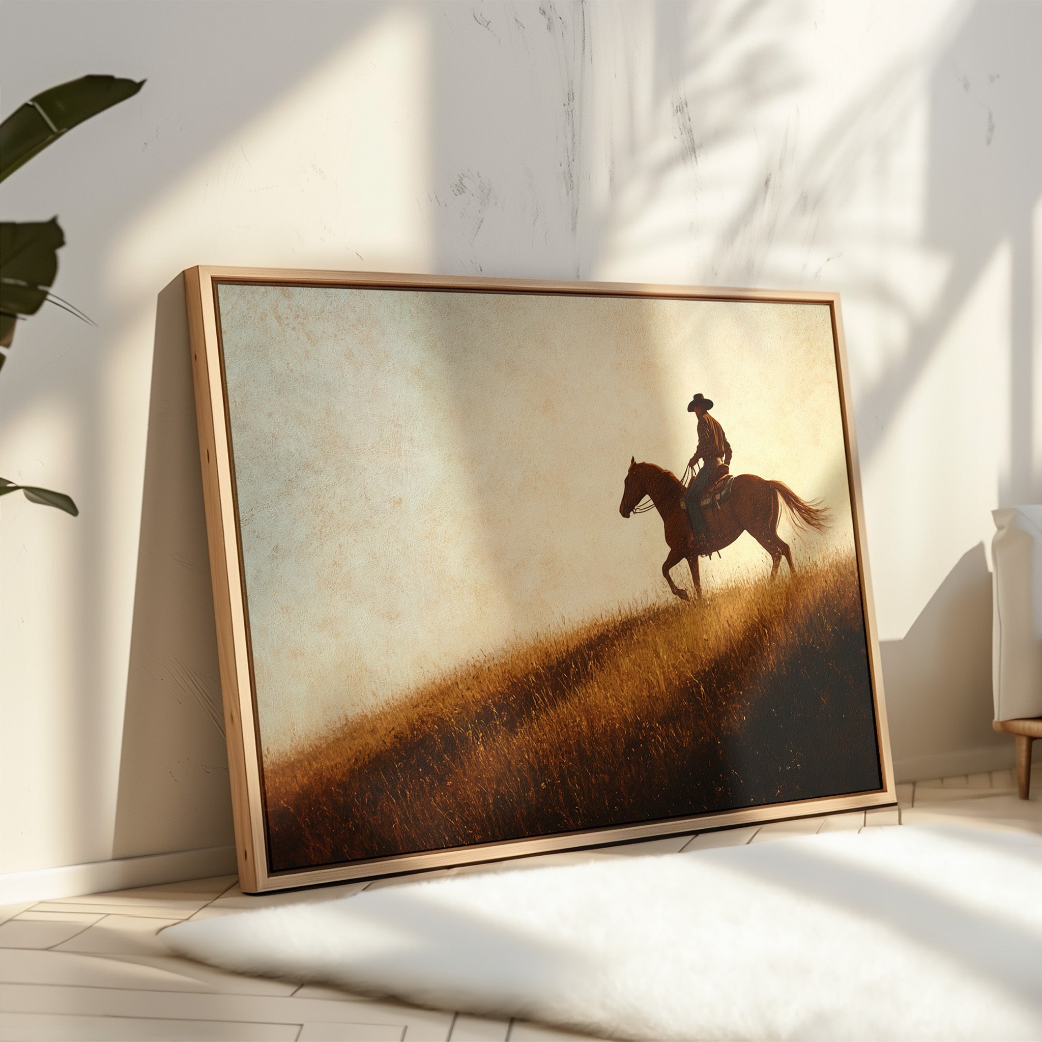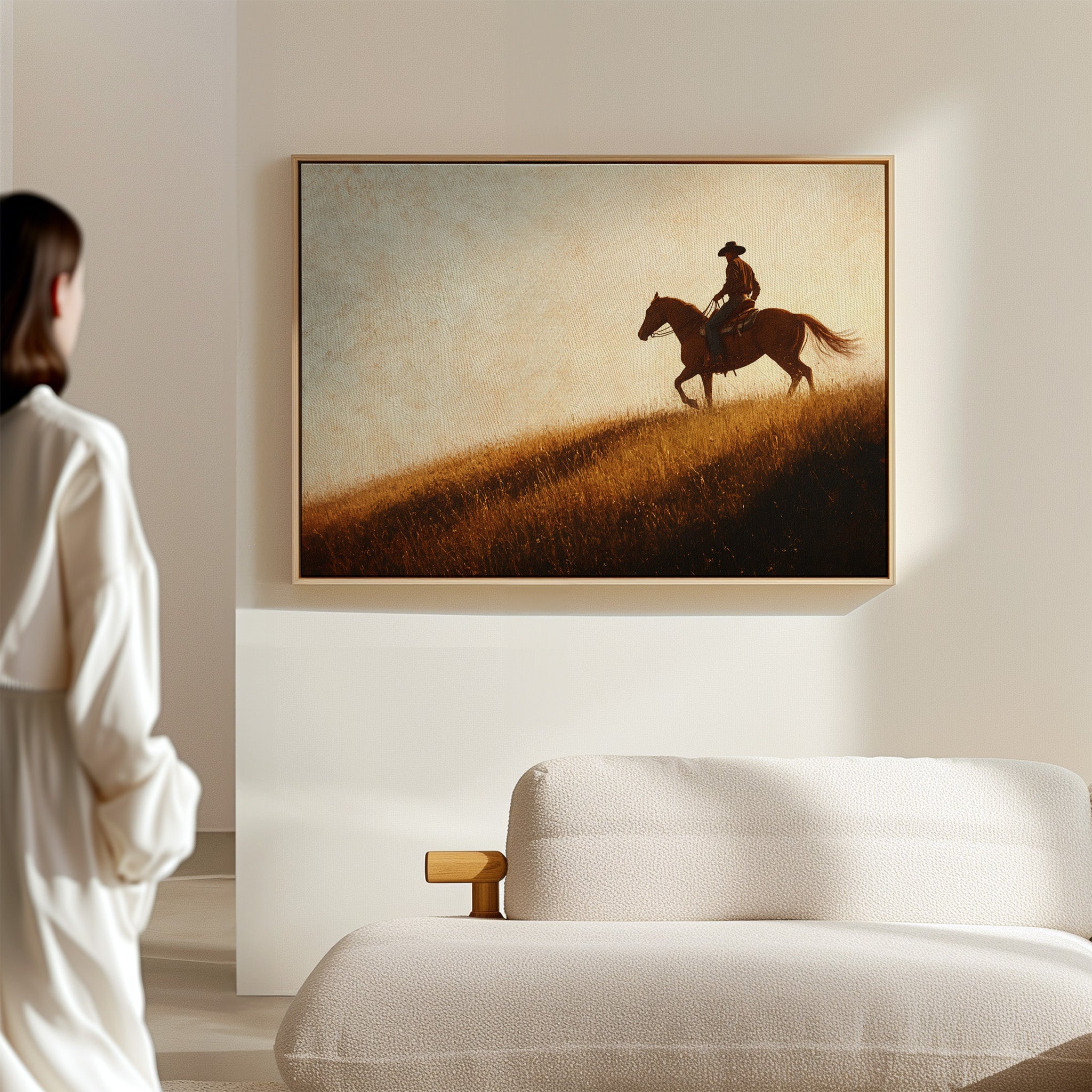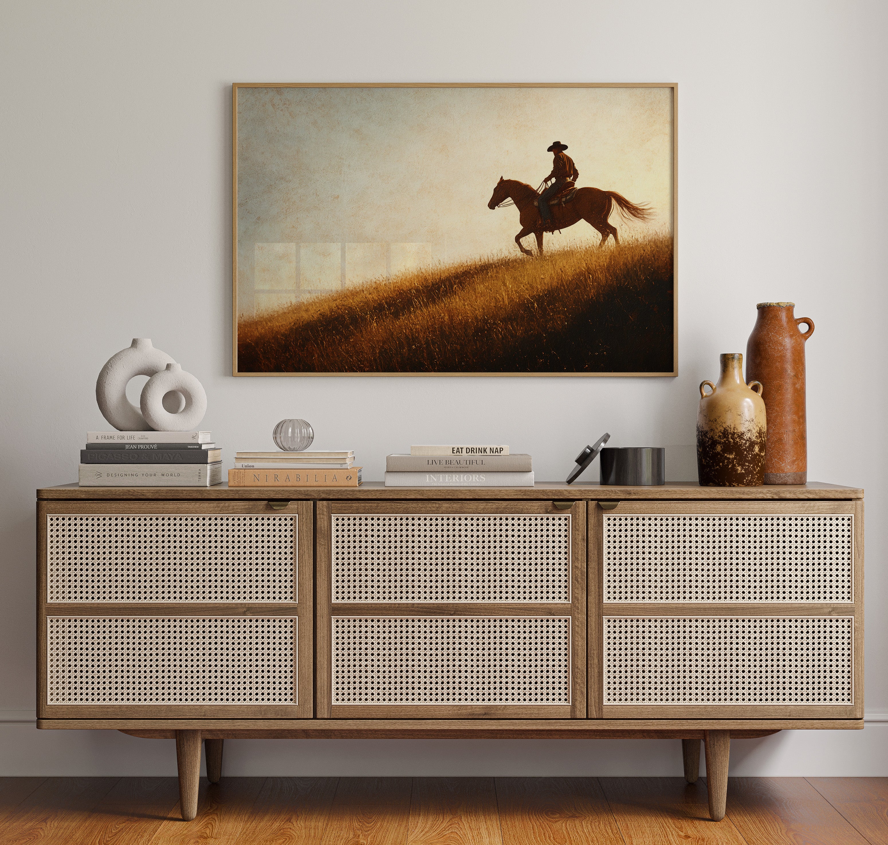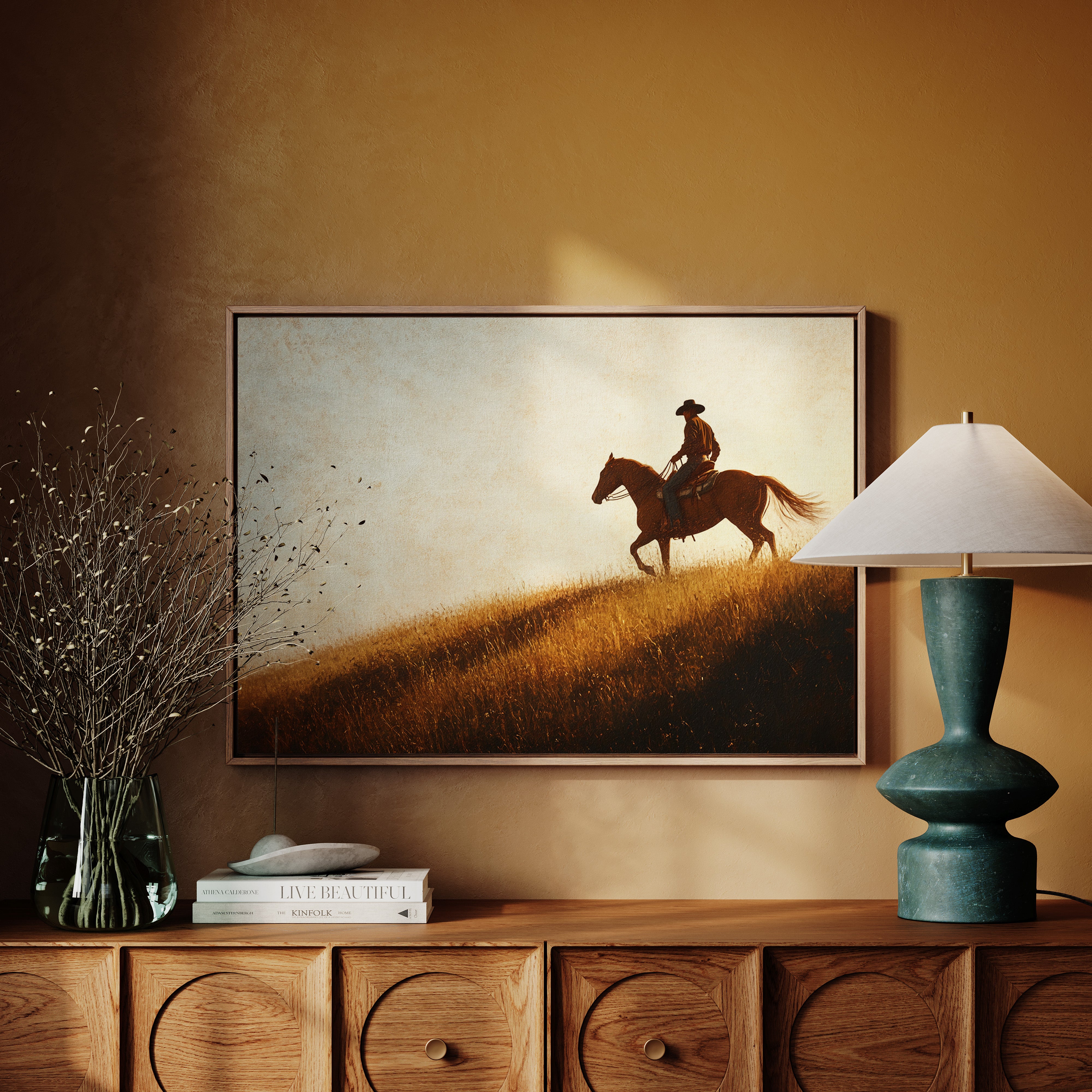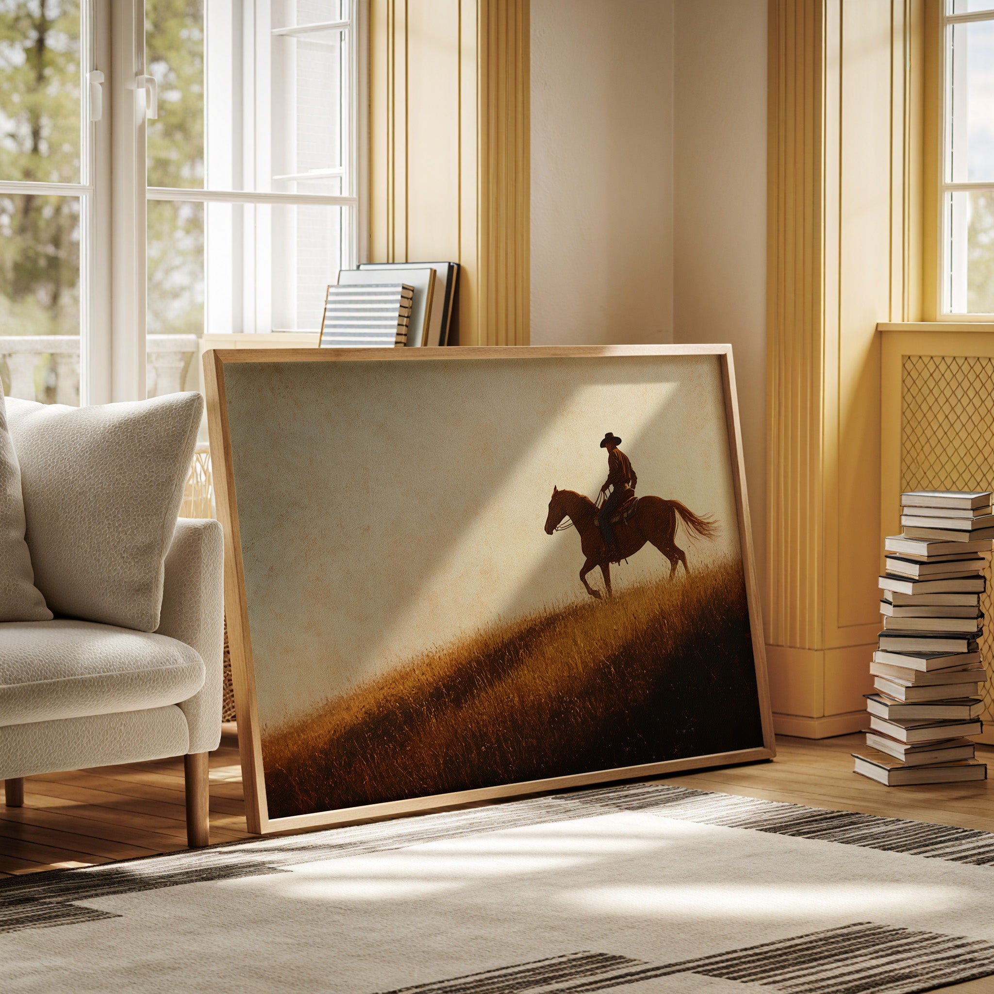 A cowboy rides the ridge in the golden hush of evening, his silhouette glowing against a sky brushed with amber. This painterly piece evokes solitude, freedom, and wide open country.