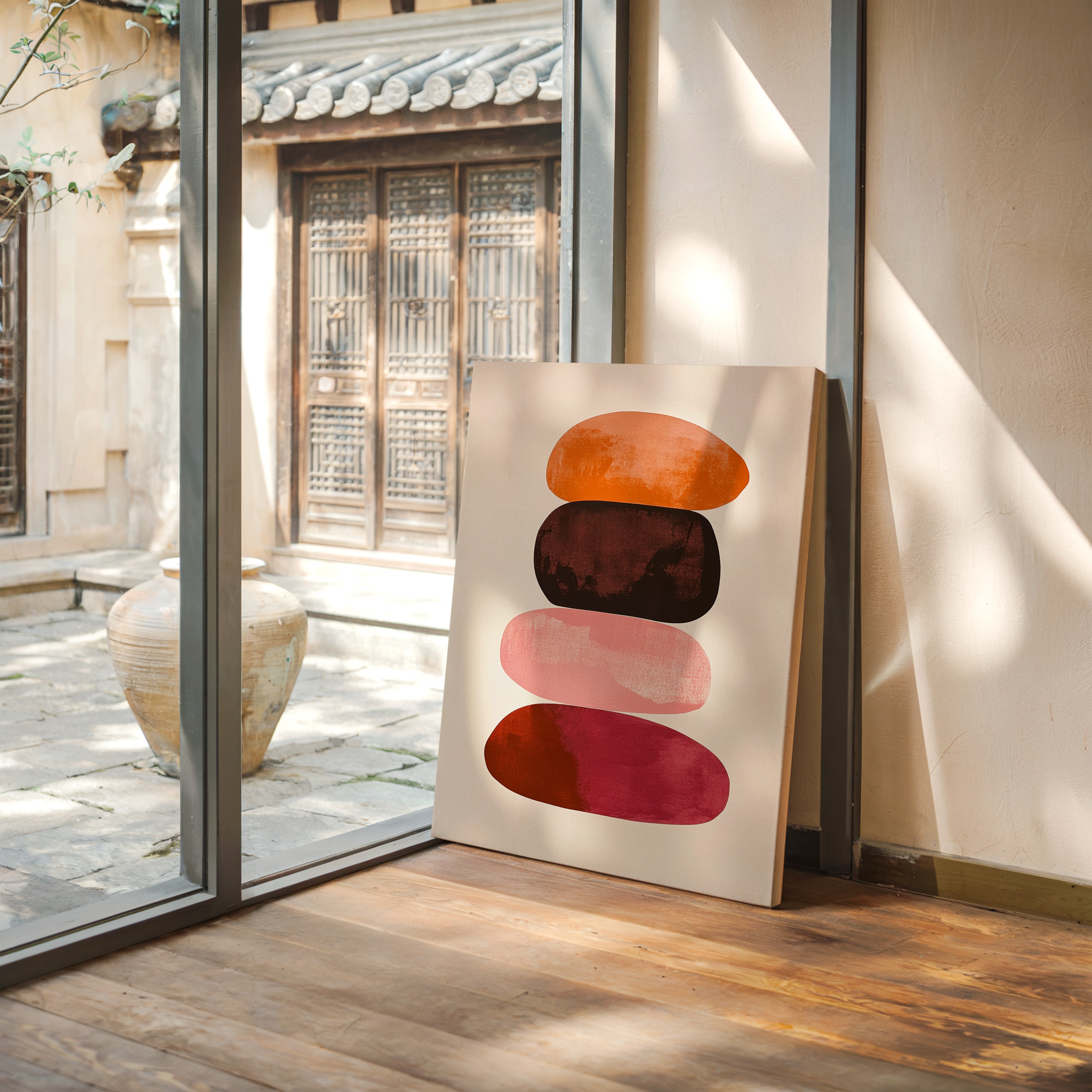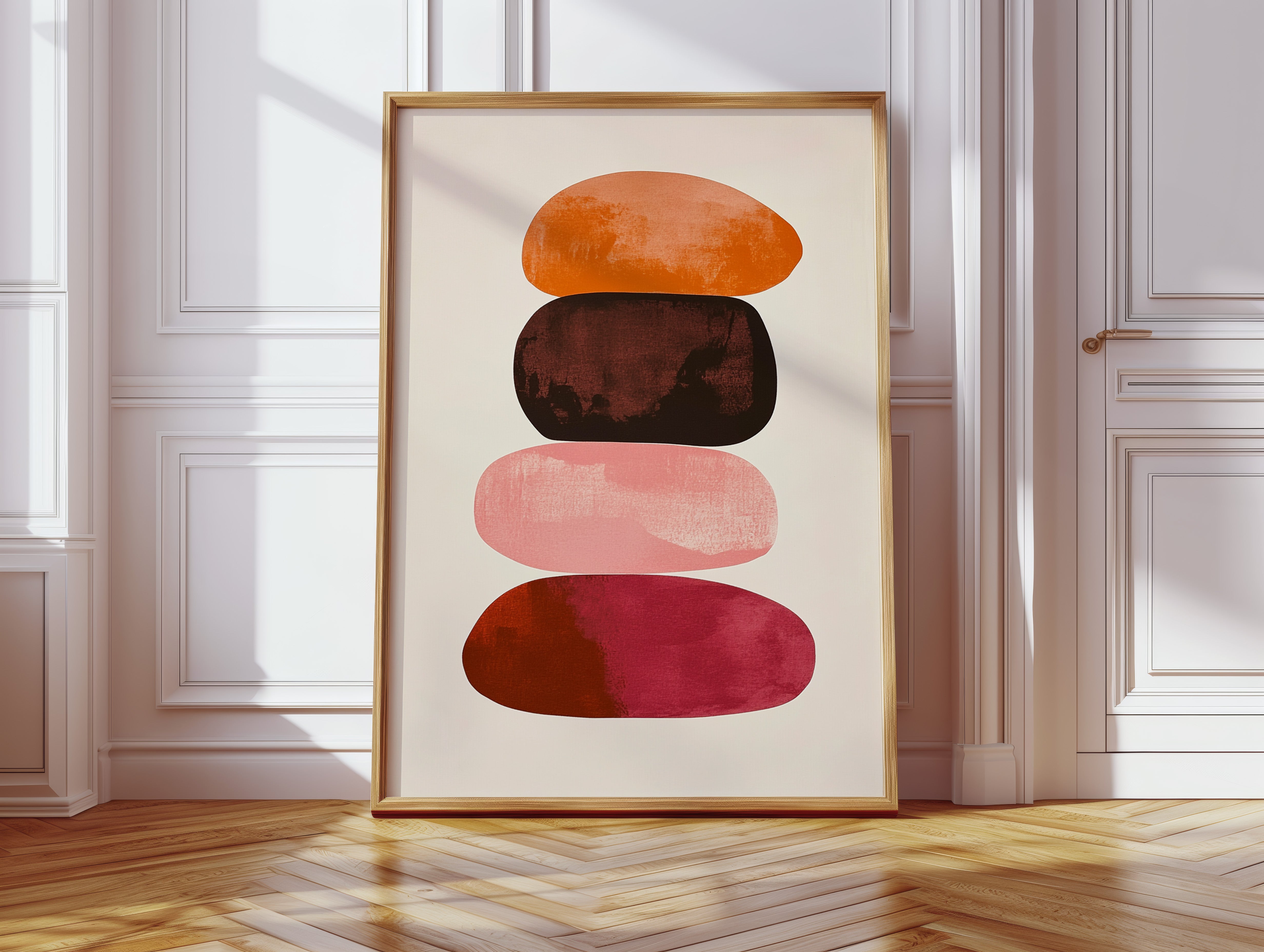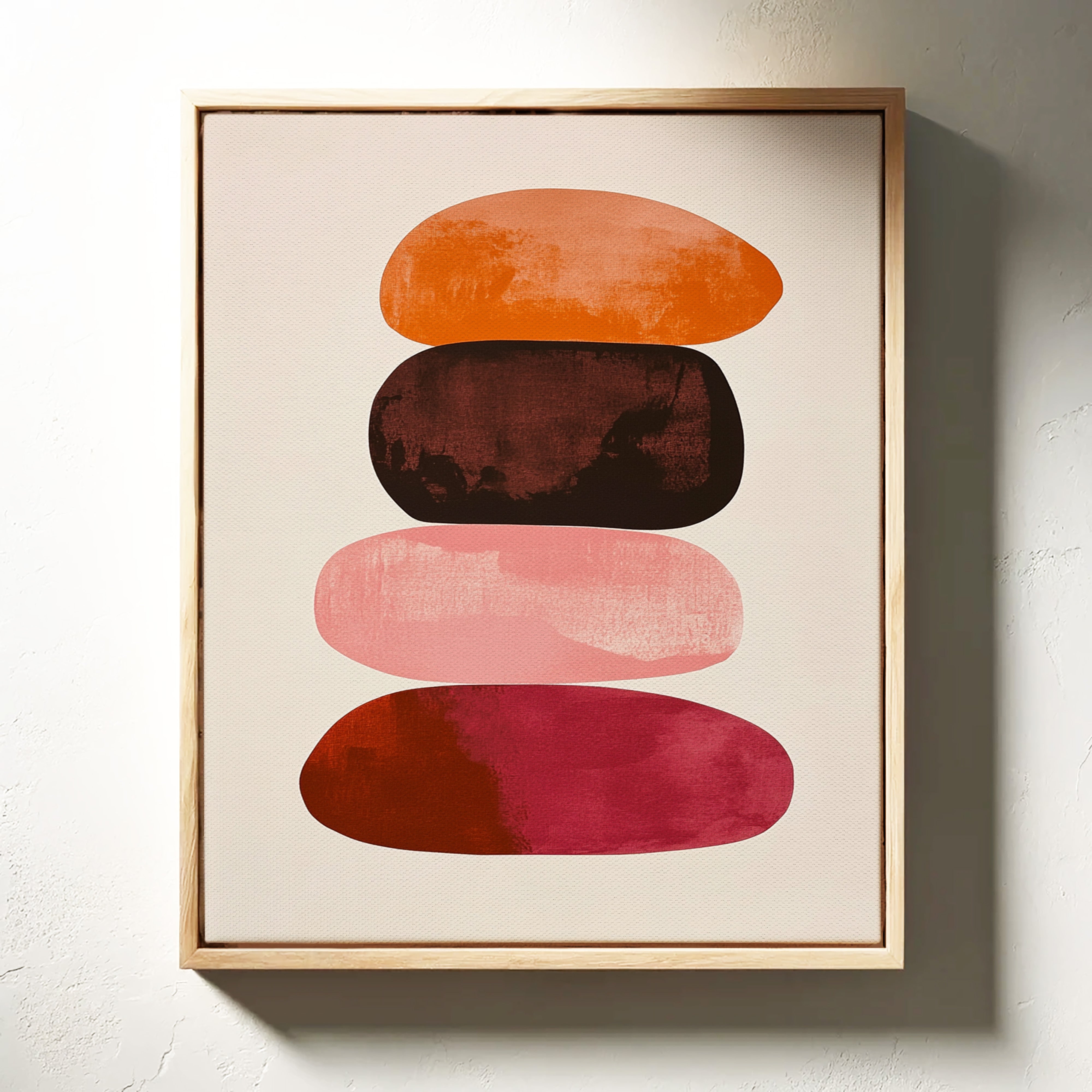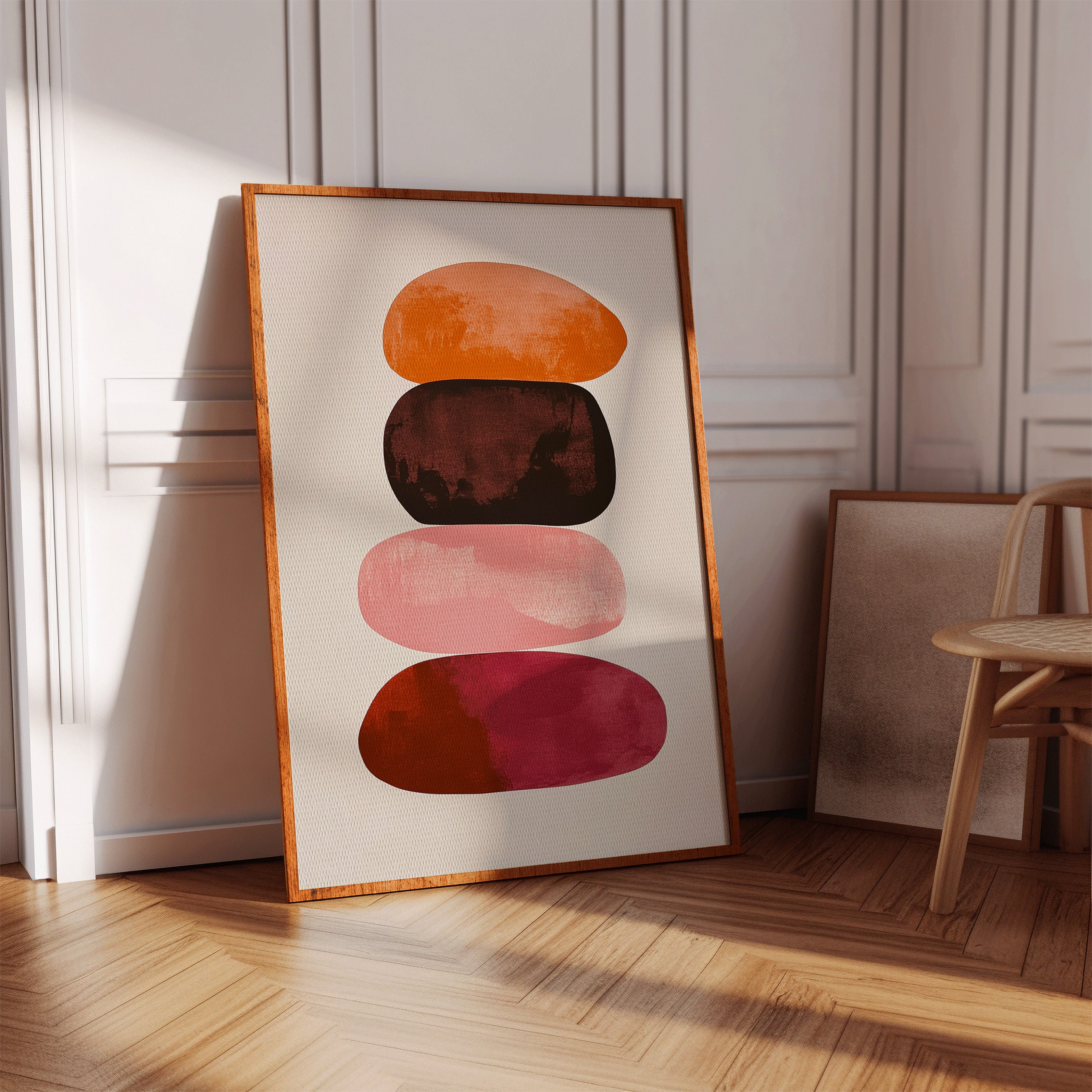 Organic shapes float in perfect balance, each one carrying the warmth of a desert evening. Rich terracotta bleeds into deep burgundy, while soft pink provides a gentle pause between bold hues. The textured edges and watercolor-like gradients create a sense of movement within stillness, like geological formations caught in a moment of peaceful suspension. Perfect for modern spaces seeking both serenity and sophistication, this piece brings warmth and contemplative energy to minimalist dining rooms or meditation spaces.