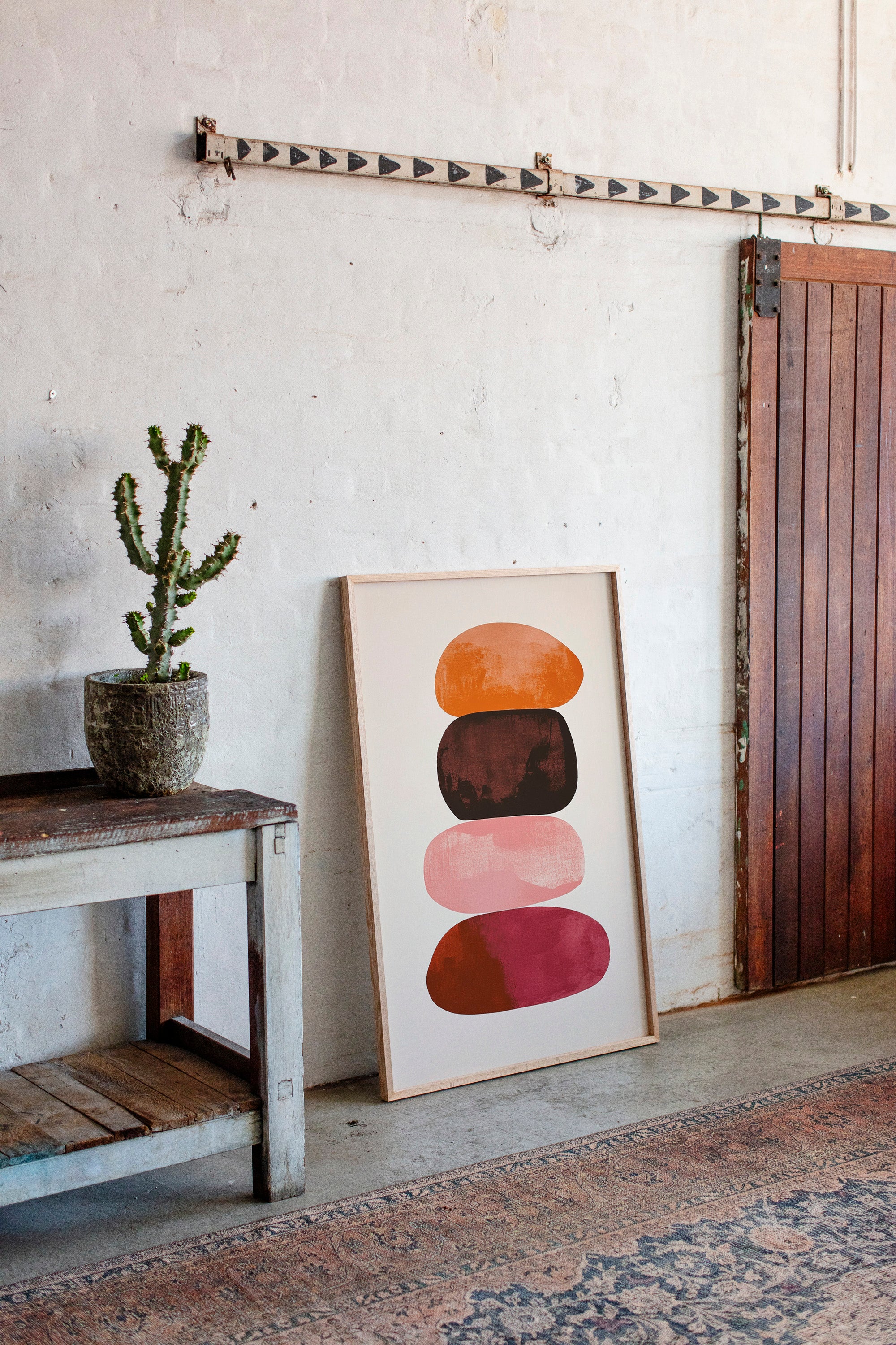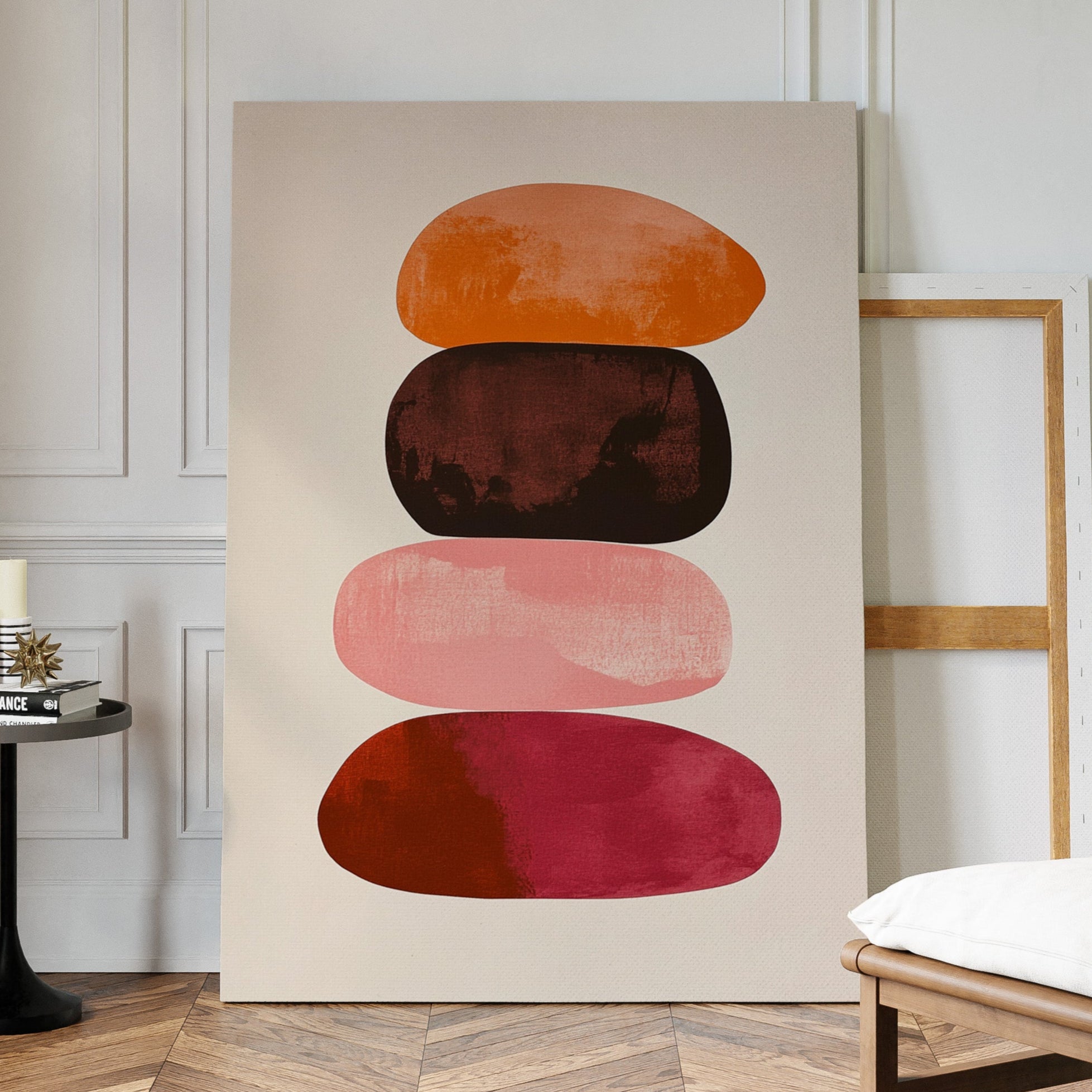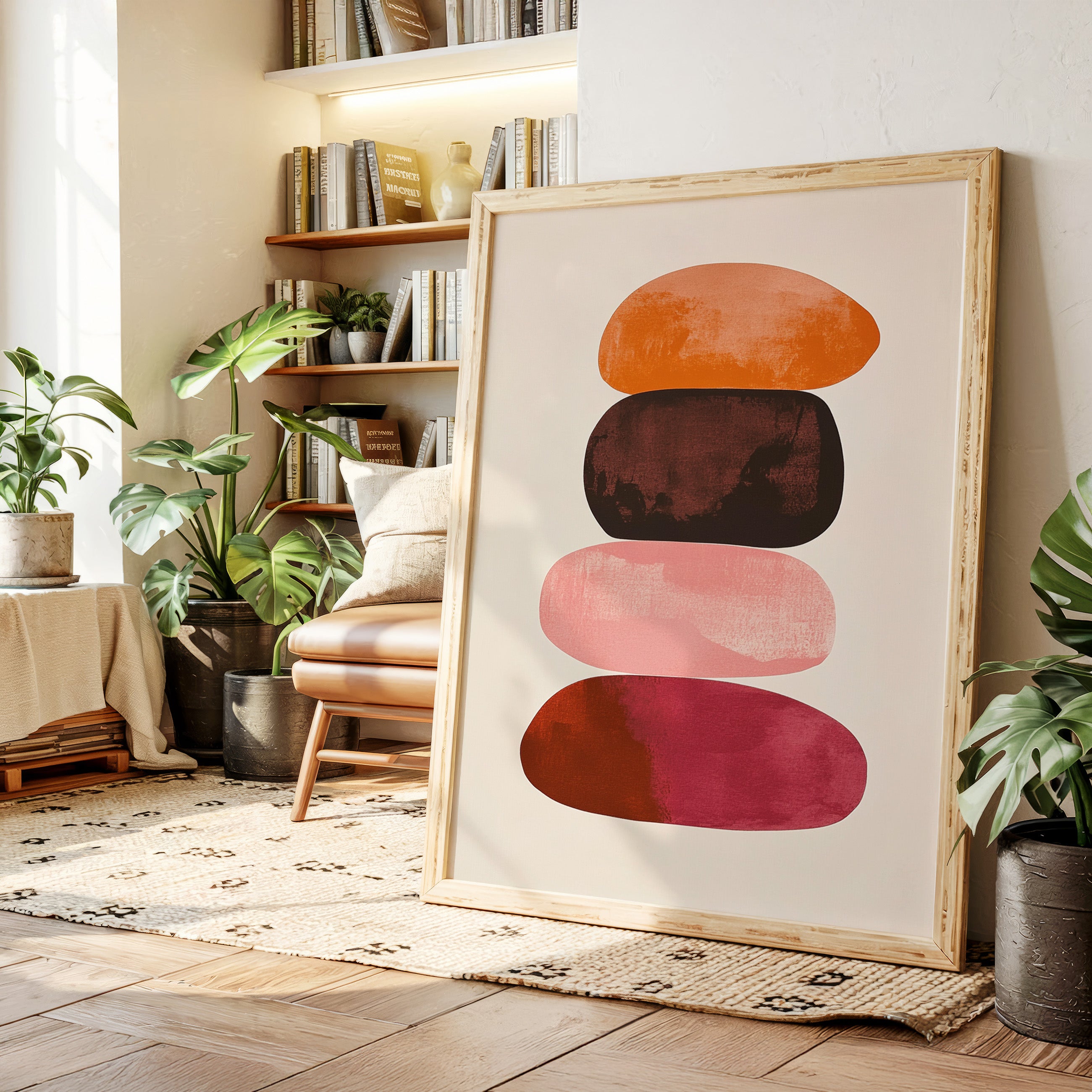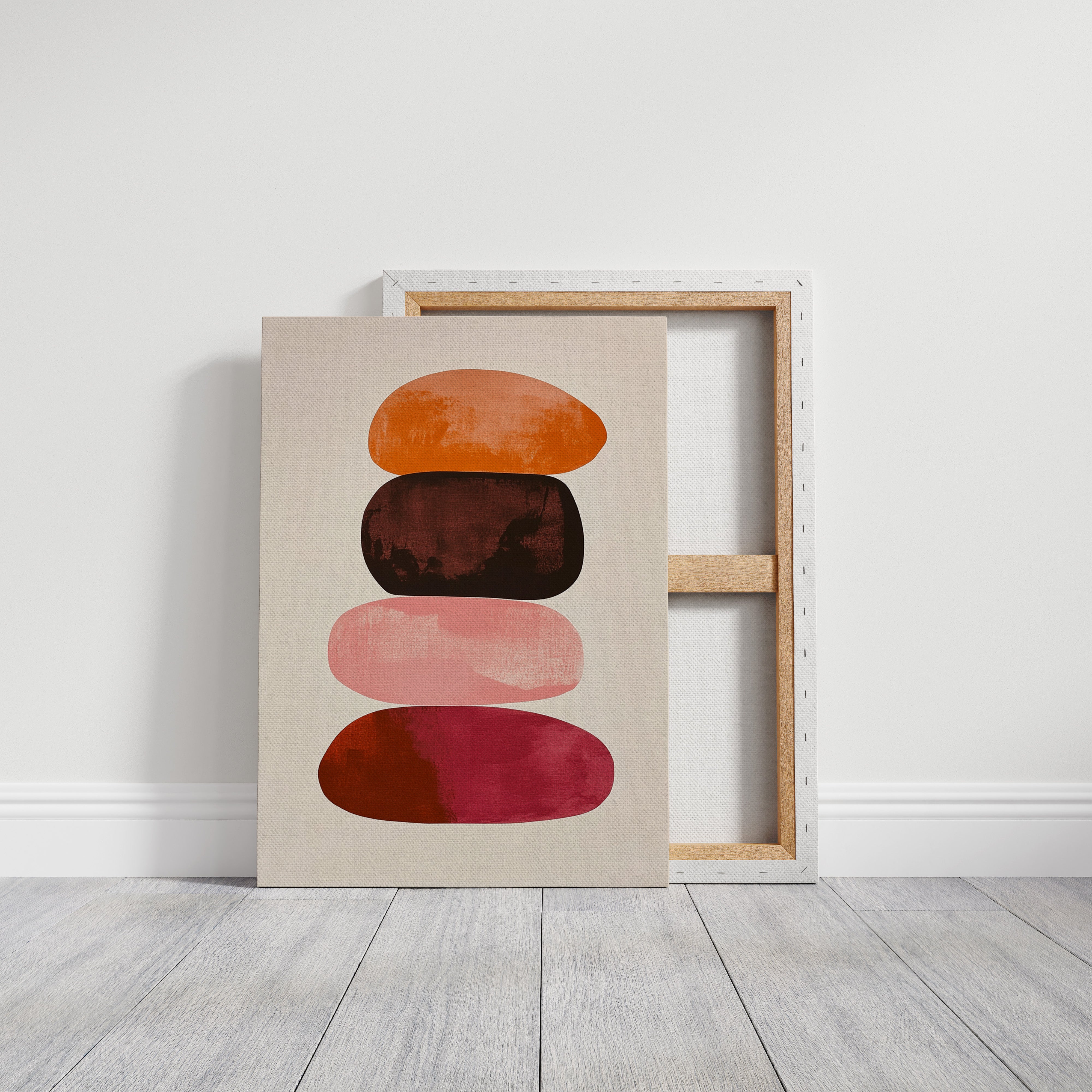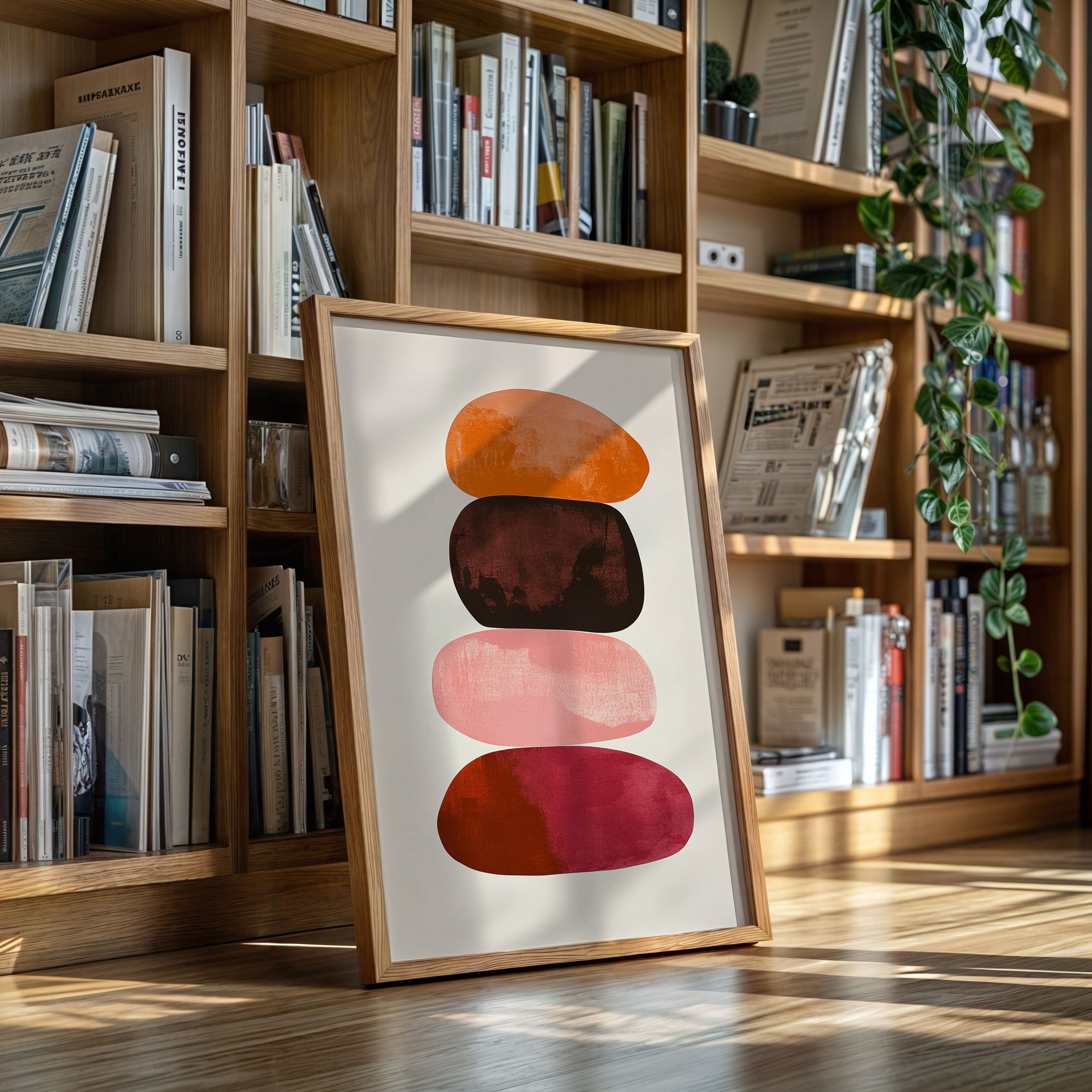 Organic shapes float in perfect balance, each one carrying the warmth of a desert evening. Rich terracotta bleeds into deep burgundy, while soft pink provides a gentle pause between bold hues. The textured edges and watercolor-like gradients create a sense of movement within stillness, like geological formations caught in a moment of peaceful suspension. Perfect for modern spaces seeking both serenity and sophistication, this piece brings warmth and contemplative energy to minimalist dining rooms or meditation spaces.