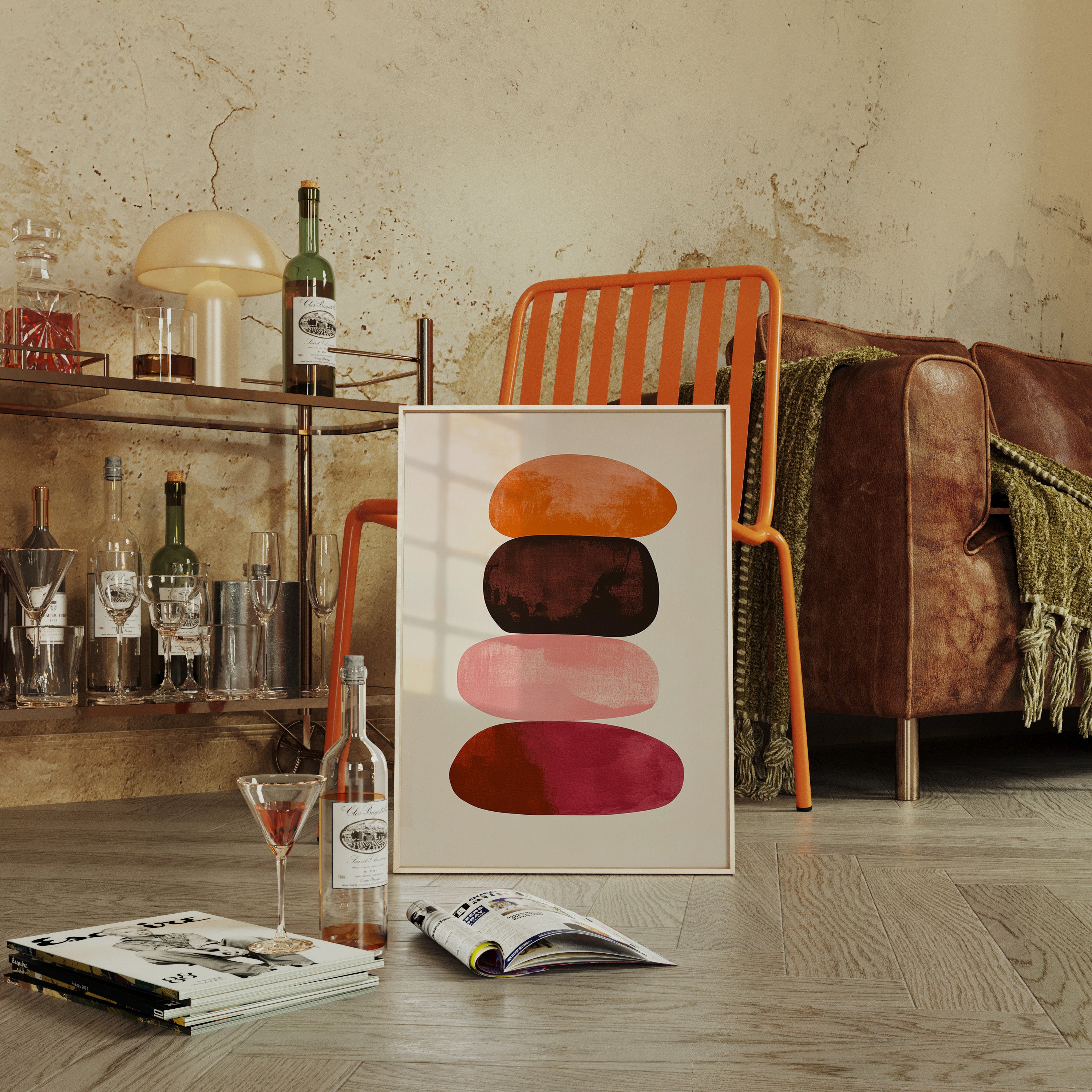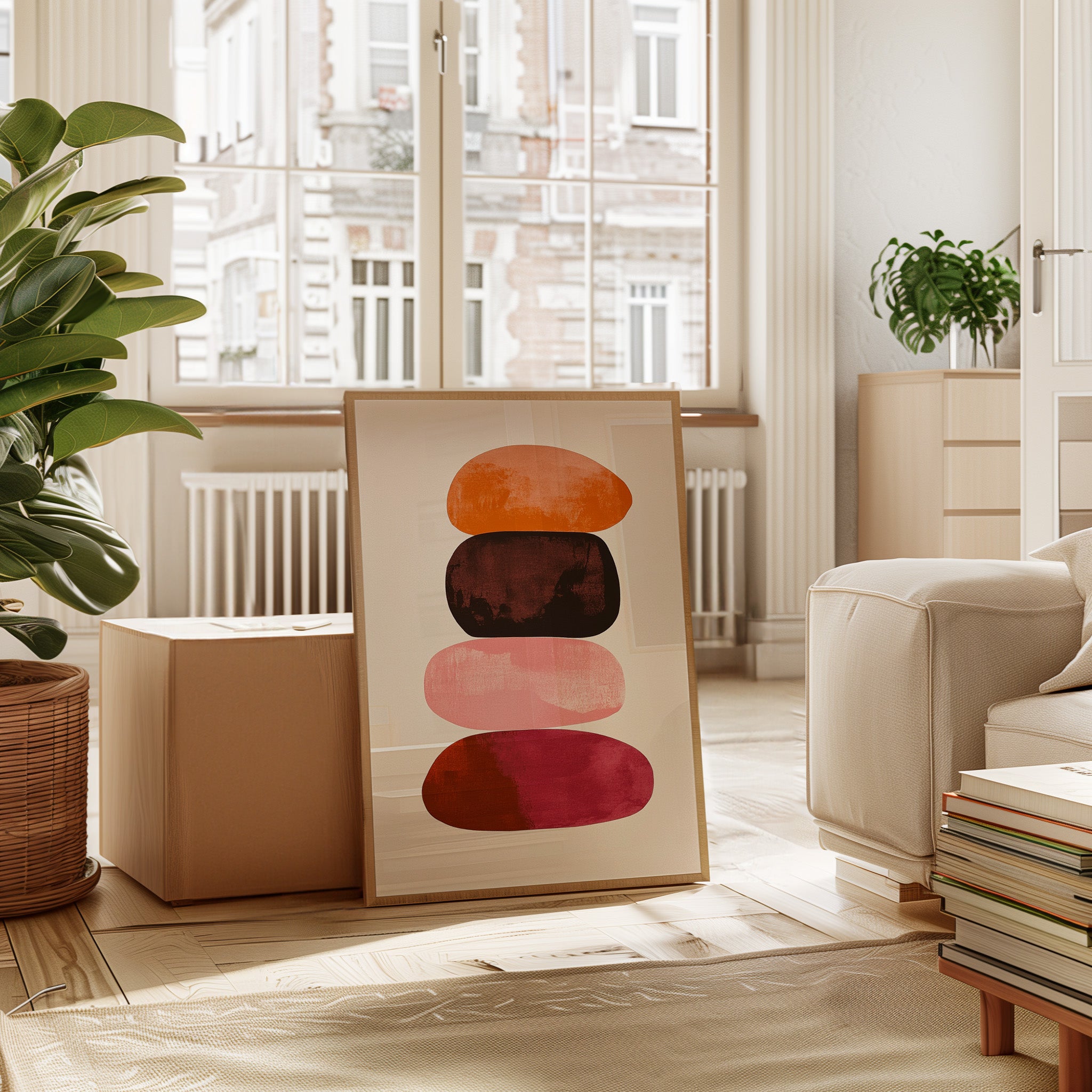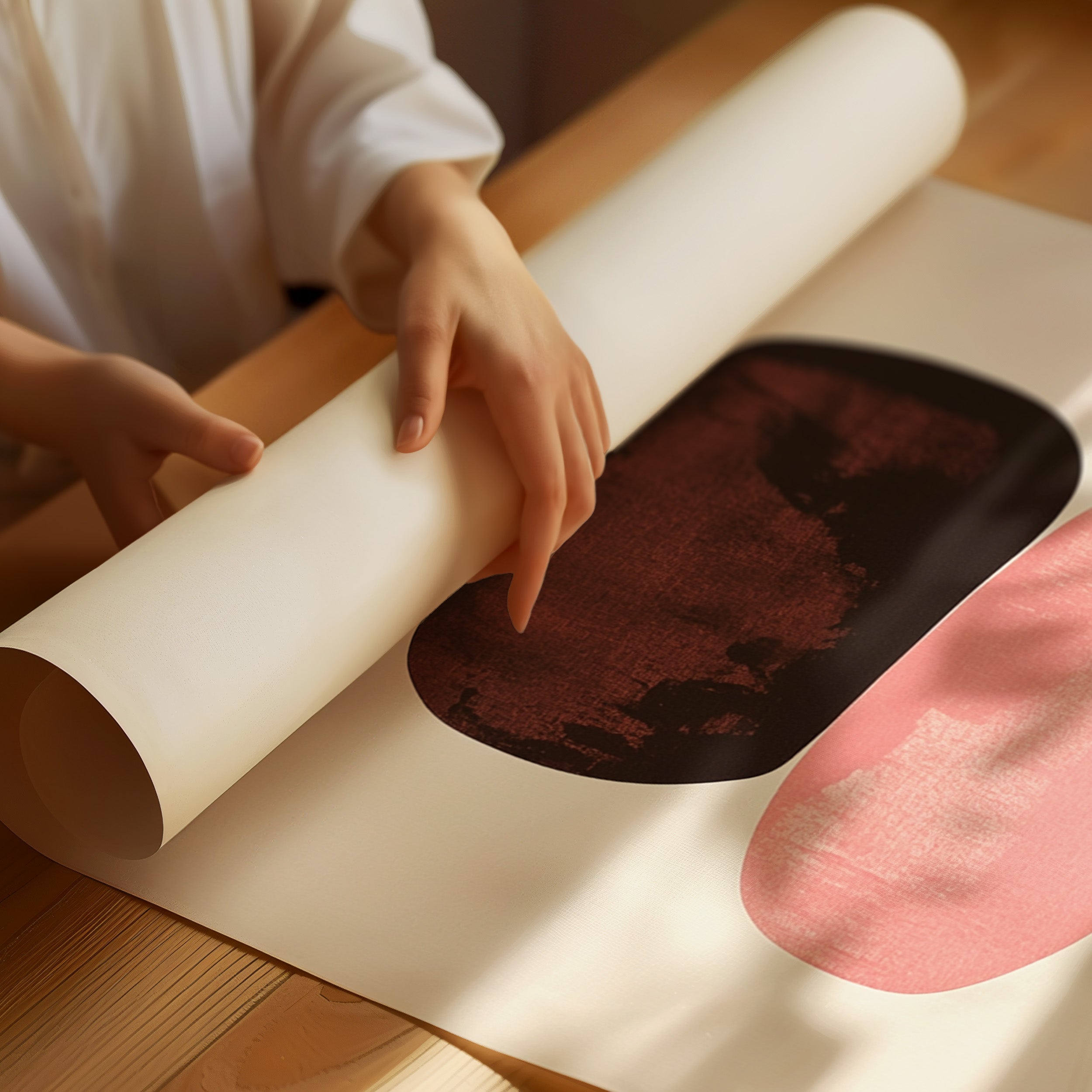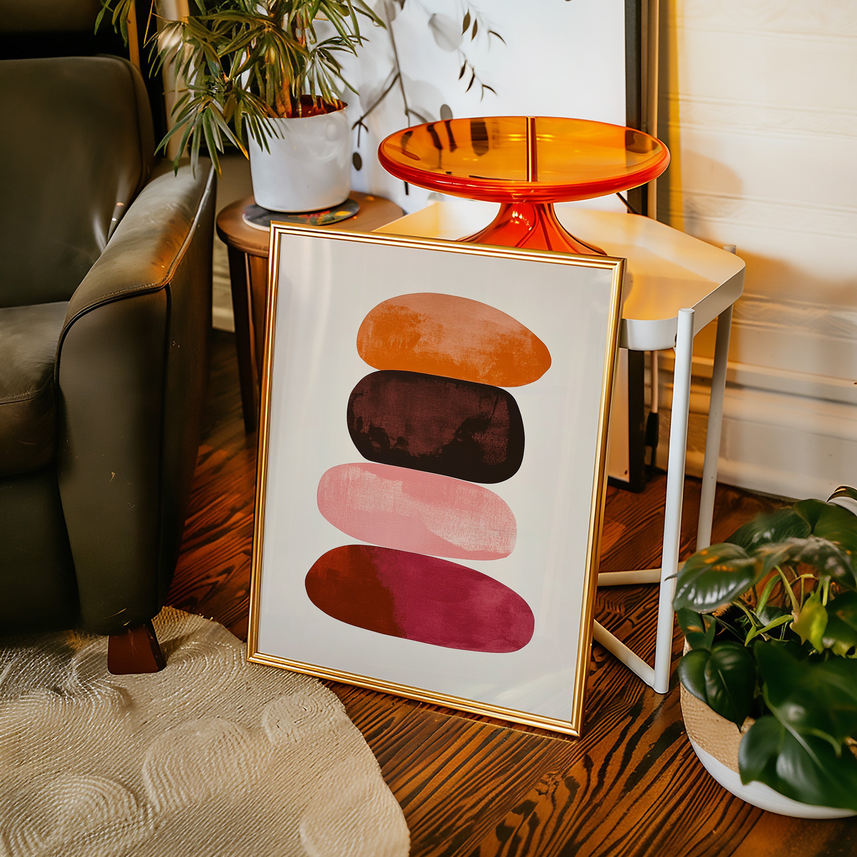 Organic shapes float in perfect balance, each one carrying the warmth of a desert evening. Rich terracotta bleeds into deep burgundy, while soft pink provides a gentle pause between bold hues. The textured edges and watercolor-like gradients create a sense of movement within stillness, like geological formations caught in a moment of peaceful suspension. Perfect for modern spaces seeking both serenity and sophistication, this piece brings warmth and contemplative energy to minimalist dining rooms or meditation spaces.