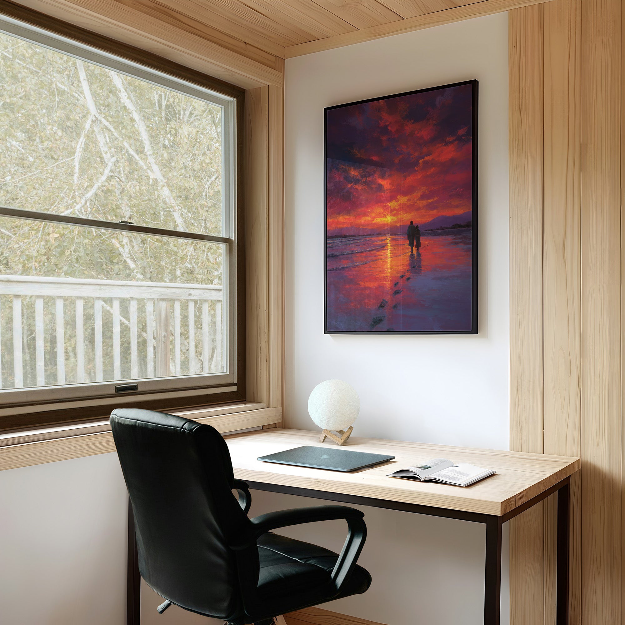 The sky bleeds into the ocean, painting everything in passionate shades of crimson and violet. Two silhouettes traverse the wet sand, their footprints trailing behind like memories refusing to fade. The dramatic interplay of fiery clouds reflects perfectly on the shoreline, creating a mirror world where heaven and earth converge in spectacular harmony. This piece invites viewers to imagine themselves walking into that moment of perfect tranquility and awe.