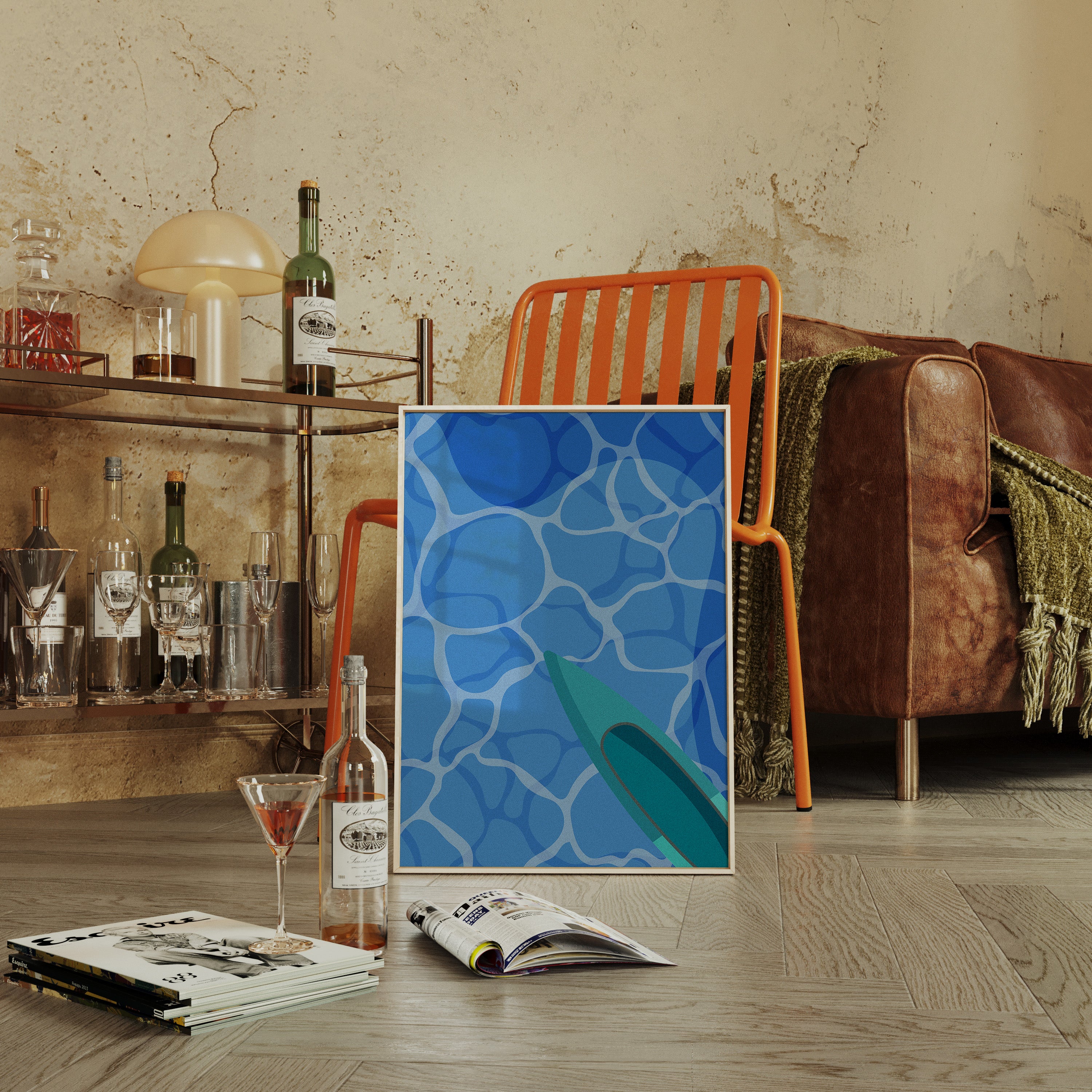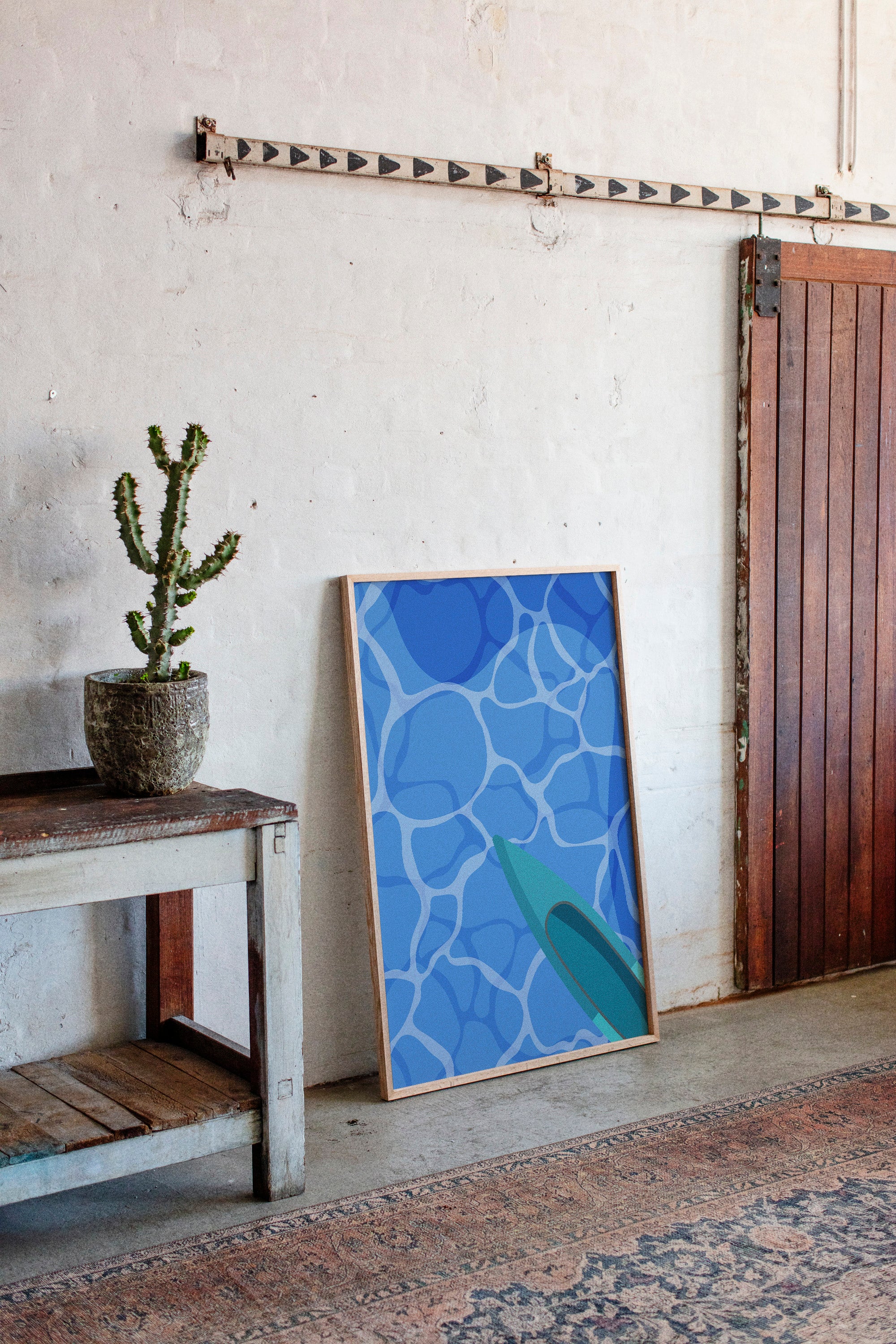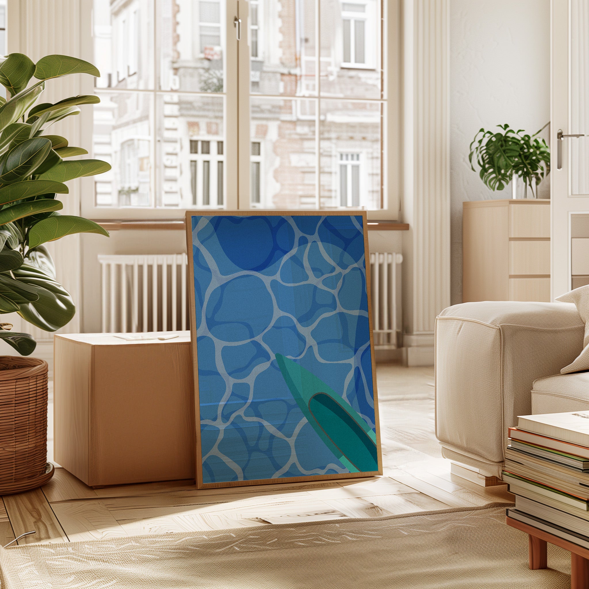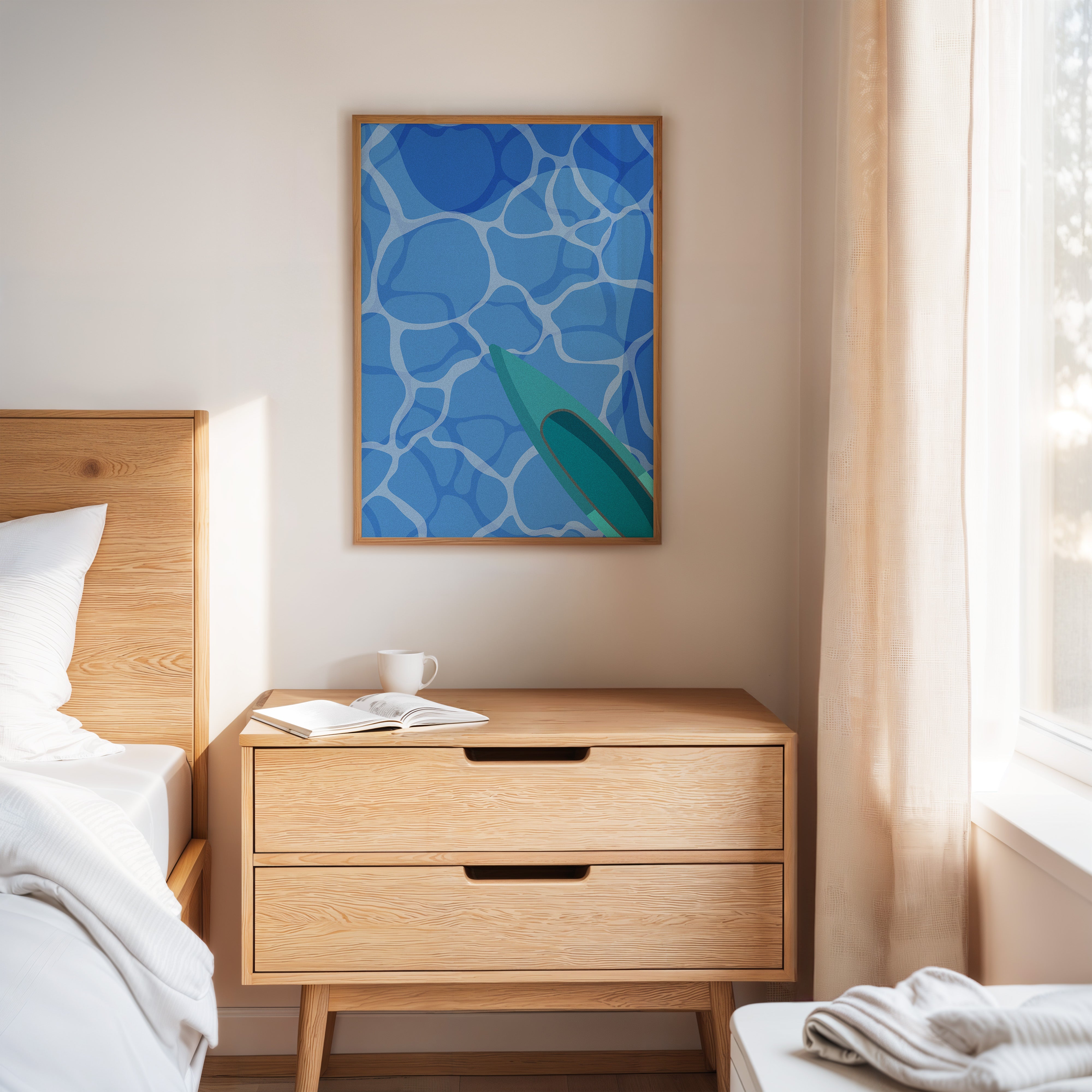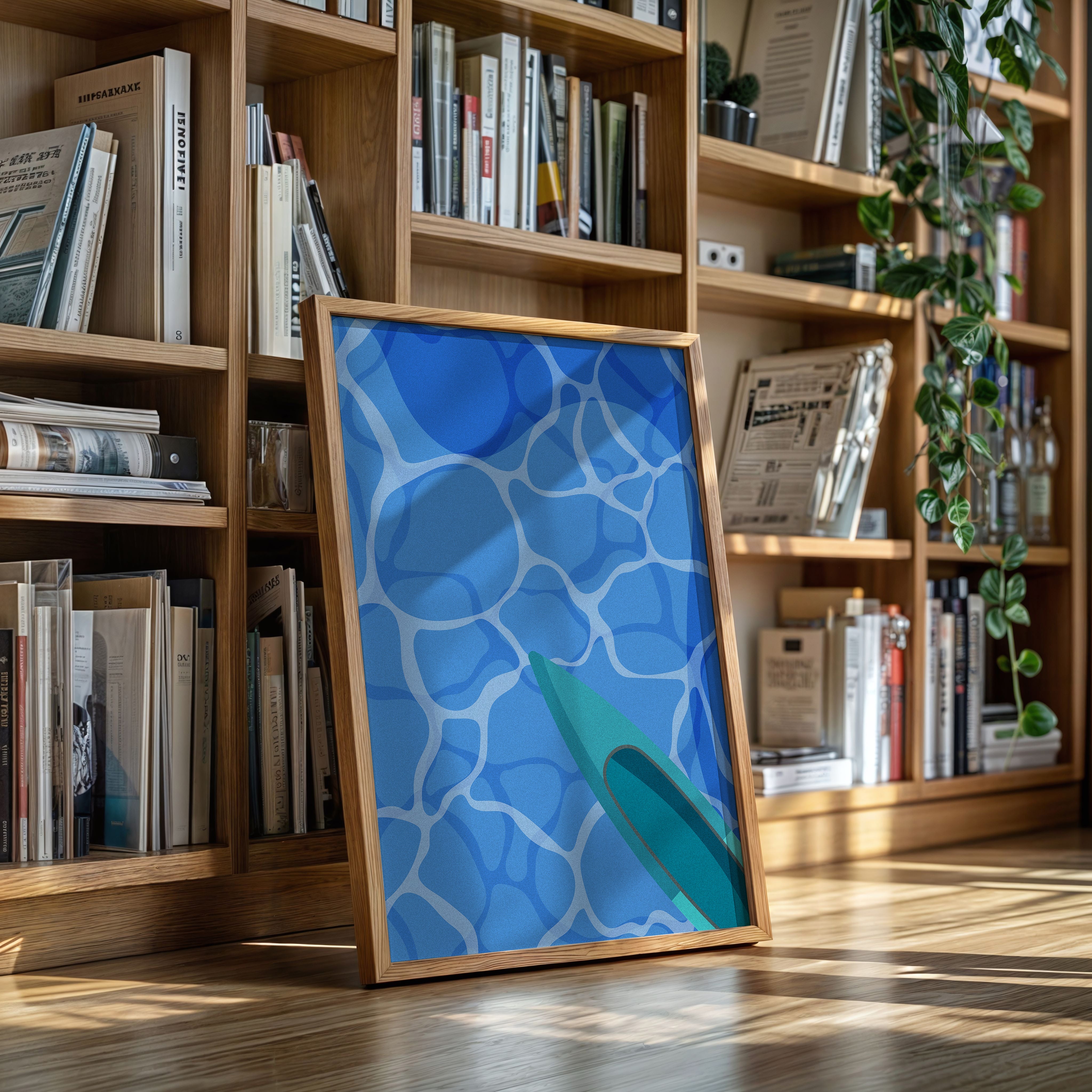 Light dances across rippling pool waters, creating a mesmerizing pattern of azure geometries above and below the surface. This piece from our Contemporary collection captures the essence of summer's most refreshing moments. The composition plays with perspective, showing a teal surfboard cutting through crystalline blue waters, creating an abstract interplay of shapes and reflections. The minimalist approach transforms an everyday scene into a meditation on form and movement. Perfect for bringing a sense of cool serenity to modern living spaces, especially in rooms that welcome morning light.