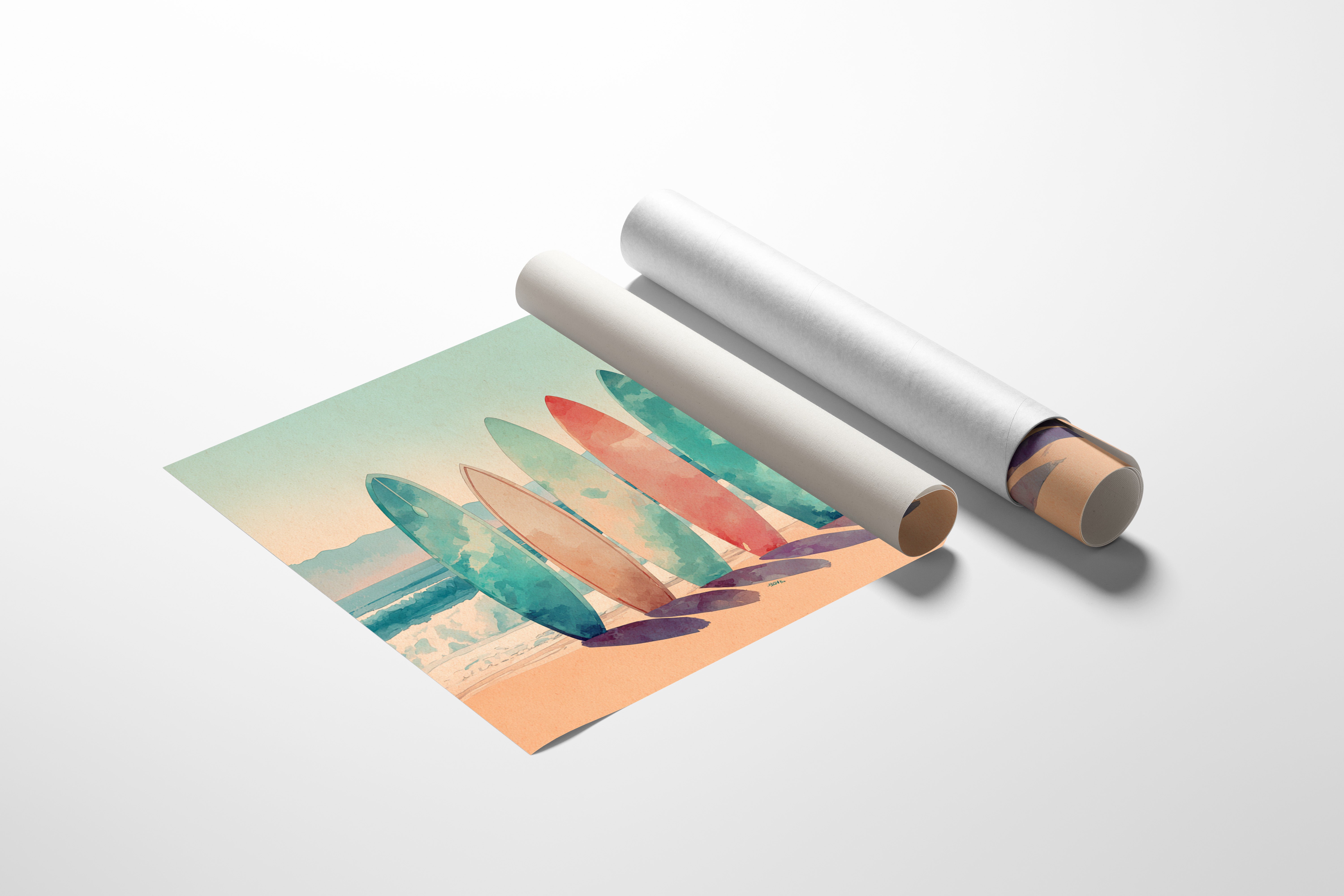 Like sentinels at sunset, a lineup of surfboards stands against the backdrop of rolling waves, each one telling its own watercolor tale. The boards create a mesmerizing palette of turquoise, coral, and soft mint, their colors melting together like sea glass caught in the evening light. Gentle shadows stretch across golden sand, while the ocean beyond dances with white-capped waves against a dreamy pastel sky. This piece brings the laid-back luxury of coastal living into any space, perfect for creating a serene retreat in a beach house bedroom or adding a touch of summer to a modern living area.