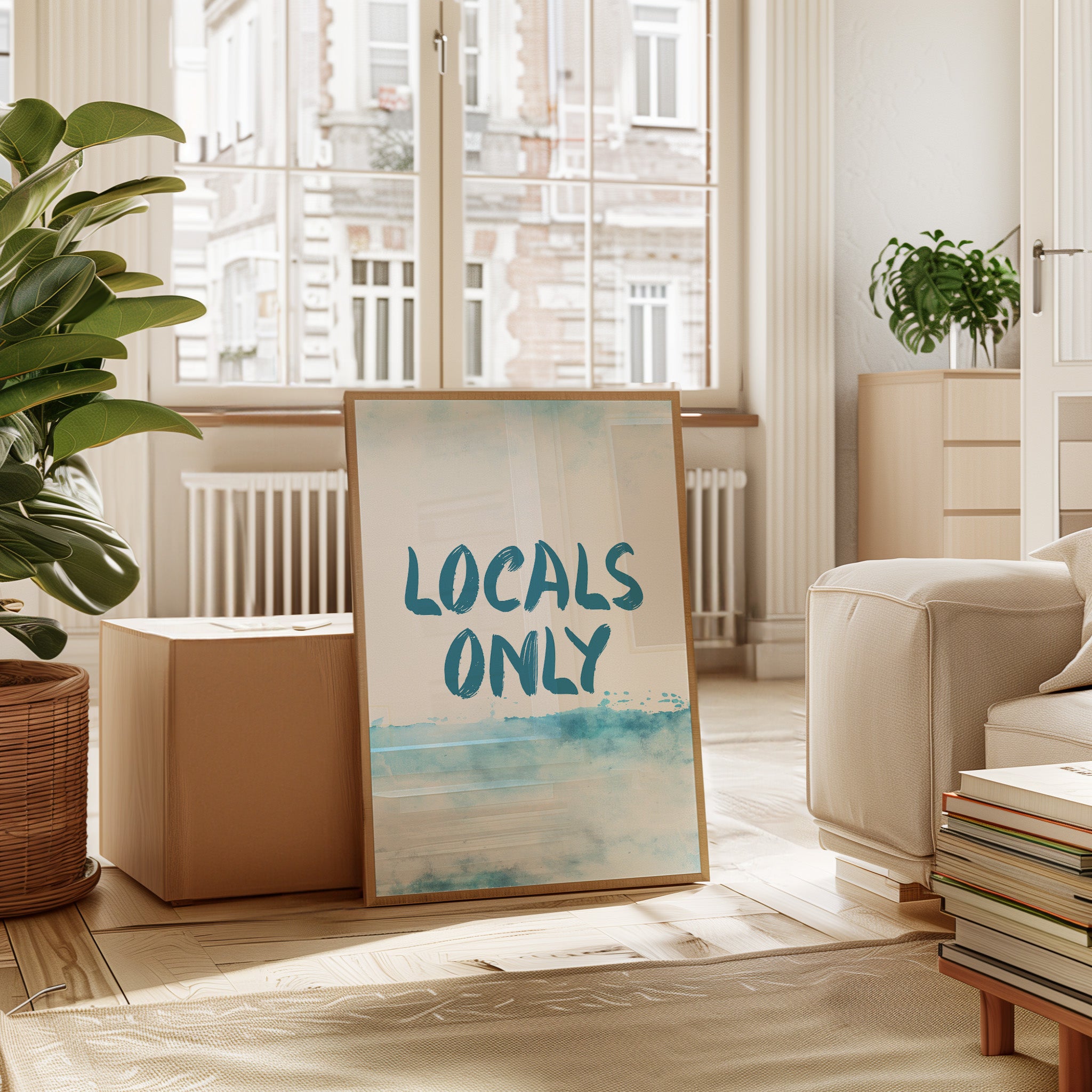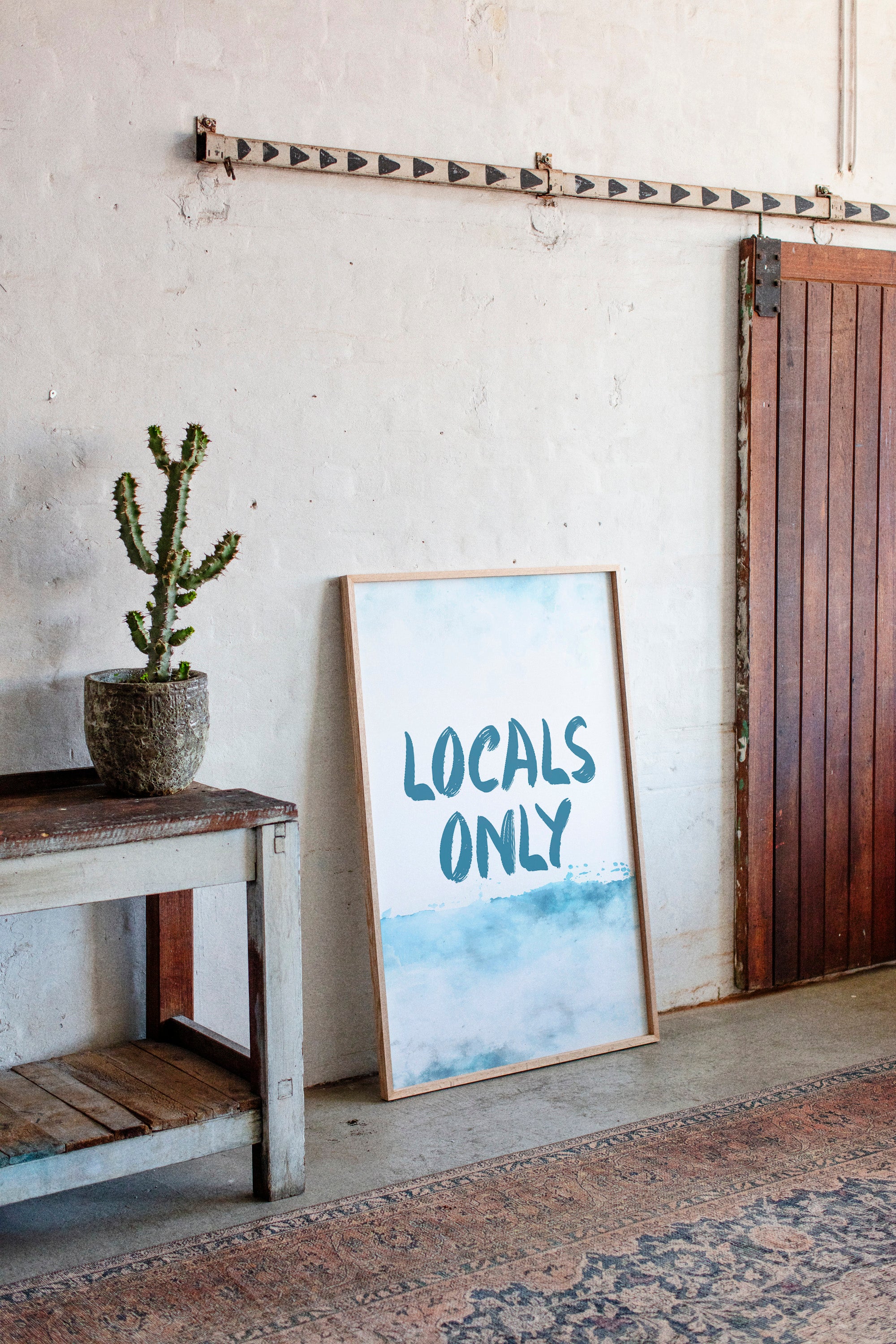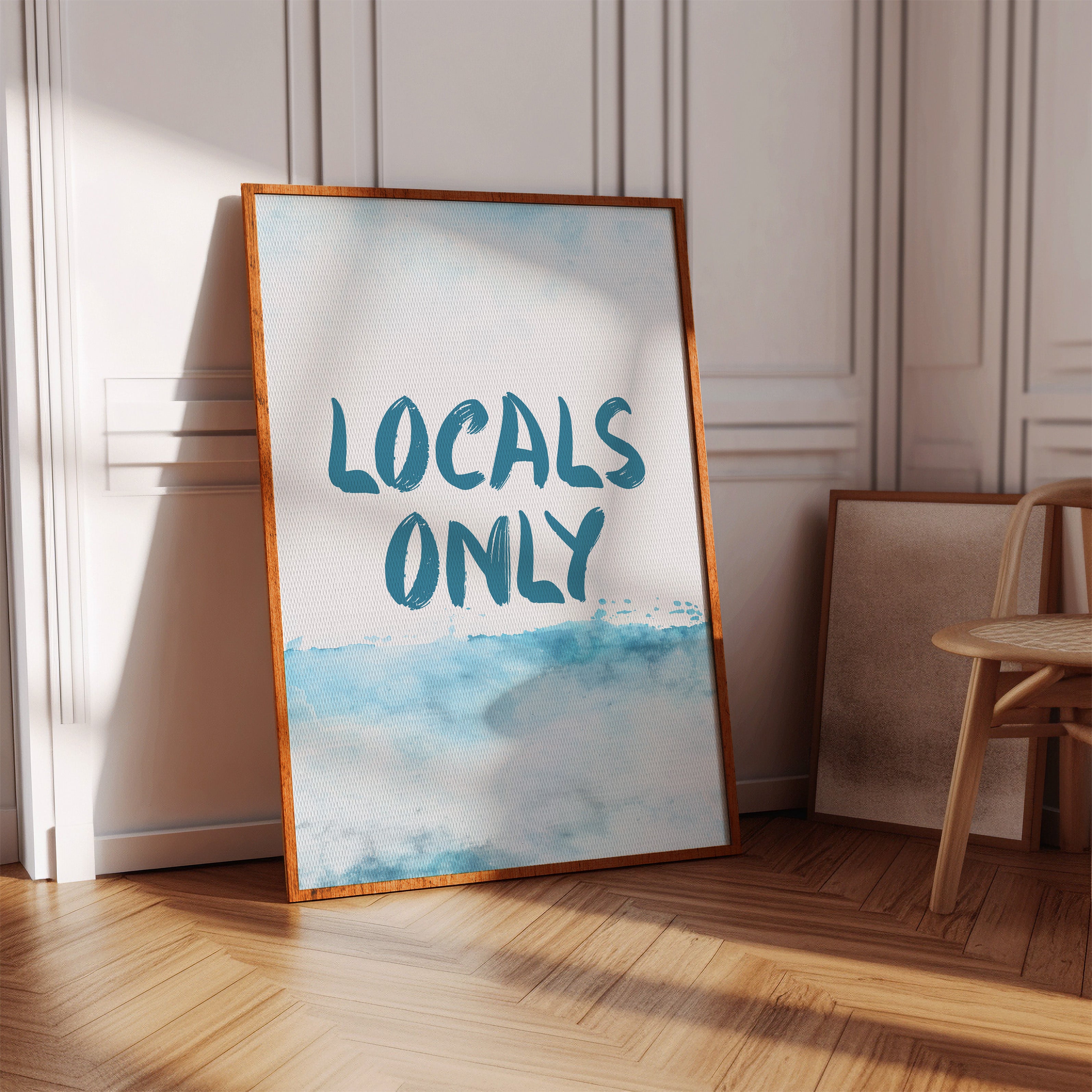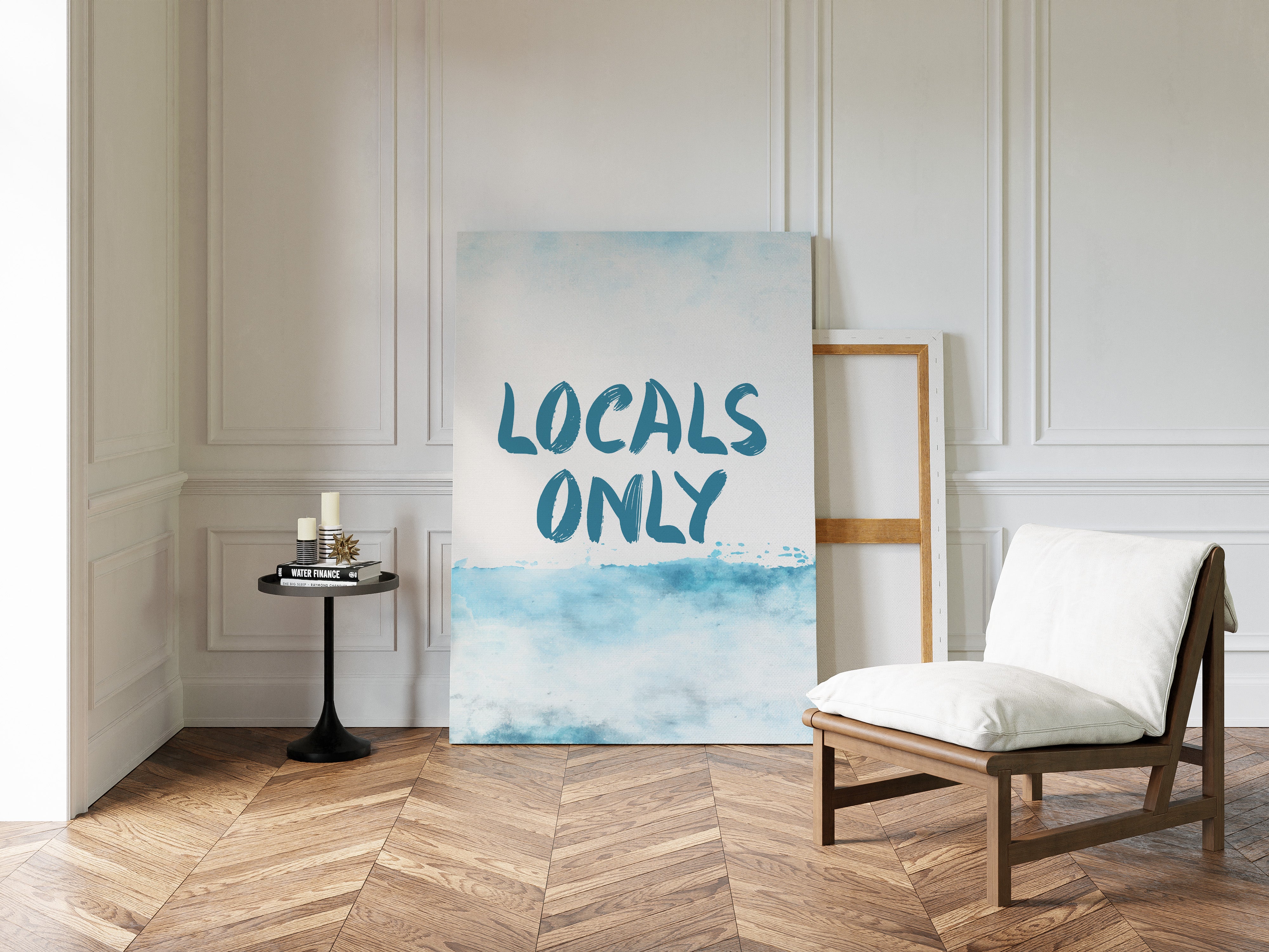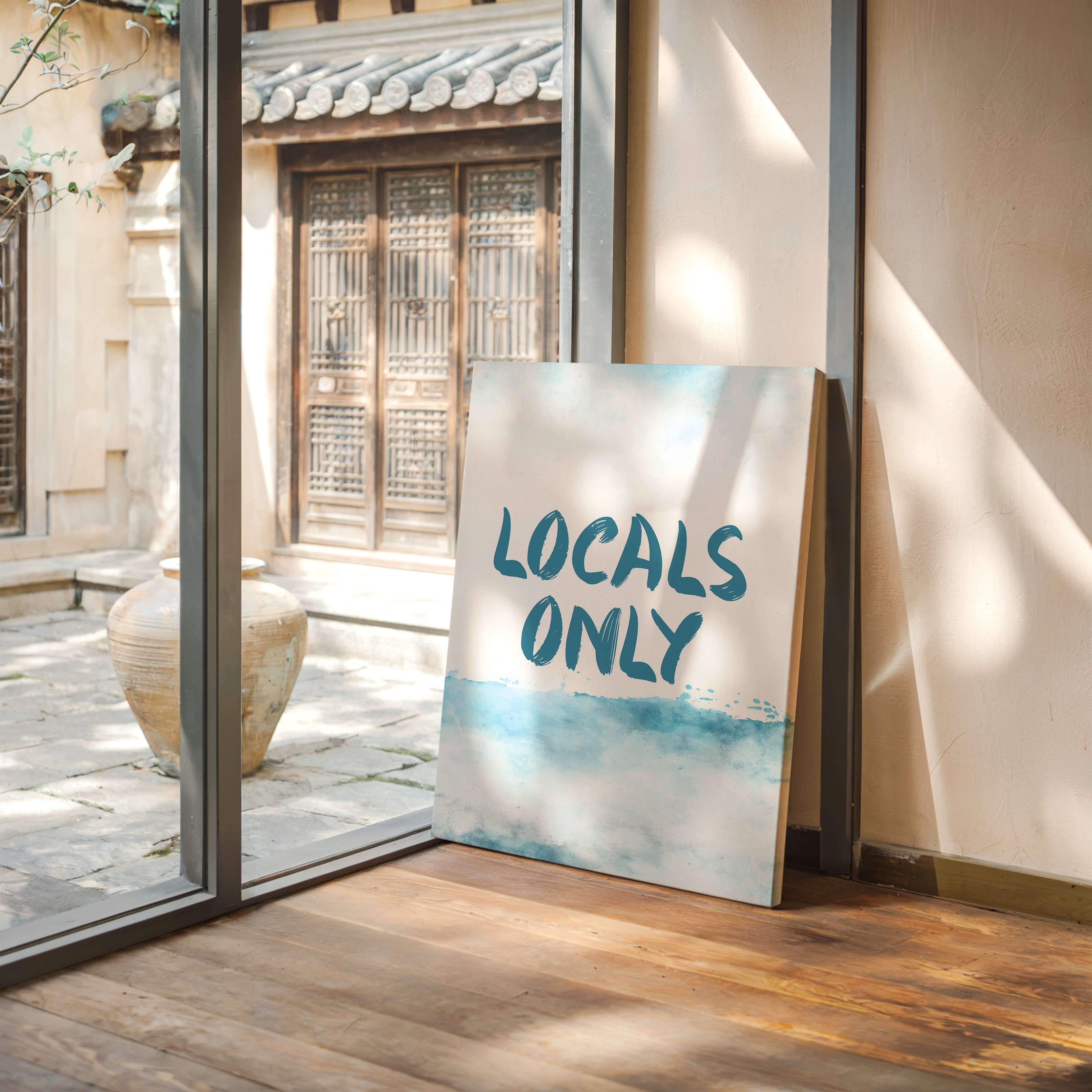 Morning light spills across turquoise letters that hold the casual confidence of a local's favorite hideaway. This contemporary piece captures the playful exclusivity of beach culture with bold brush strokes and oceanic hues. The watercolor wash beneath the text flows like gentle waves, while the assertive typography stands proud against pristine white space - a visual declaration of belonging. Perfect for bringing coastal charm to modern spaces, this piece speaks to anyone who's ever had a cherished local haunt. Its clean aesthetic and touch of attitude make it an ideal accent for a beach house kitchen or urban apartment that dreams of salt air.