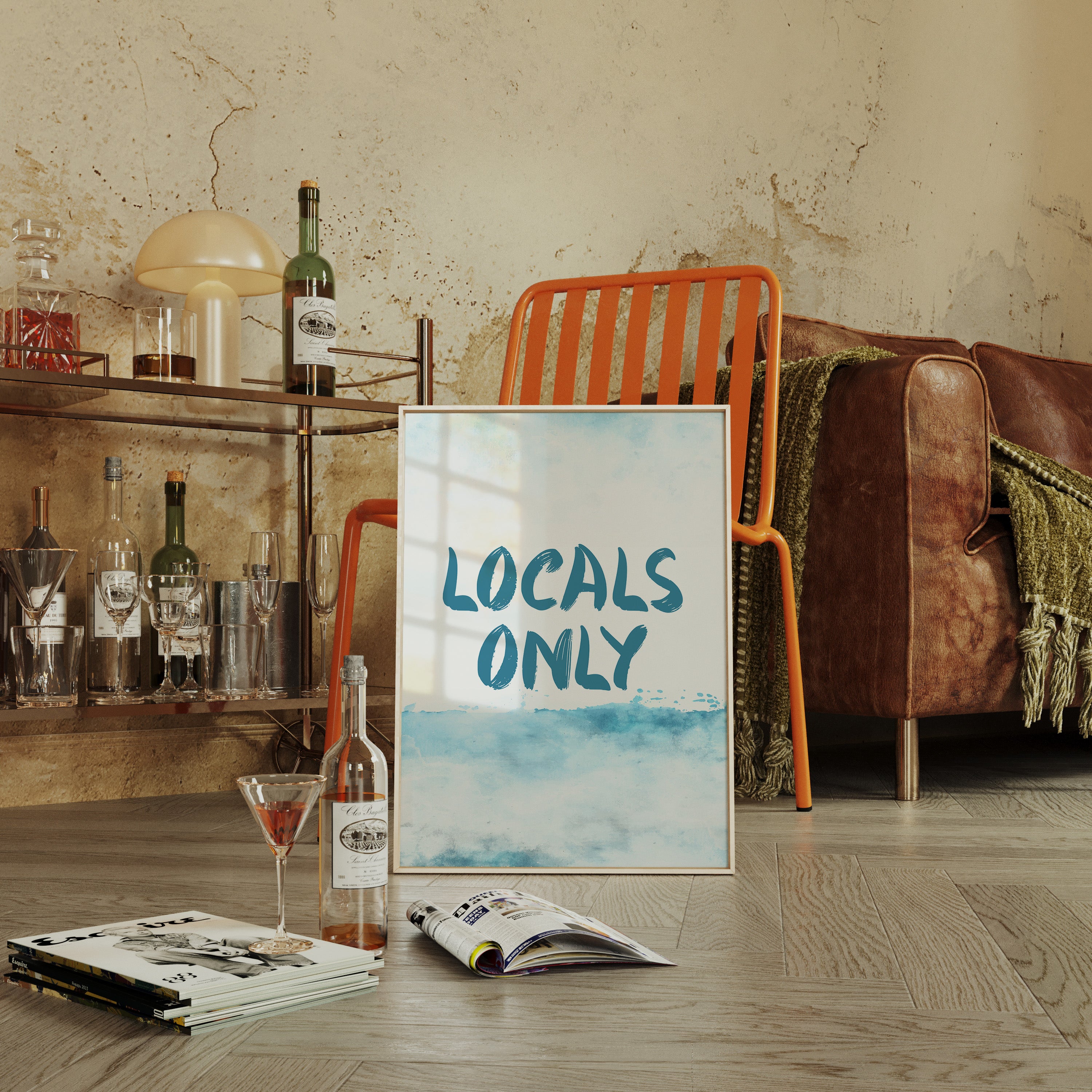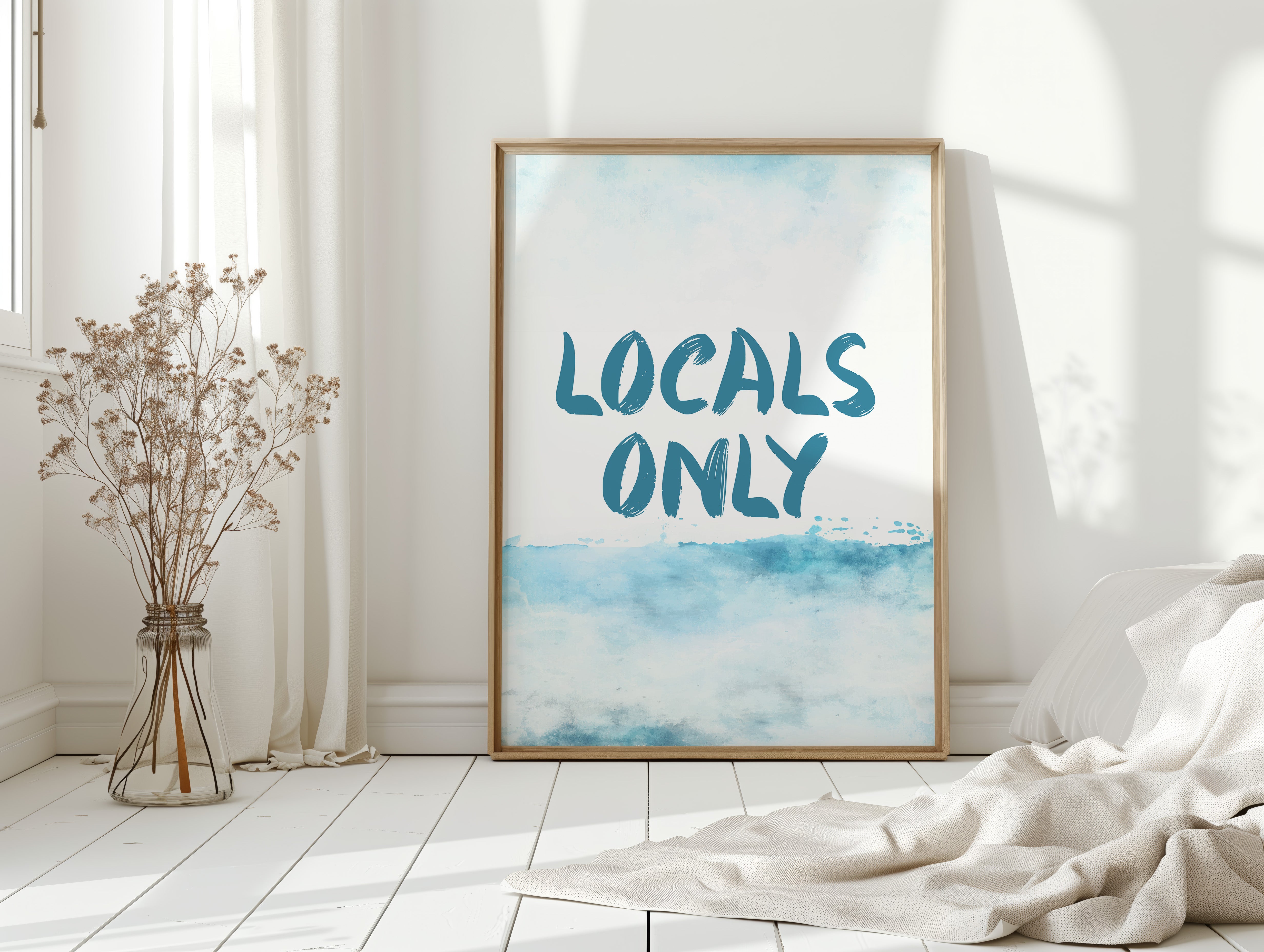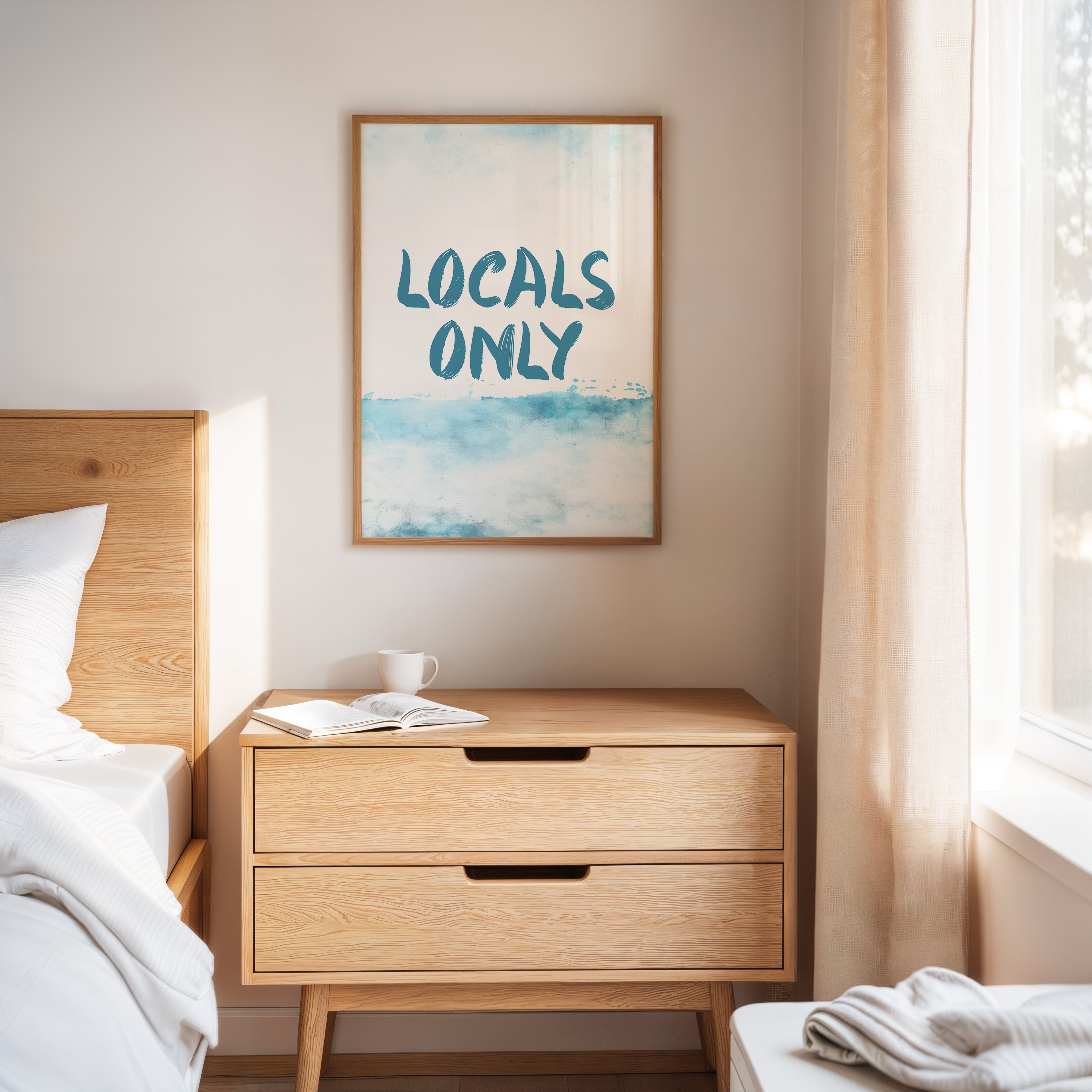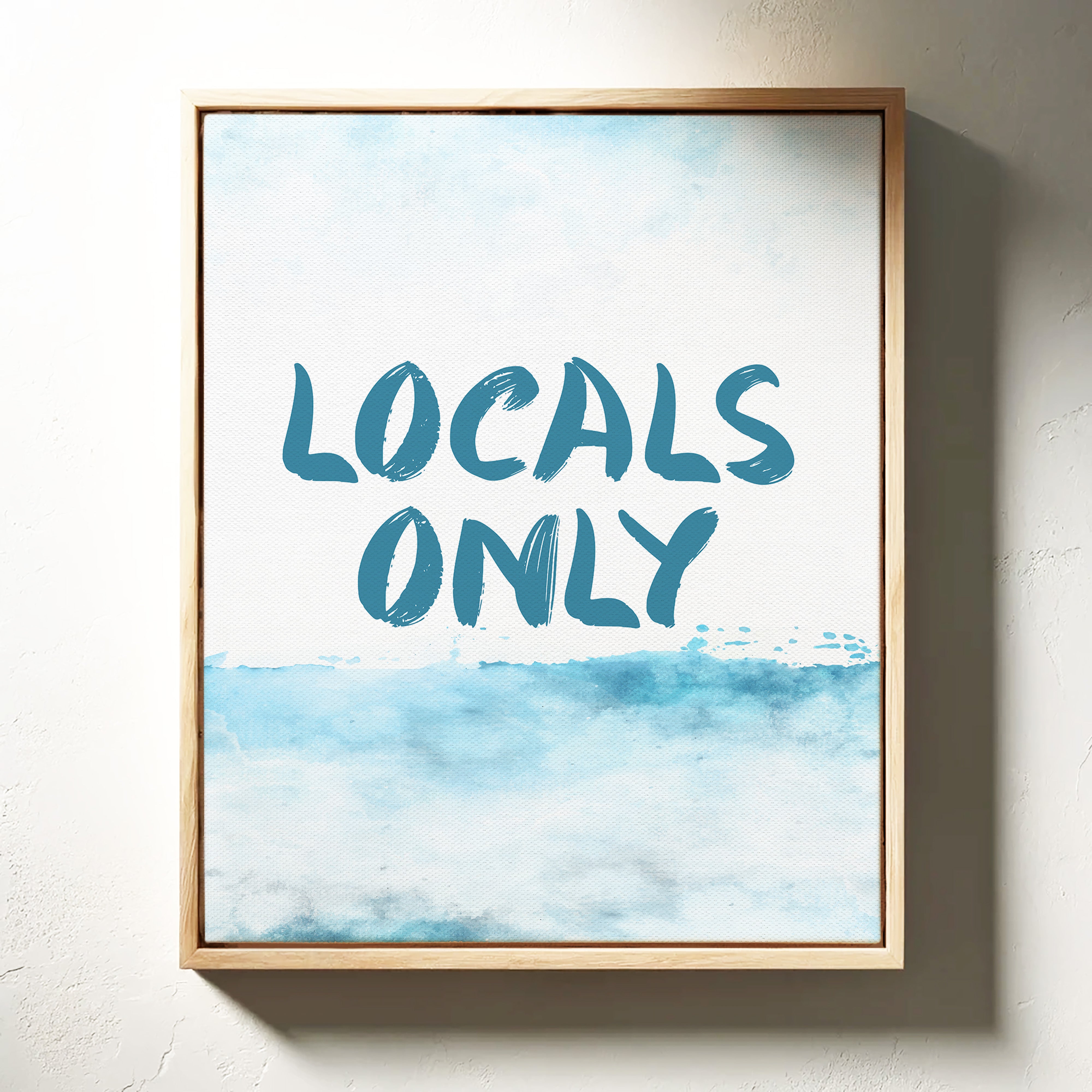 Morning light spills across turquoise letters that hold the casual confidence of a local's favorite hideaway. This contemporary piece captures the playful exclusivity of beach culture with bold brush strokes and oceanic hues. The watercolor wash beneath the text flows like gentle waves, while the assertive typography stands proud against pristine white space - a visual declaration of belonging. Perfect for bringing coastal charm to modern spaces, this piece speaks to anyone who's ever had a cherished local haunt. Its clean aesthetic and touch of attitude make it an ideal accent for a beach house kitchen or urban apartment that dreams of salt air.