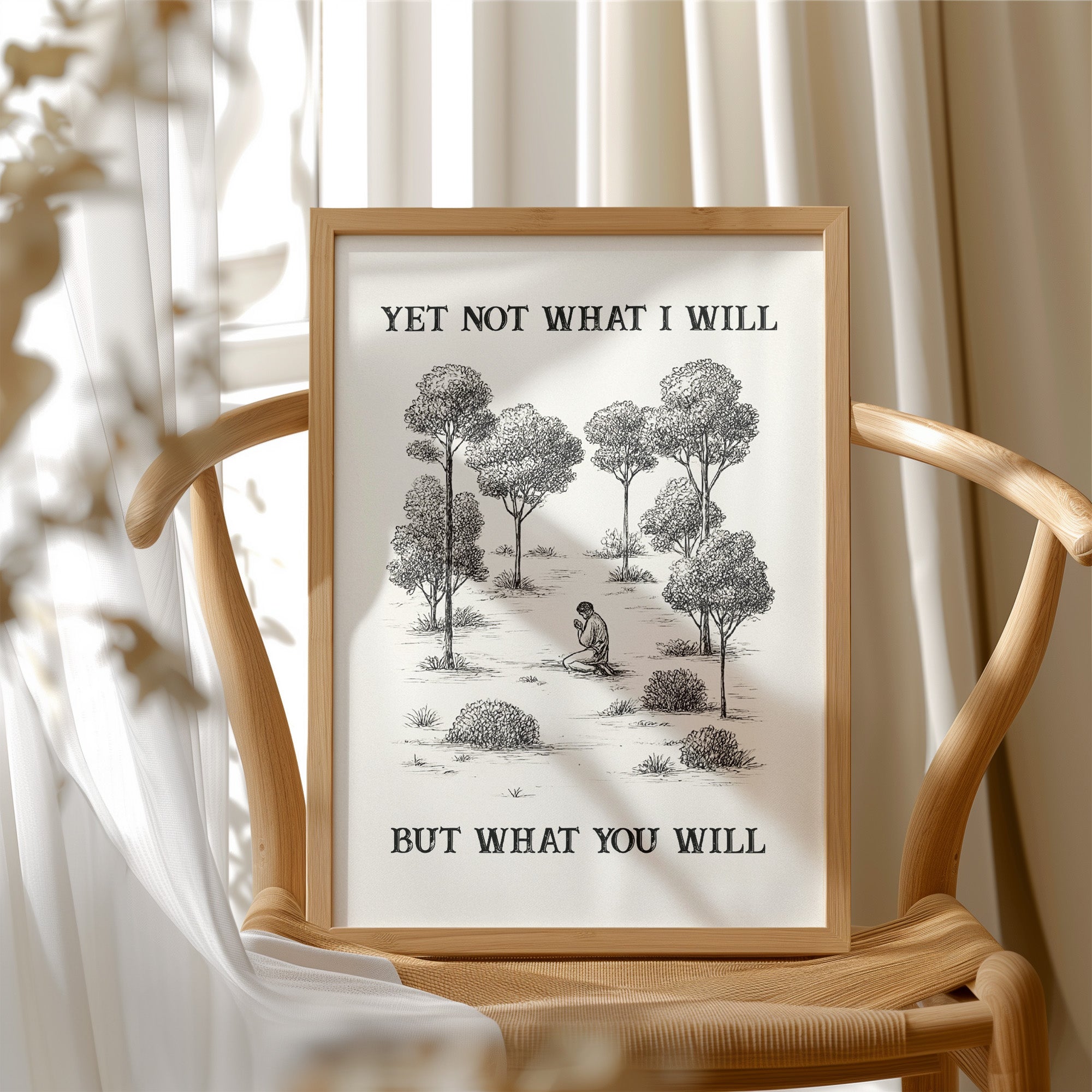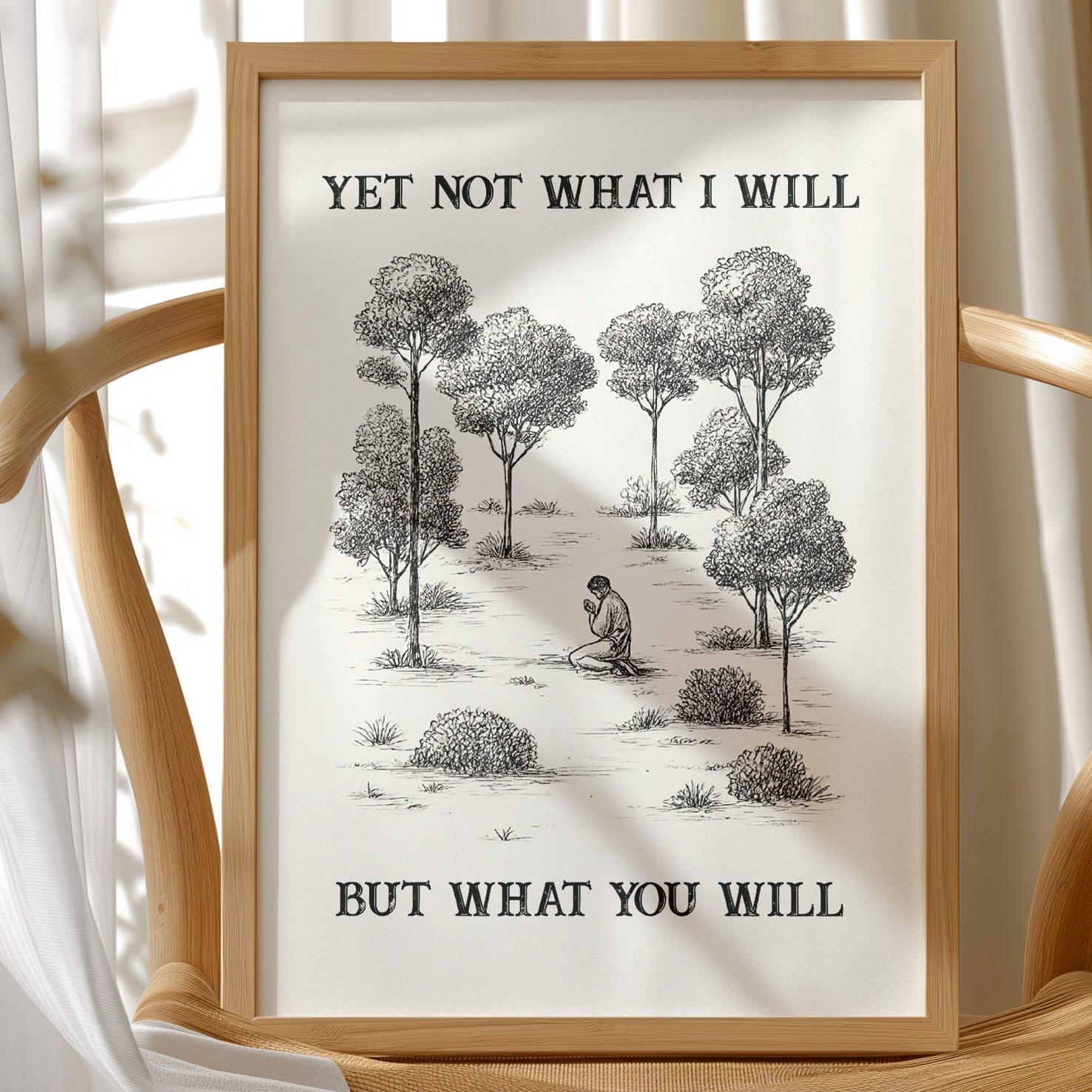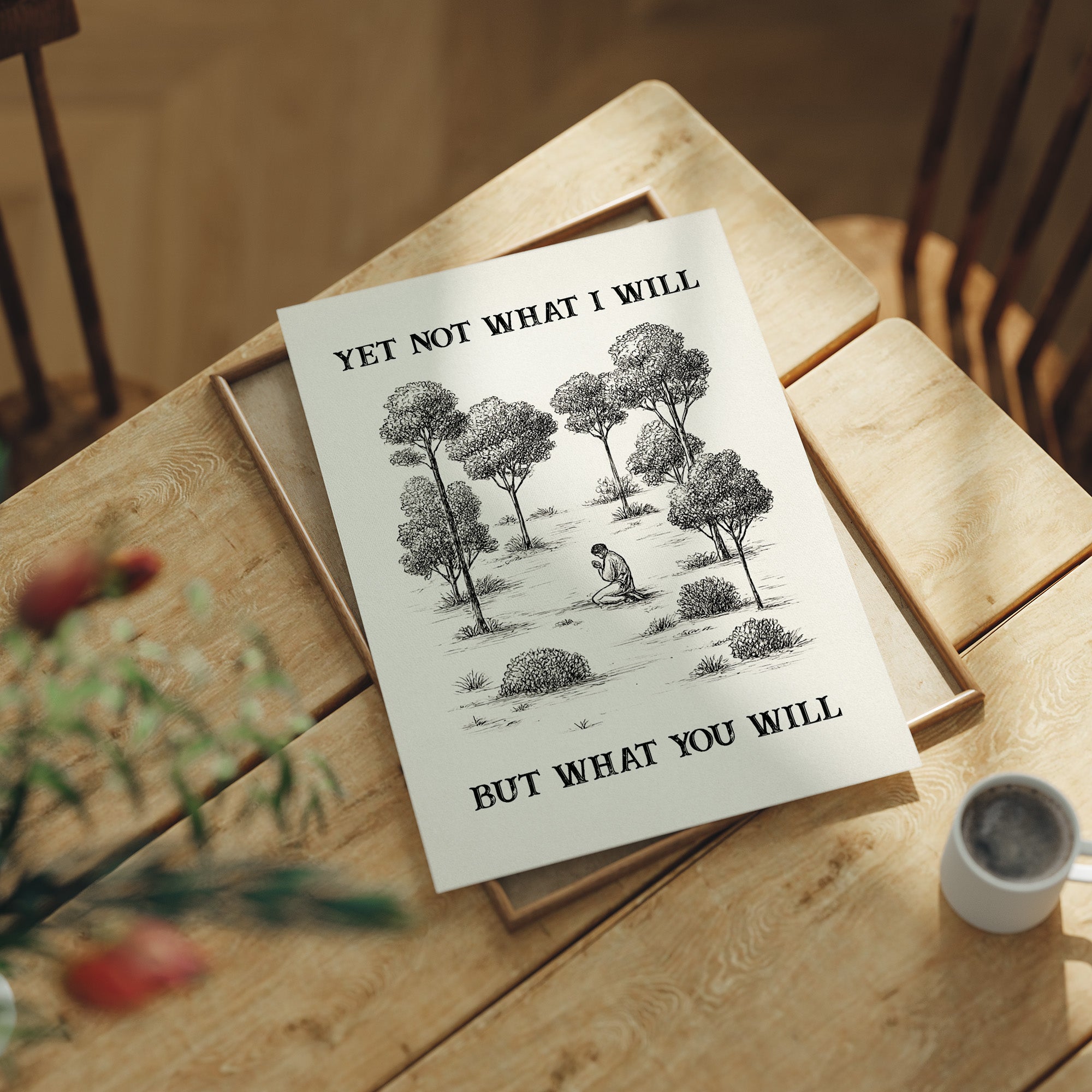 In the stillness of a sparse grove, a solitary figure kneels in profound surrender. The delicate line work captures a moment of spiritual submission, where human will bends to something greater. Tall trees stand as silent sentinels, their detailed foliage rendered in stark black against cream, framing this intimate moment of prayer or meditation amid an otherwise empty landscape.