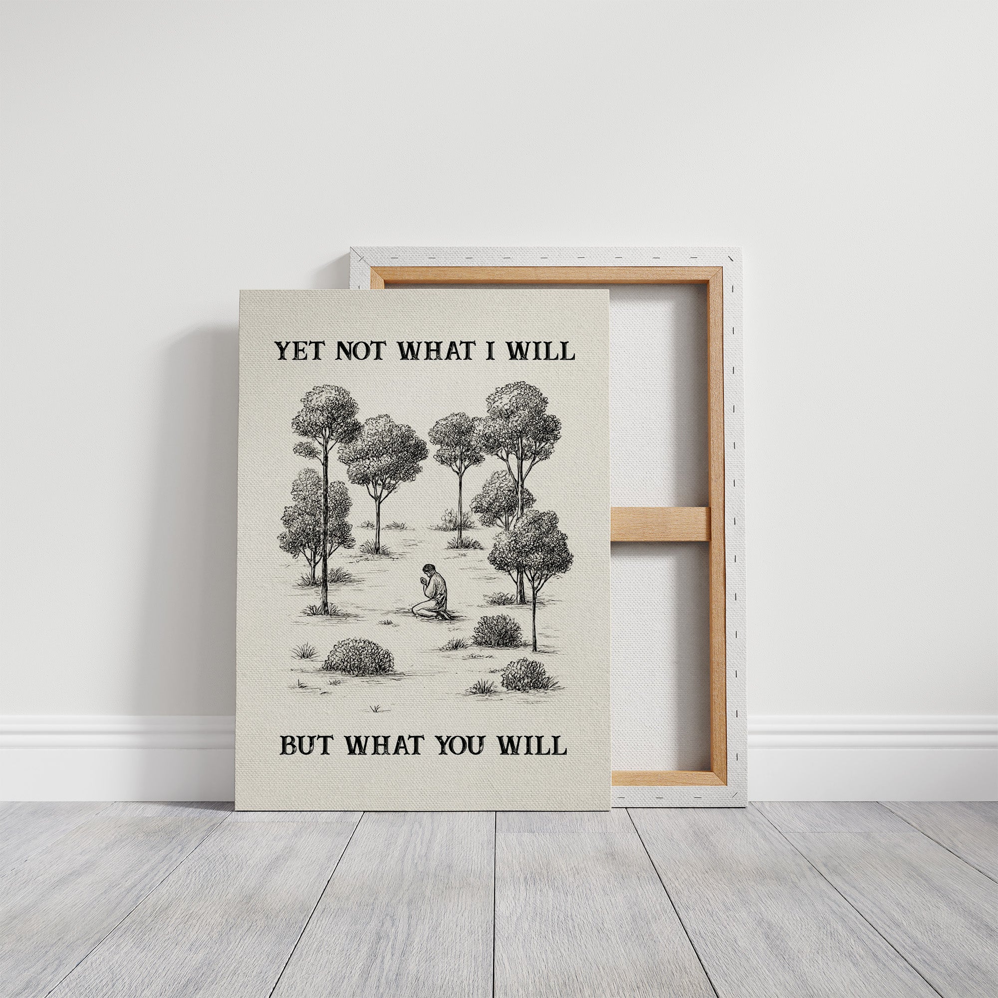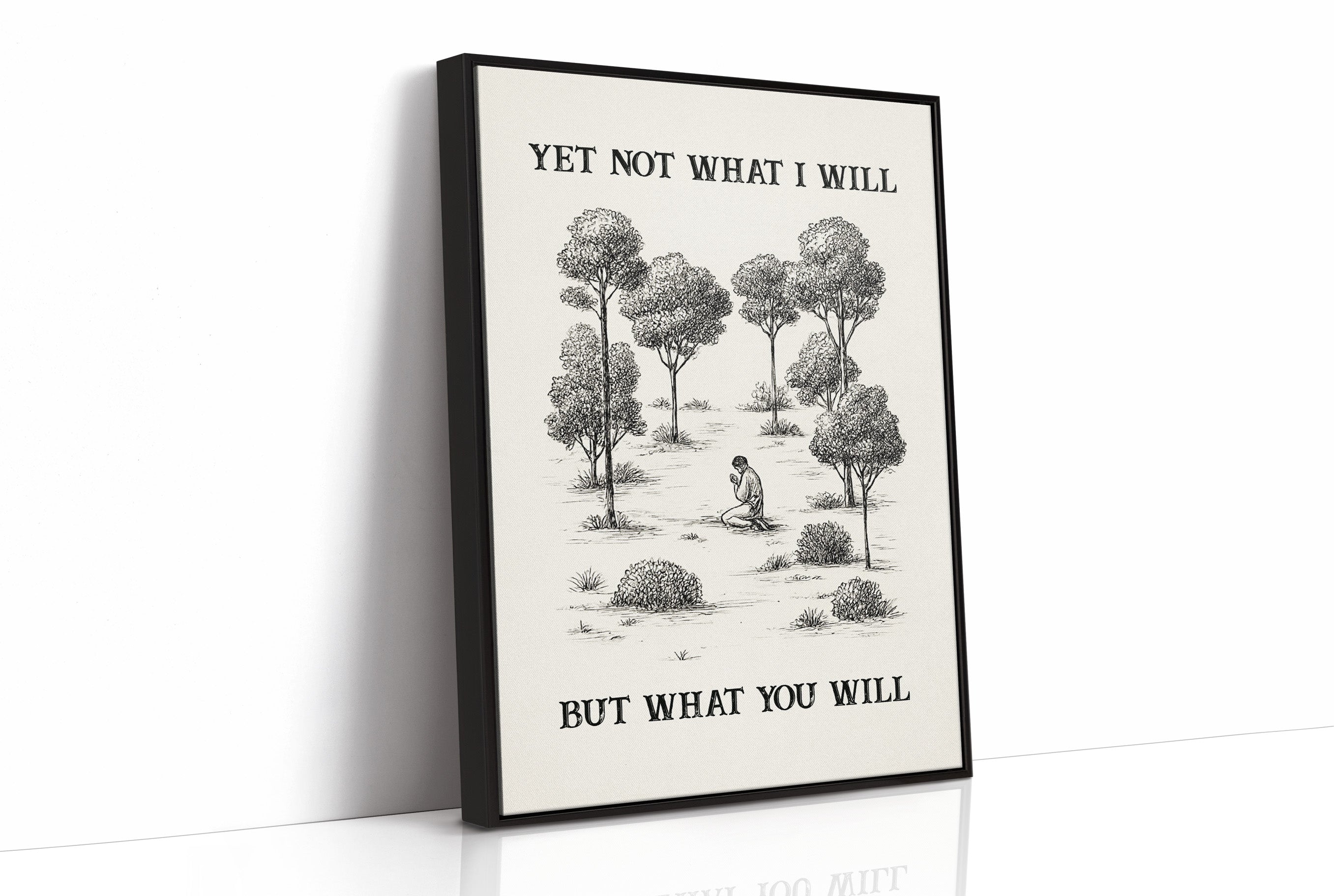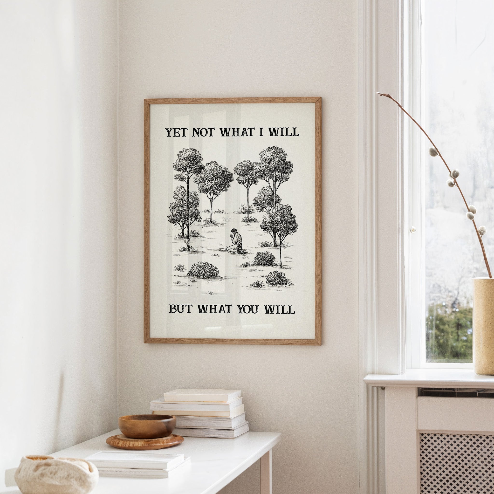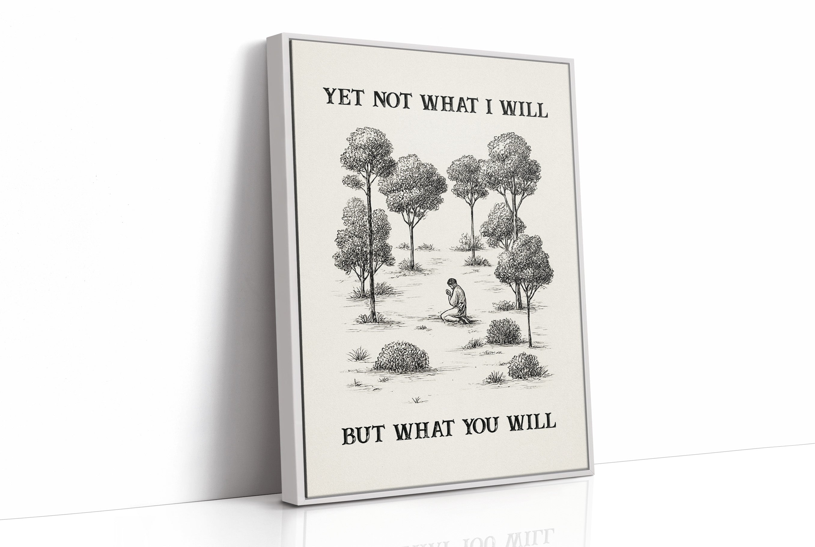 In the stillness of a sparse grove, a solitary figure kneels in profound surrender. The delicate line work captures a moment of spiritual submission, where human will bends to something greater. Tall trees stand as silent sentinels, their detailed foliage rendered in stark black against cream, framing this intimate moment of prayer or meditation amid an otherwise empty landscape.