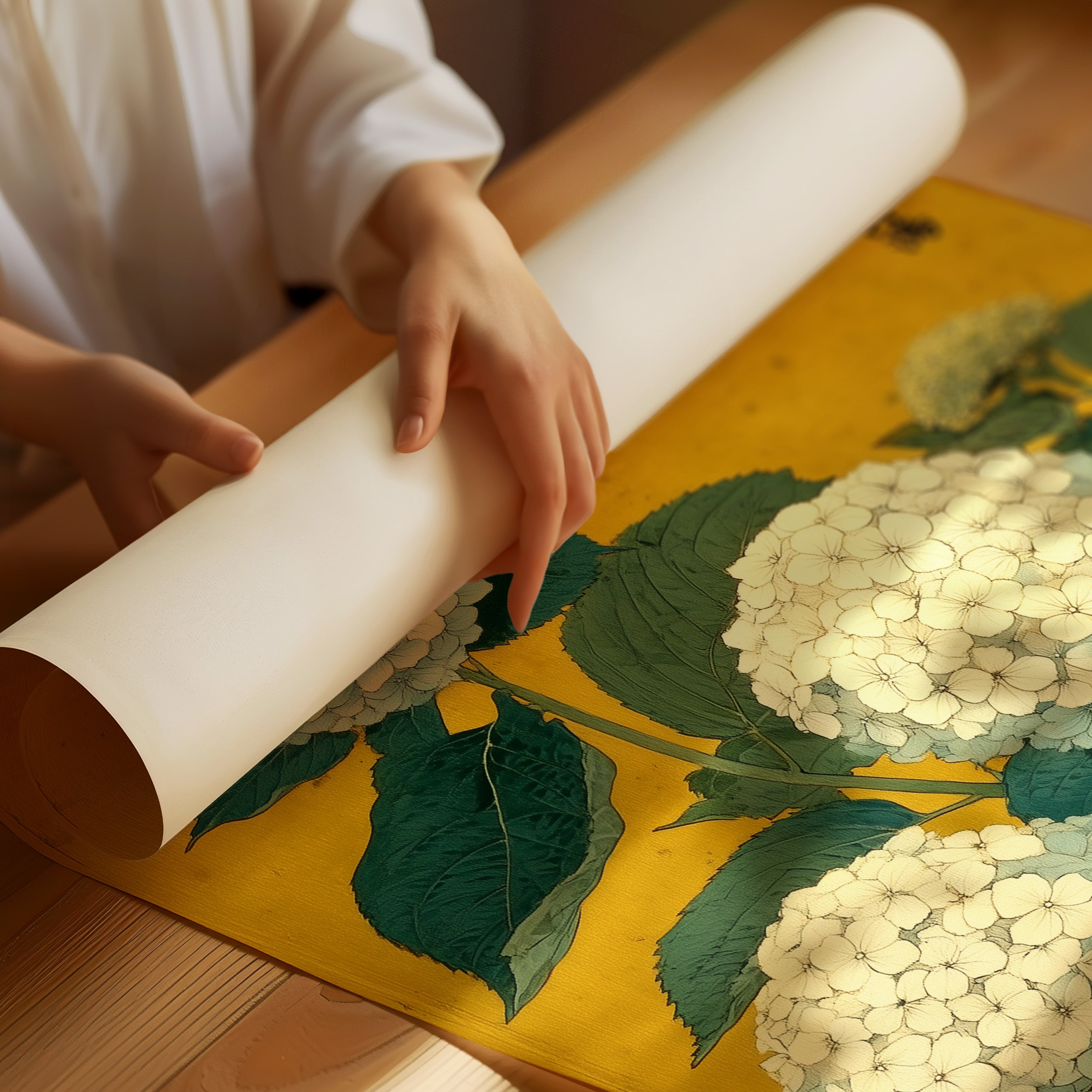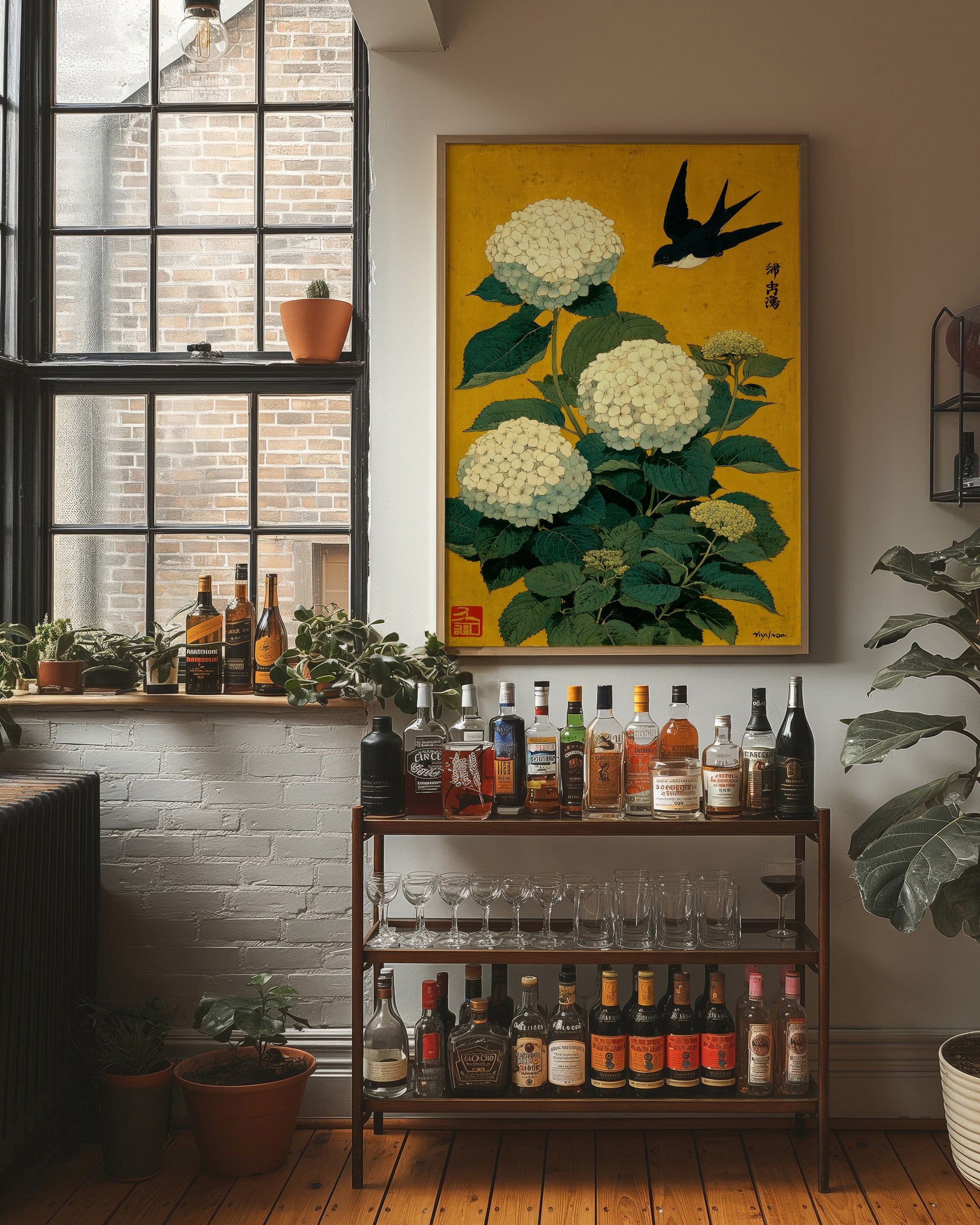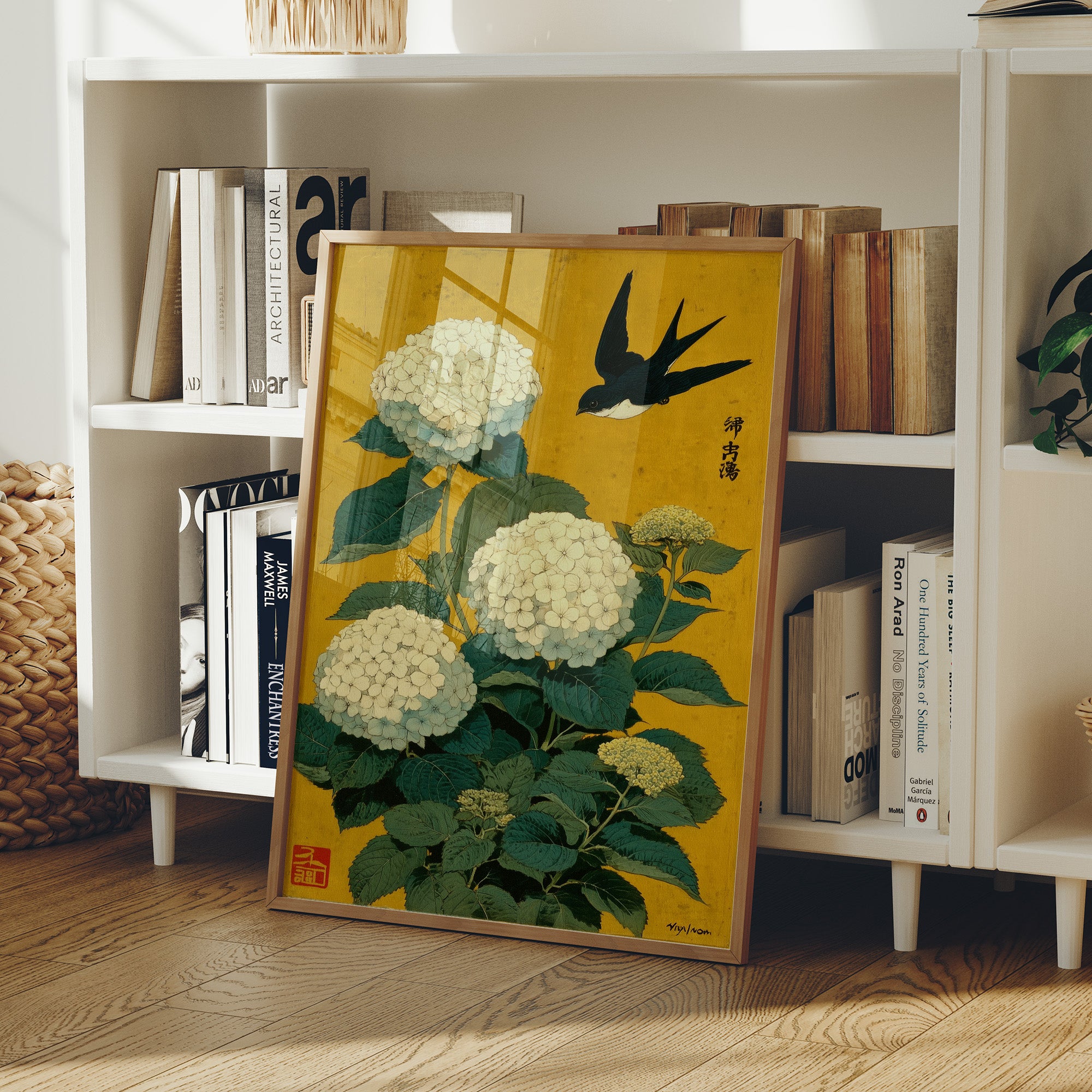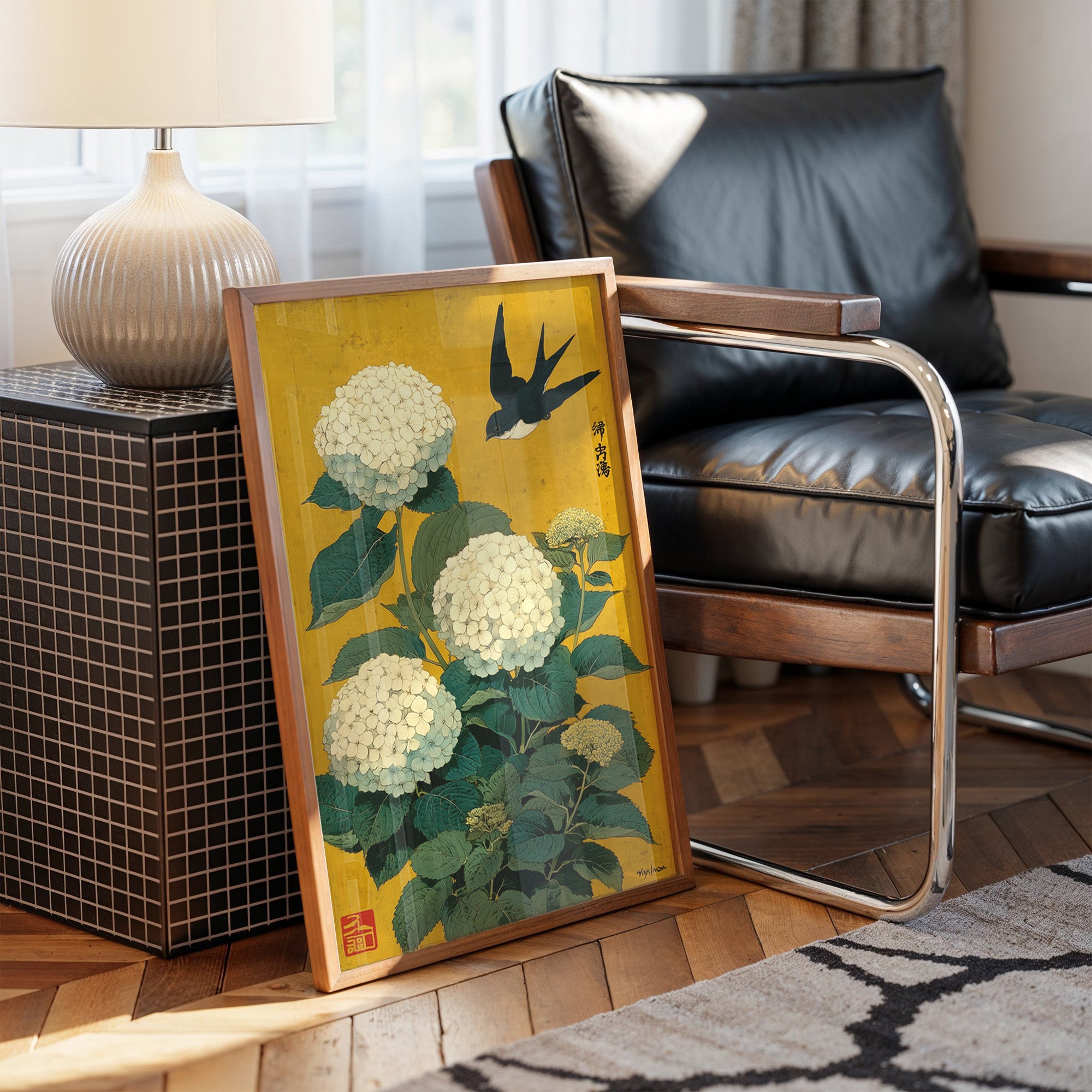 Morning light streams across a striking Japanese botanical print, where pristine white hydrangeas bloom against a rich golden background. A graceful swallow swoops through the composition, creating dynamic movement against the stillness of the clustered flowers and deep green foliage. The traditional artwork captures both the delicate detail of each petal and the bold simplicity of Asian artistic techniques. This serene corner vignette showcases the print among carefully curated objects - a modern table lamp, design books, and living plants that echo the botanical theme. Perfect for bringing a touch of timeless elegance to a reading nook, home office, or any space where you seek to create a peaceful retreat.