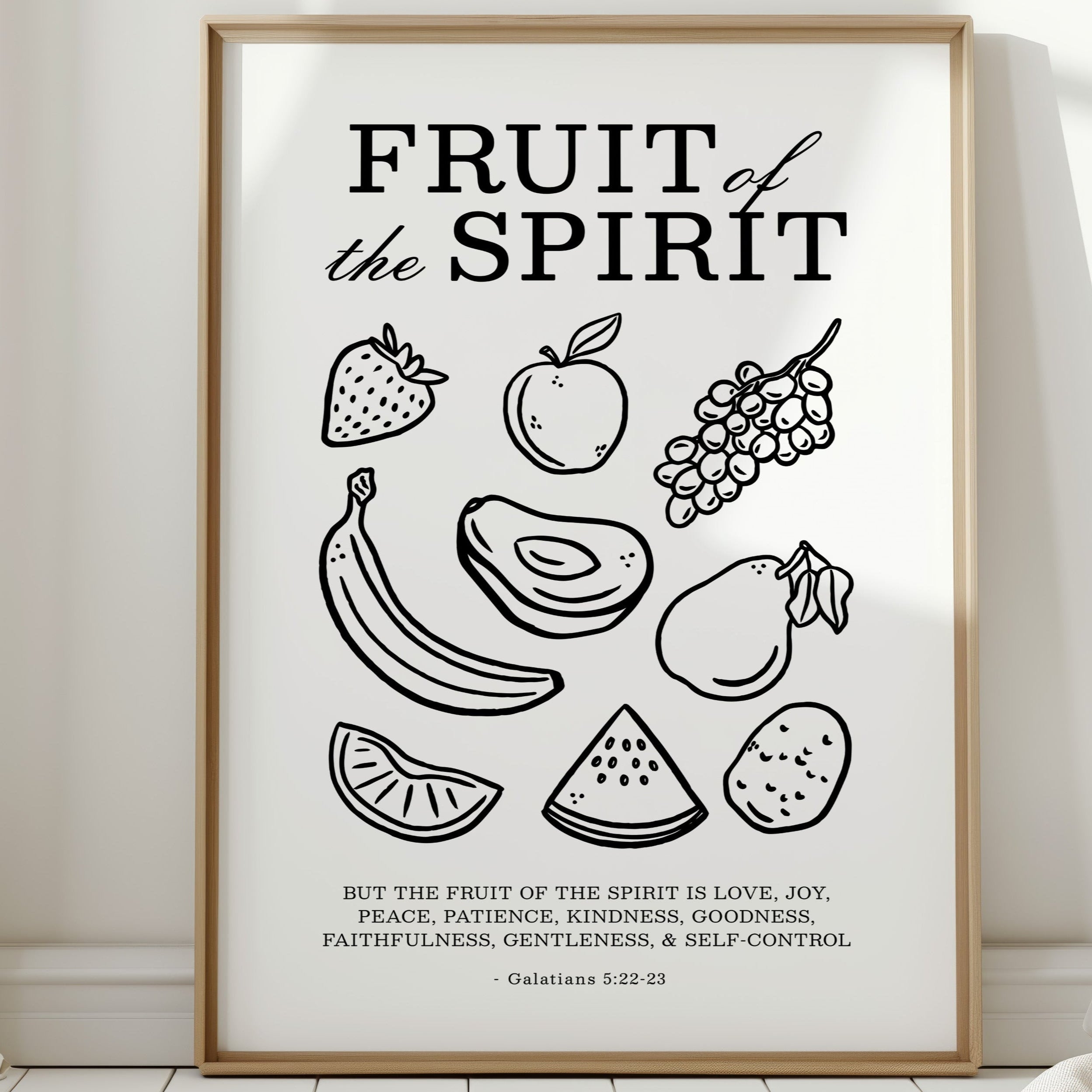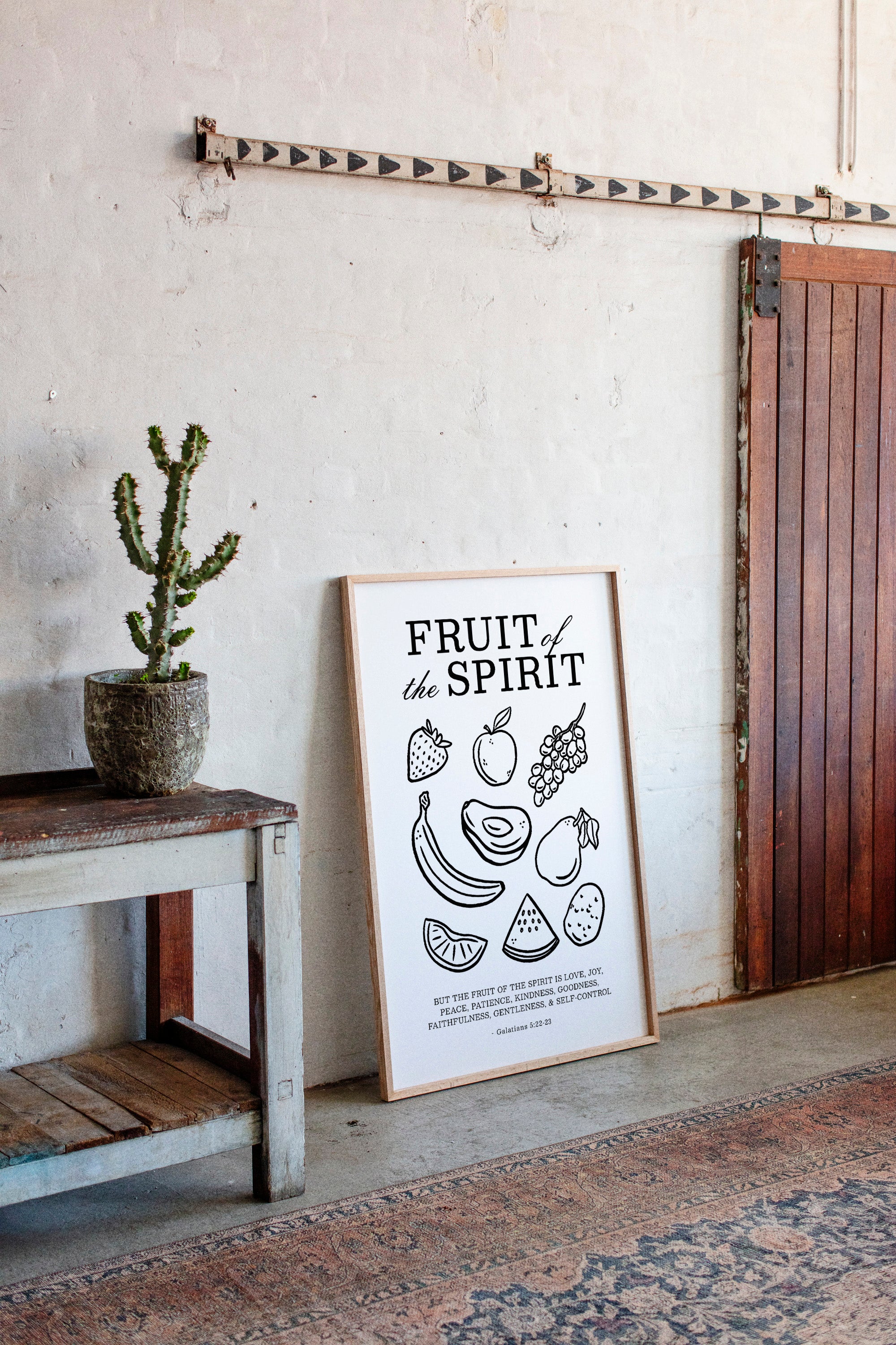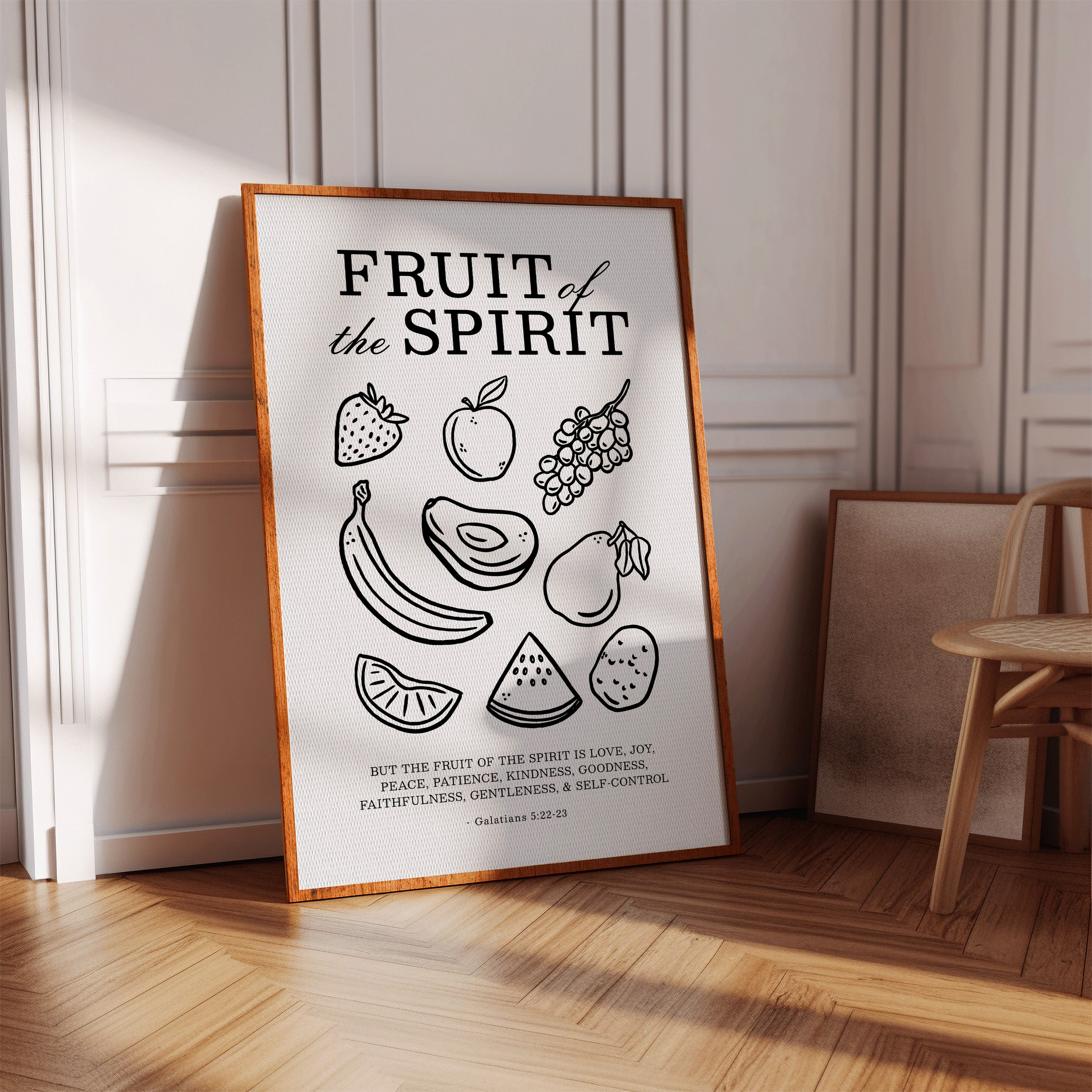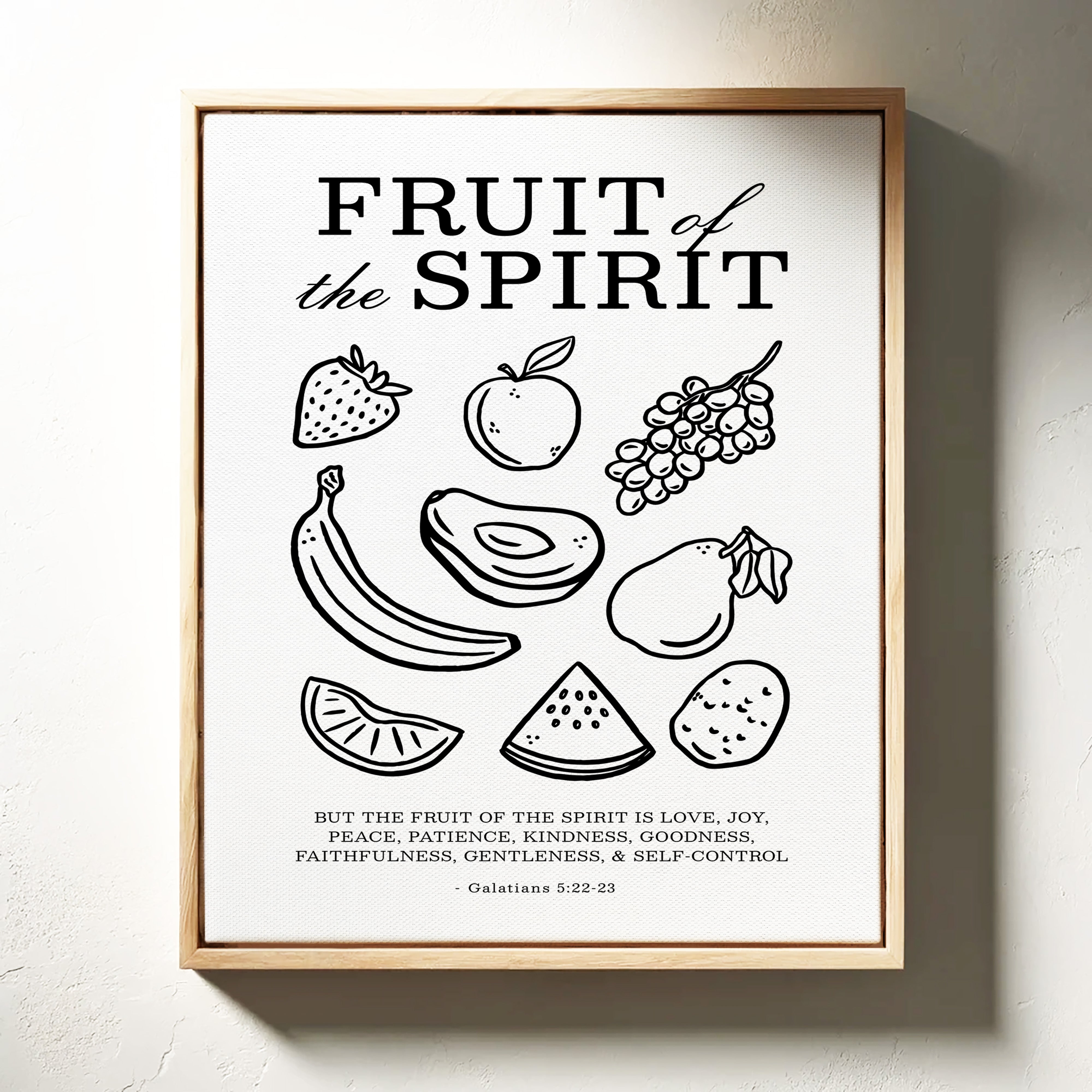 Clean lines trace the essence of abundance, where simple fruits carry profound meaning. This contemporary minimalist piece brings scripture to life through playful line drawings. Each carefully illustrated fruit becomes a symbol of spiritual virtues, arranged with purposeful simplicity against pristine white space. The marriage of modern design and timeless wisdom creates a gentle reminder of life's sweetest truths. Perfect for bringing inspiration to kitchen spaces, dining areas, or any room seeking both style and substance. A thoughtful addition that serves as both art and daily meditation.