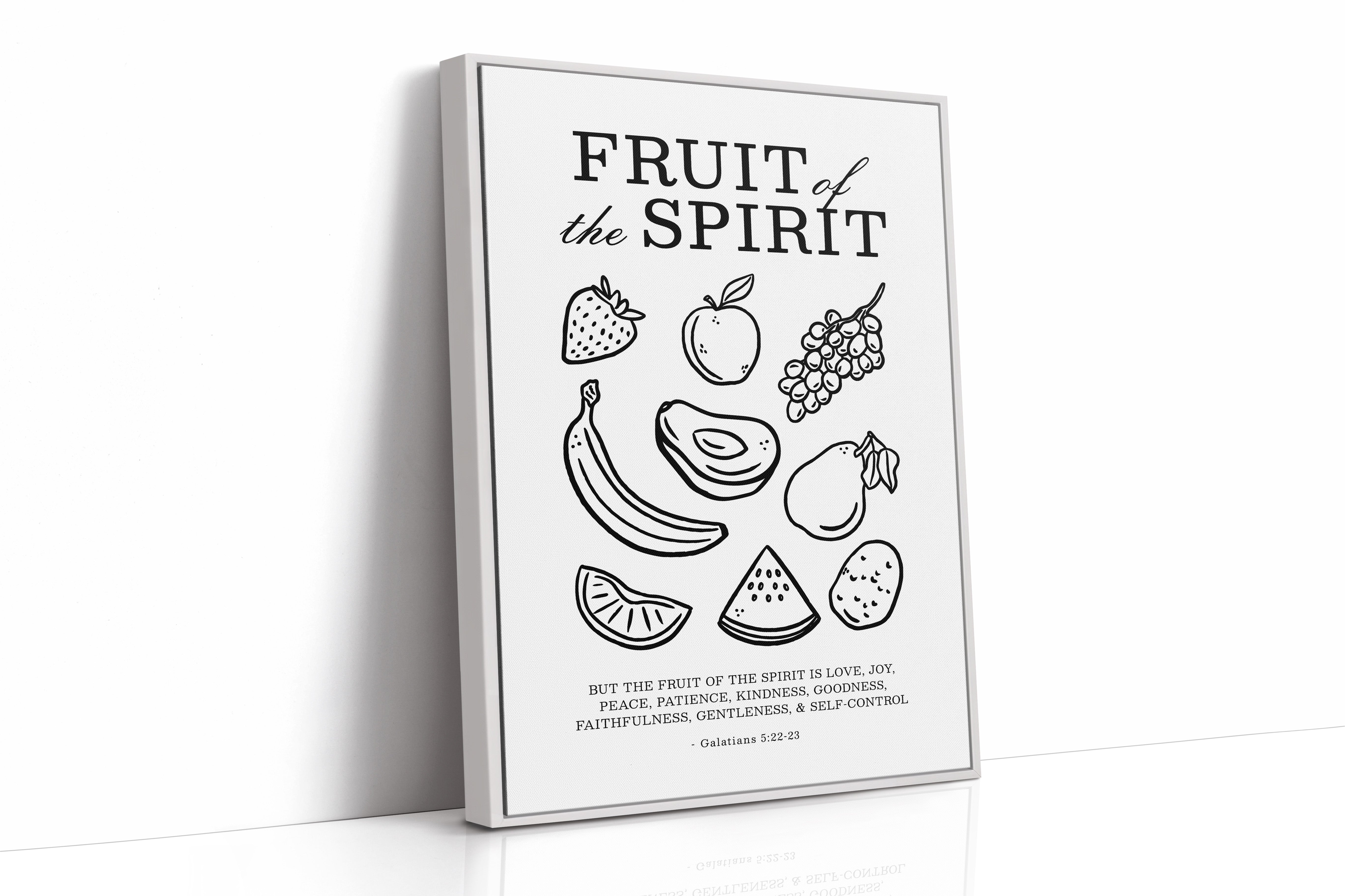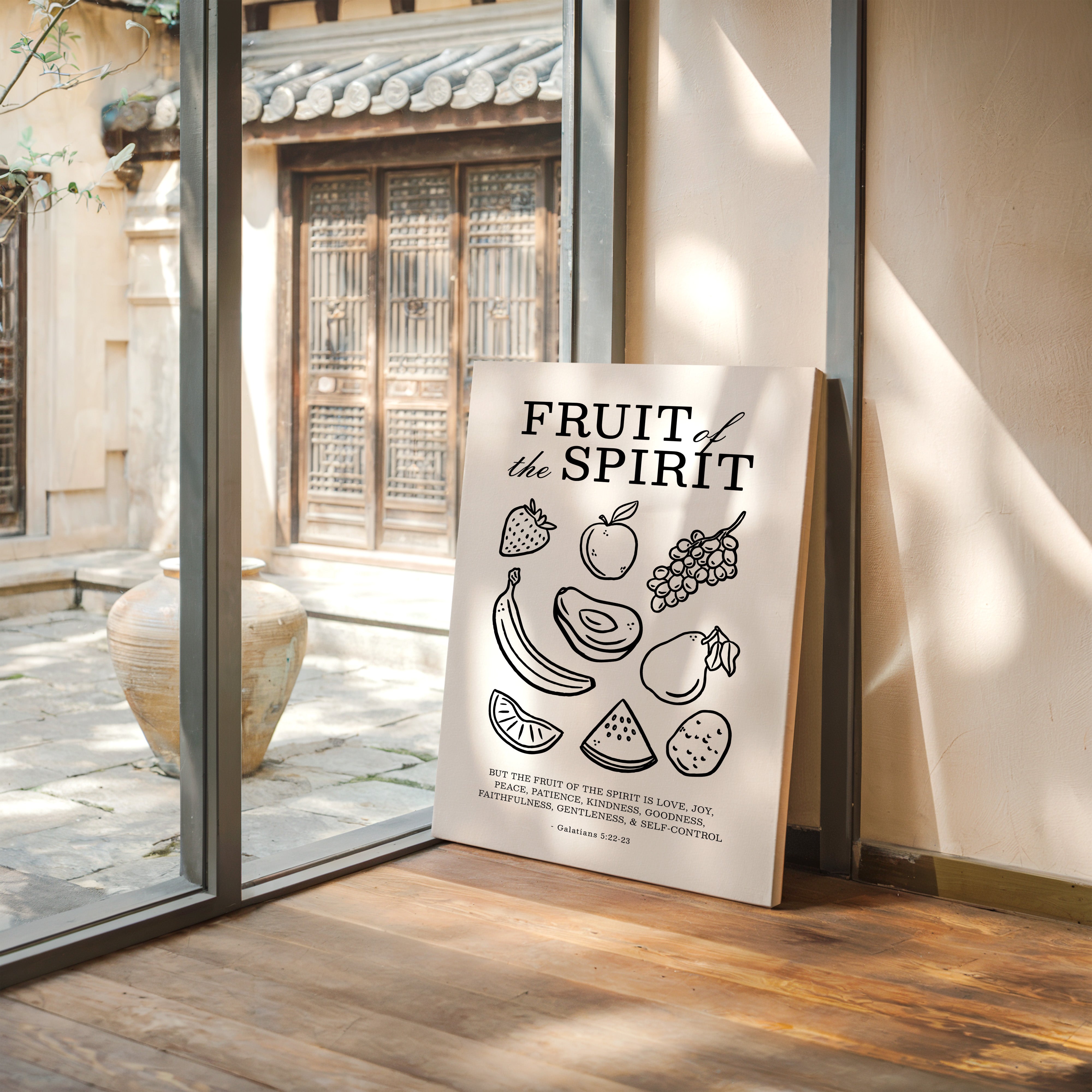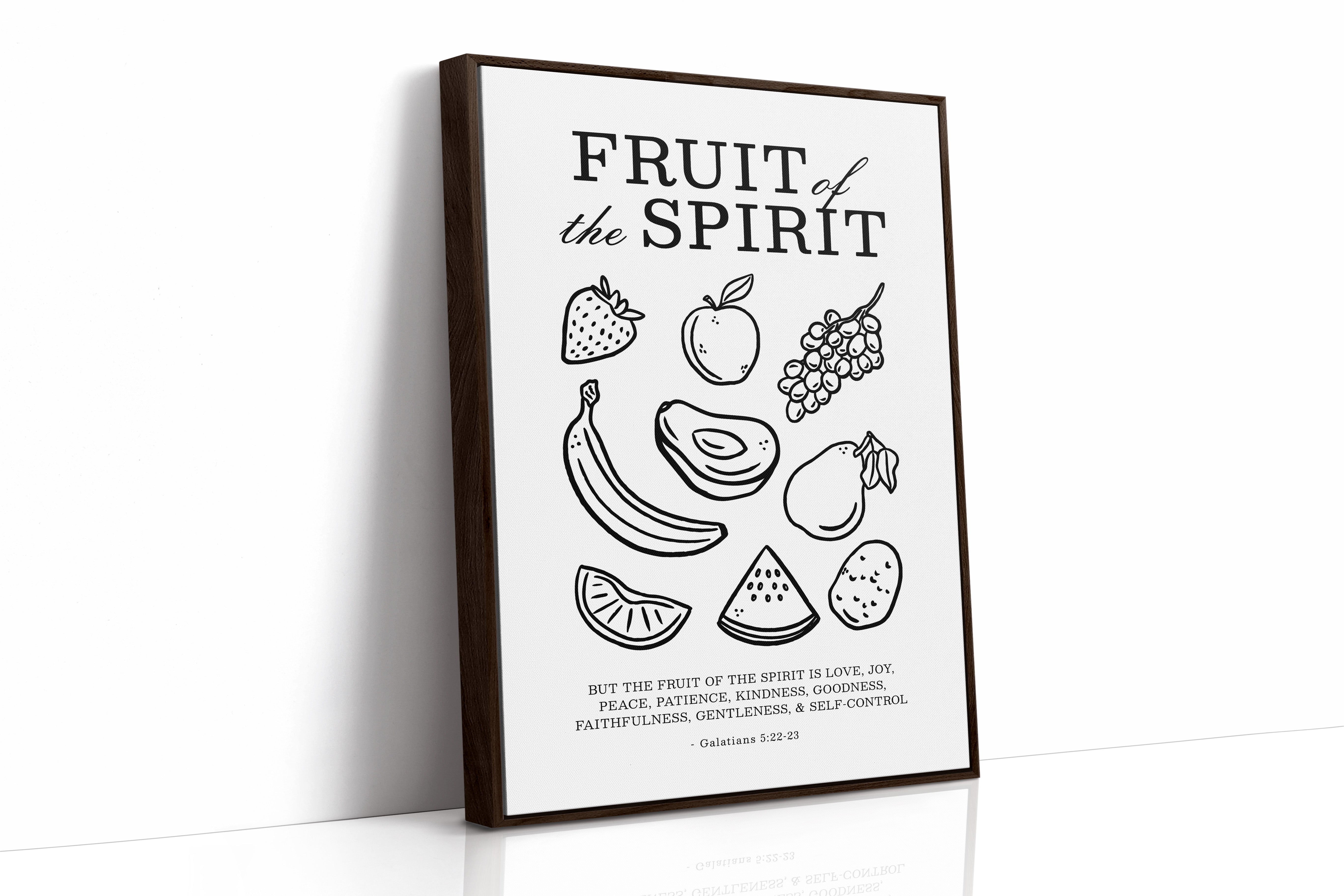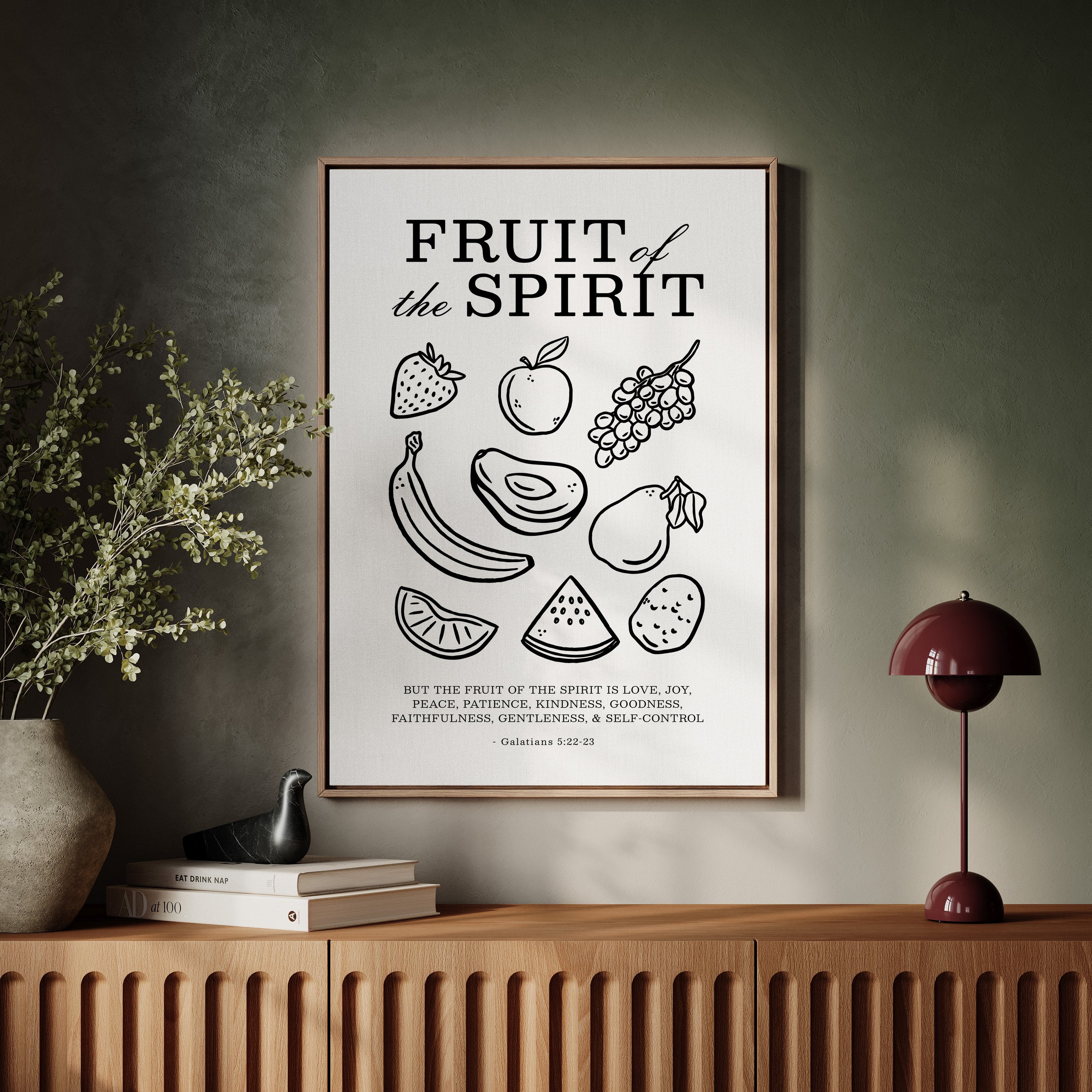 Clean lines trace the essence of abundance, where simple fruits carry profound meaning. This contemporary minimalist piece brings scripture to life through playful line drawings. Each carefully illustrated fruit becomes a symbol of spiritual virtues, arranged with purposeful simplicity against pristine white space. The marriage of modern design and timeless wisdom creates a gentle reminder of life's sweetest truths. Perfect for bringing inspiration to kitchen spaces, dining areas, or any room seeking both style and substance. A thoughtful addition that serves as both art and daily meditation.